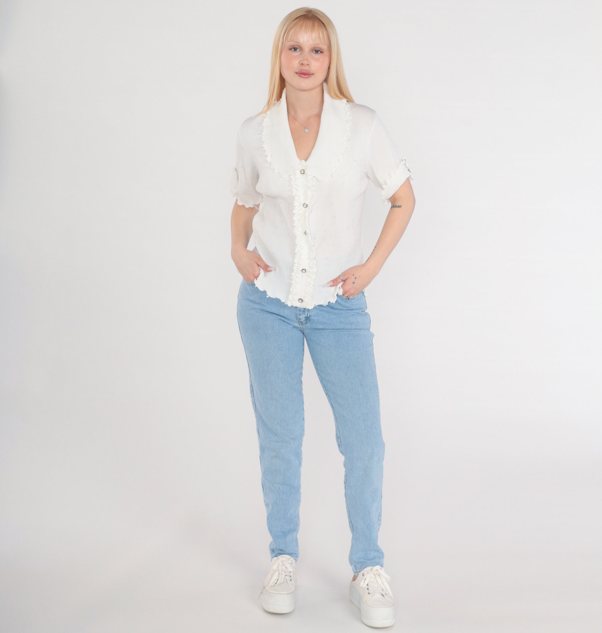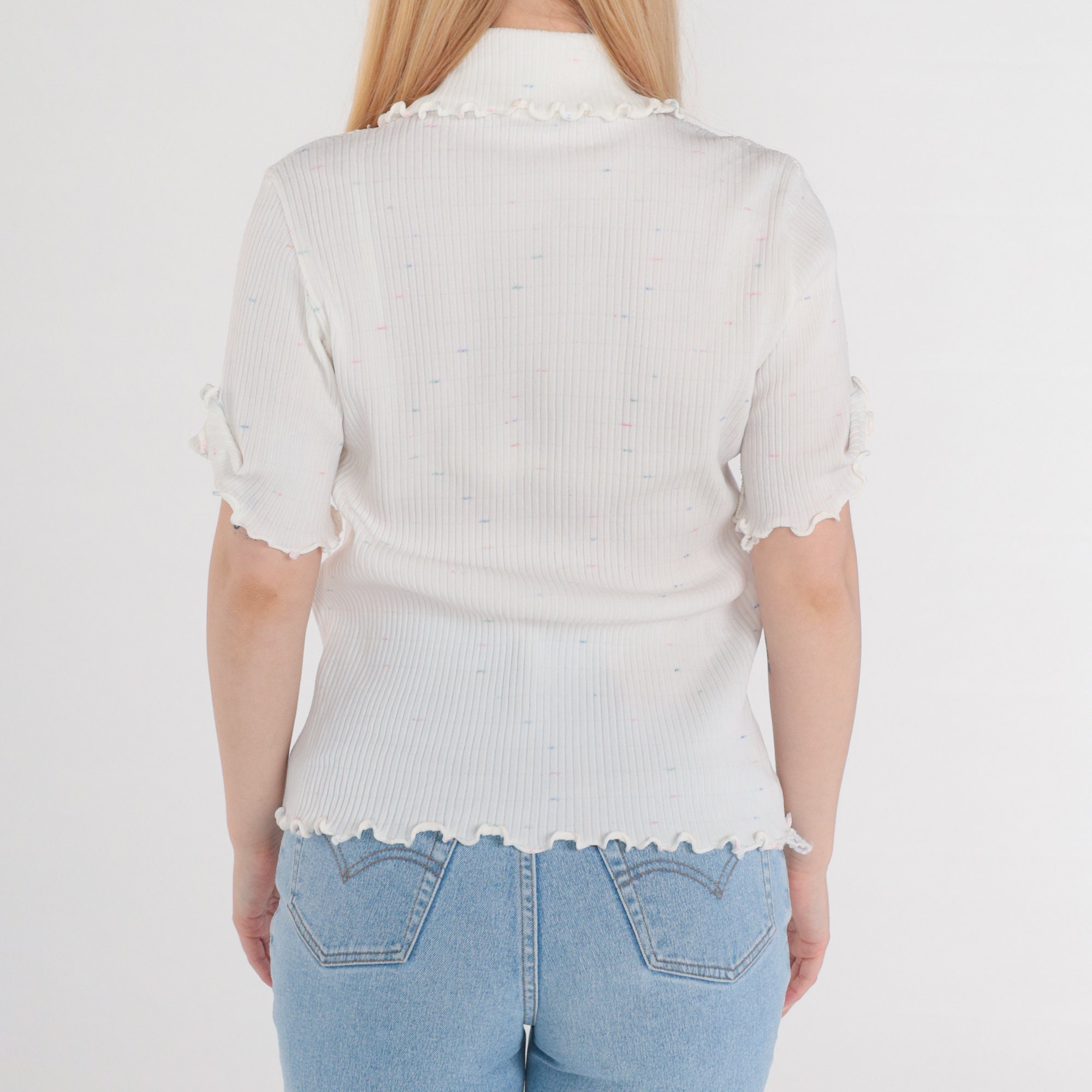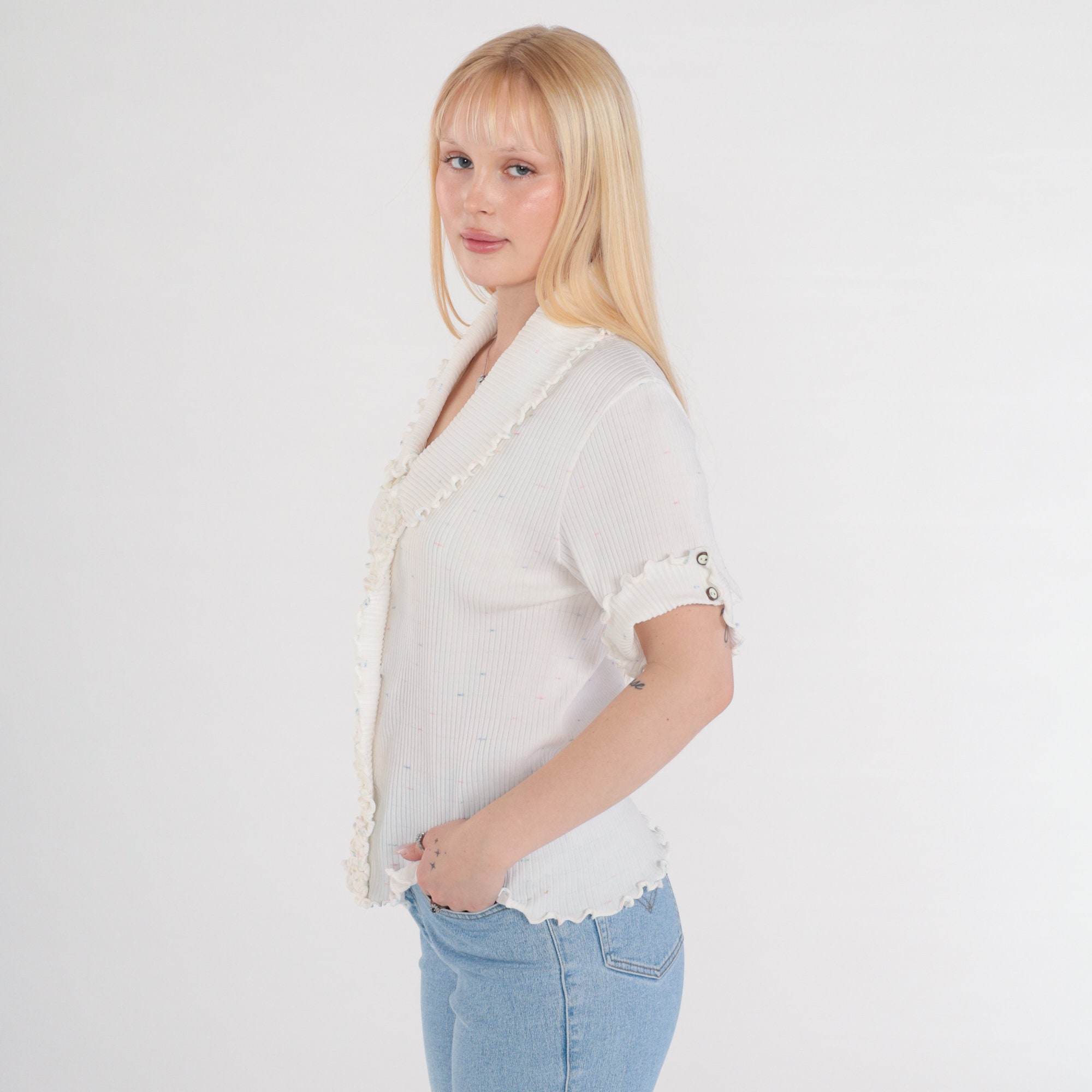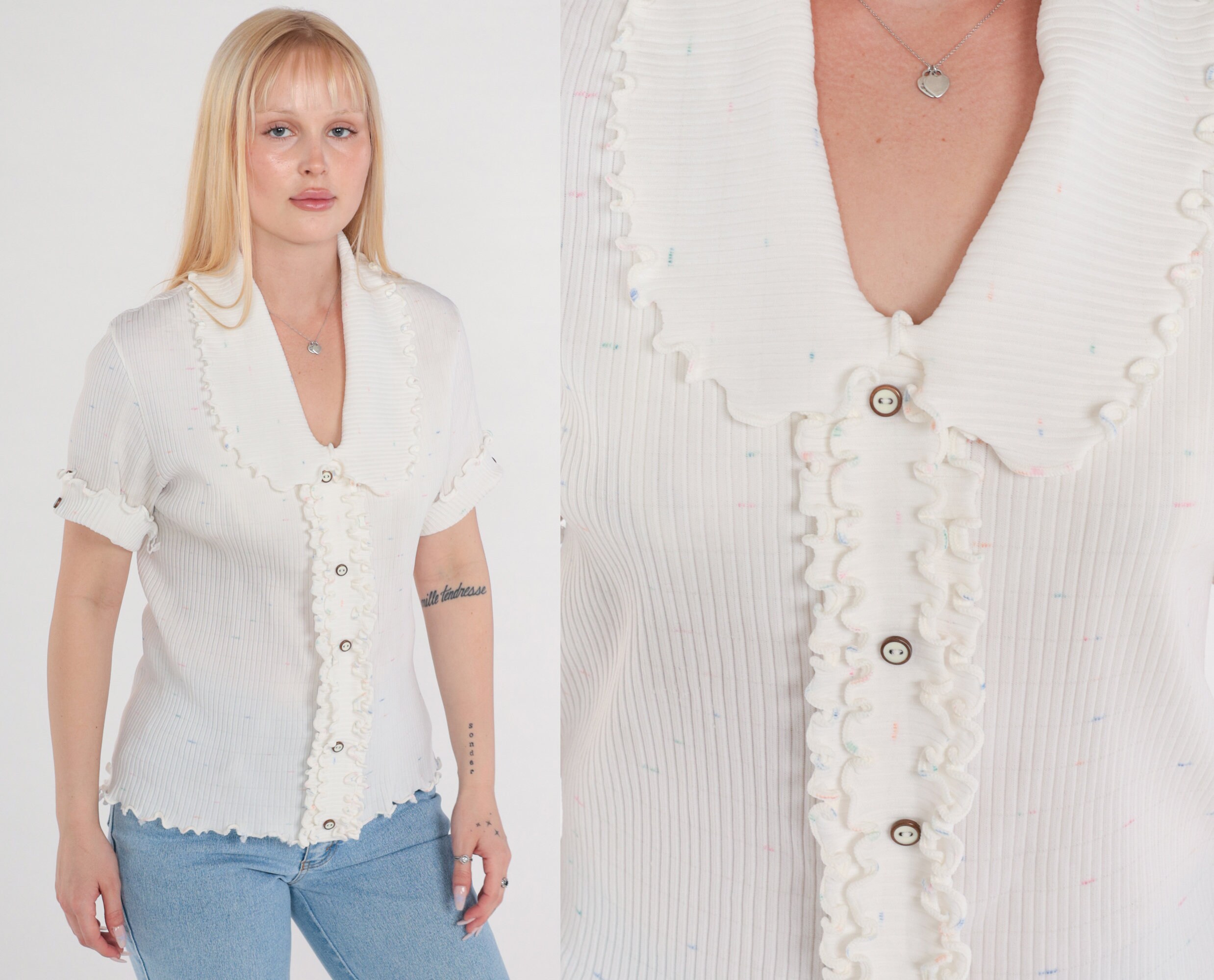 Vintage 70s blouse in ribbed white with ruffle trim. Short sleeves, a large rounded collar, and decorative buttons up the front.