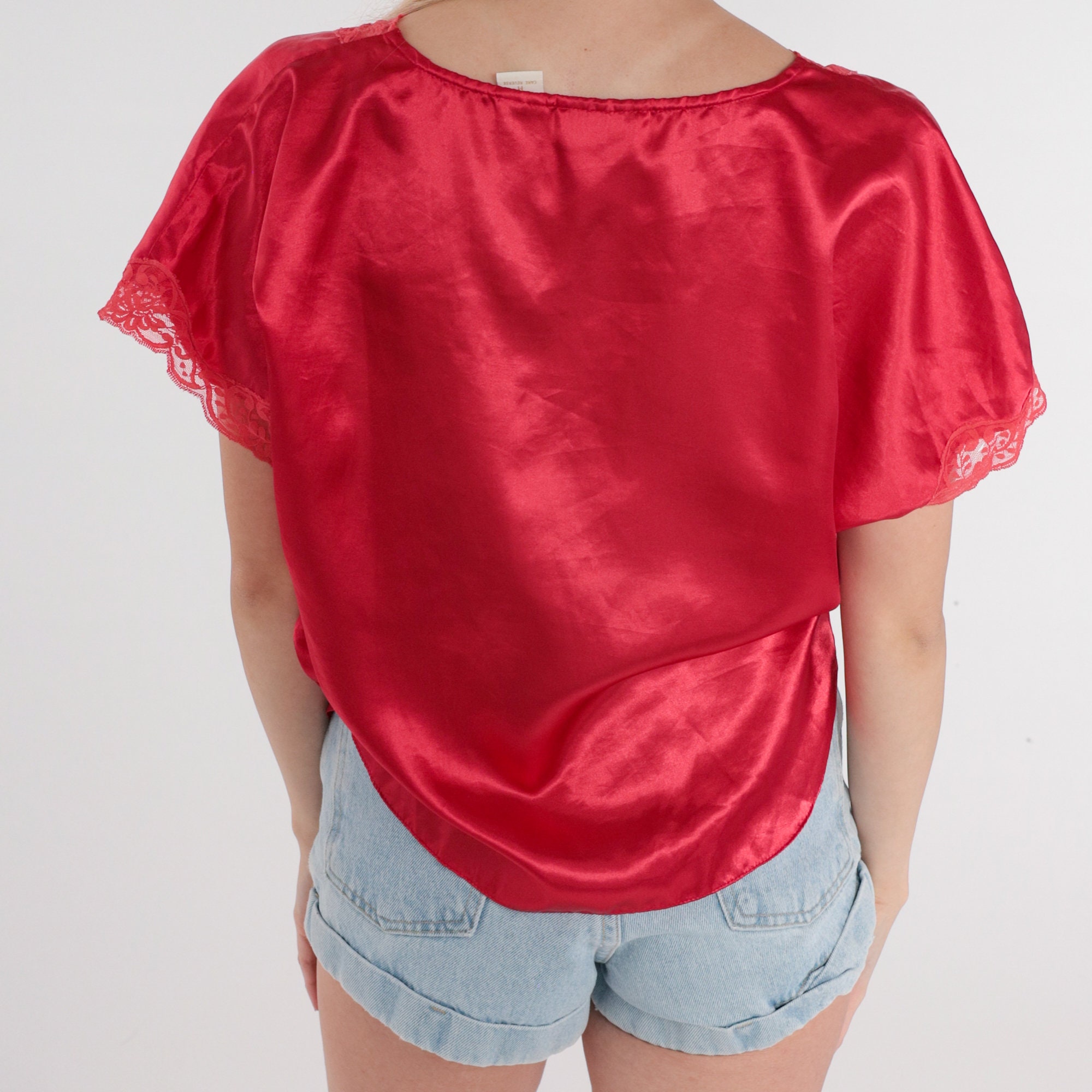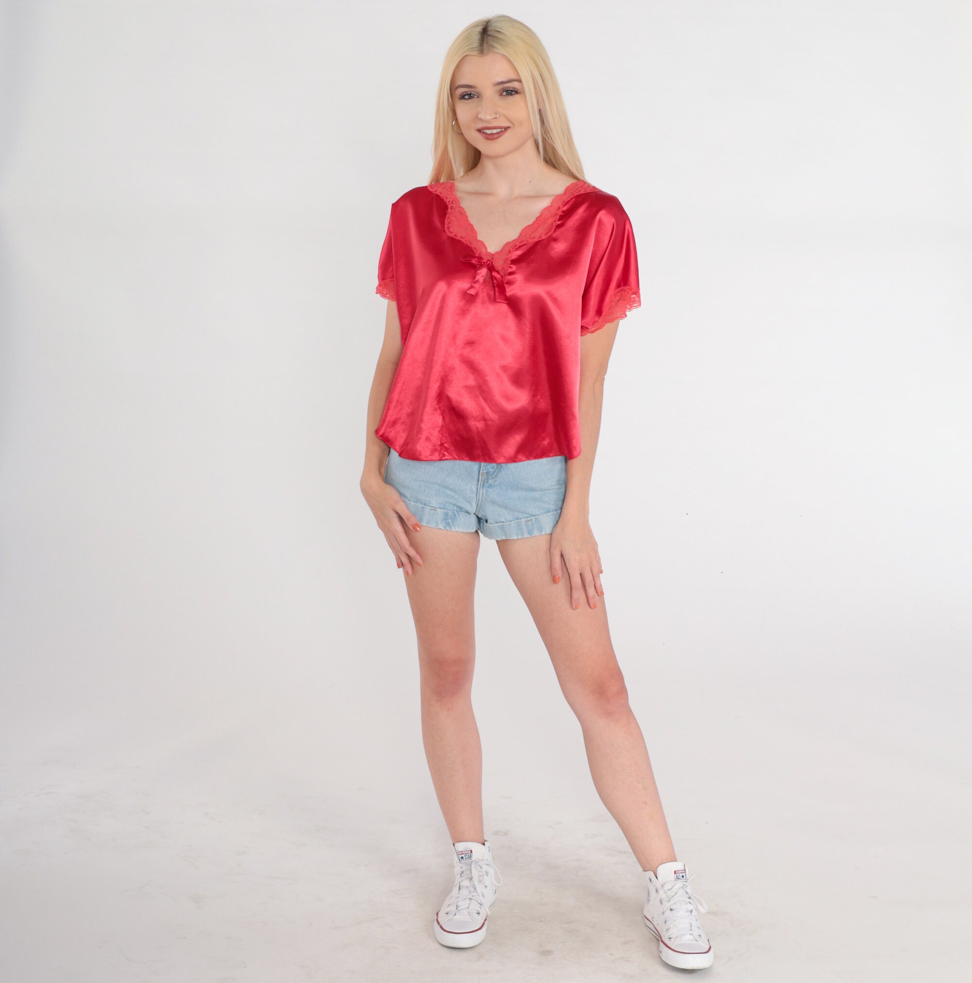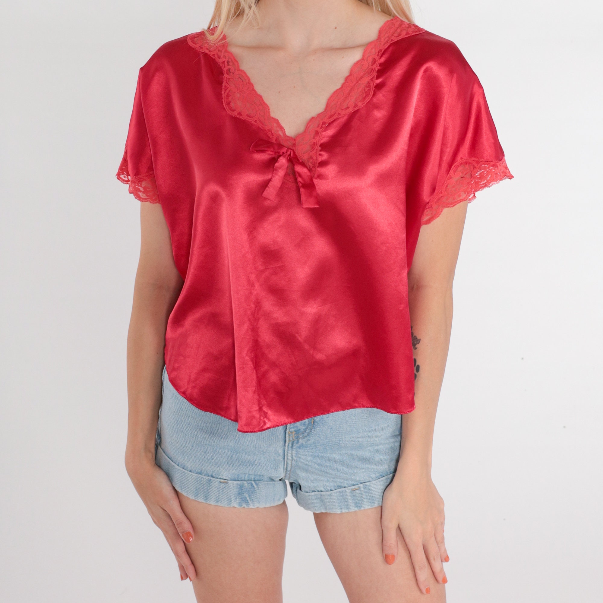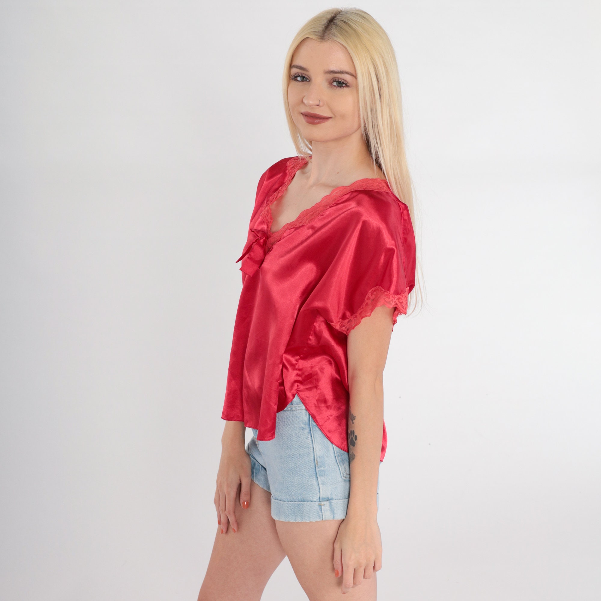Vintage 90s lingerie pajama top in red with lace trim and a bow at the neckline. Short sleeves and a v neck.