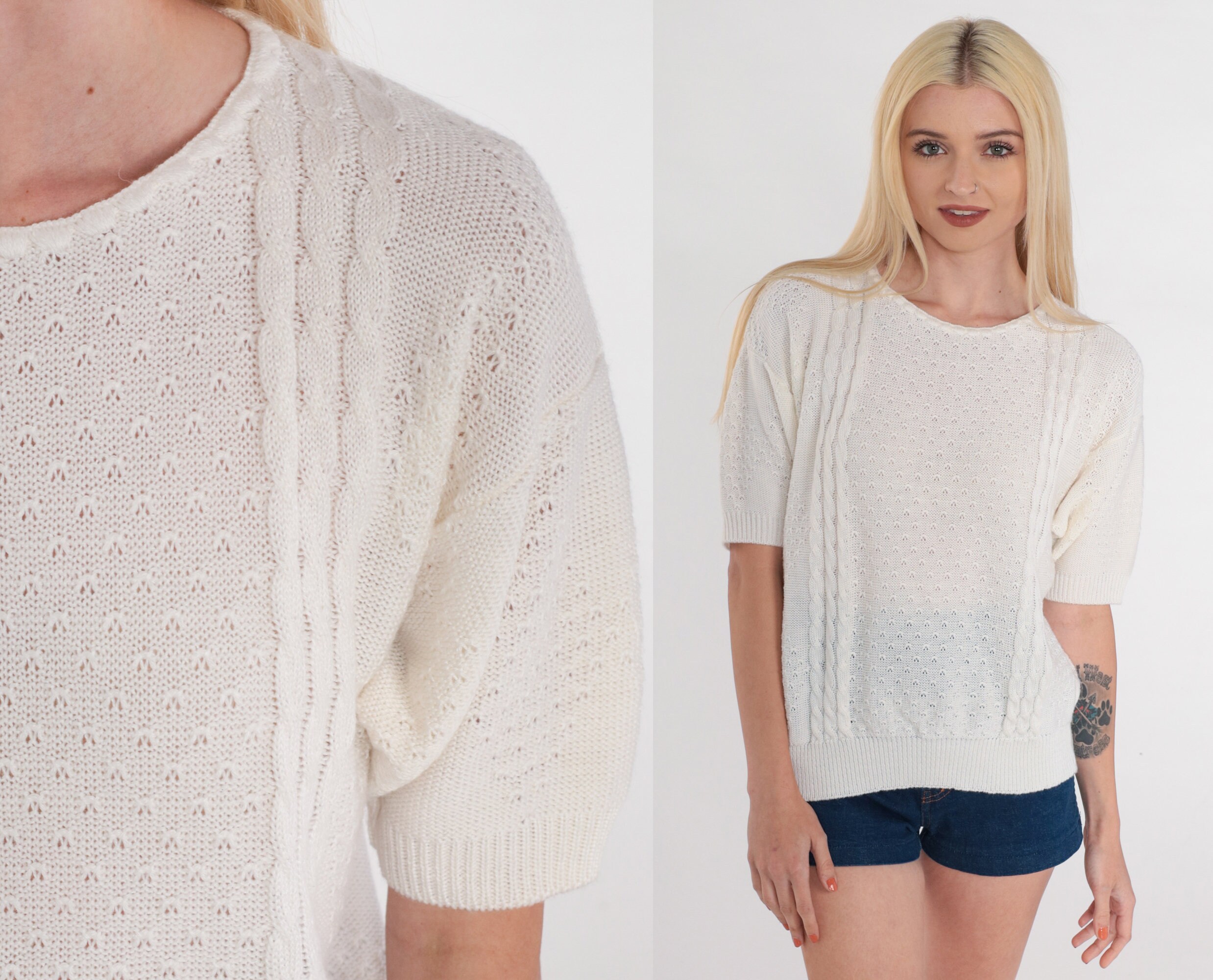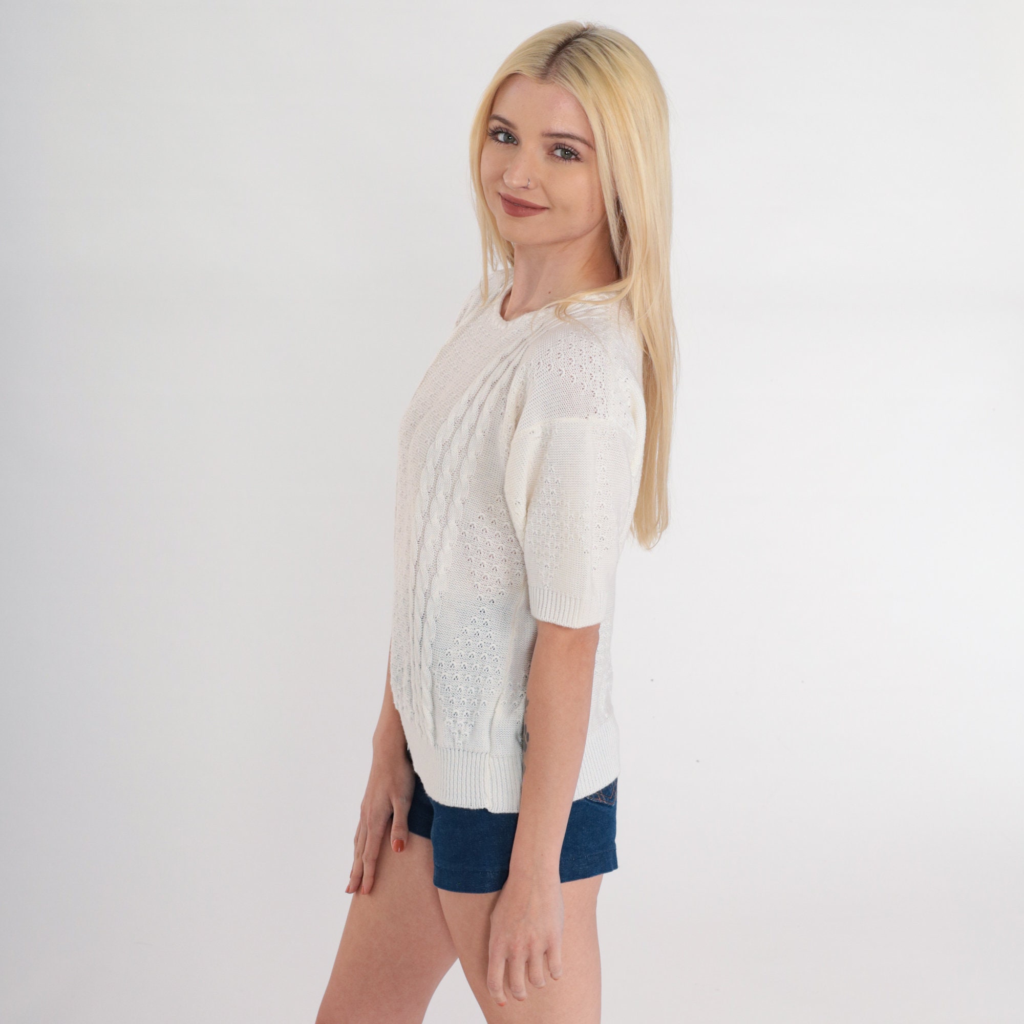 Vintage 80s sweater top in a white cable and pointelle knit with short sleeves.