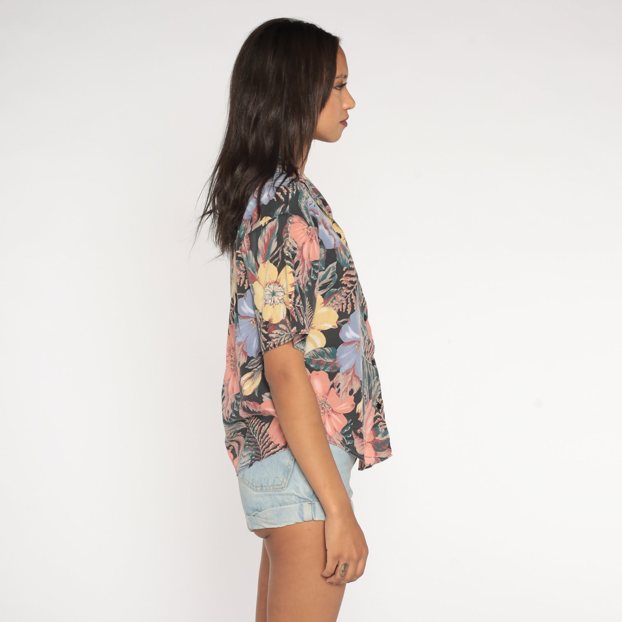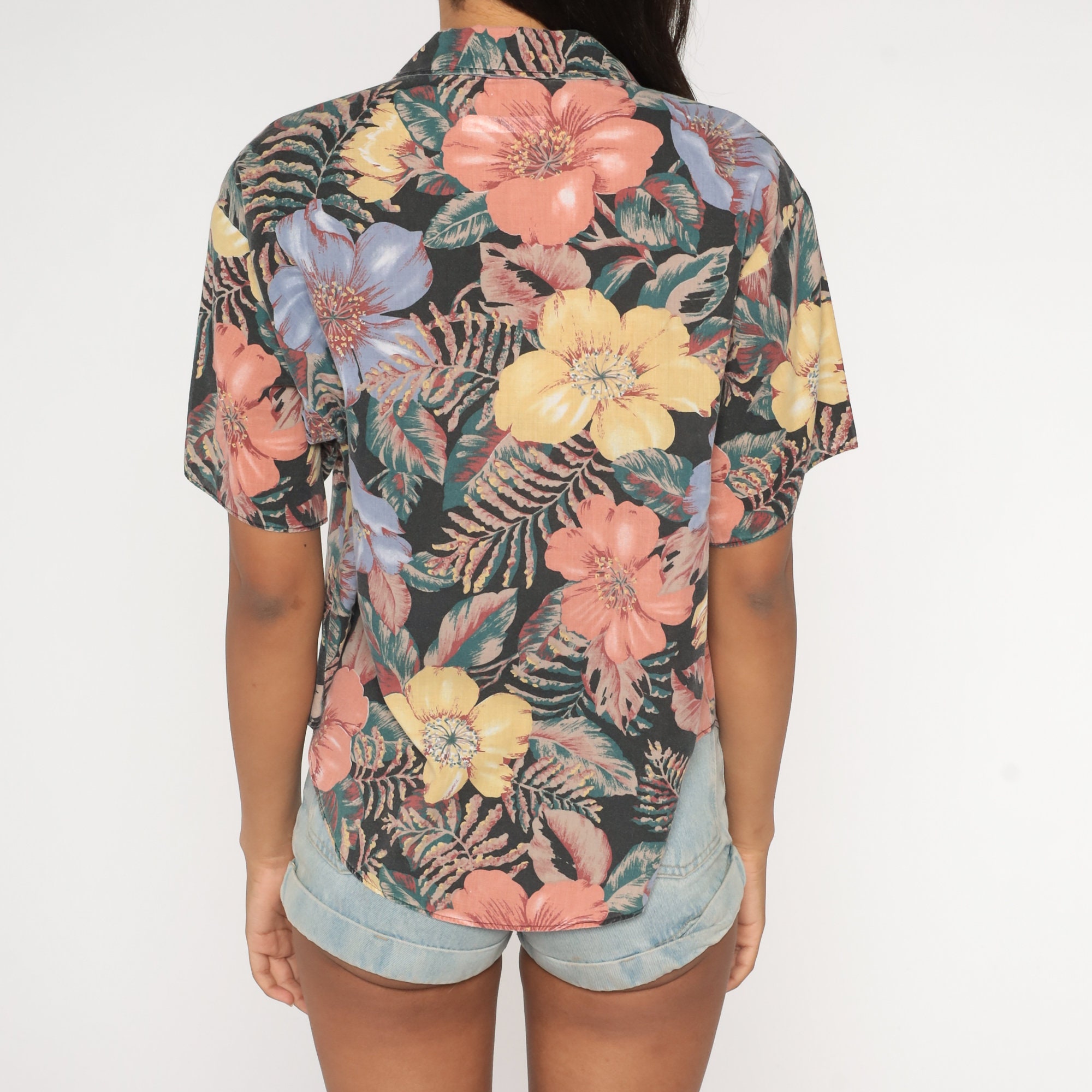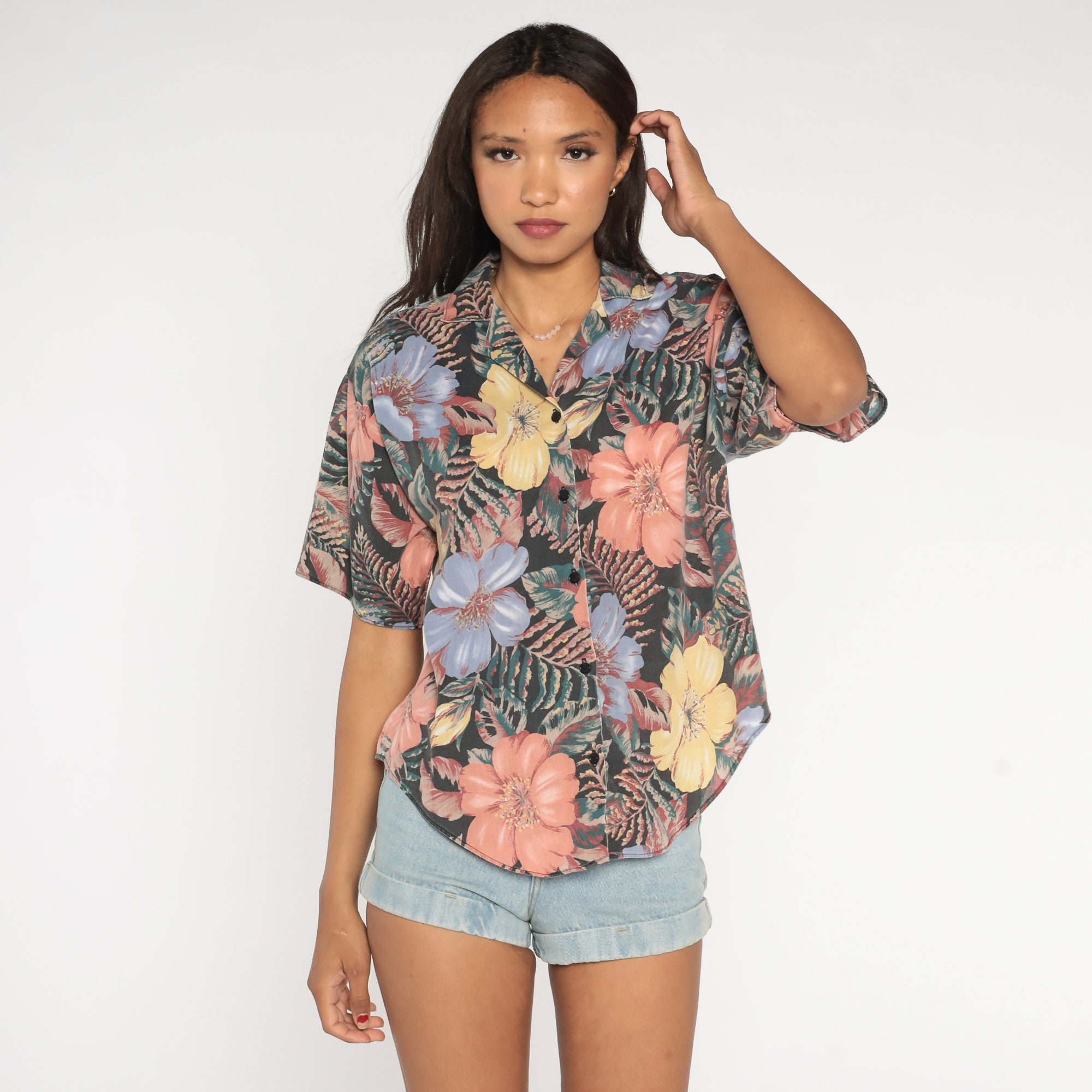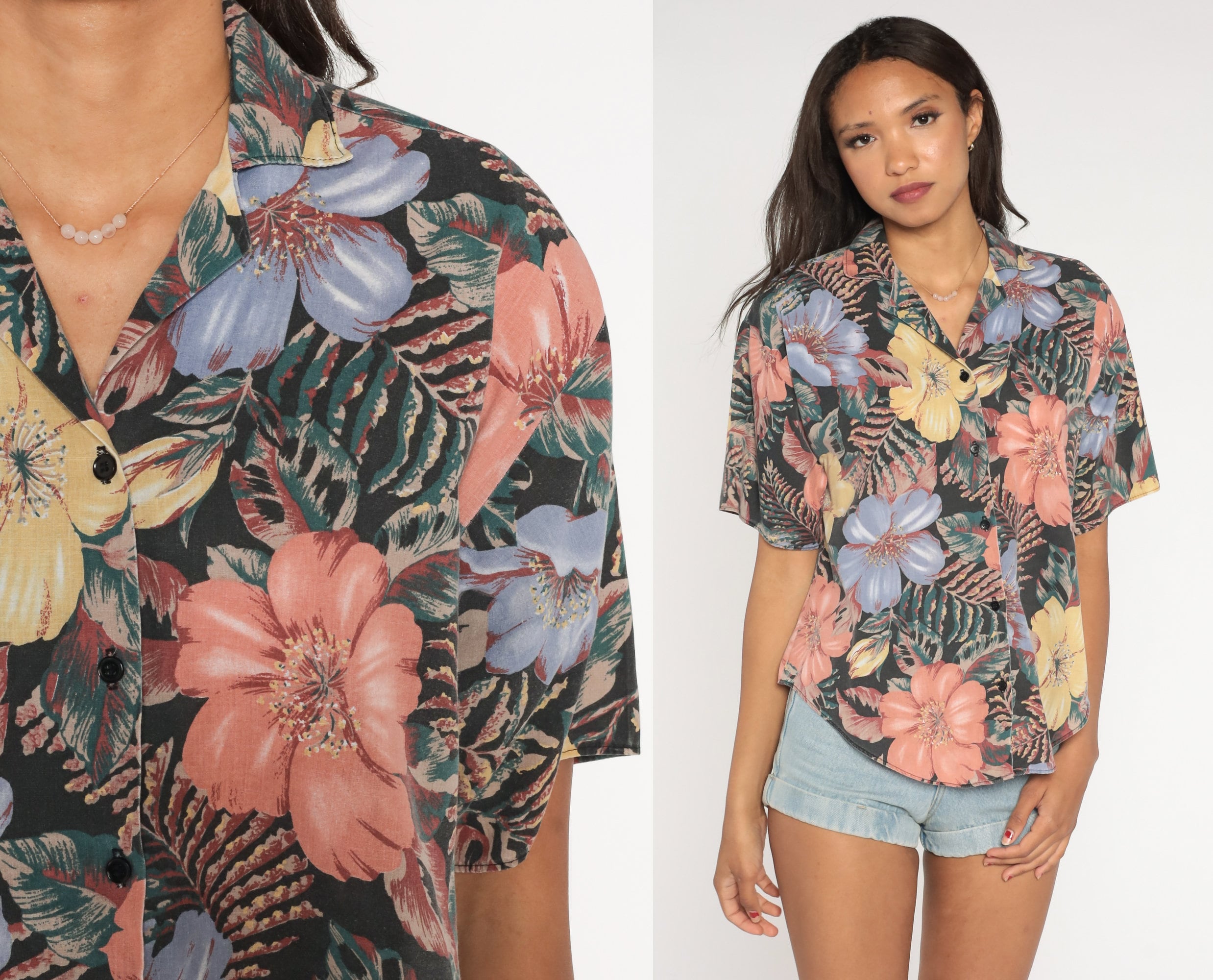 Vintage 90s shirt in a tropical floral print. It has short sleeves and buttons up the front.