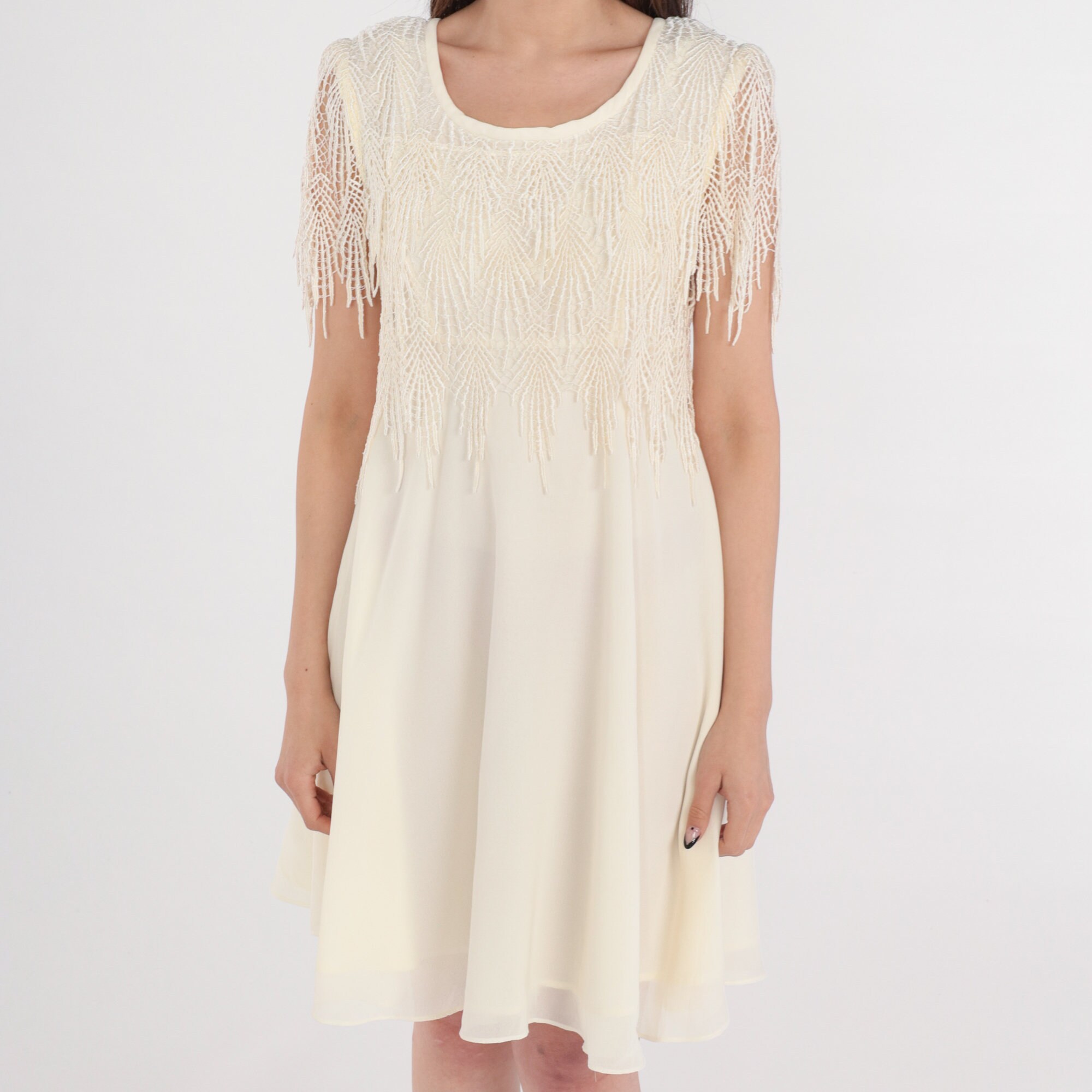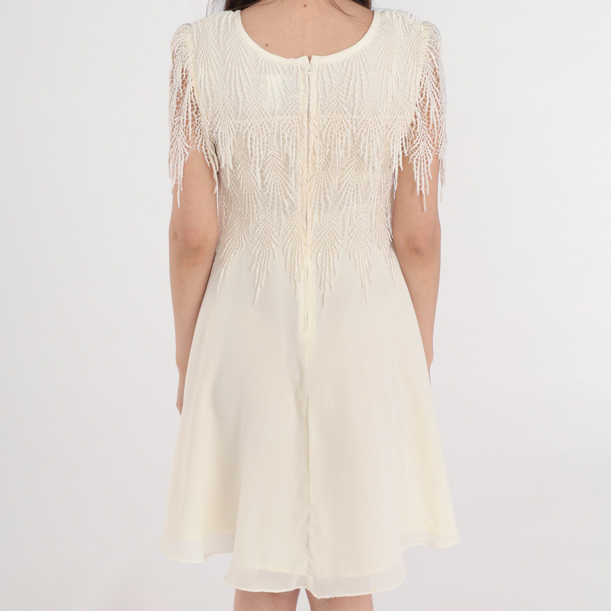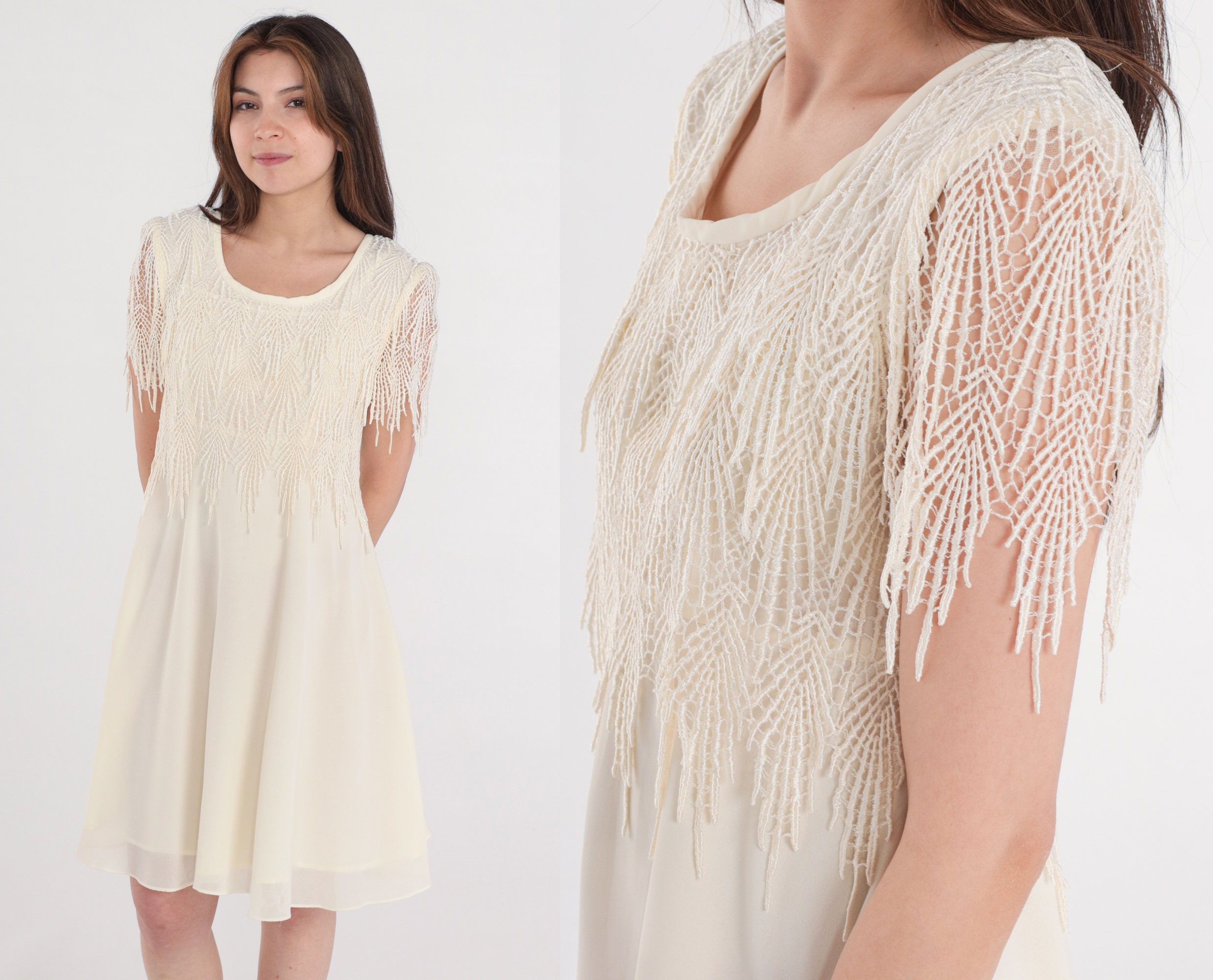 Vintage 90s dress in cream with a crochet fringe capelet. Mini length with a rear zipper.