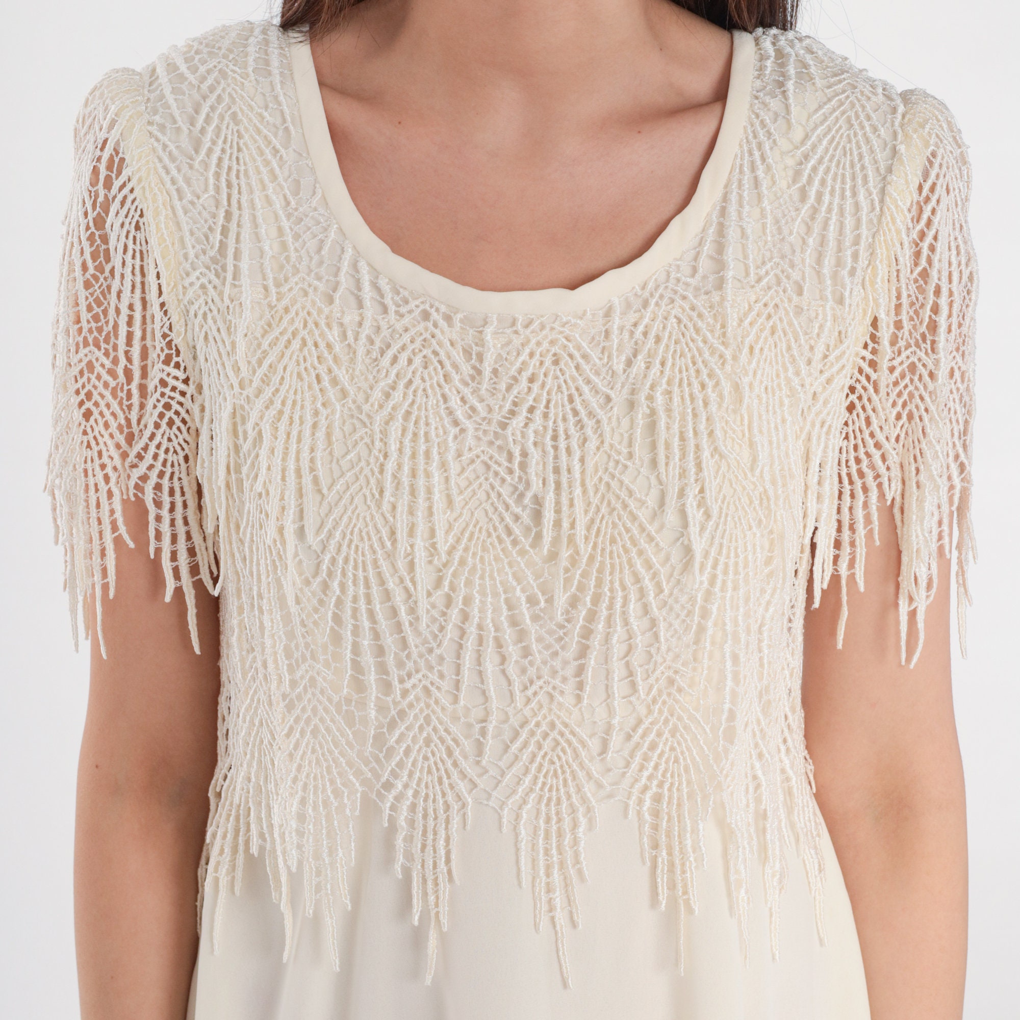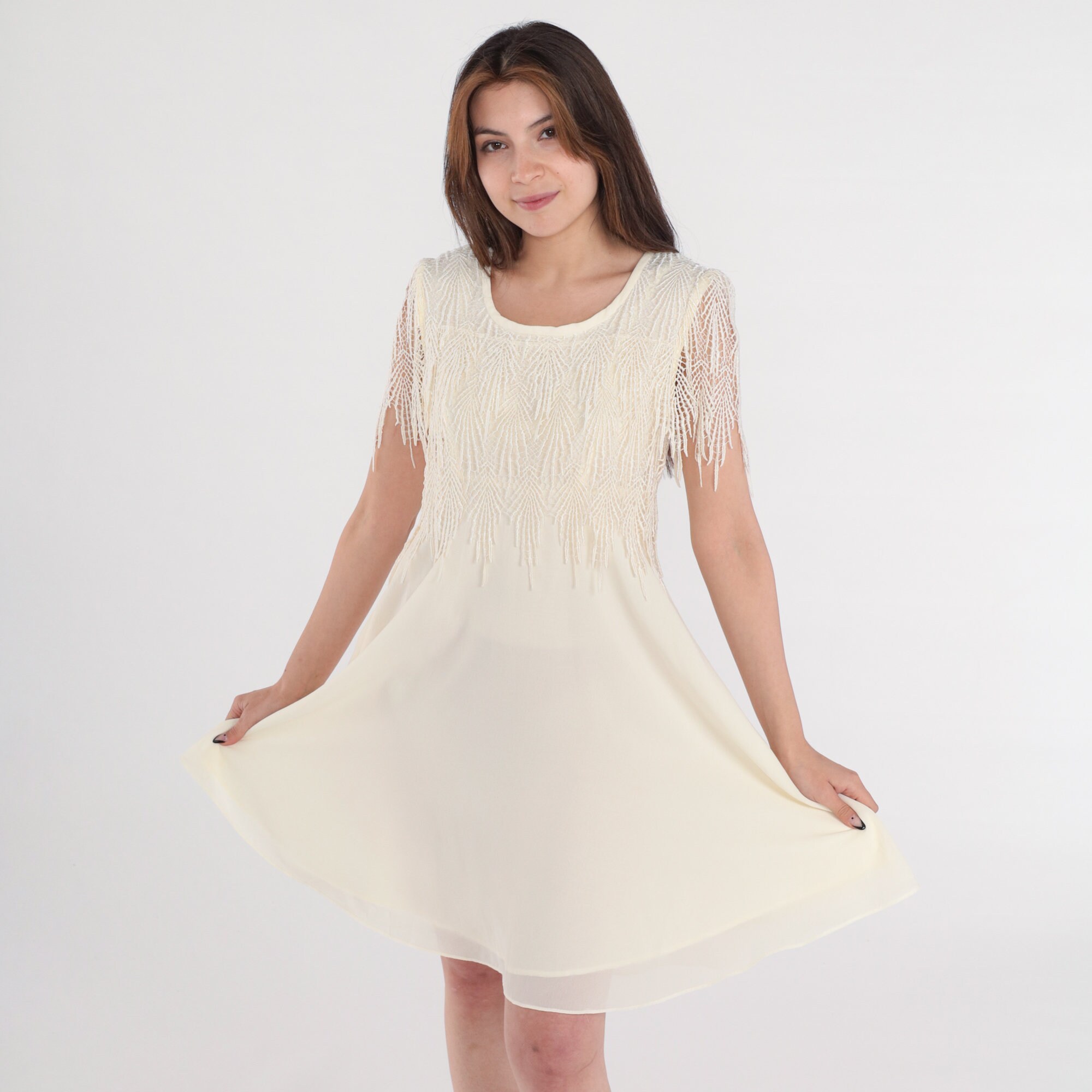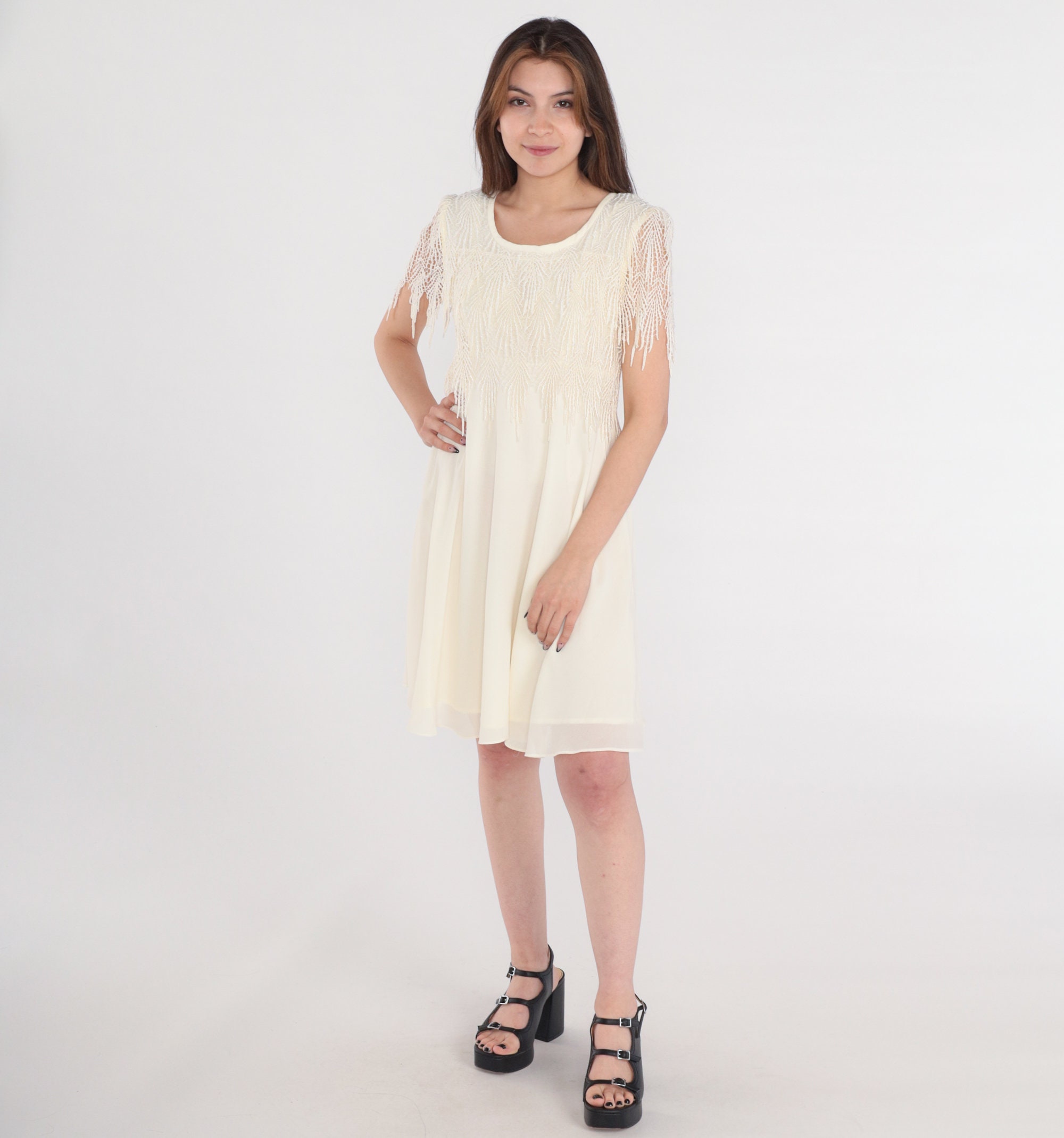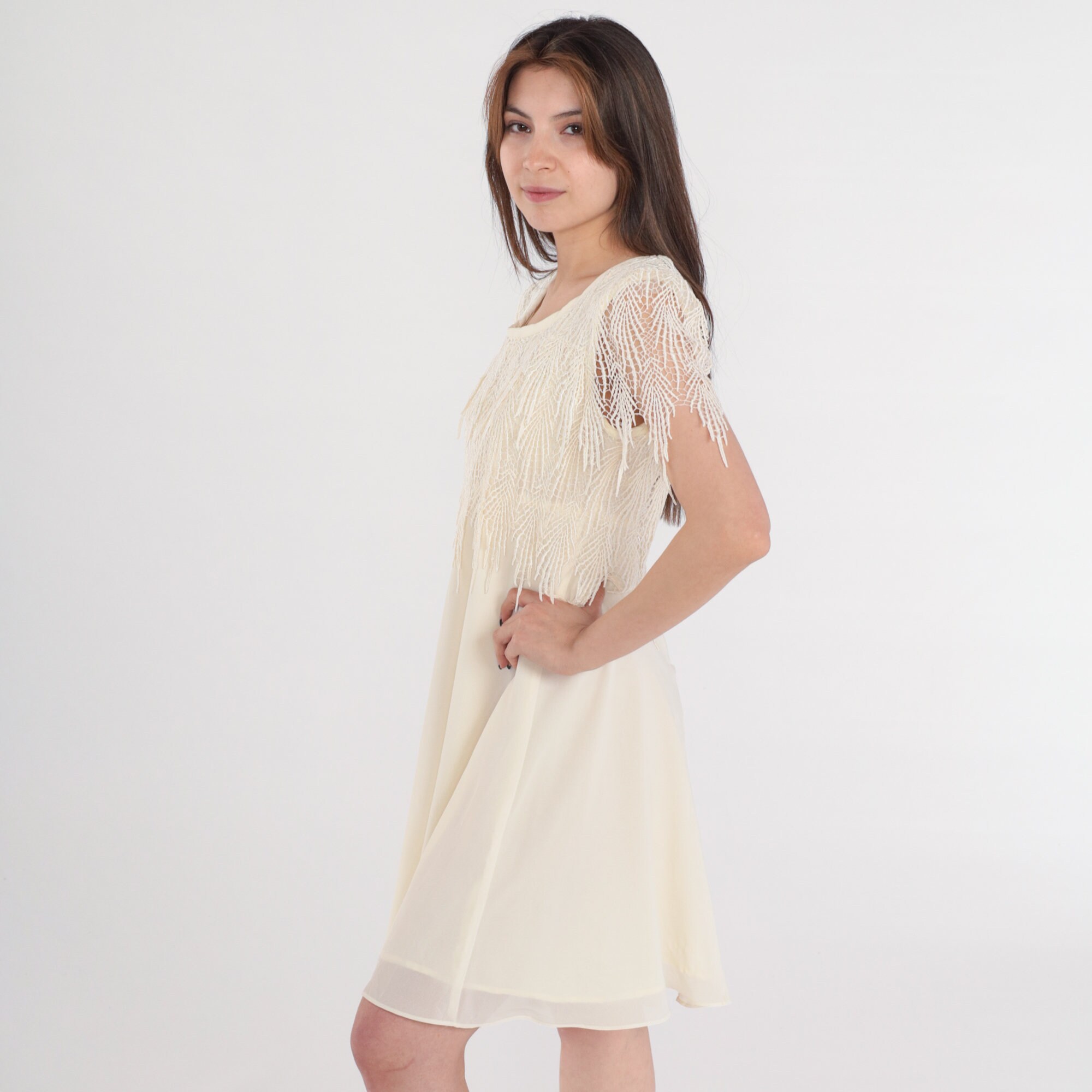 Vintage 90s dress in cream with a crochet fringe capelet. Mini length with a rear zipper.