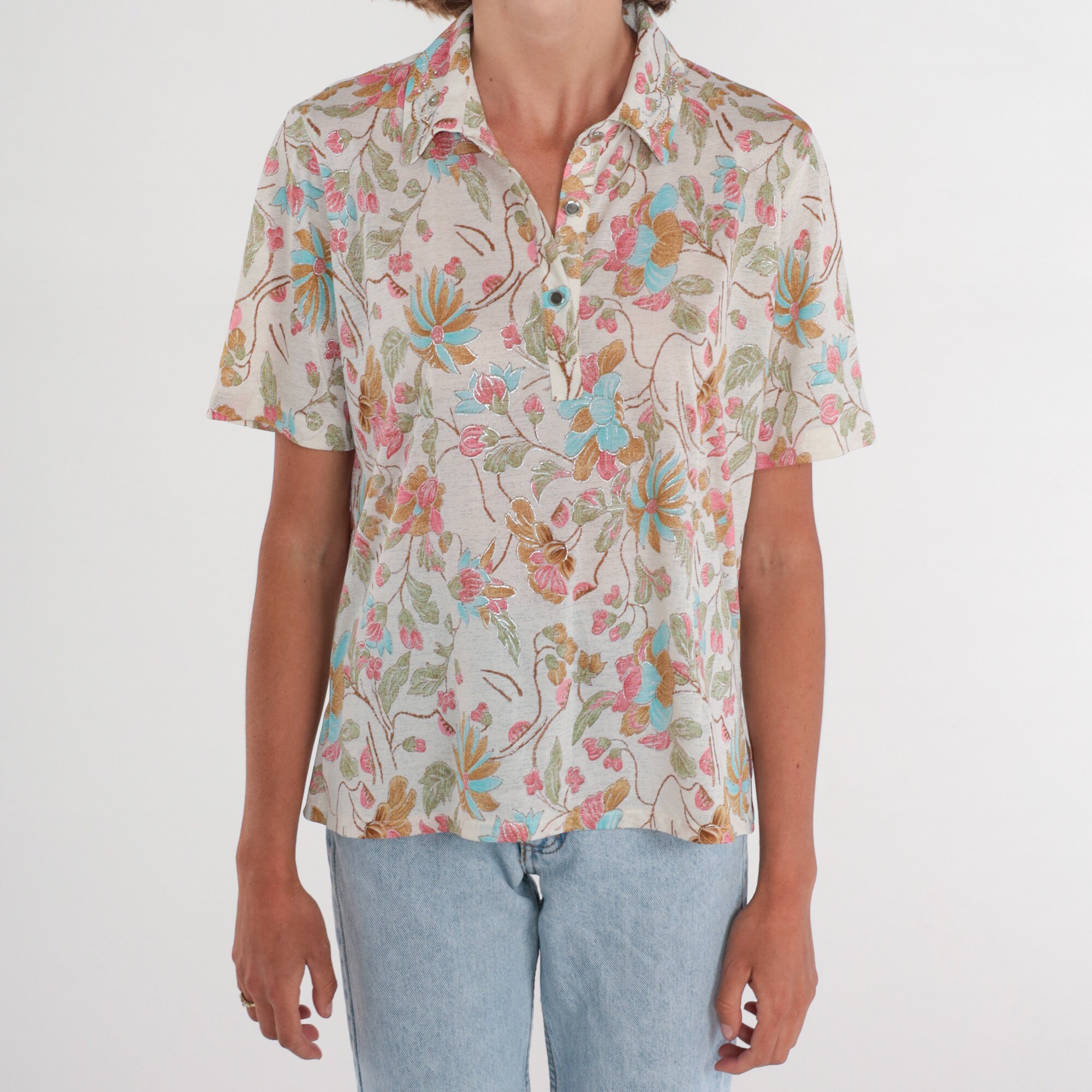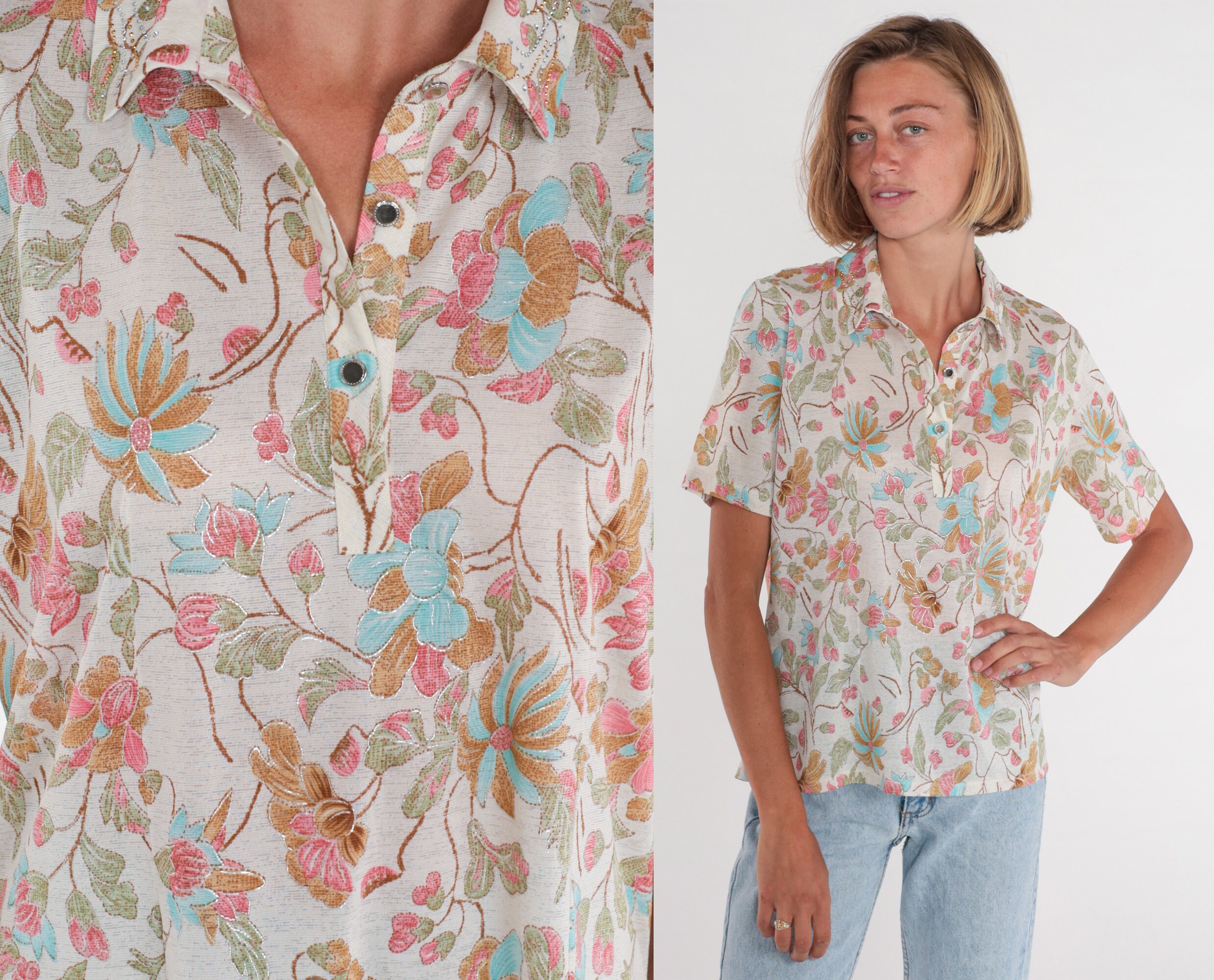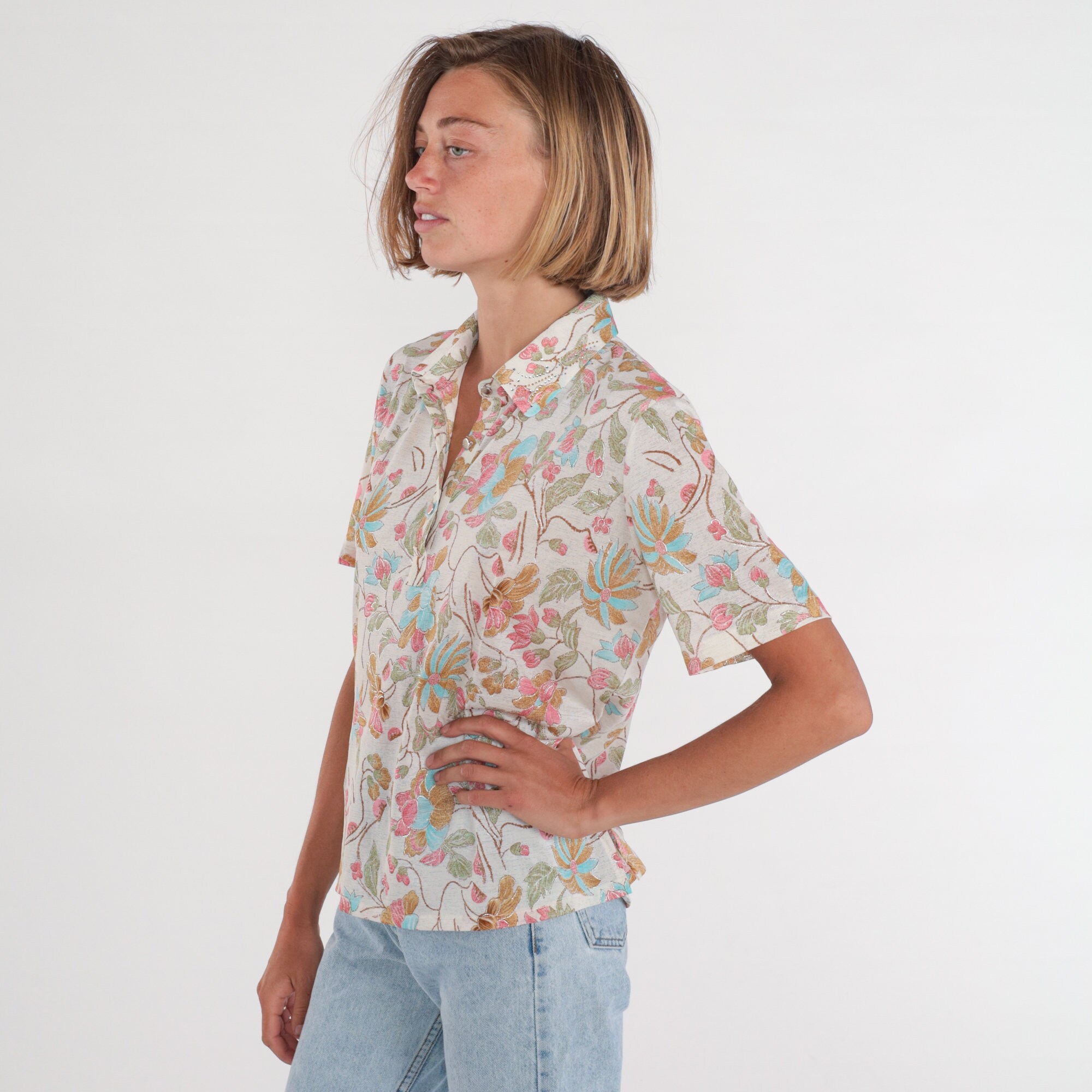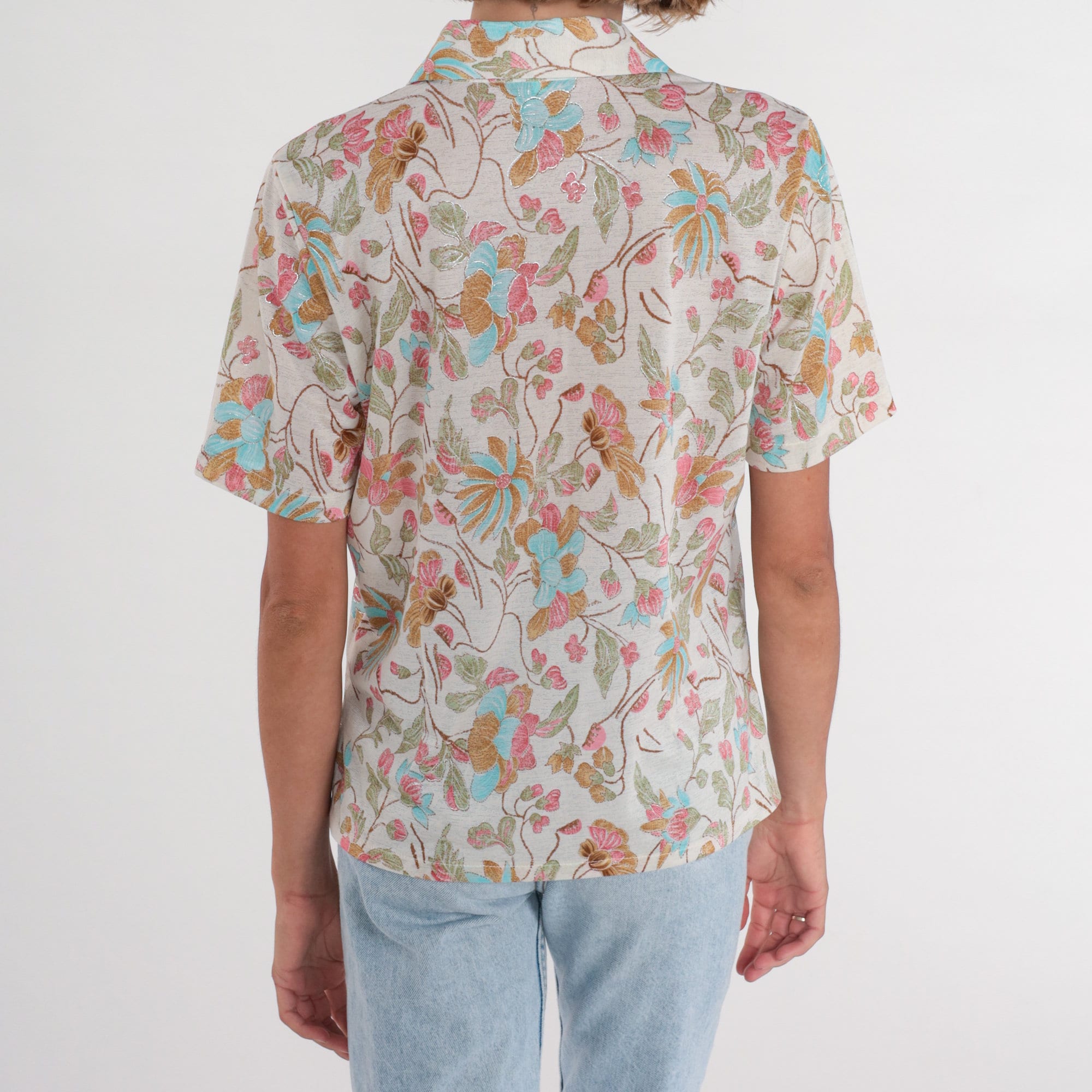 Vintage Y2K blouse in Semi-Sheer white with a floral print with silver trim and metallic rhinestones on the collar. Short sleeves, a collar, and buttons up the chest.