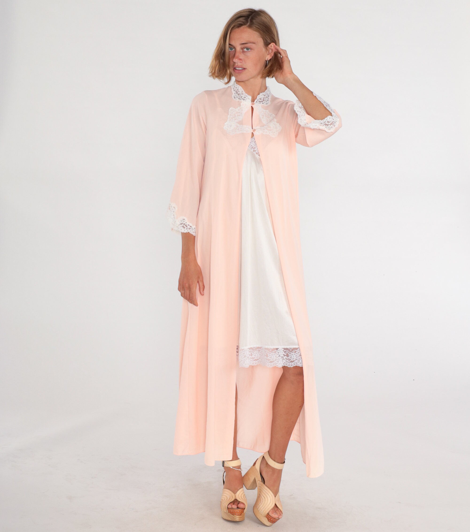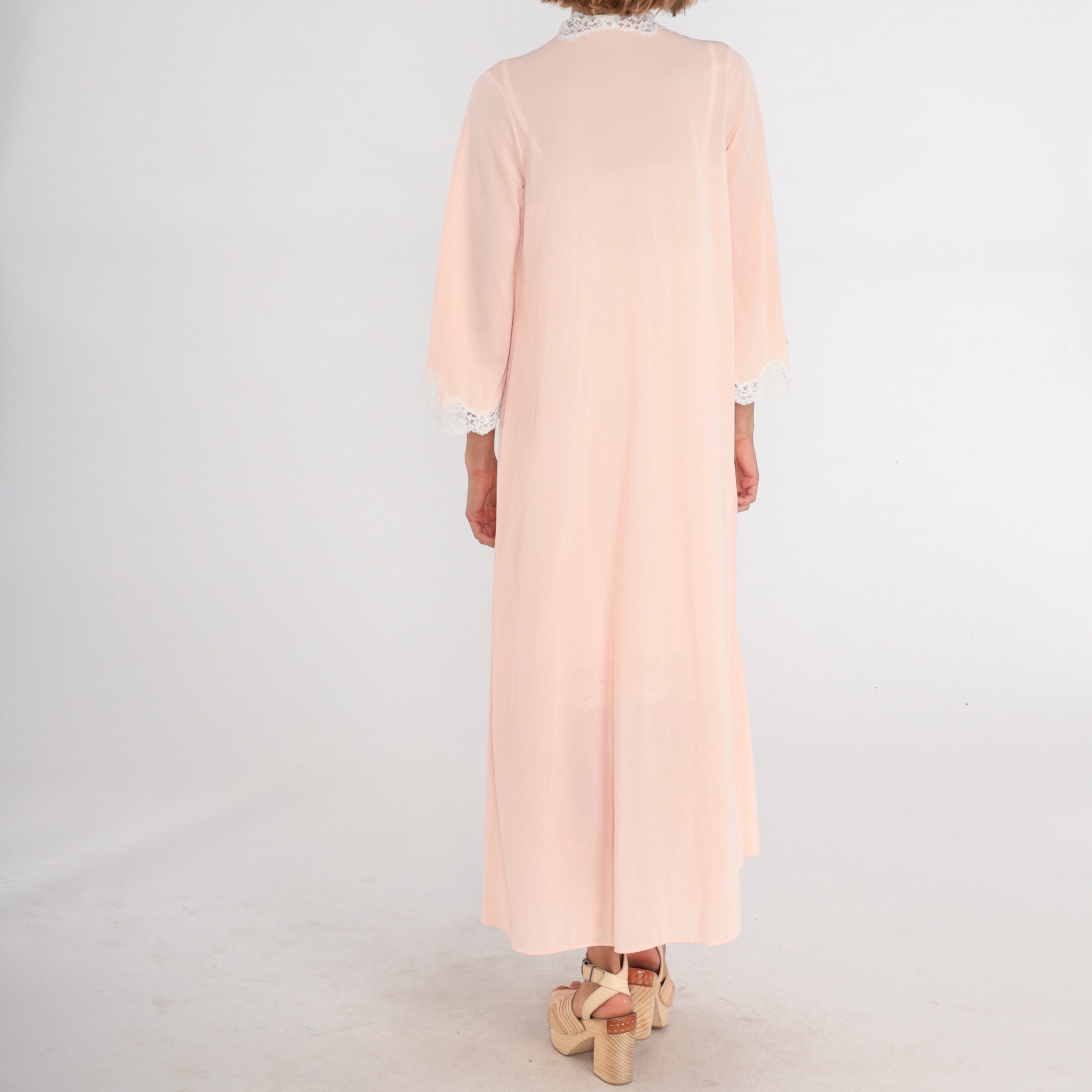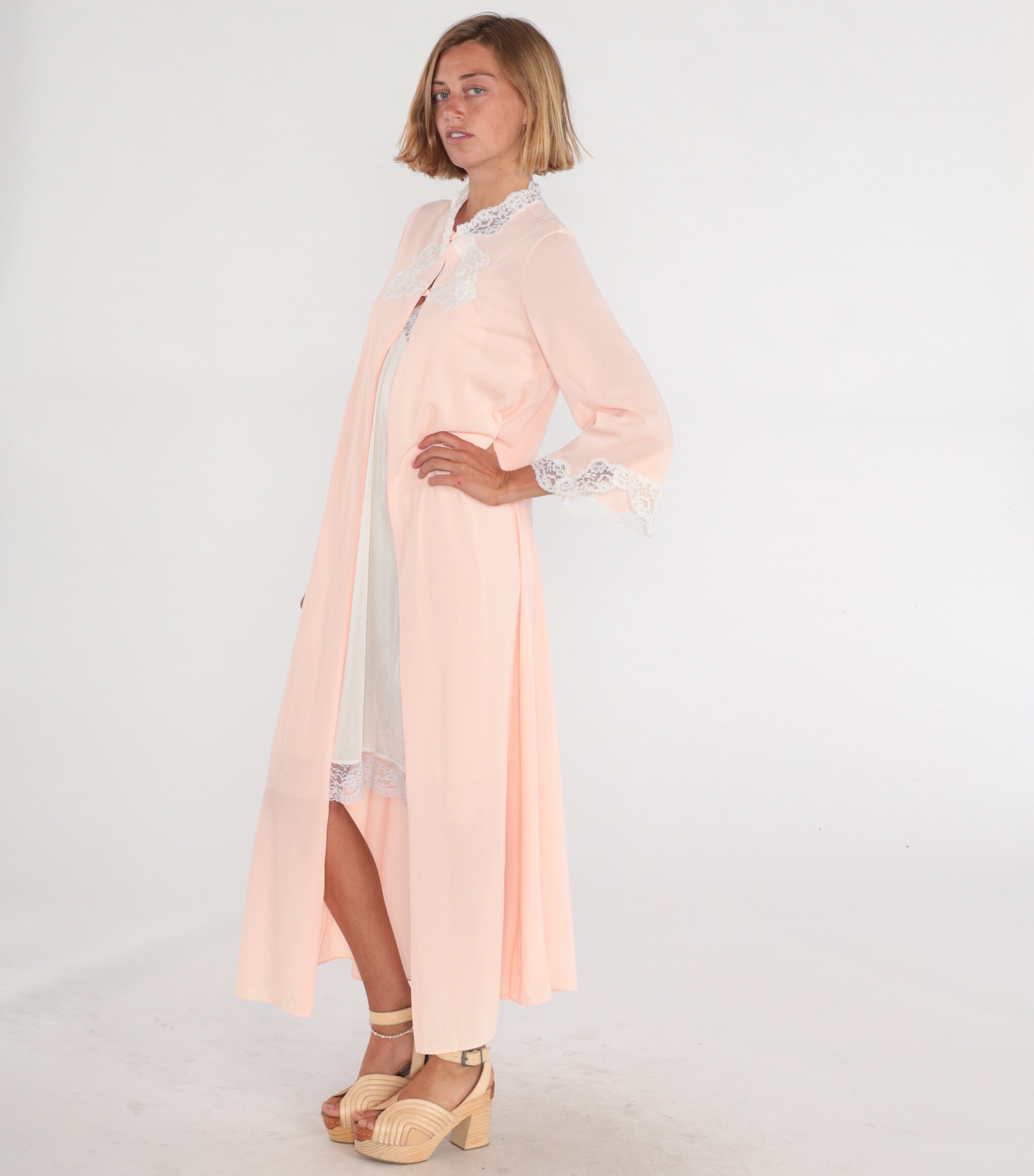 Vintage 70s pajama robe in peachy pink with lace trim. Long sleeves and an open front with buttons on the chest. Maxi length.