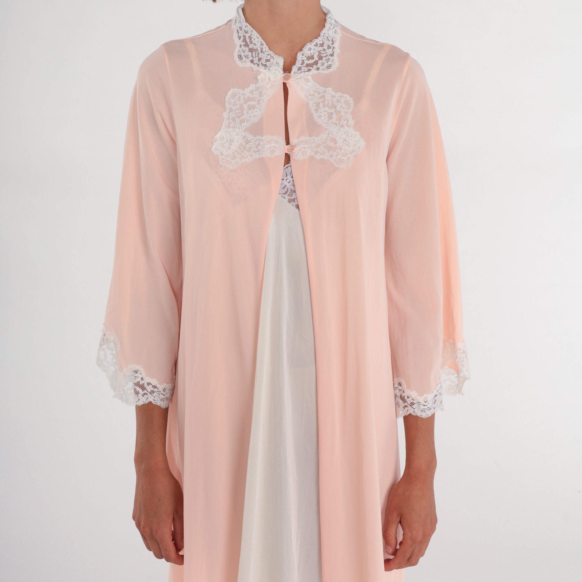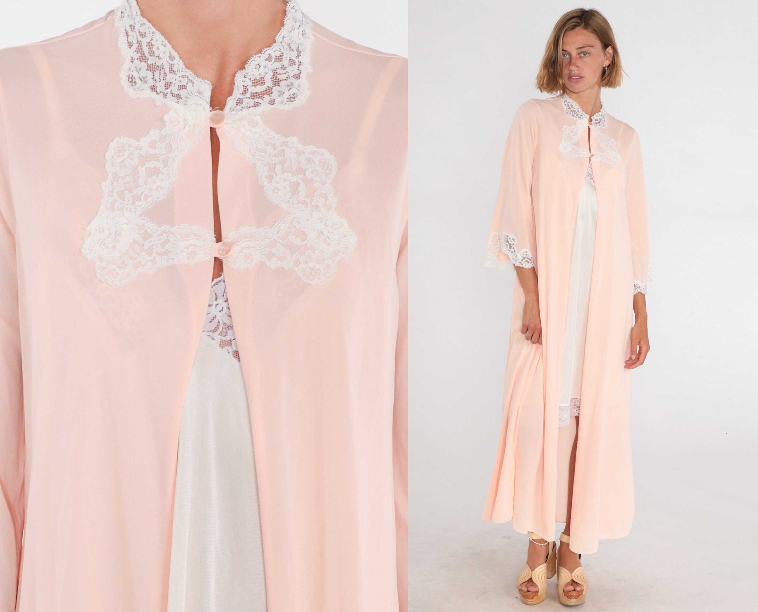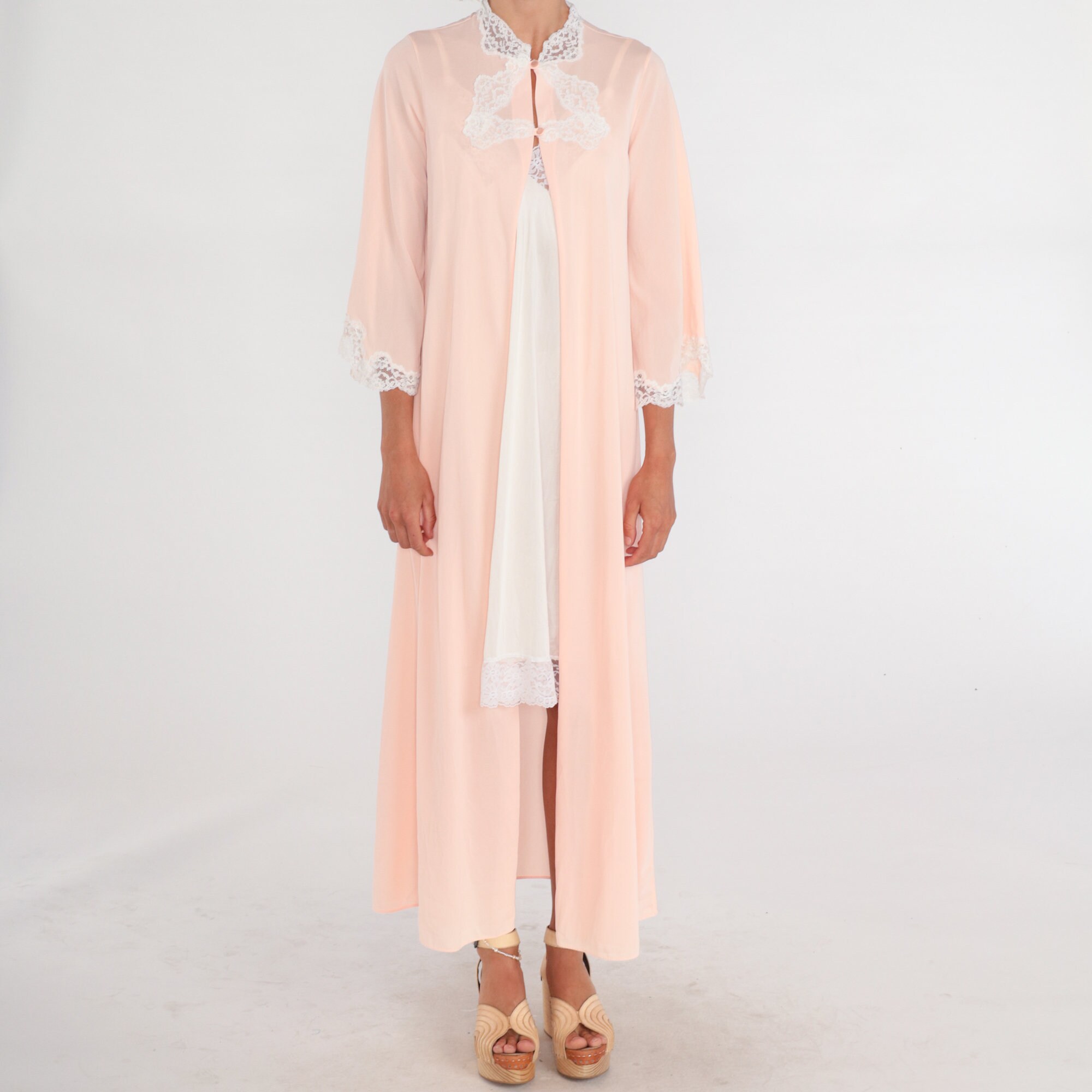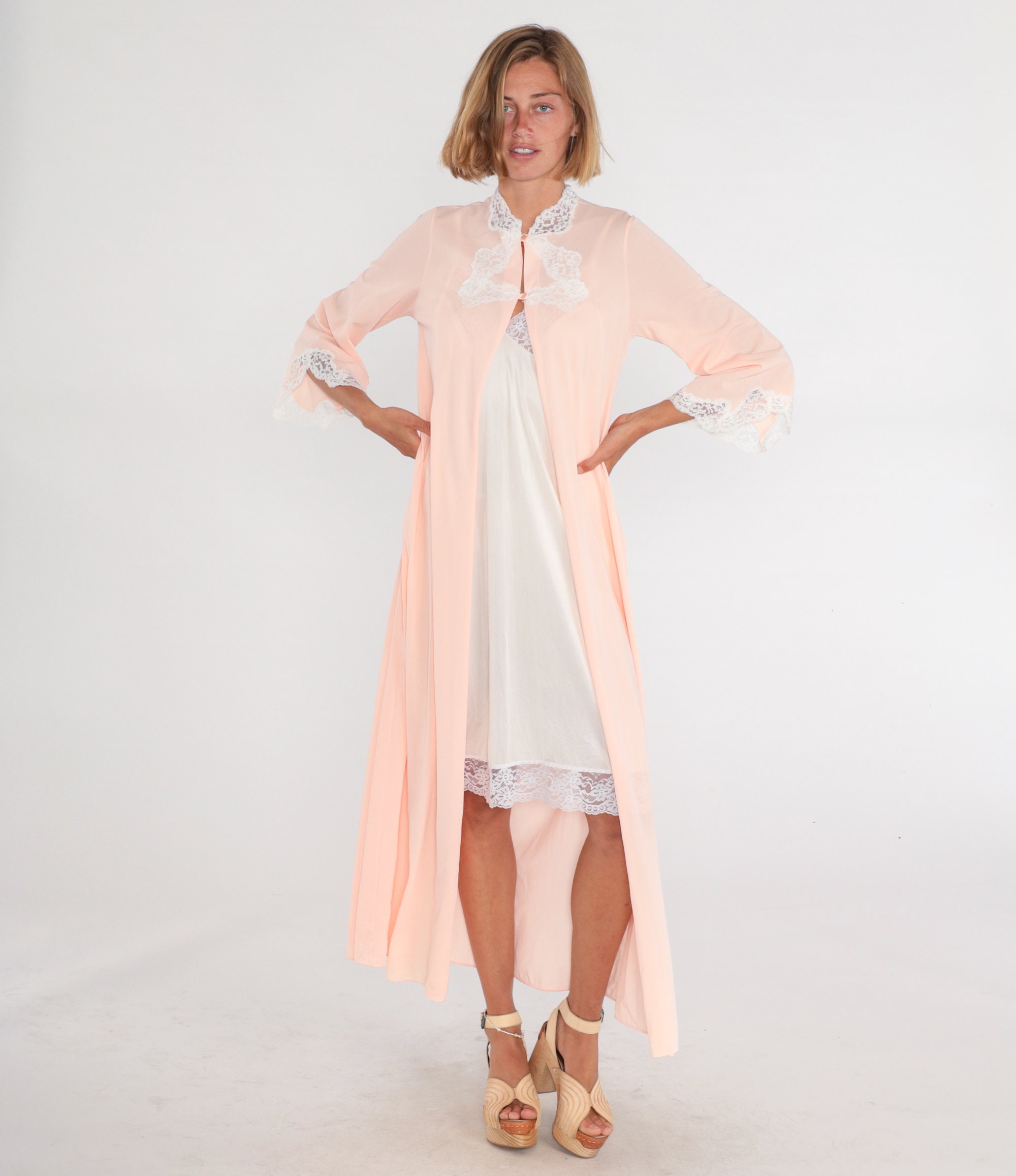 Vintage 70s pajama robe in peachy pink with lace trim. Long sleeves and an open front with buttons on the chest. Maxi length.