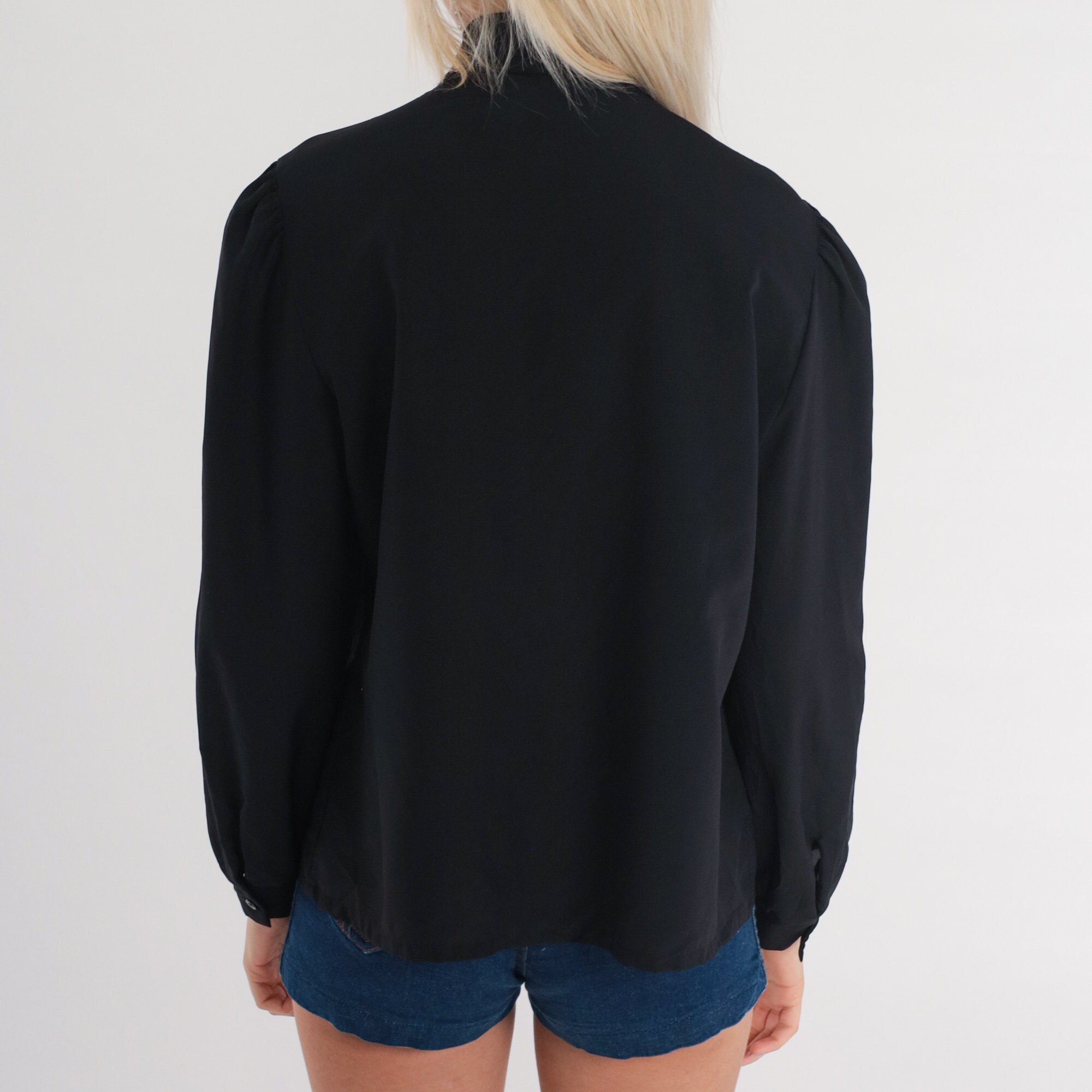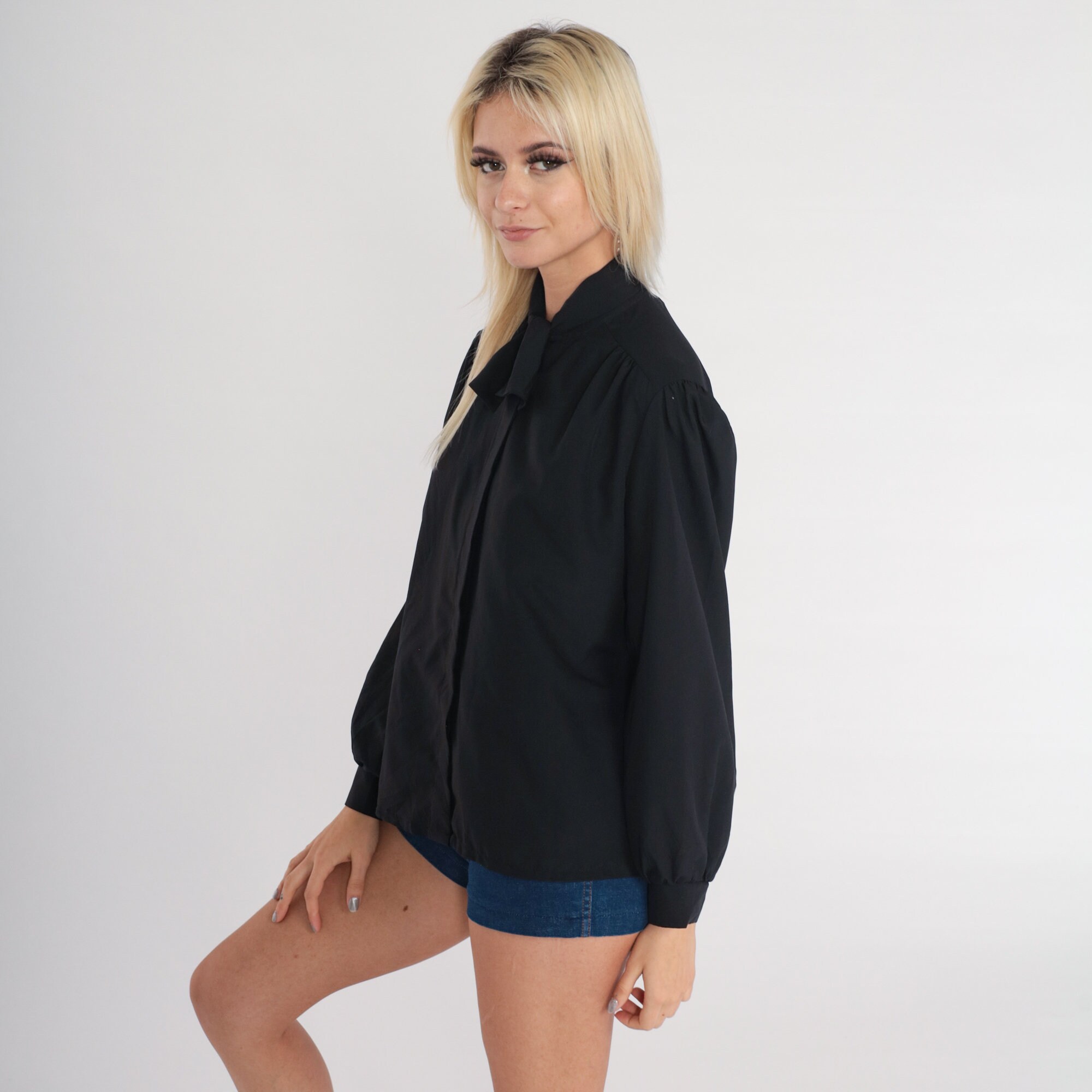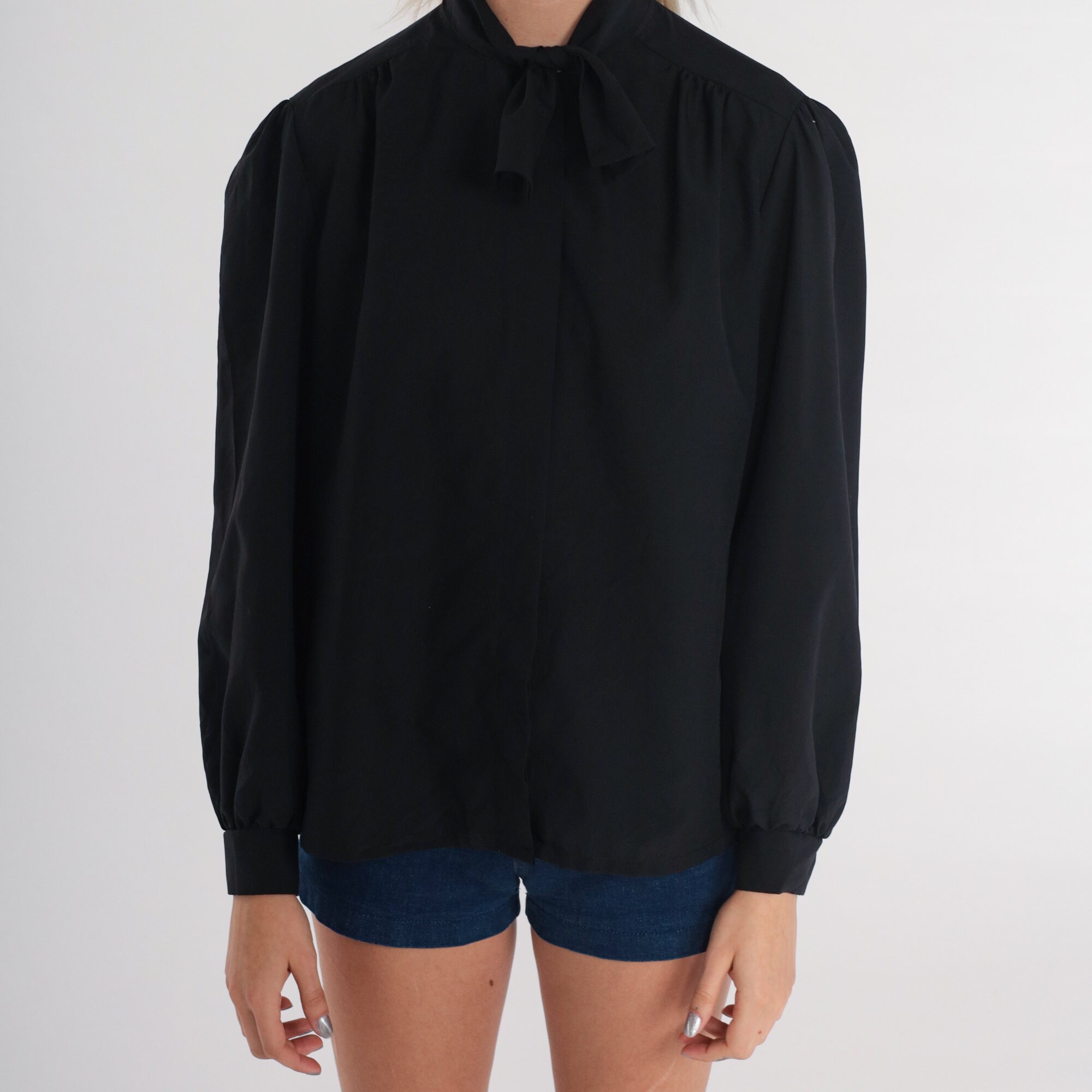 Vintage 70s shirt in black with long puff sleeves, a necktie, and hidden buttons down the front.