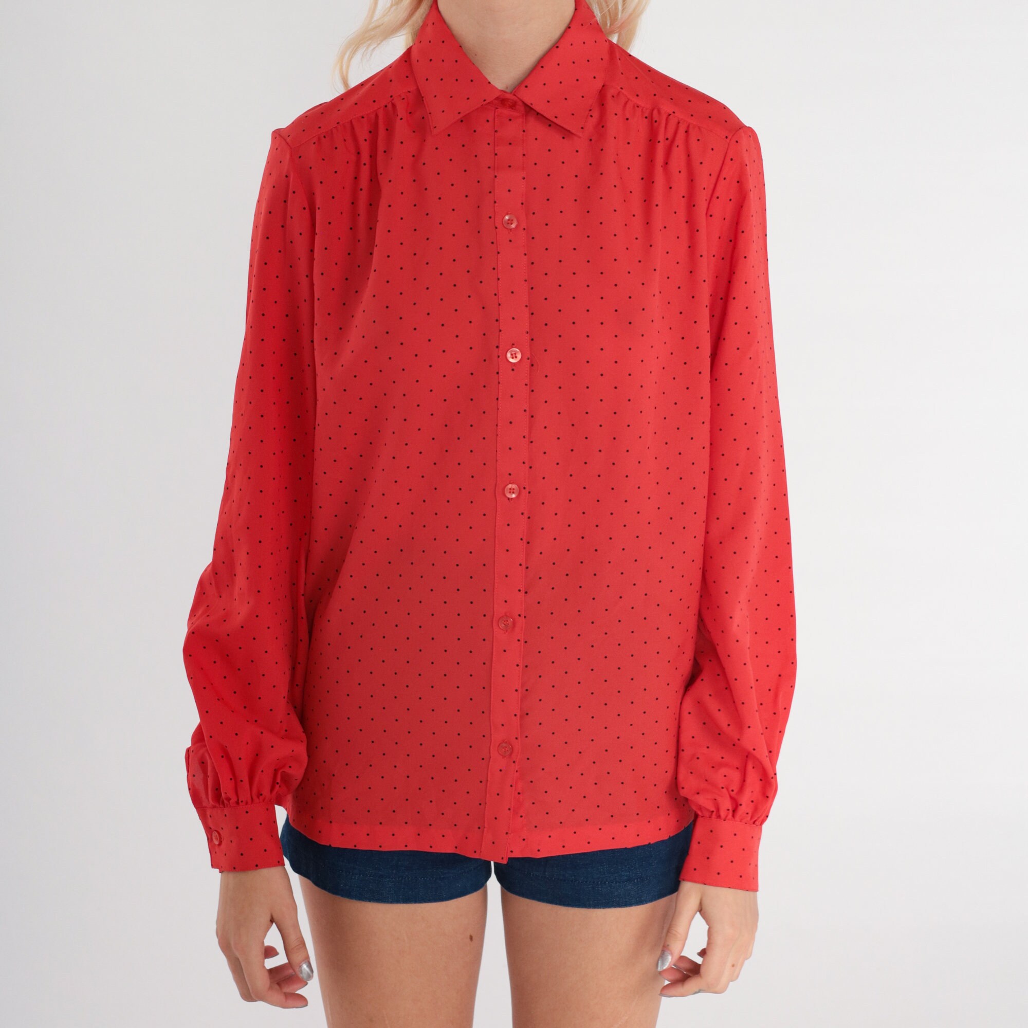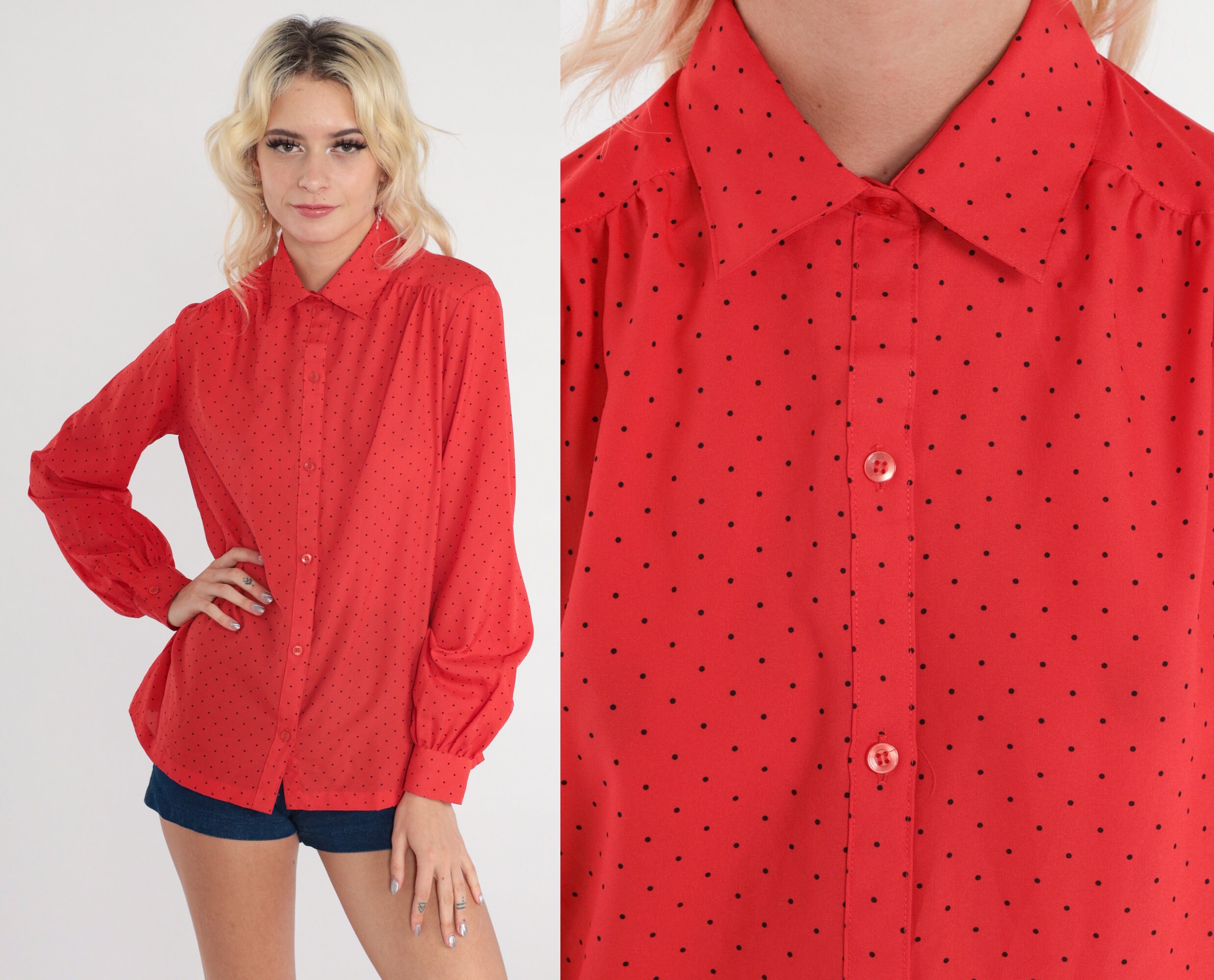Vintage 70s 80s blouse in red with polka dots. Buttons up with long sleeves and a collar.