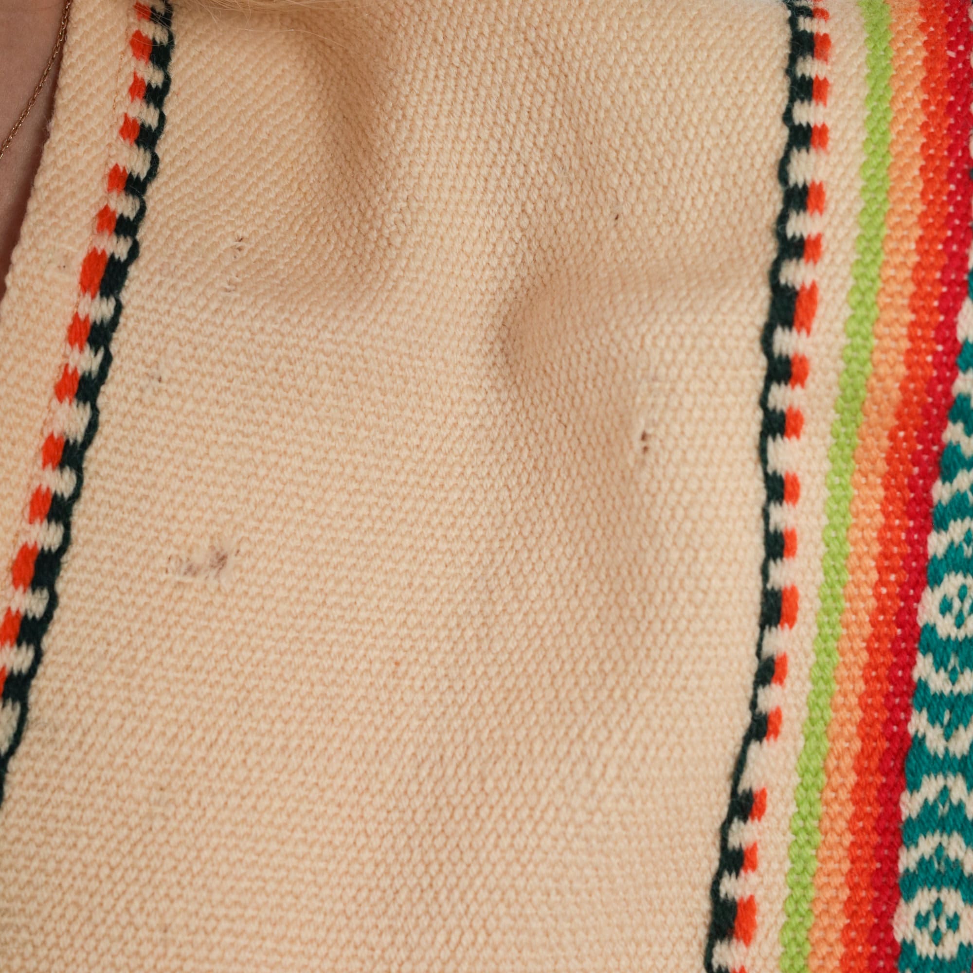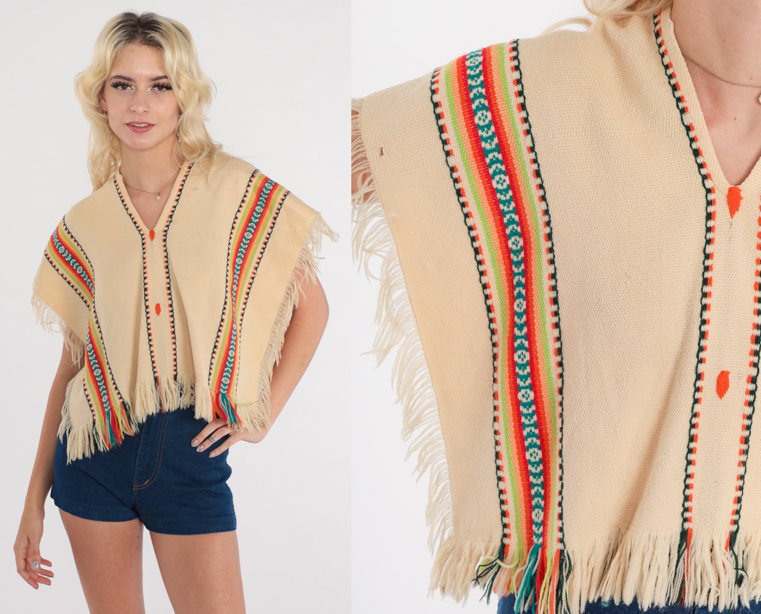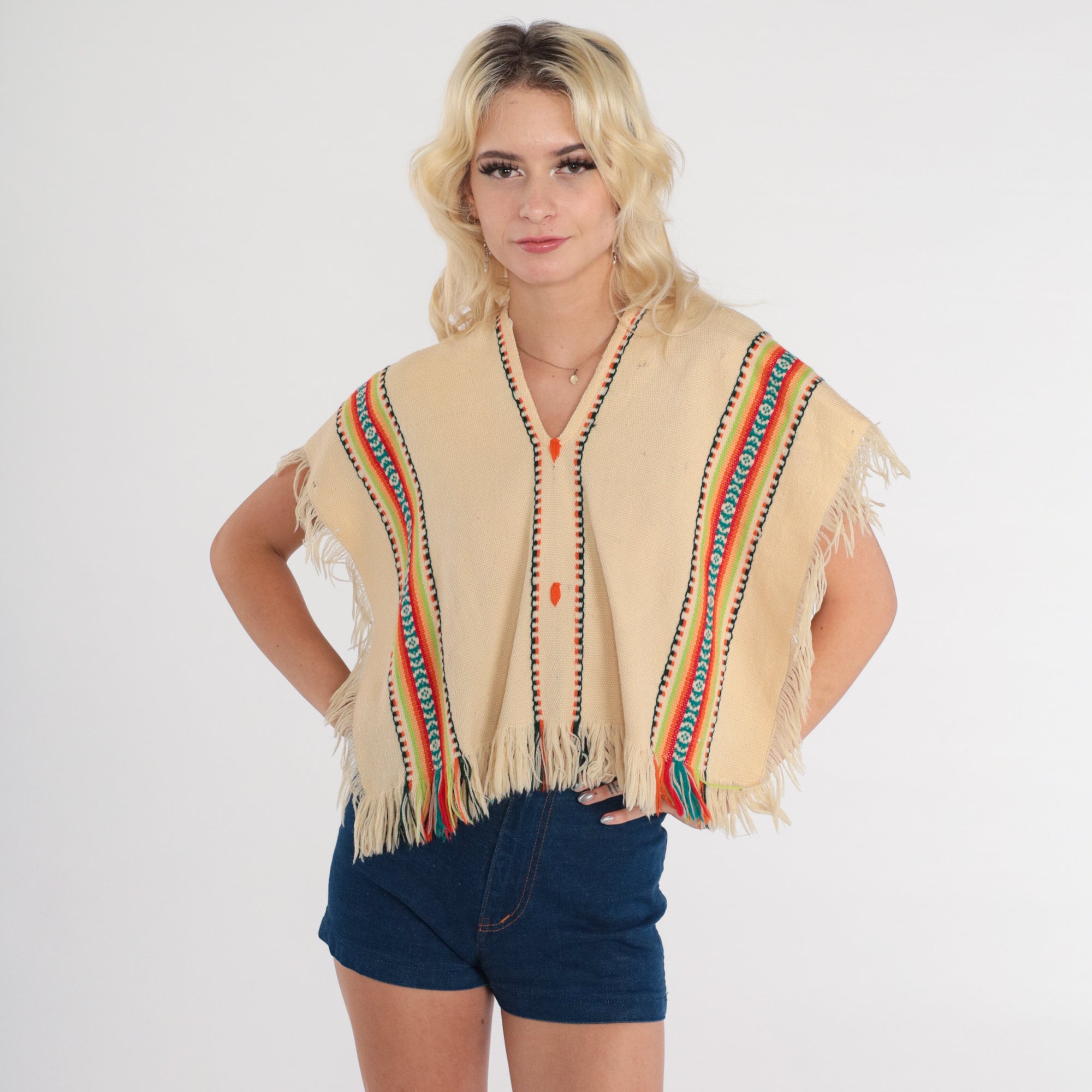 Vintage 70s poncho in cream wool with a Southwestern print and a fringe trim. Open fit.
