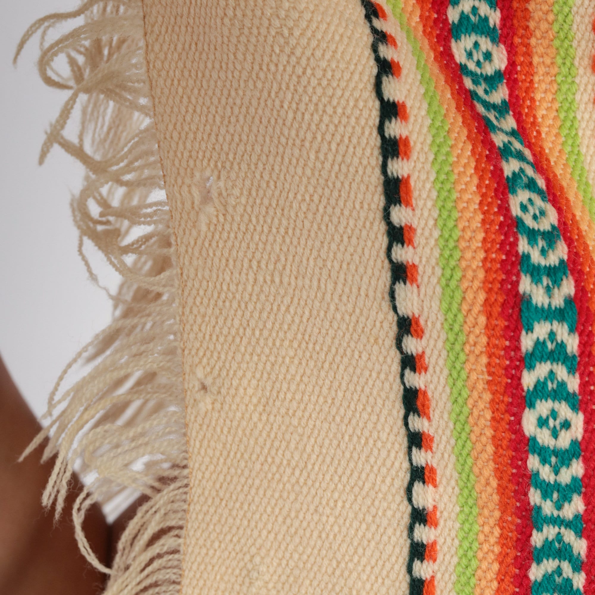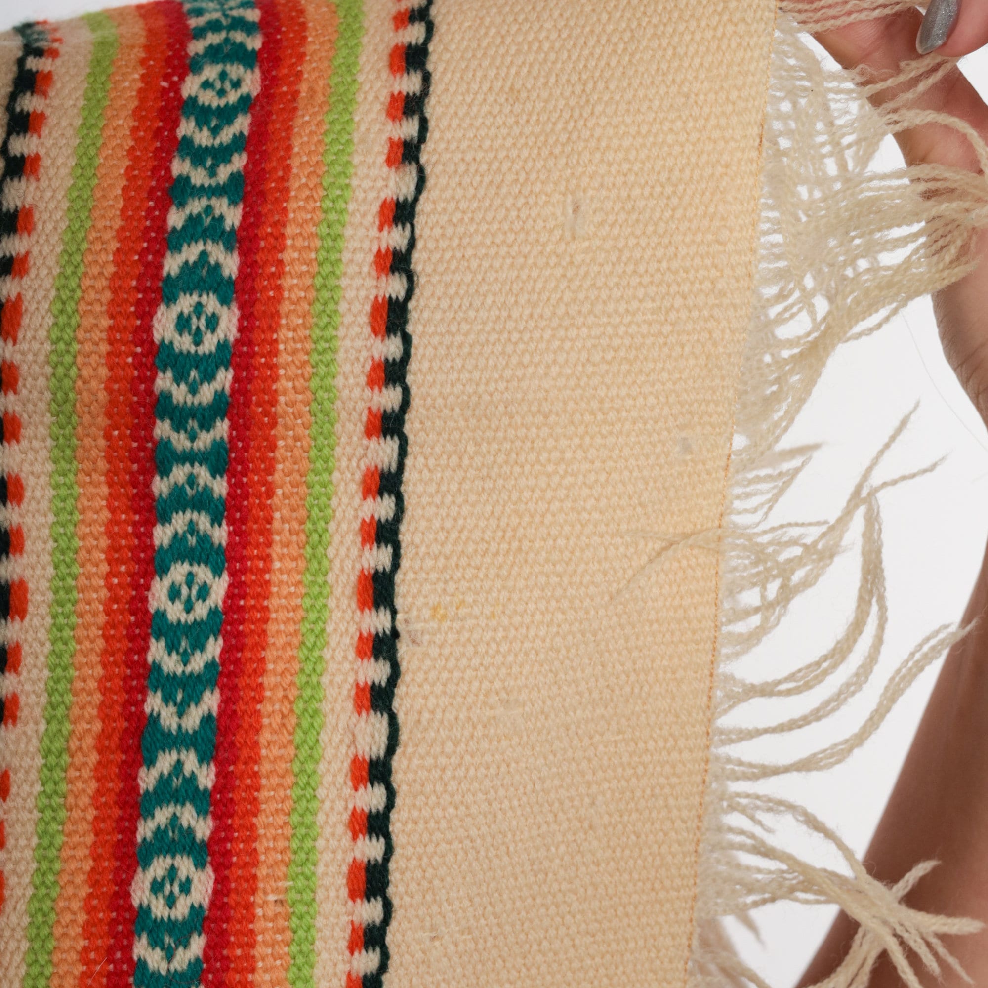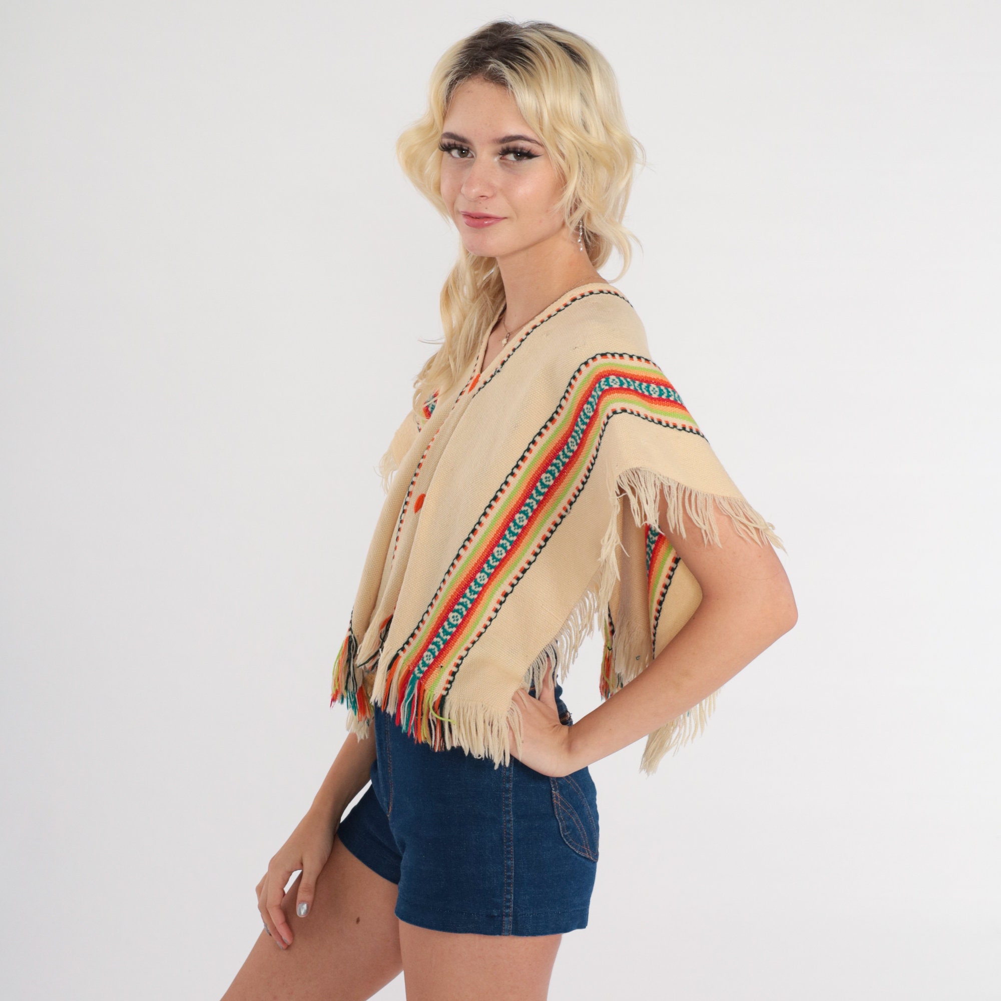 Vintage 70s poncho in cream wool with a Southwestern print and a fringe trim. Open fit.