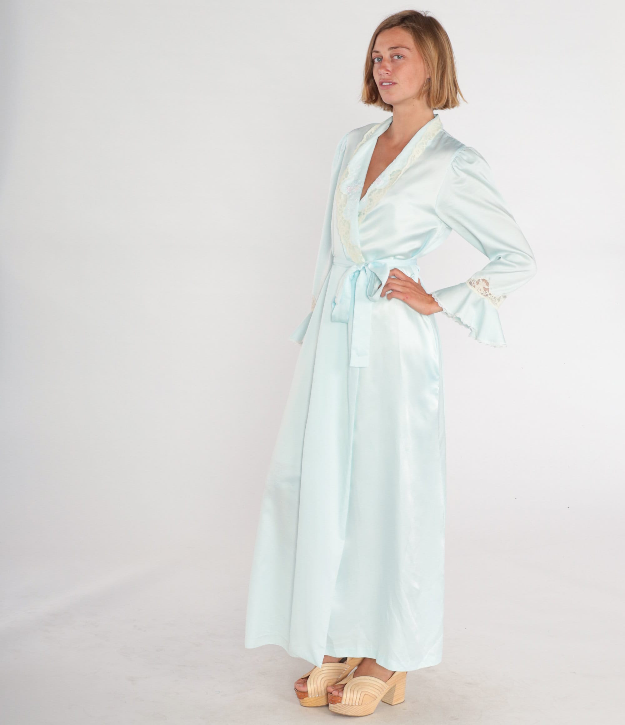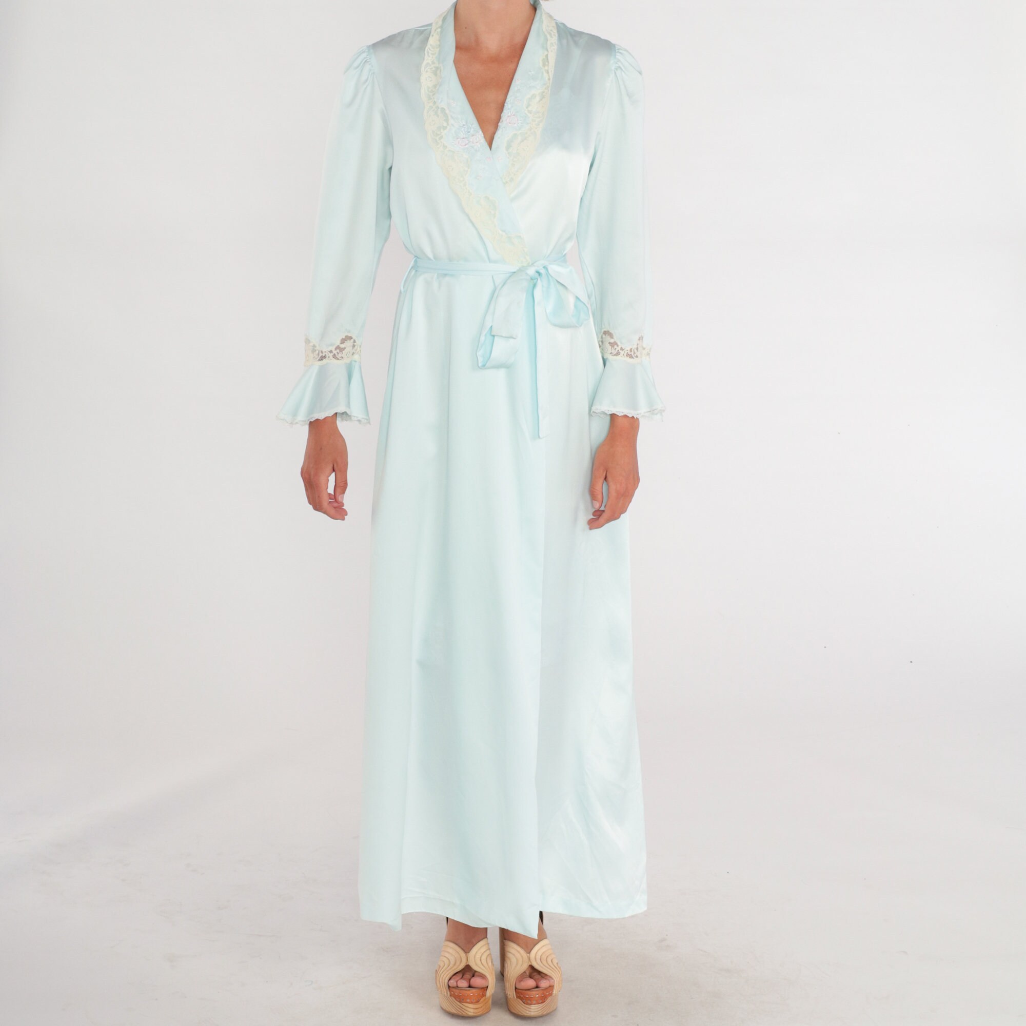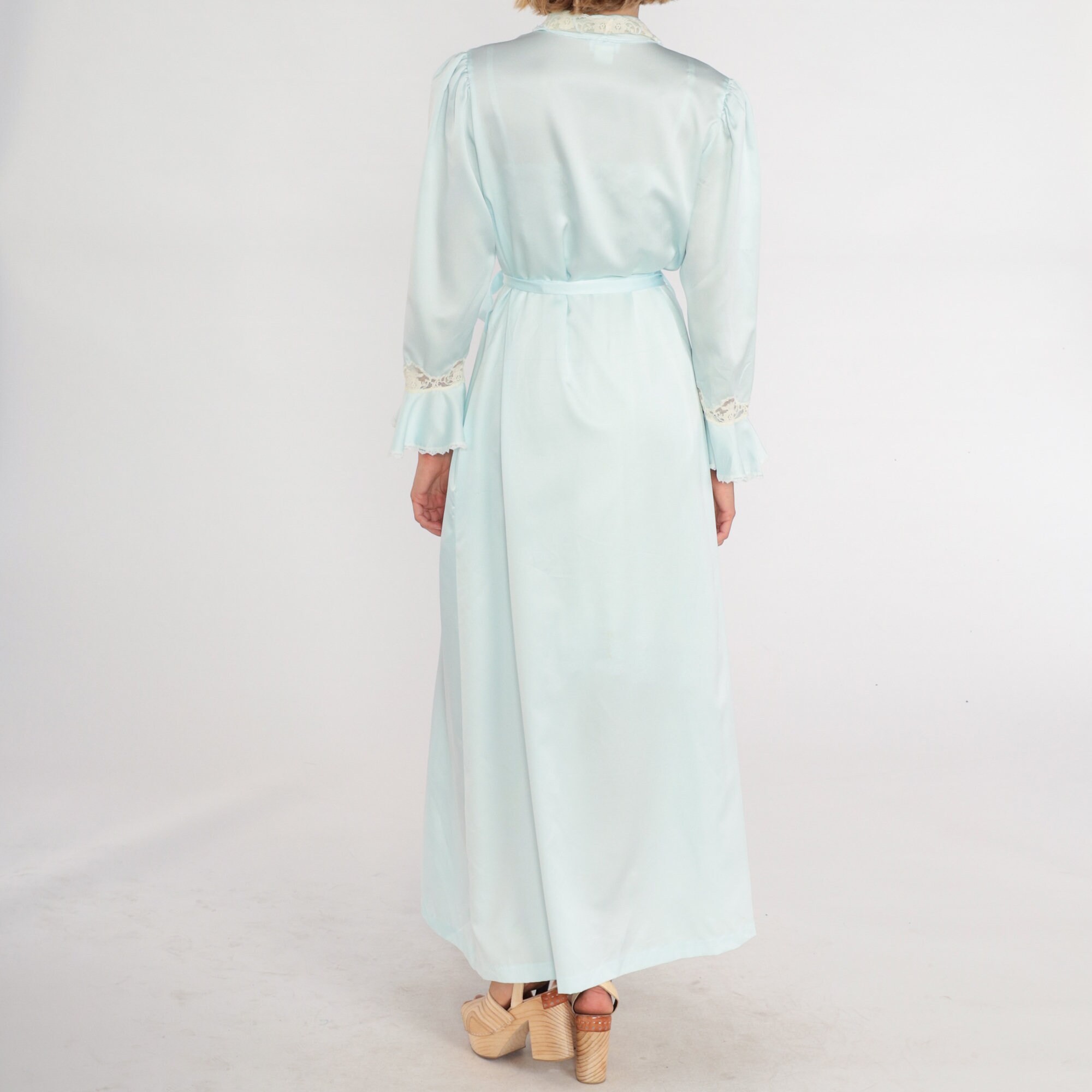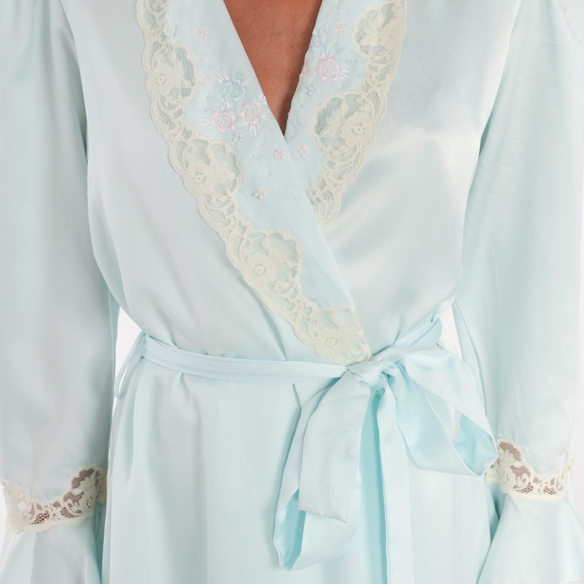 Vintage 70s pajama robe in blue with floral lace, embroidery, and beading. Long sleeves with a lace ruffled trim and a tie front. Maxi length.