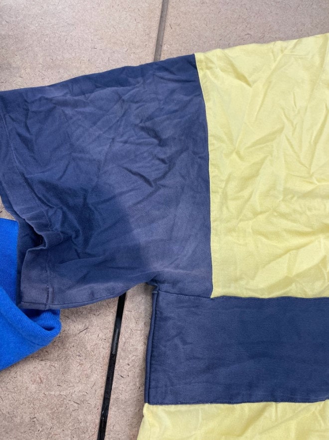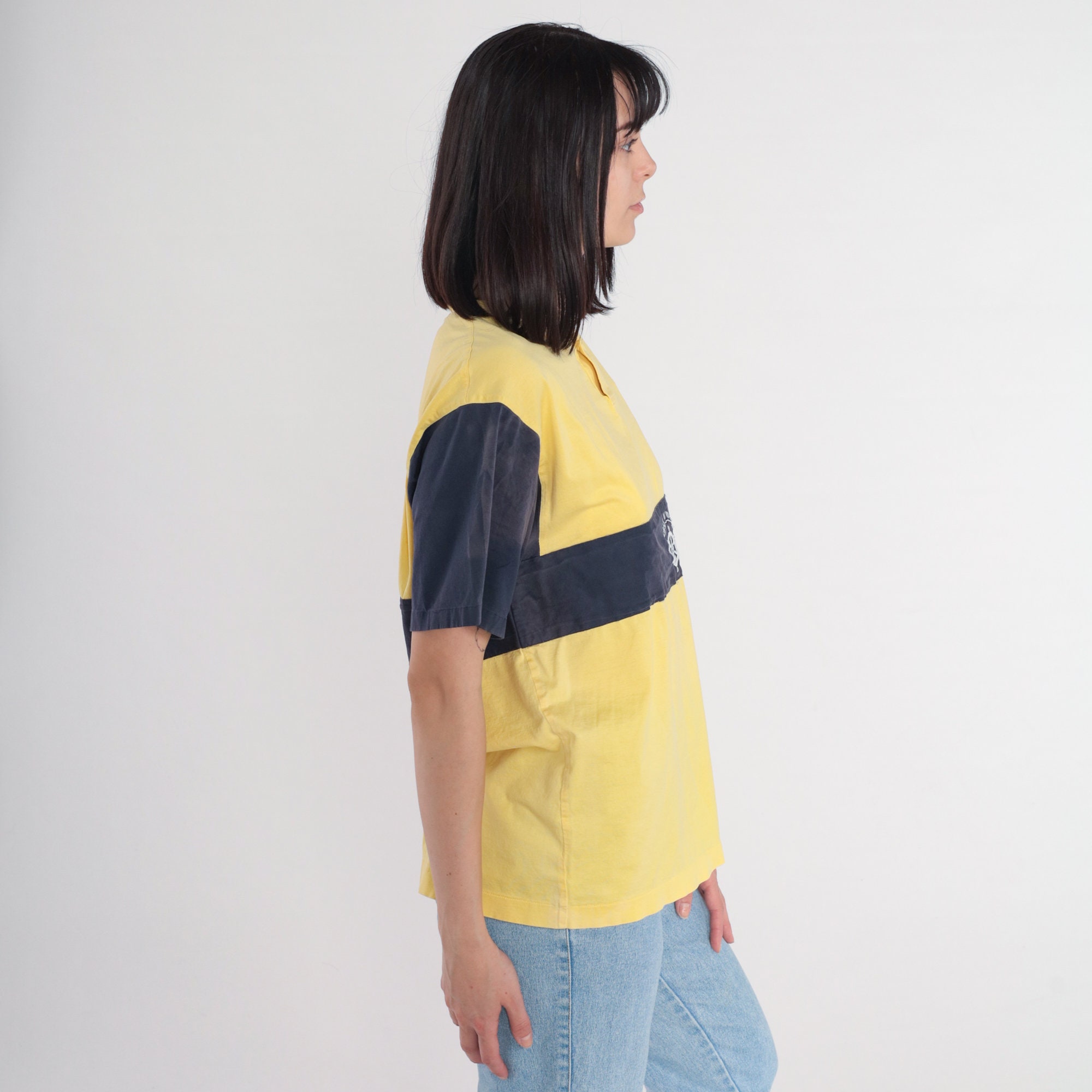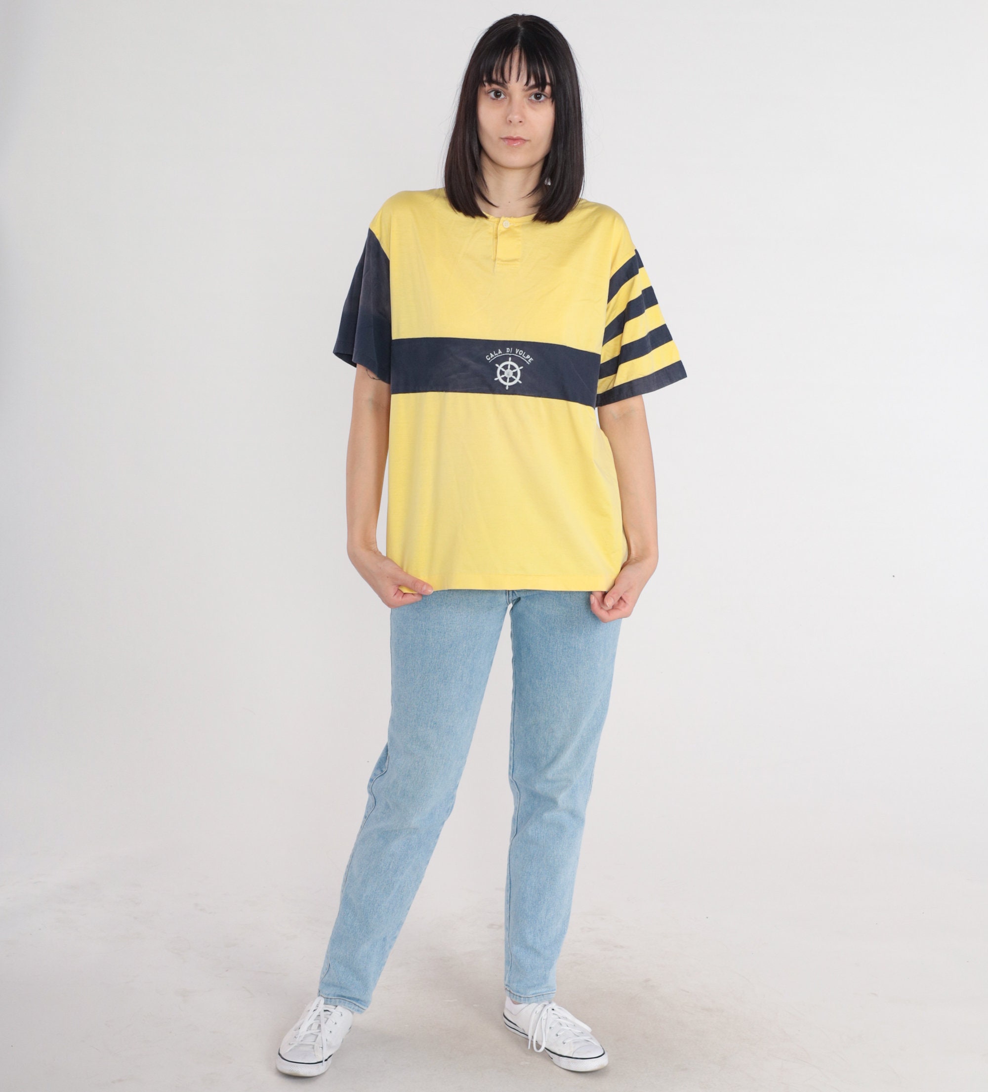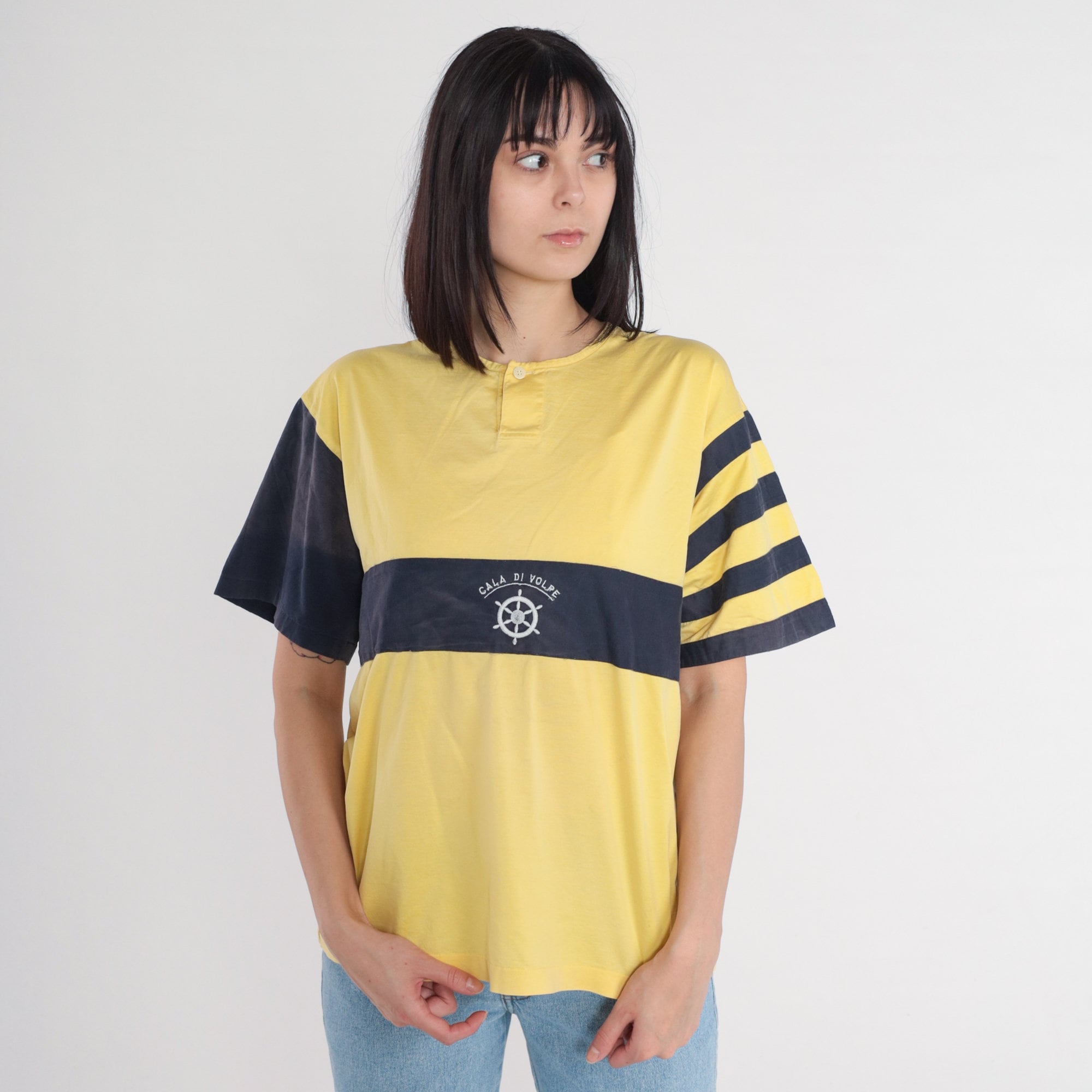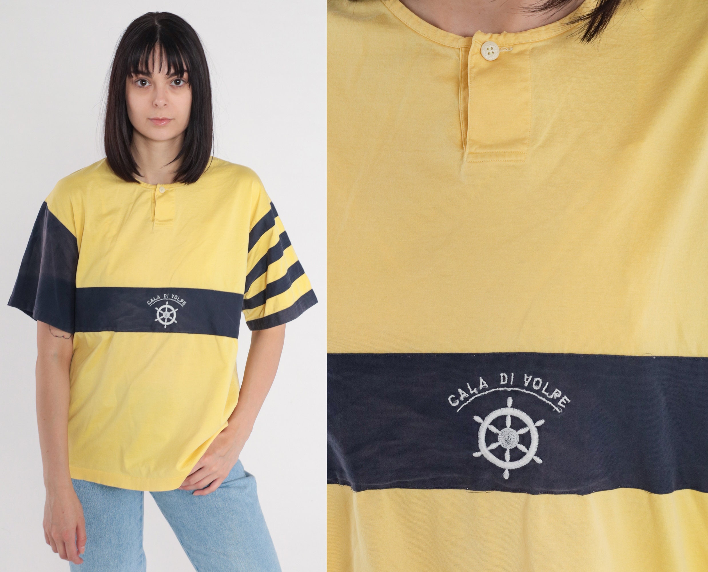 Vintage 80s shirt in yellow and navy blue stripes with an embroidered ships helm and Short Sleeves and henley buttons on the chest.