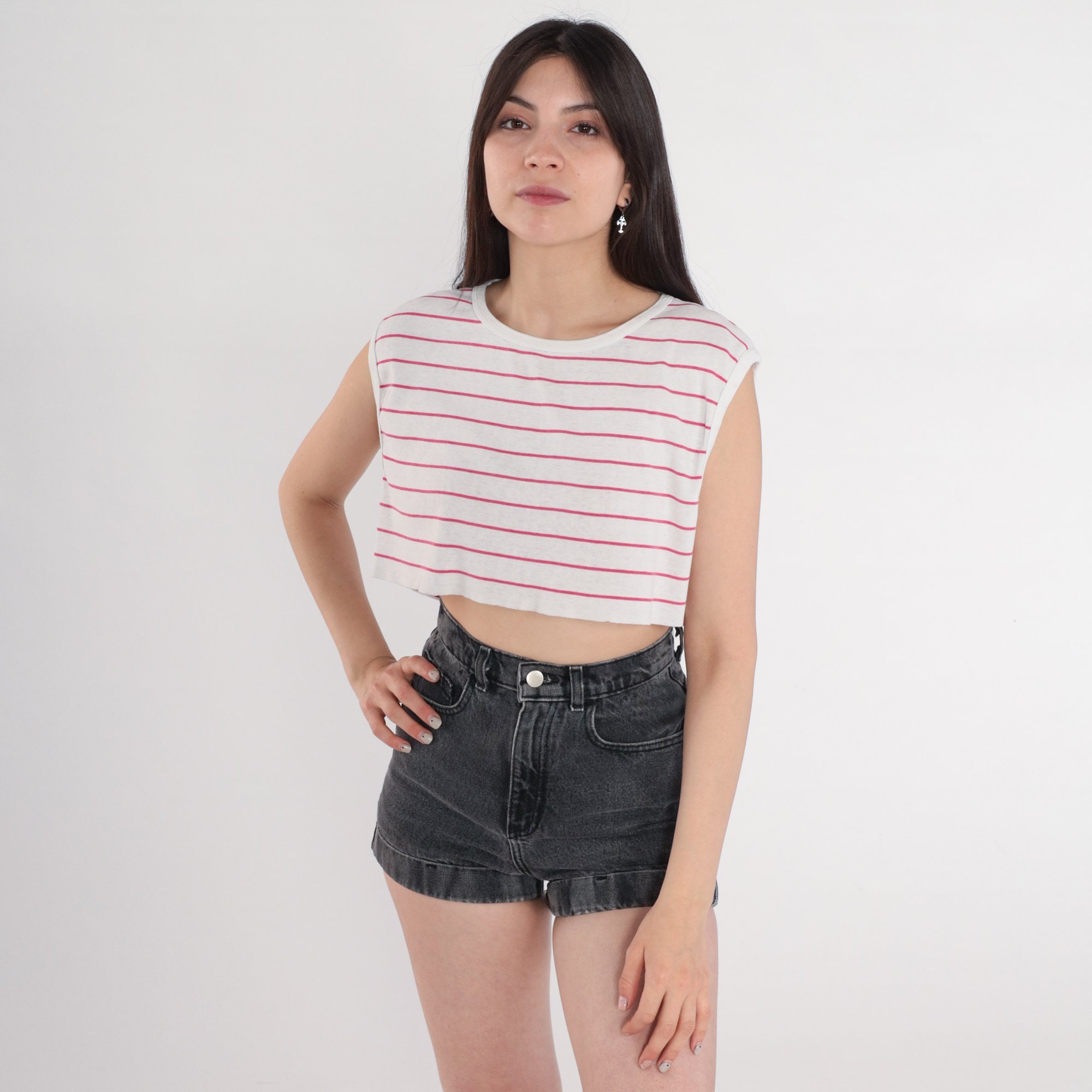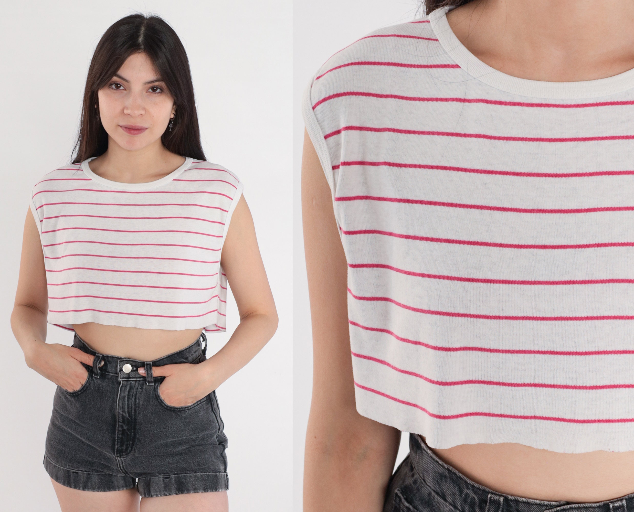 Vintage 80s tank top in white with deep pink stripes, a cropped fit and a raw hem.