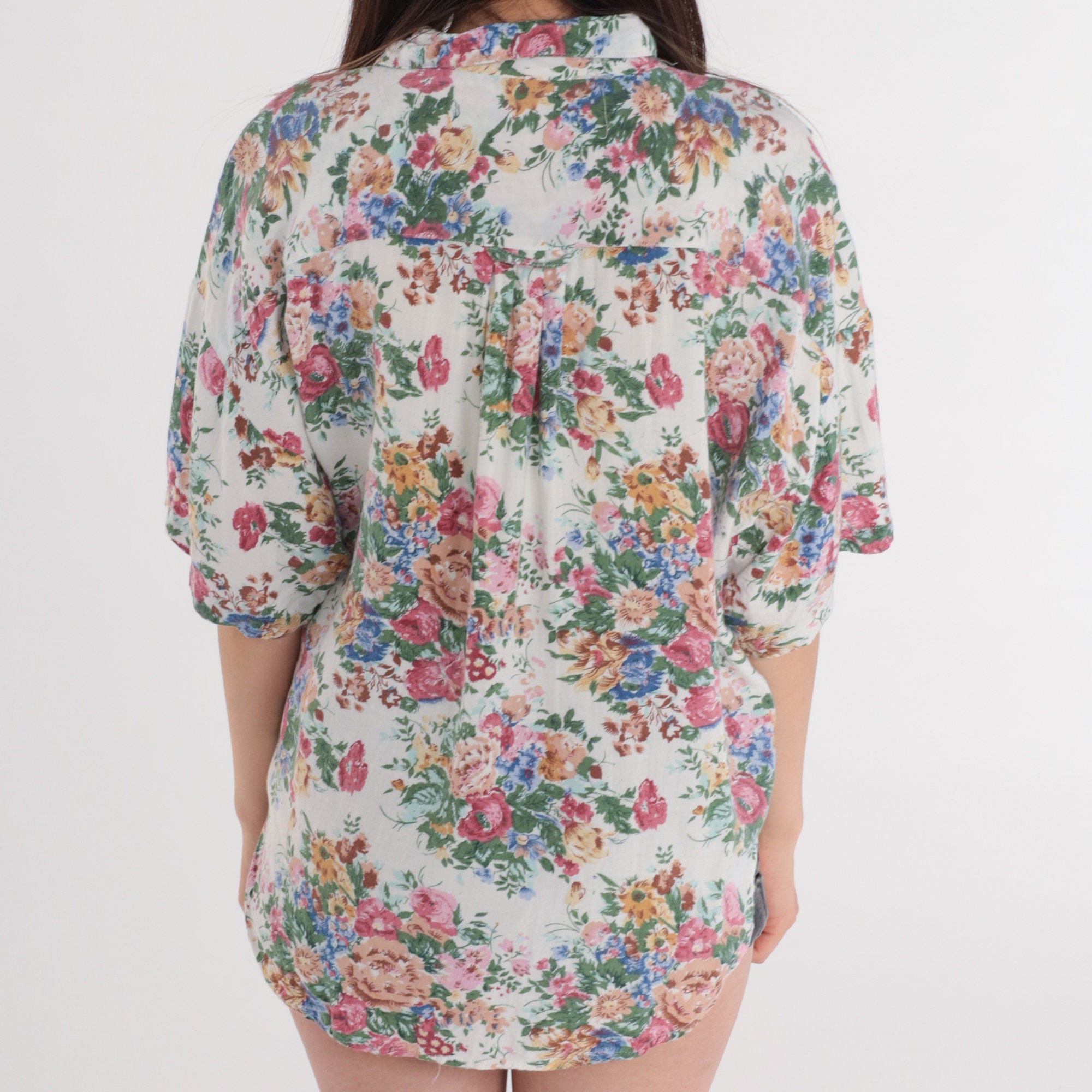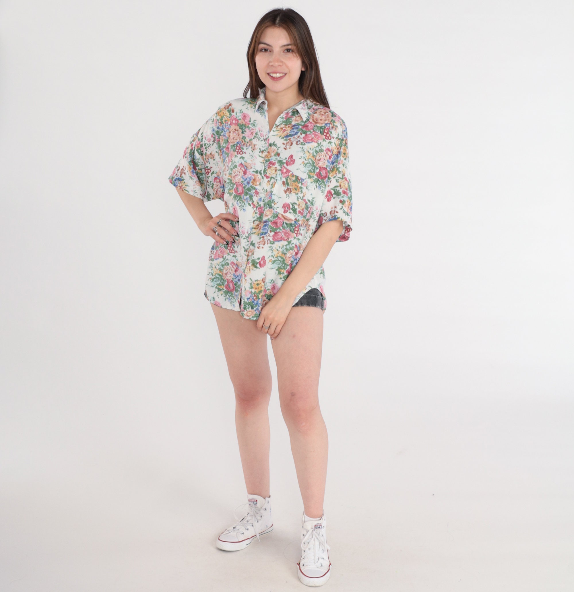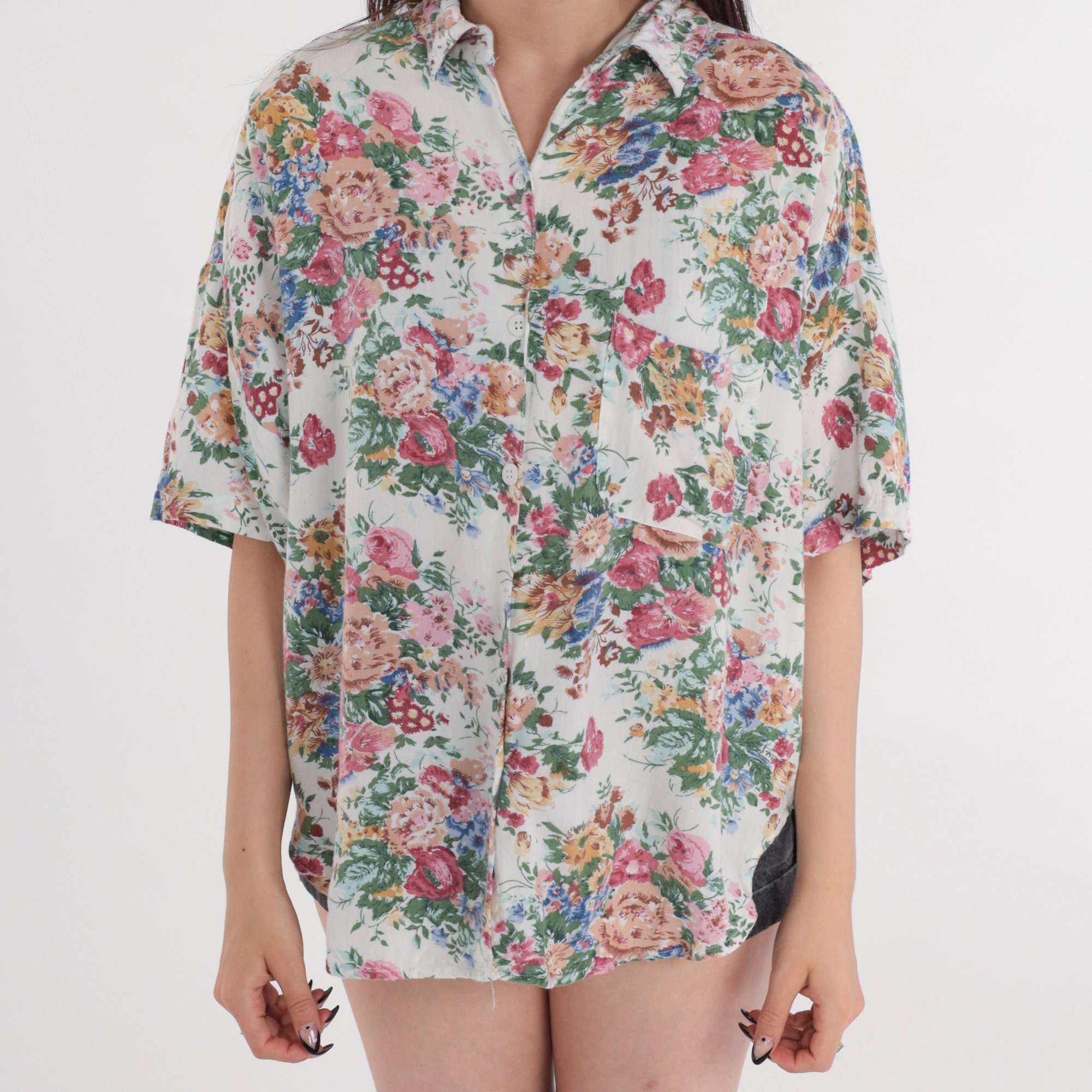 Vintage 90s shirt in white with a floral print. Collared with short sleeves, a chest pocket, and buttons up the front.