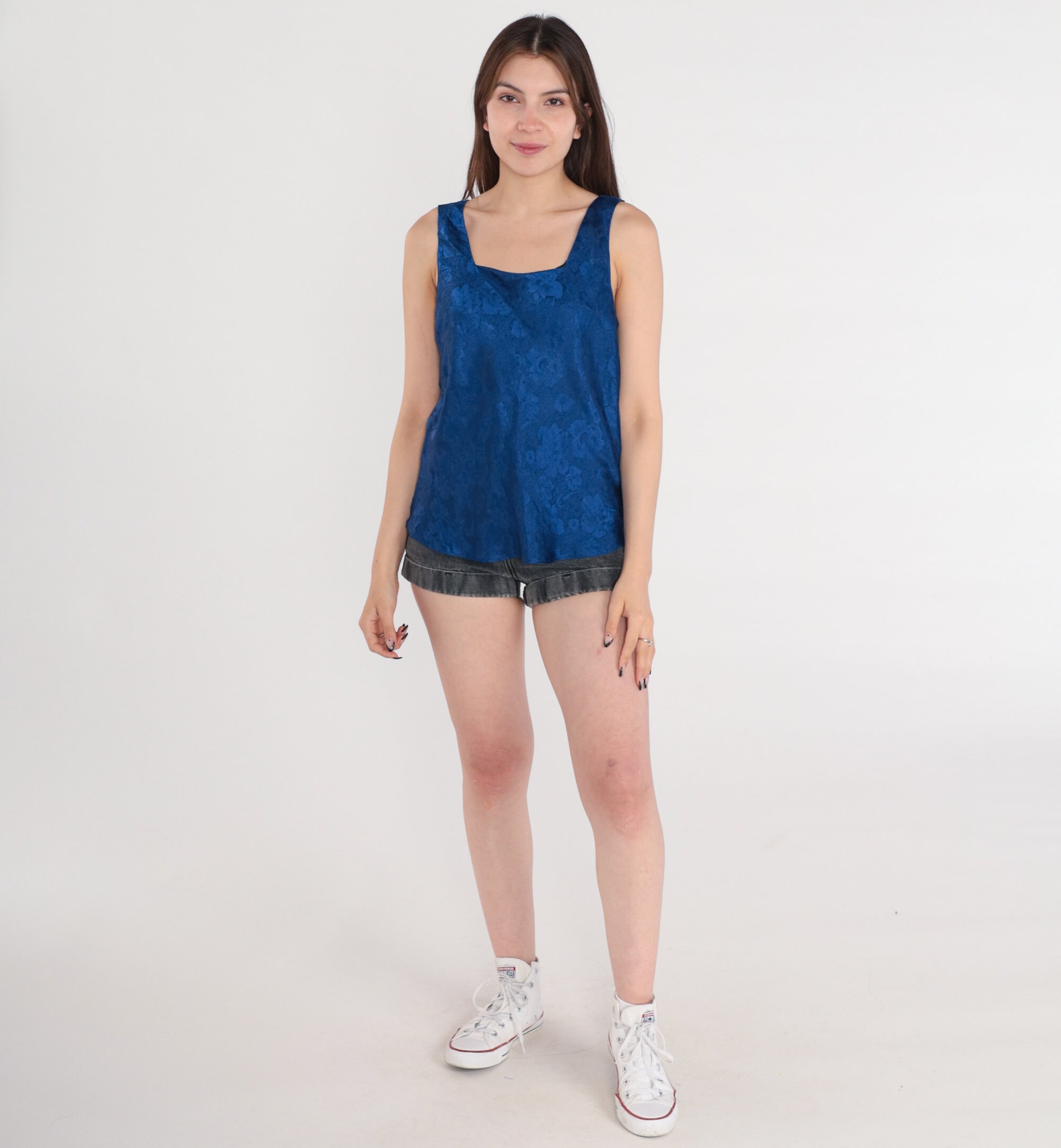 Vintage 90s camisole tank top in navy blue with an embossed floral print.