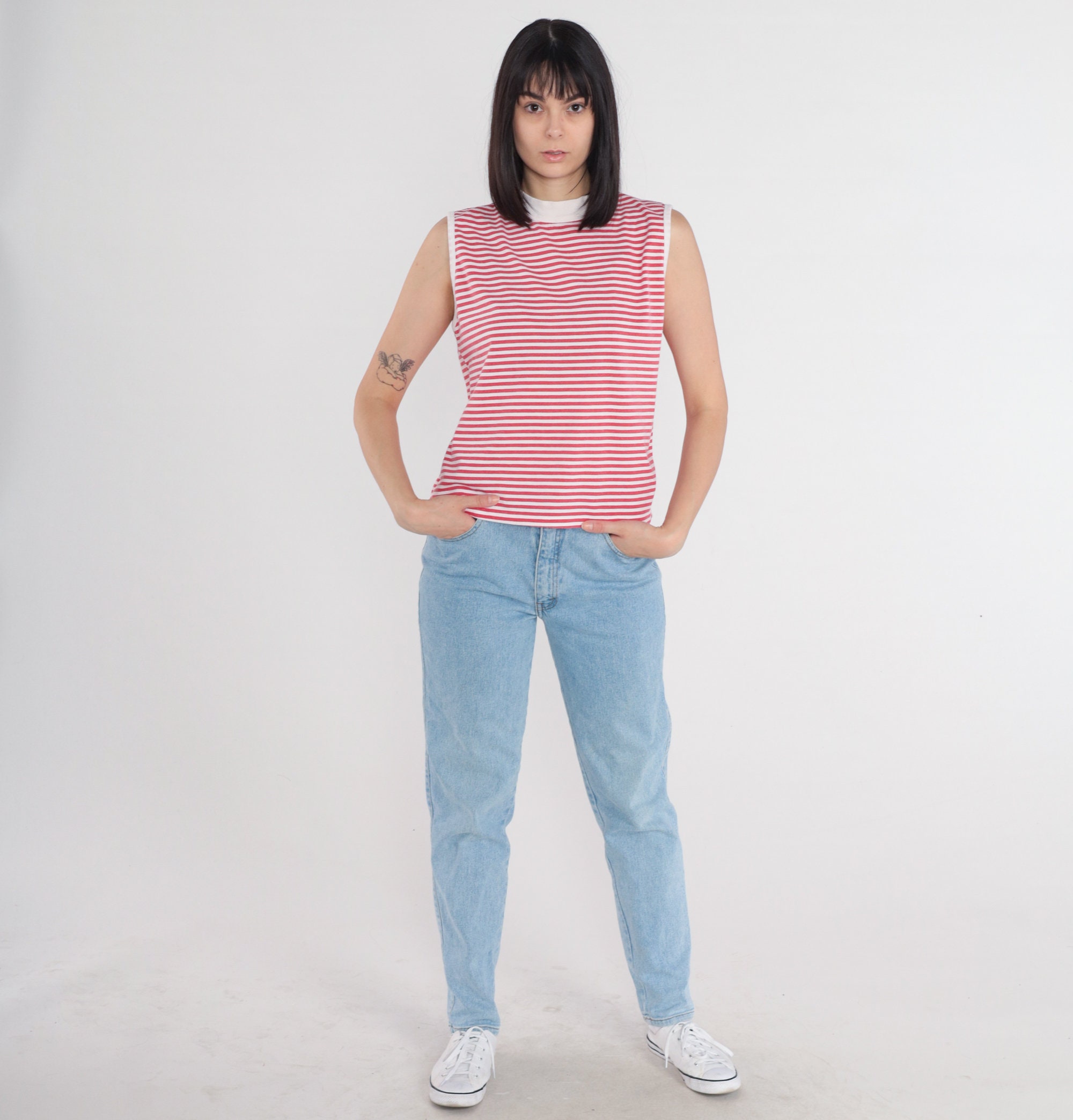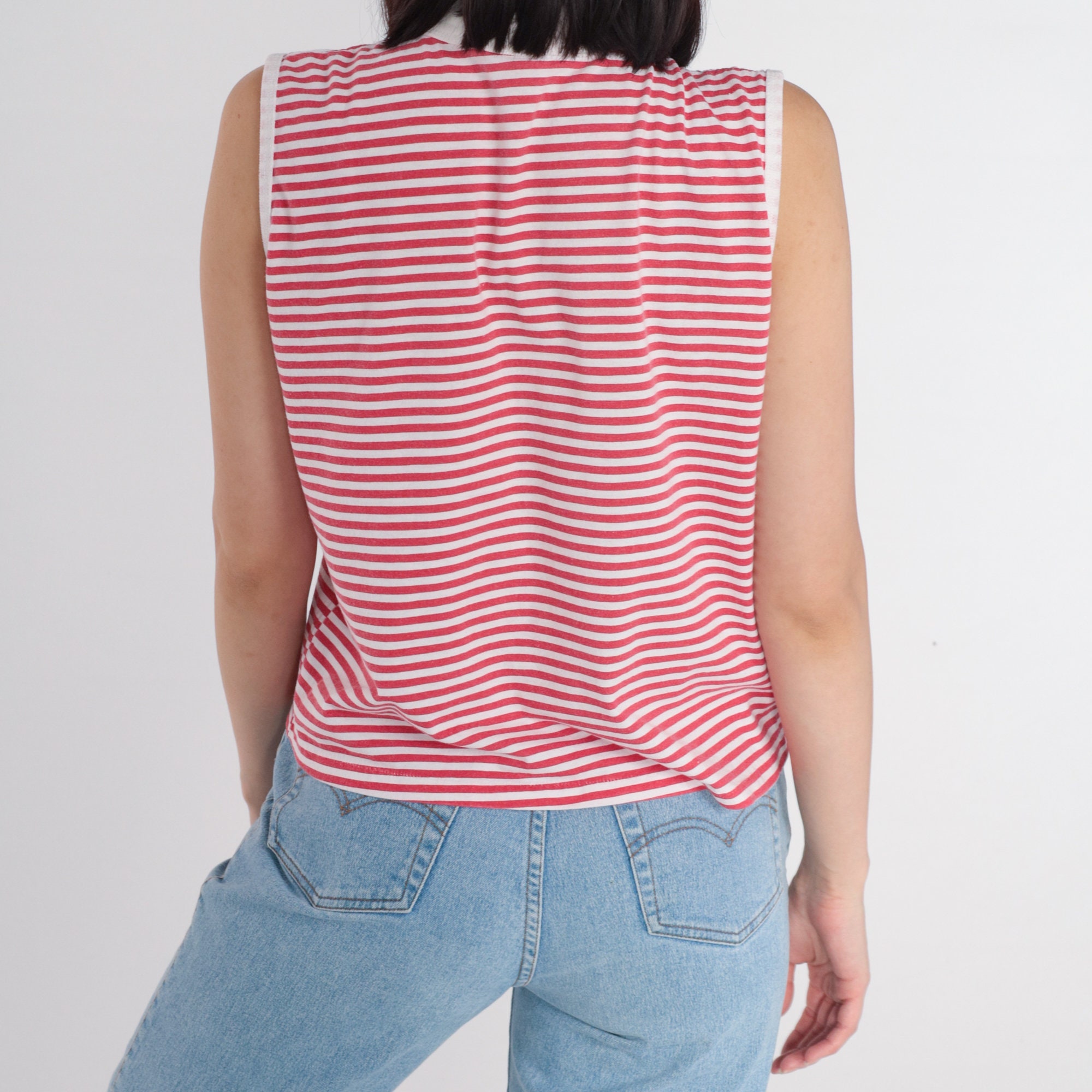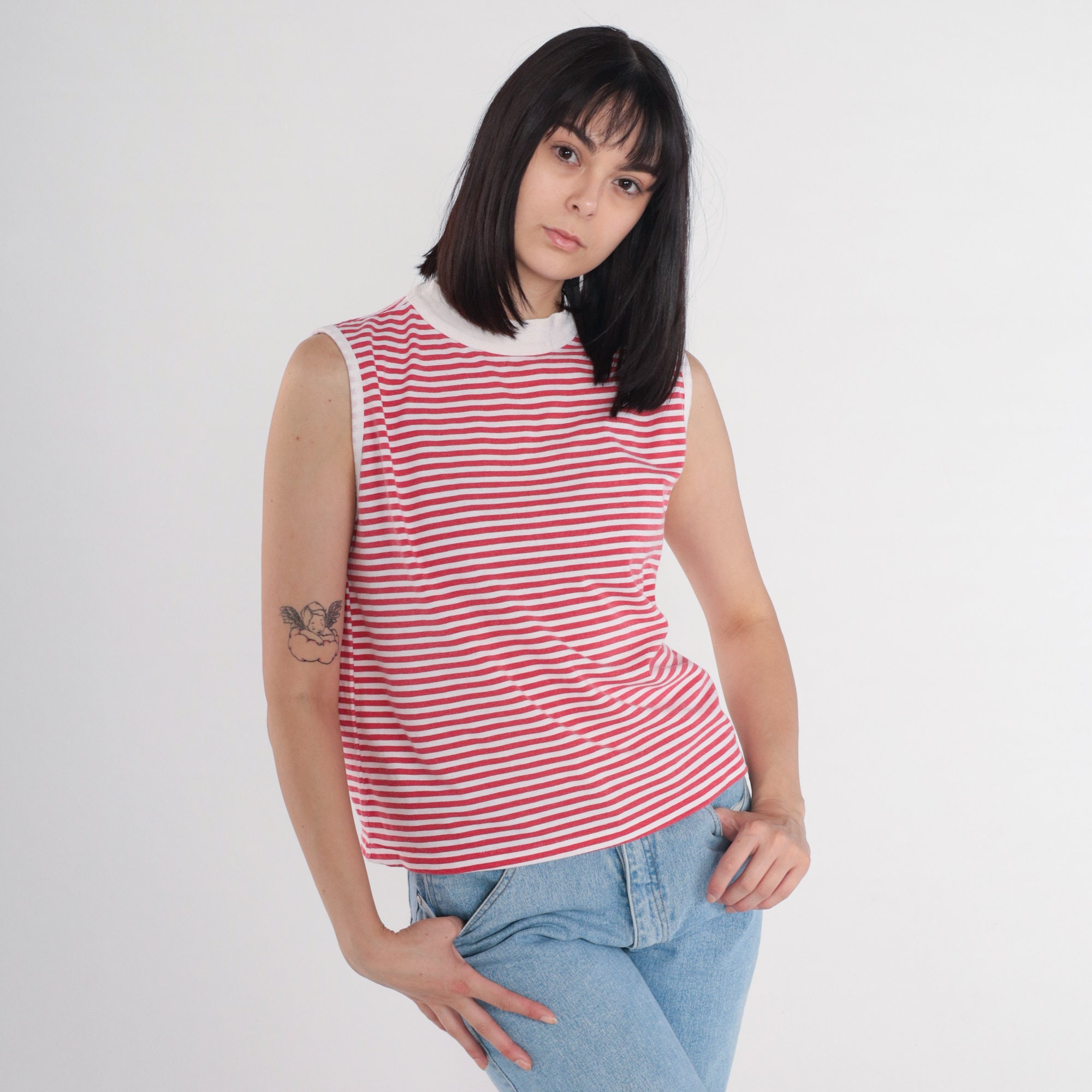 Vintage 90s tank top in red and white stripes with white ringer trim and a mock neck.
