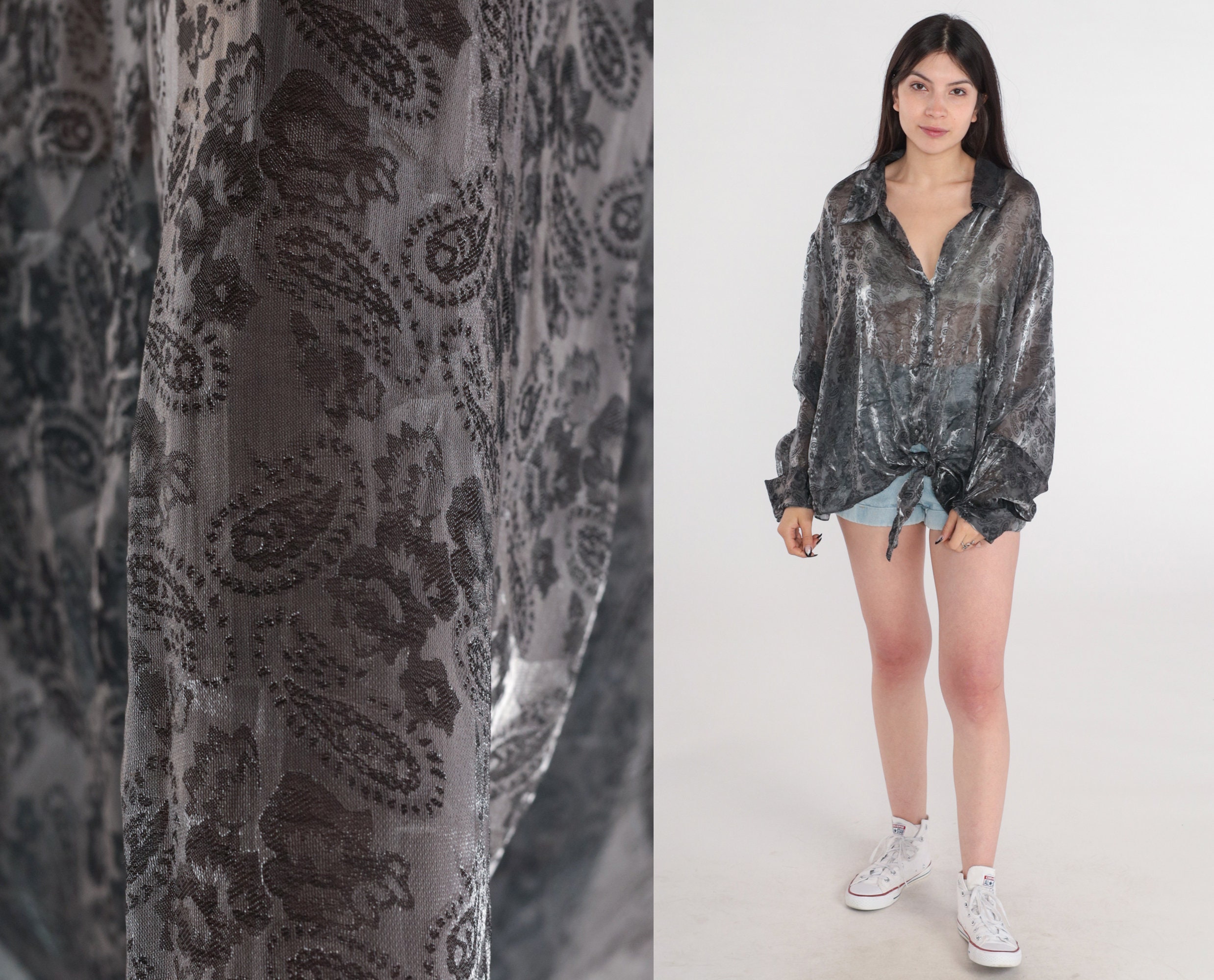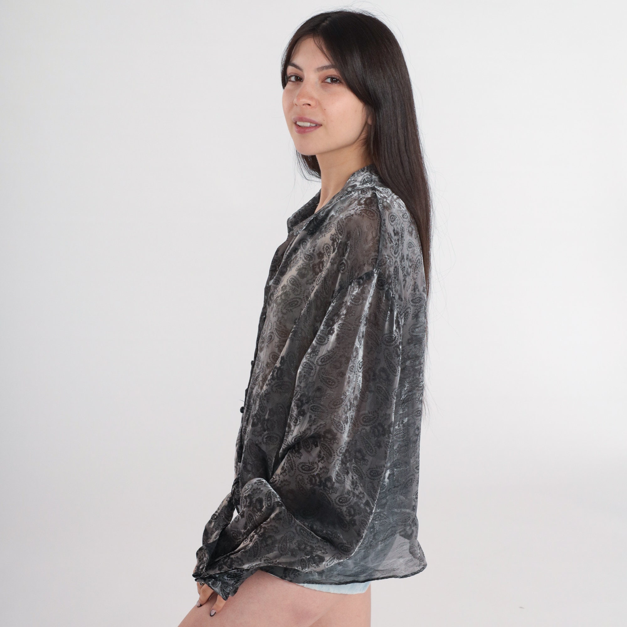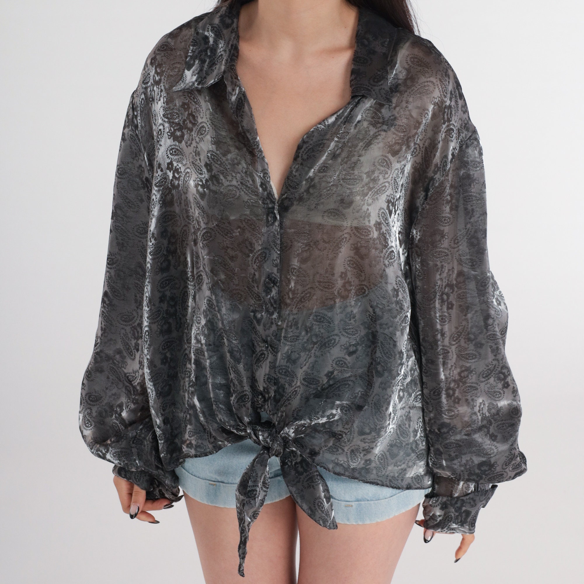 Vintage 90s blouse in sheer iridescent pewter with a paisley print. Buttons up the front and has long sleeves.
