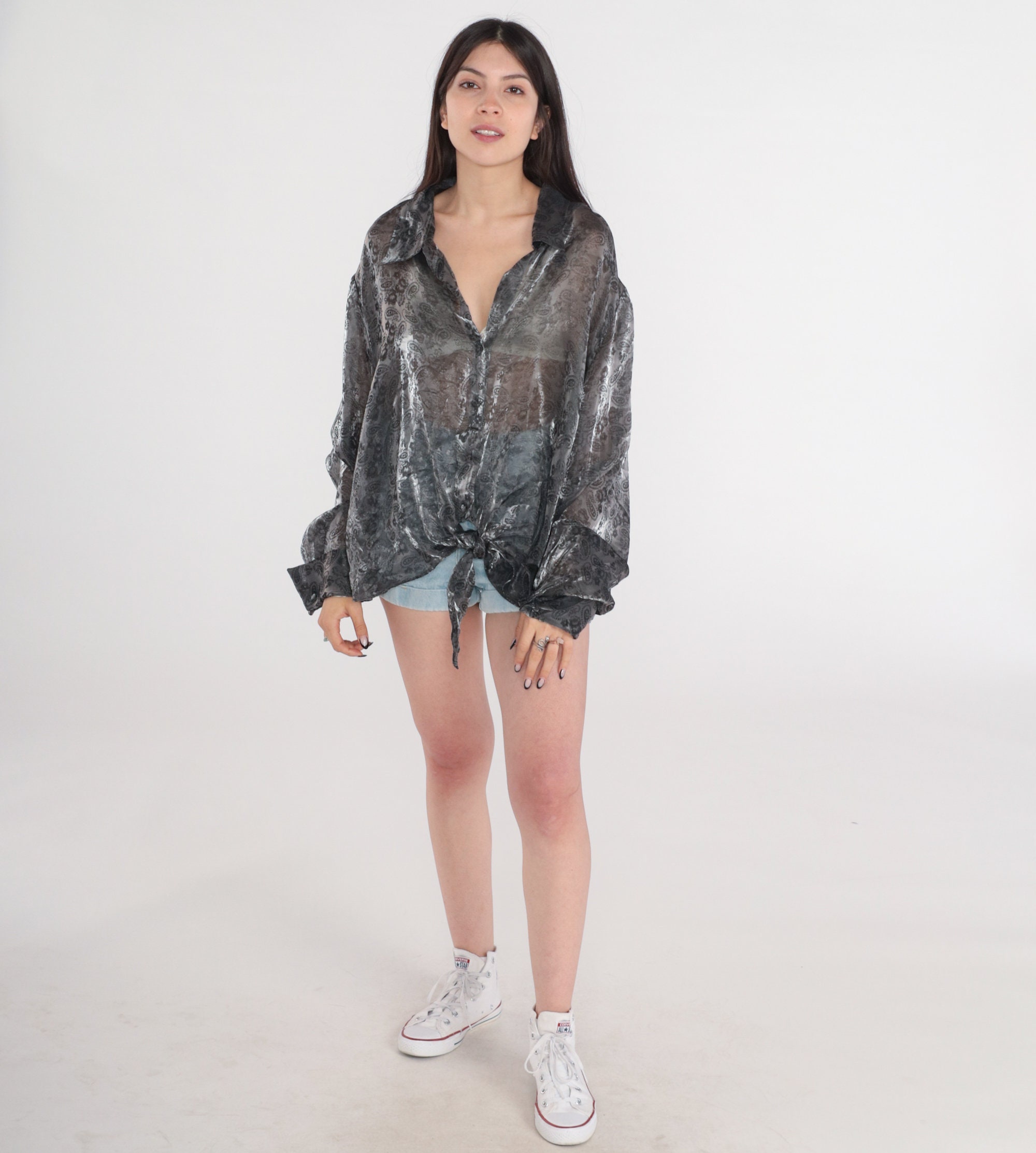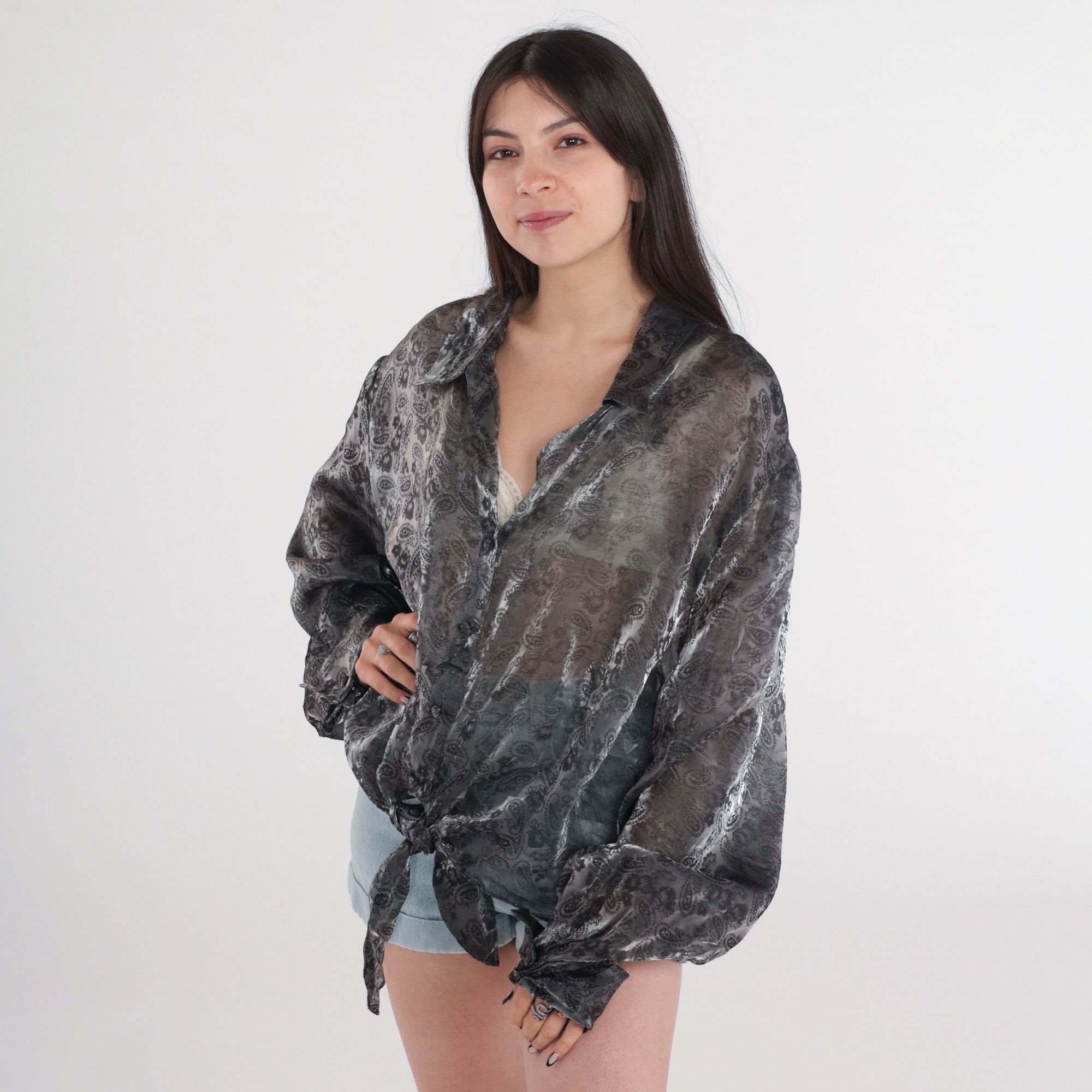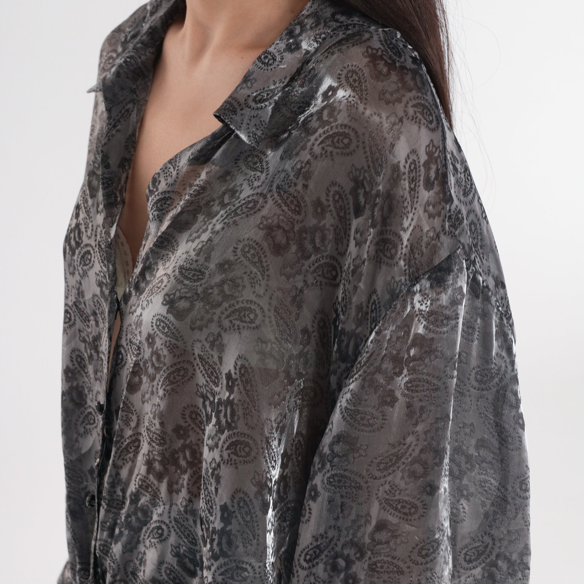 Vintage 90s blouse in sheer iridescent pewter with a paisley print. Buttons up the front and has long sleeves.