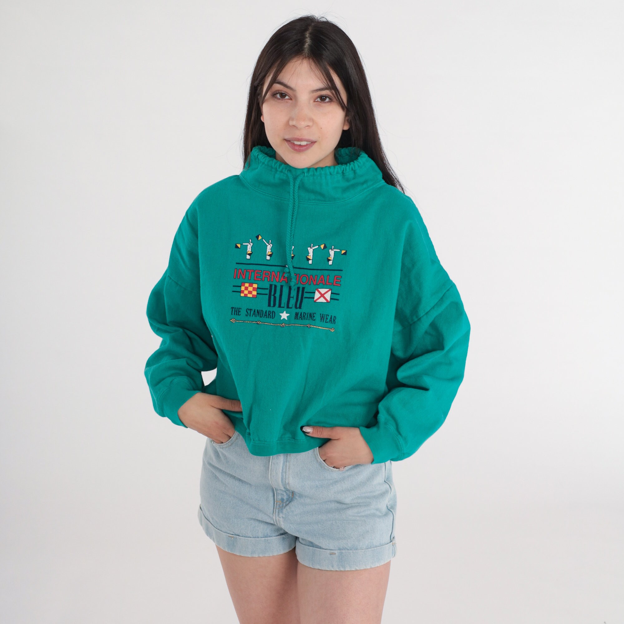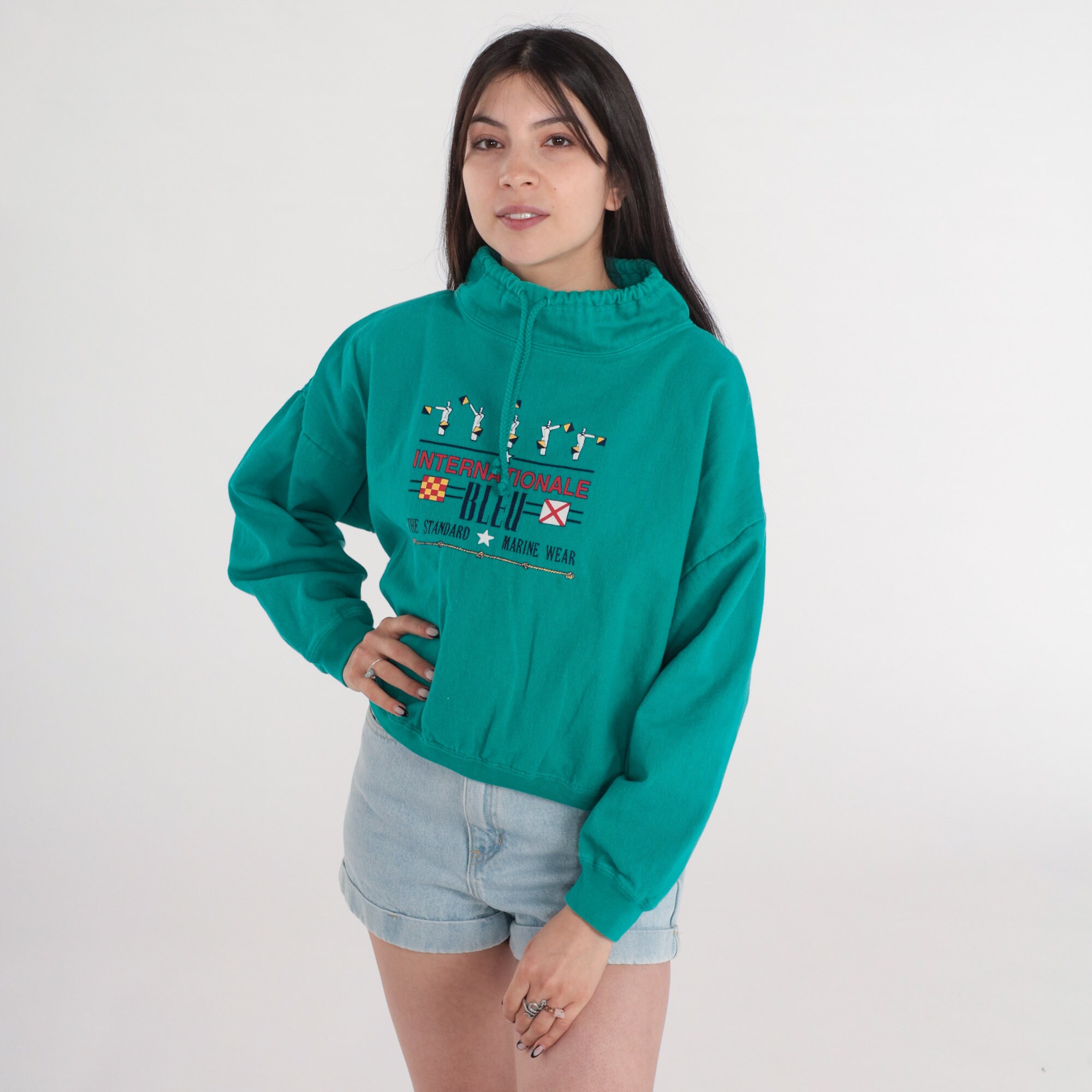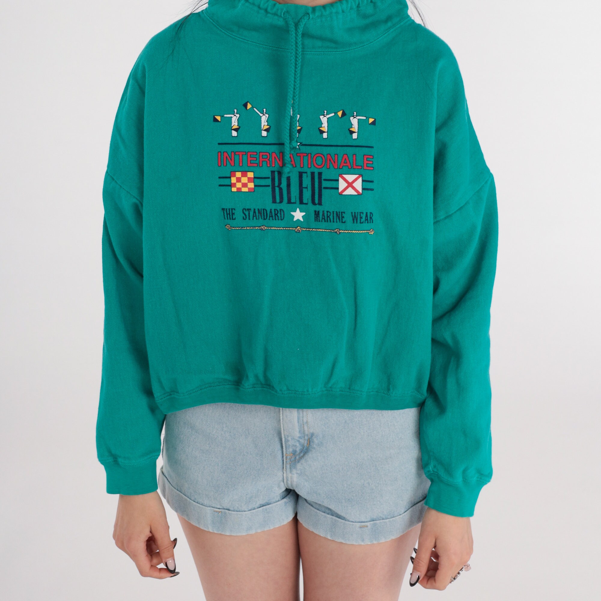 Vintage 90s shirt in green with Internationale Bleu, the standard marine wear on the front. Oversized with a drawstring funnel neck.