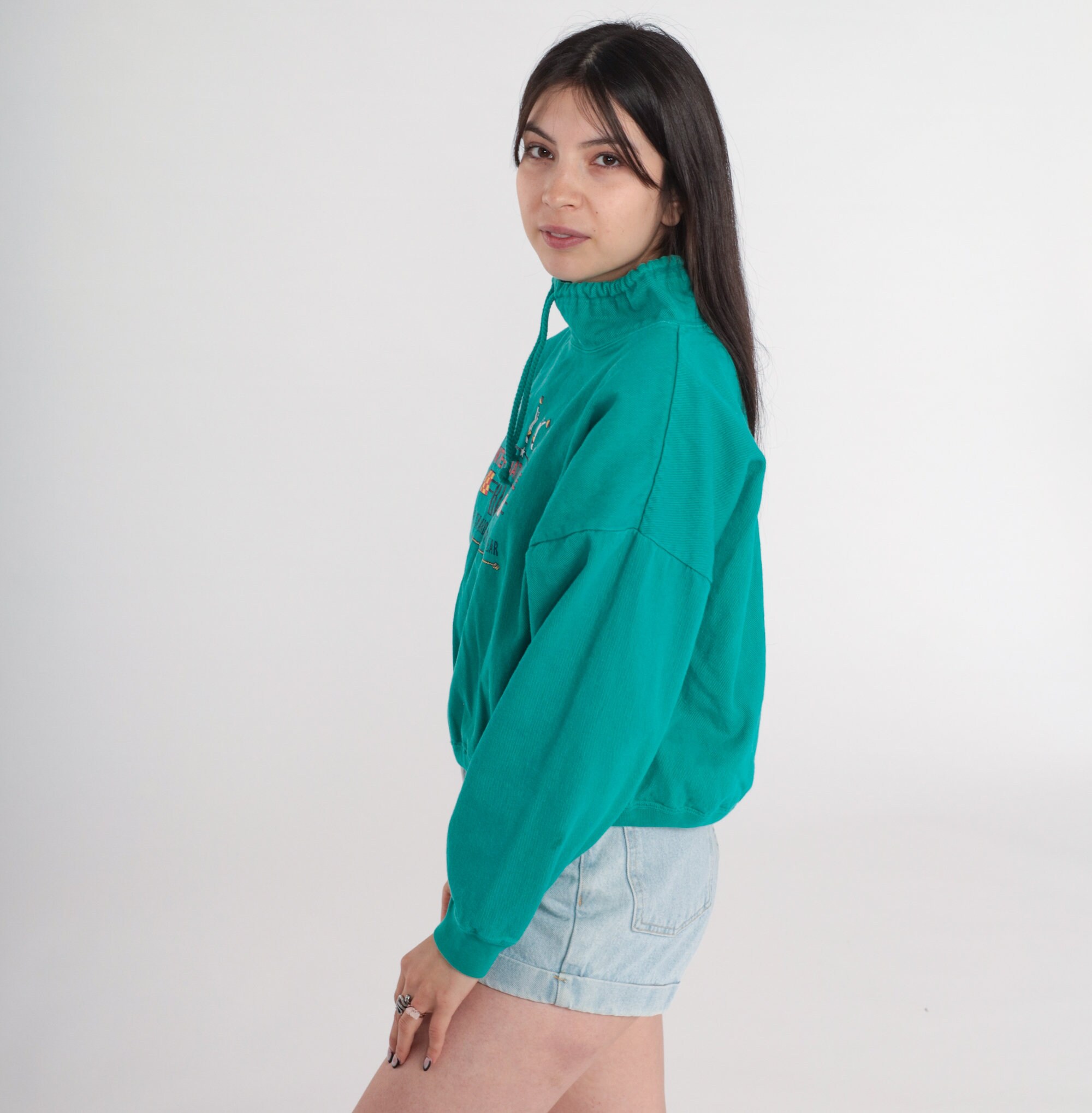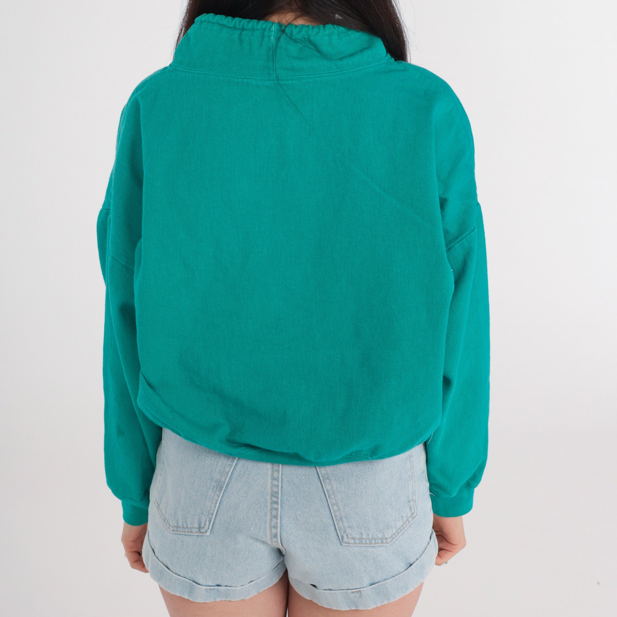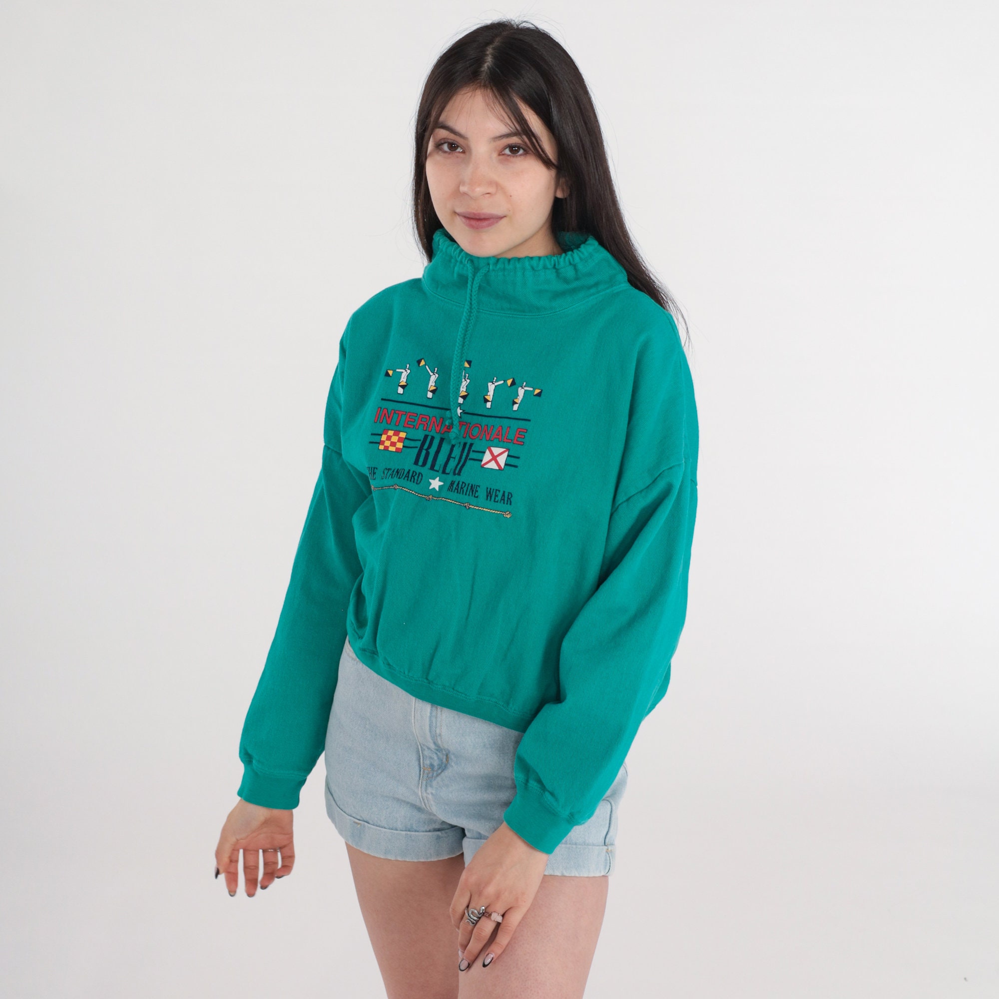 Vintage 90s shirt in green with Internationale Bleu, the standard marine wear on the front. Oversized with a drawstring funnel neck.