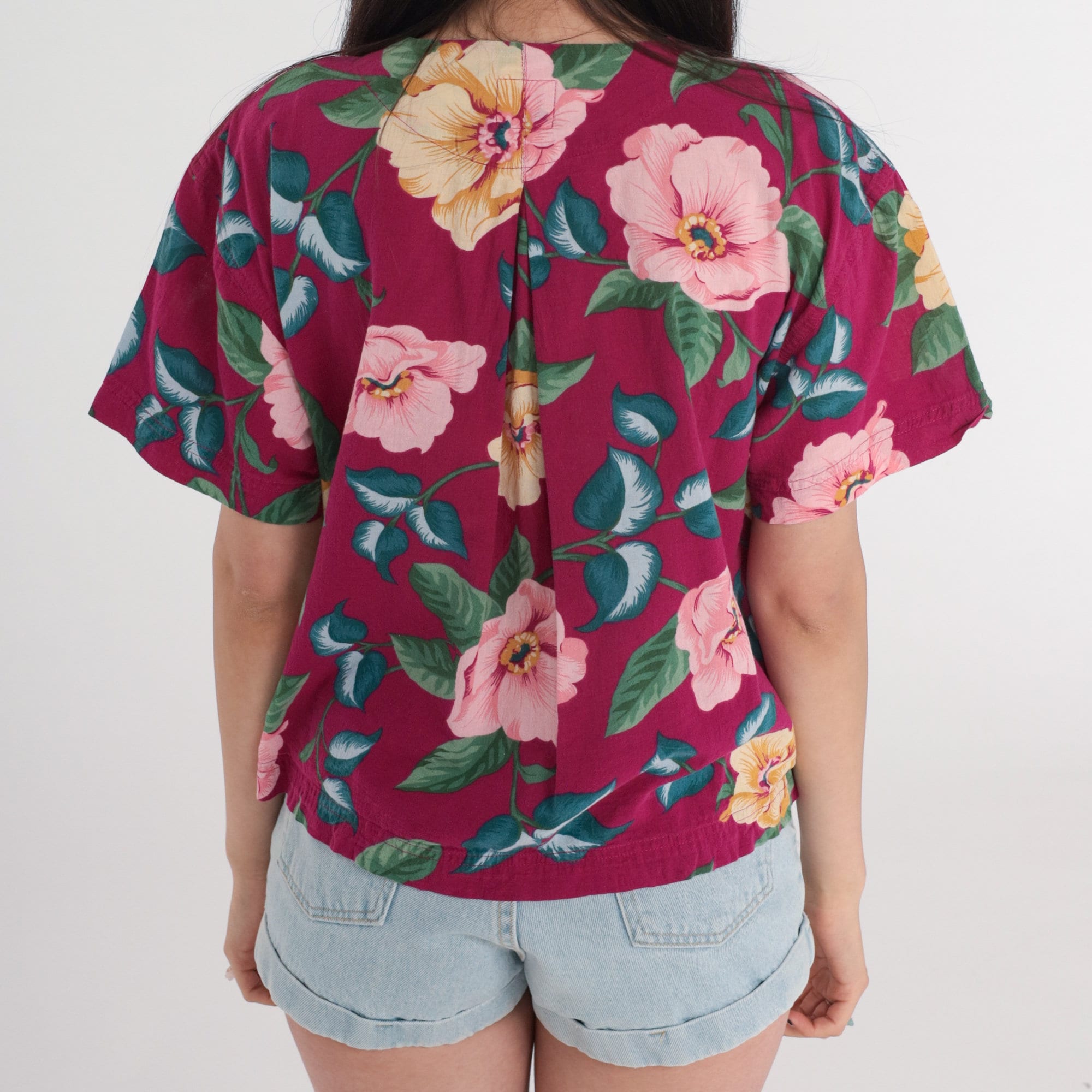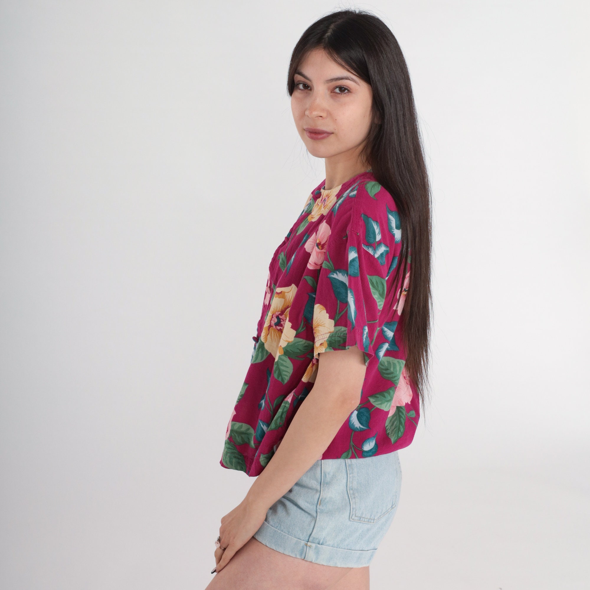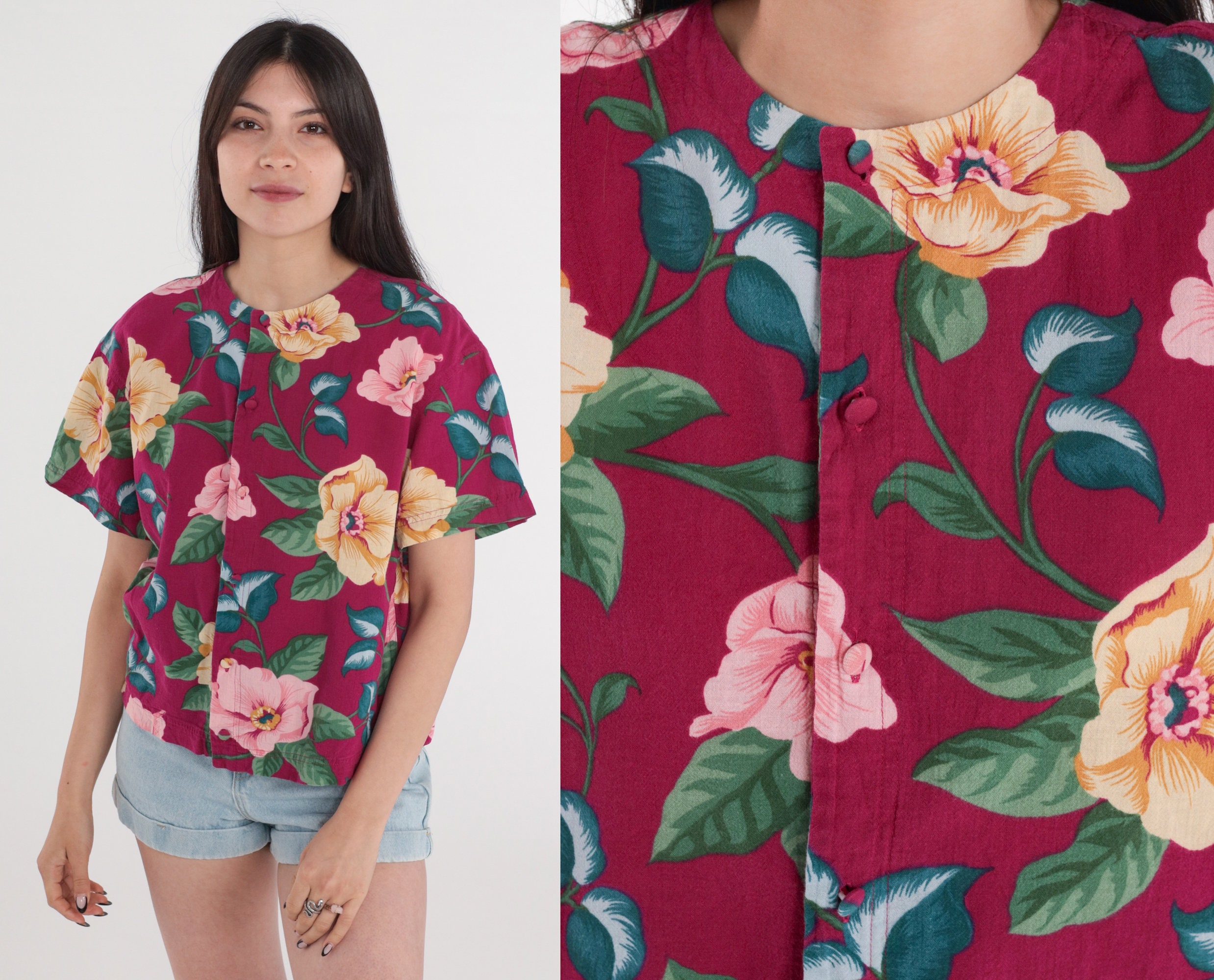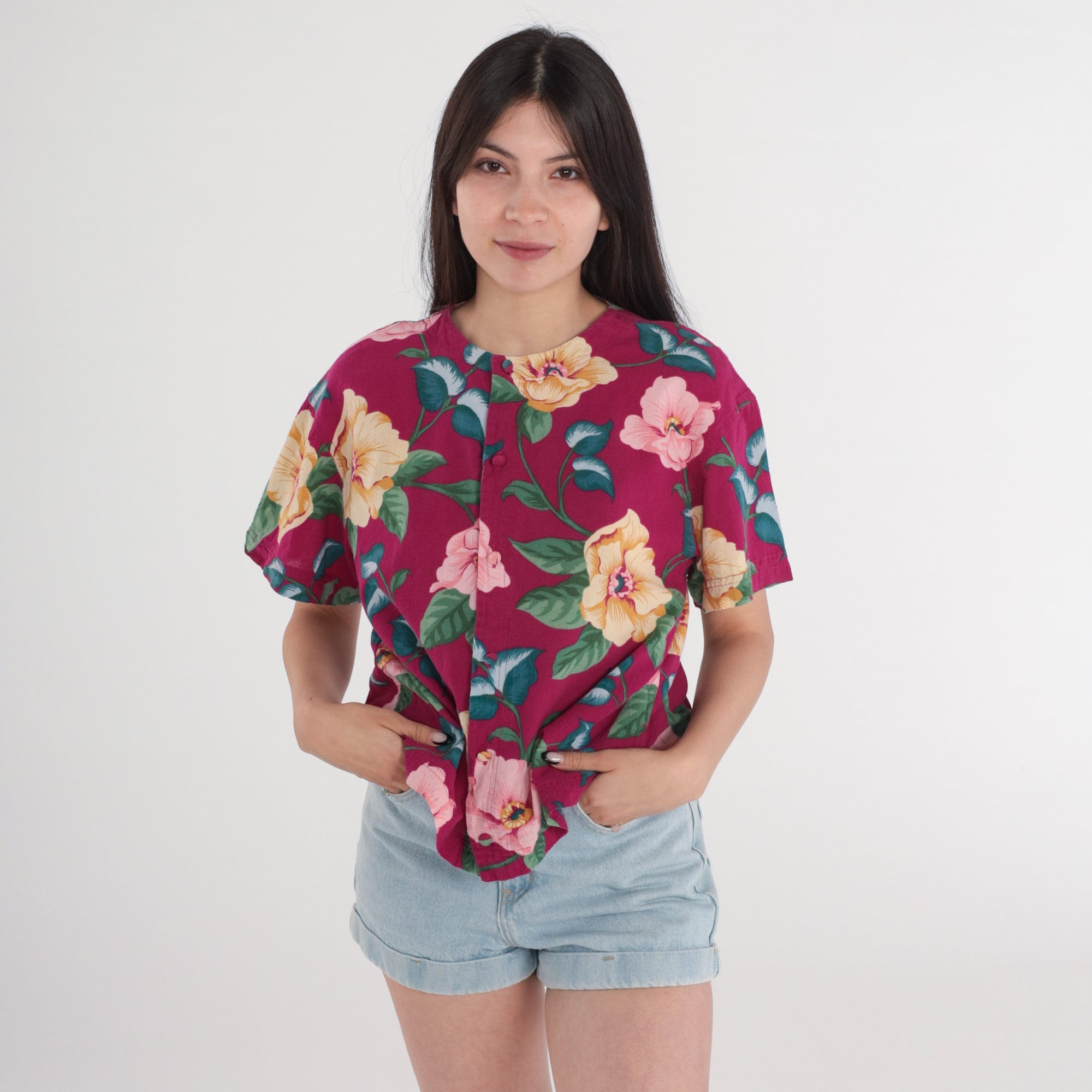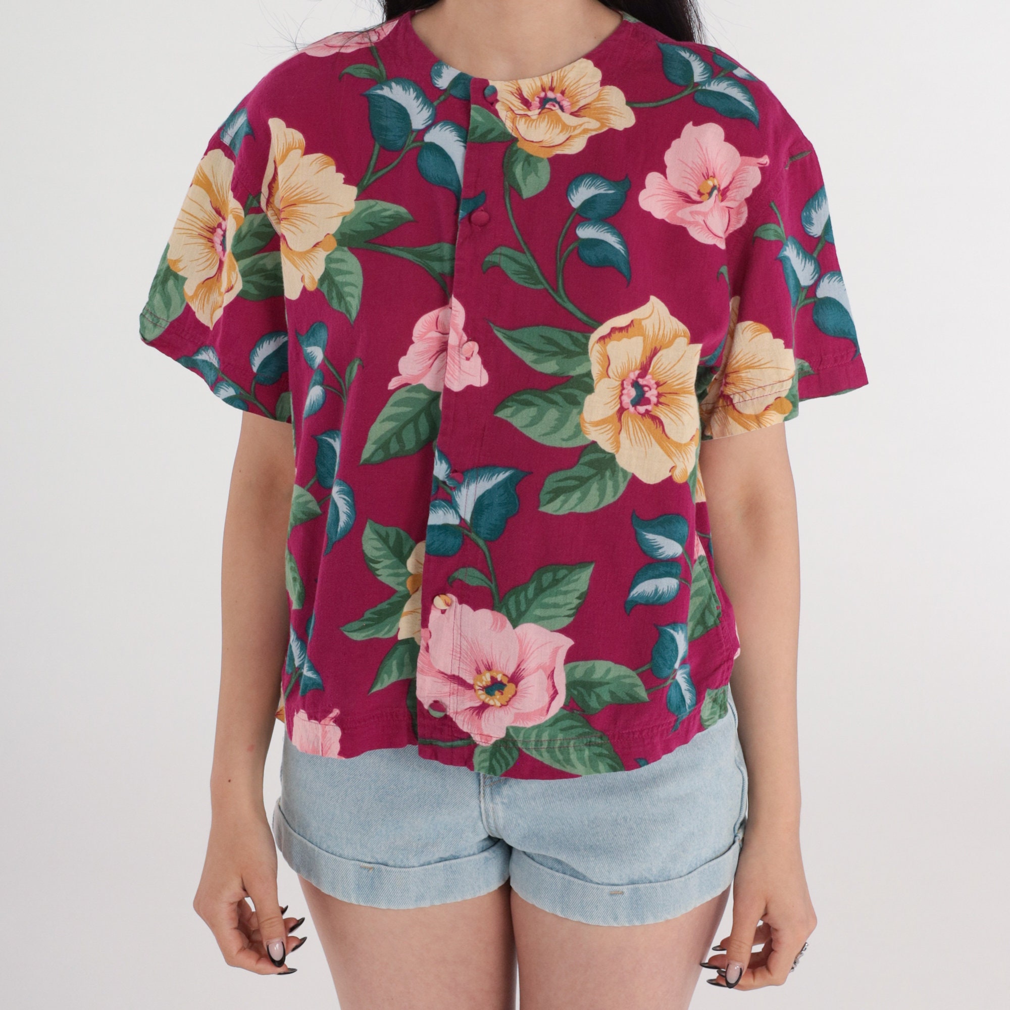 Vintage 90s shirt in a tropical floral print with short sleeves and buttons up the front.
