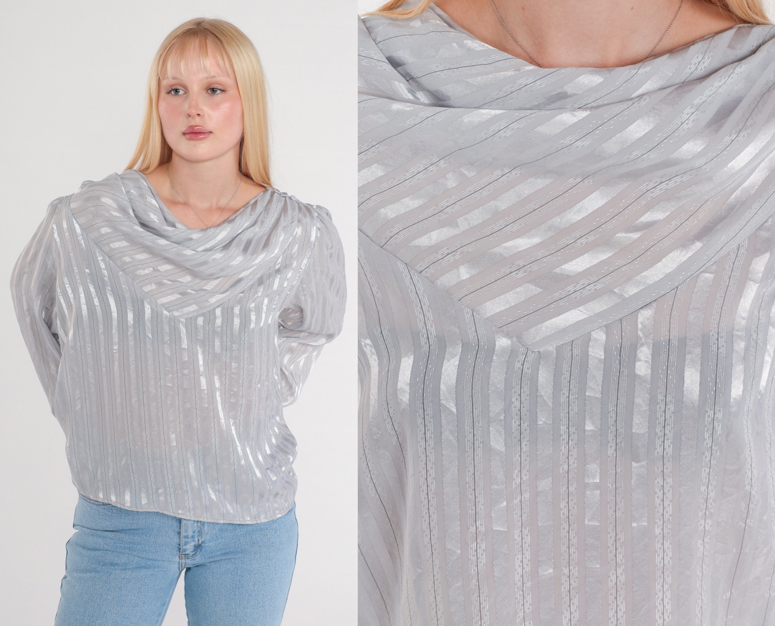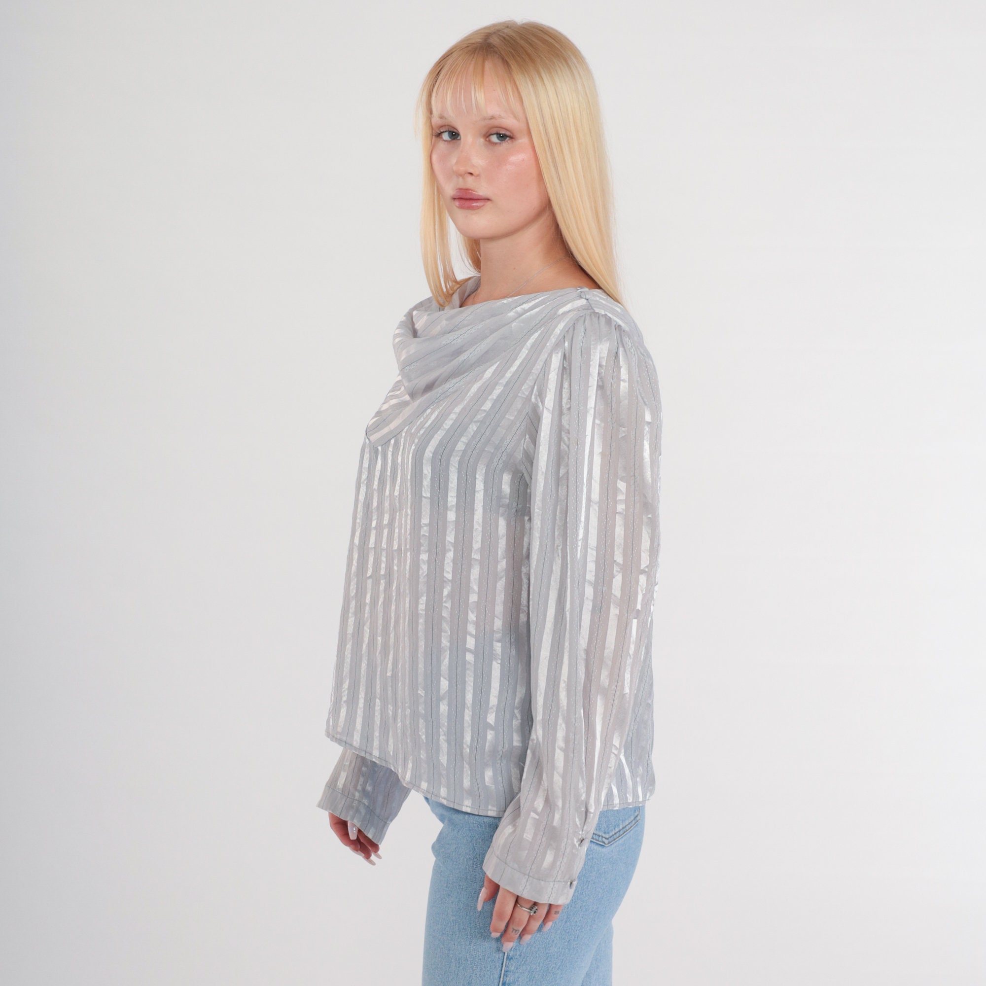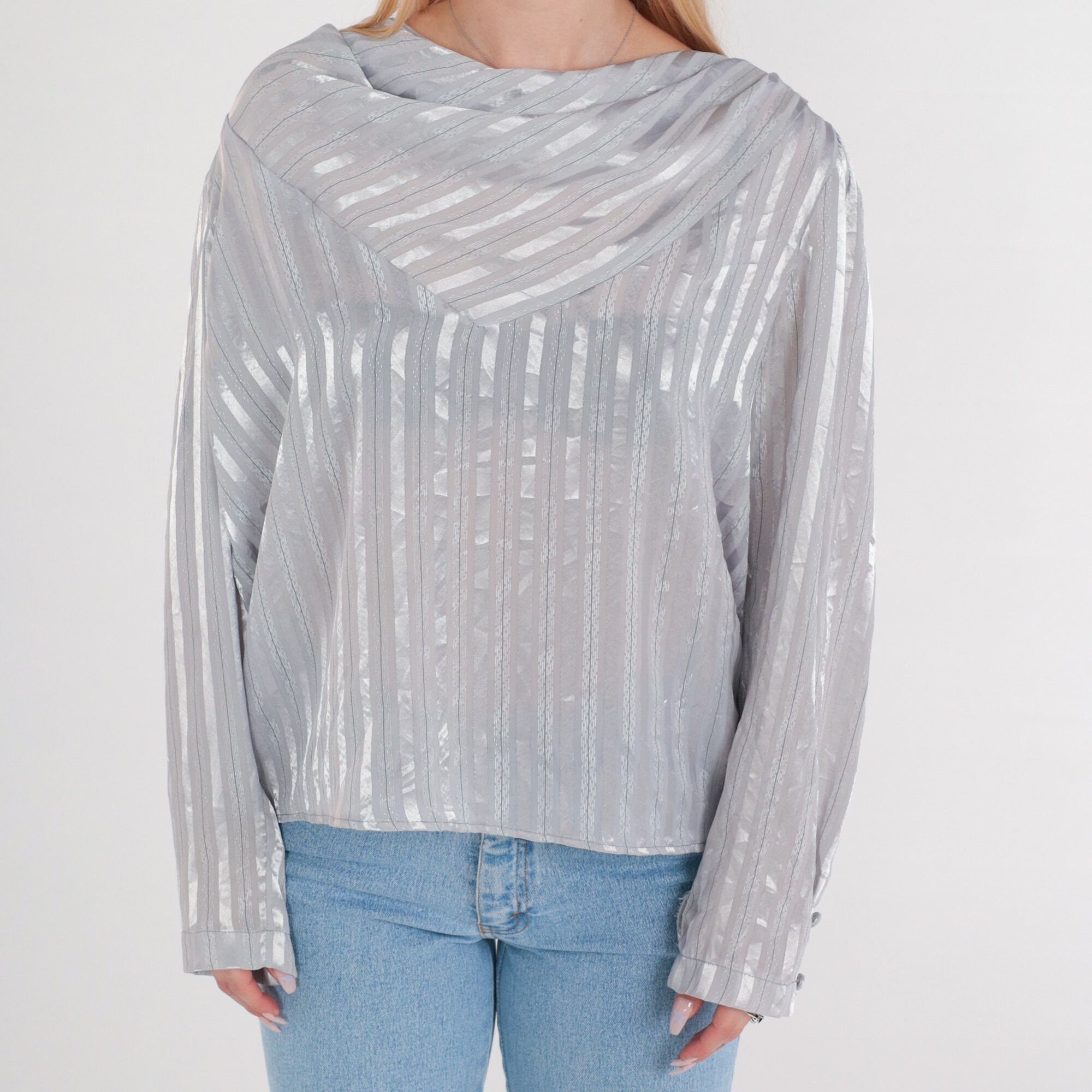 Vintage 80s blouse in Semi-Sheer striped metallic silver with long sleeves and a cowl neck.