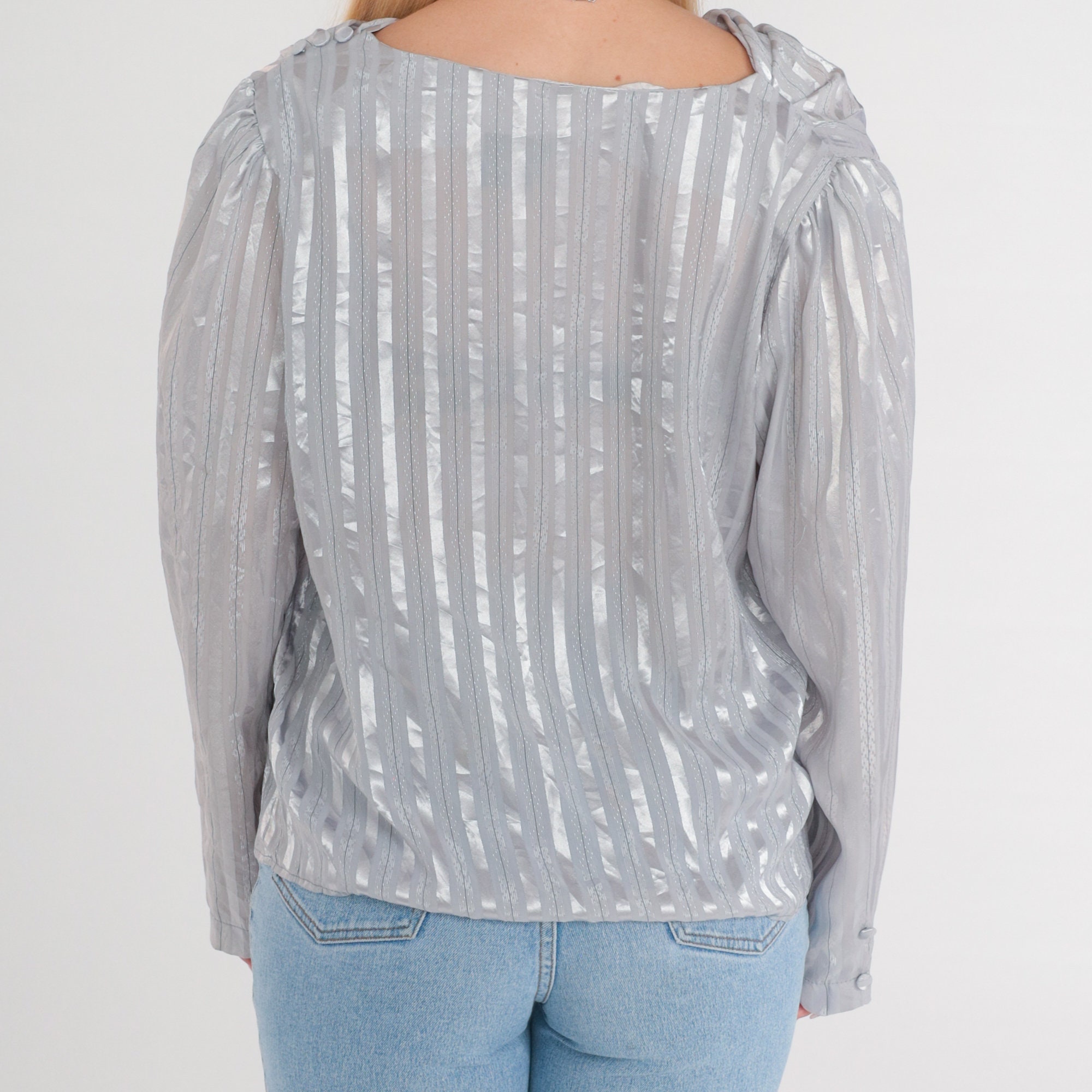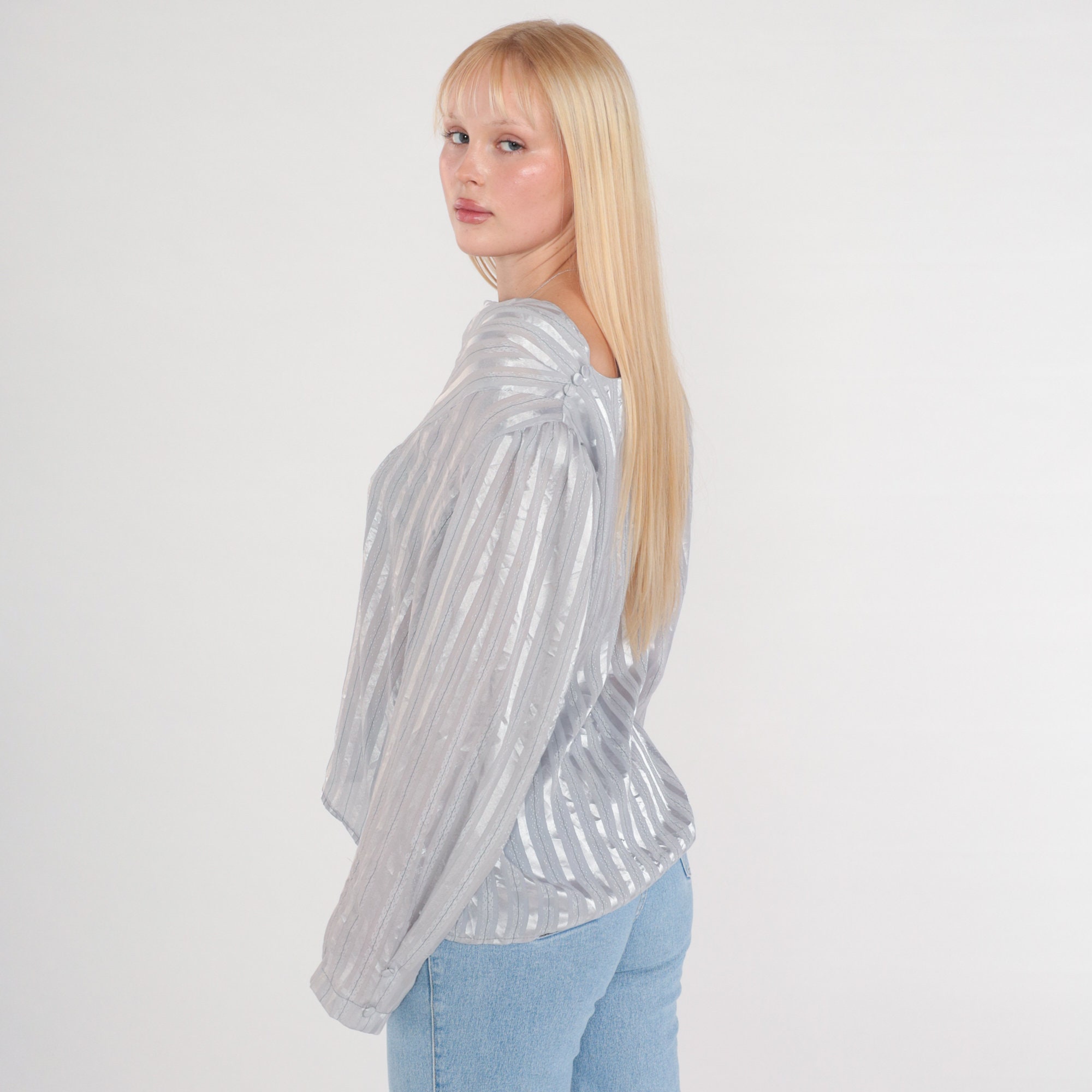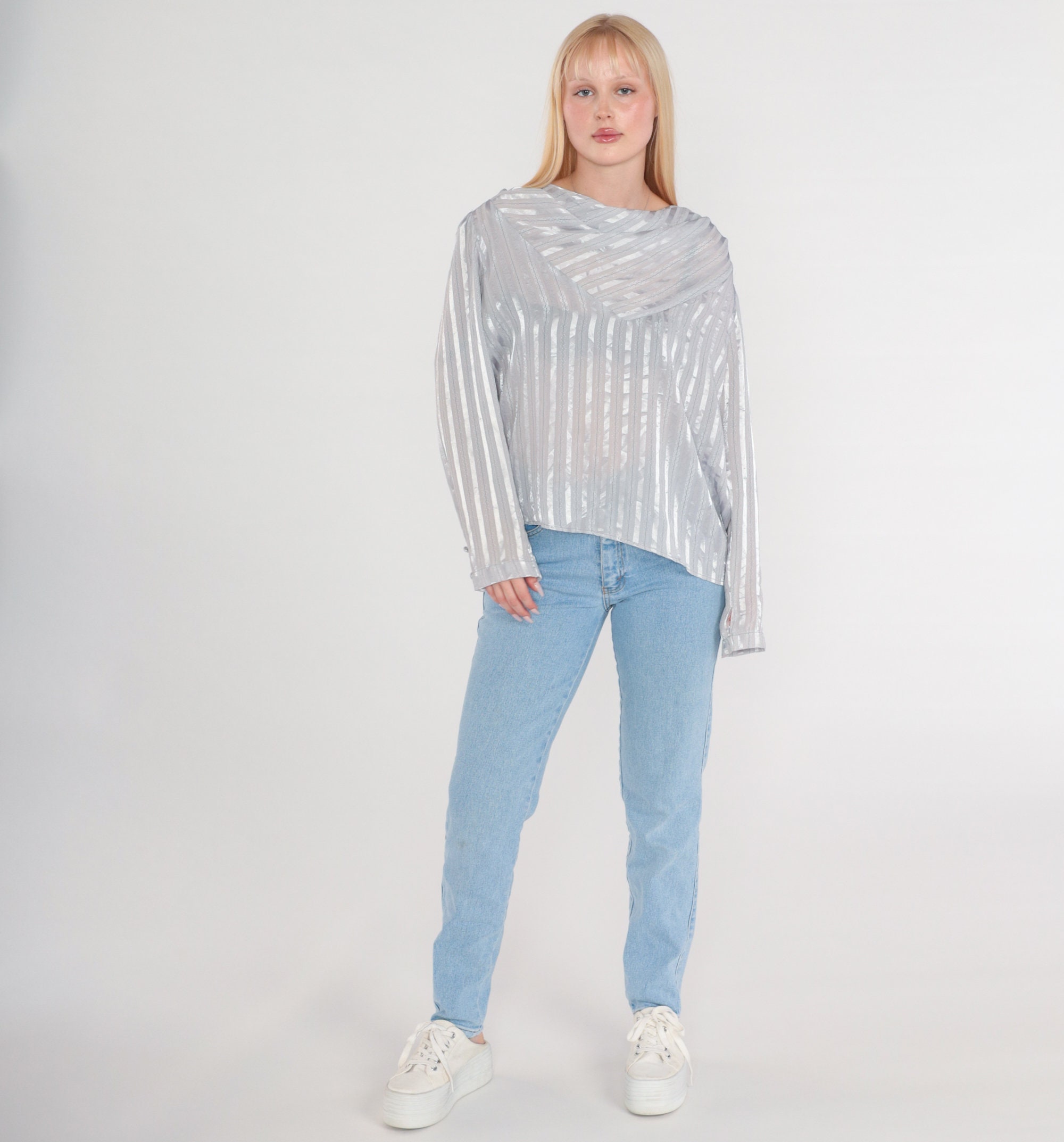 Vintage 80s blouse in Semi-Sheer striped metallic silver with long sleeves and a cowl neck.