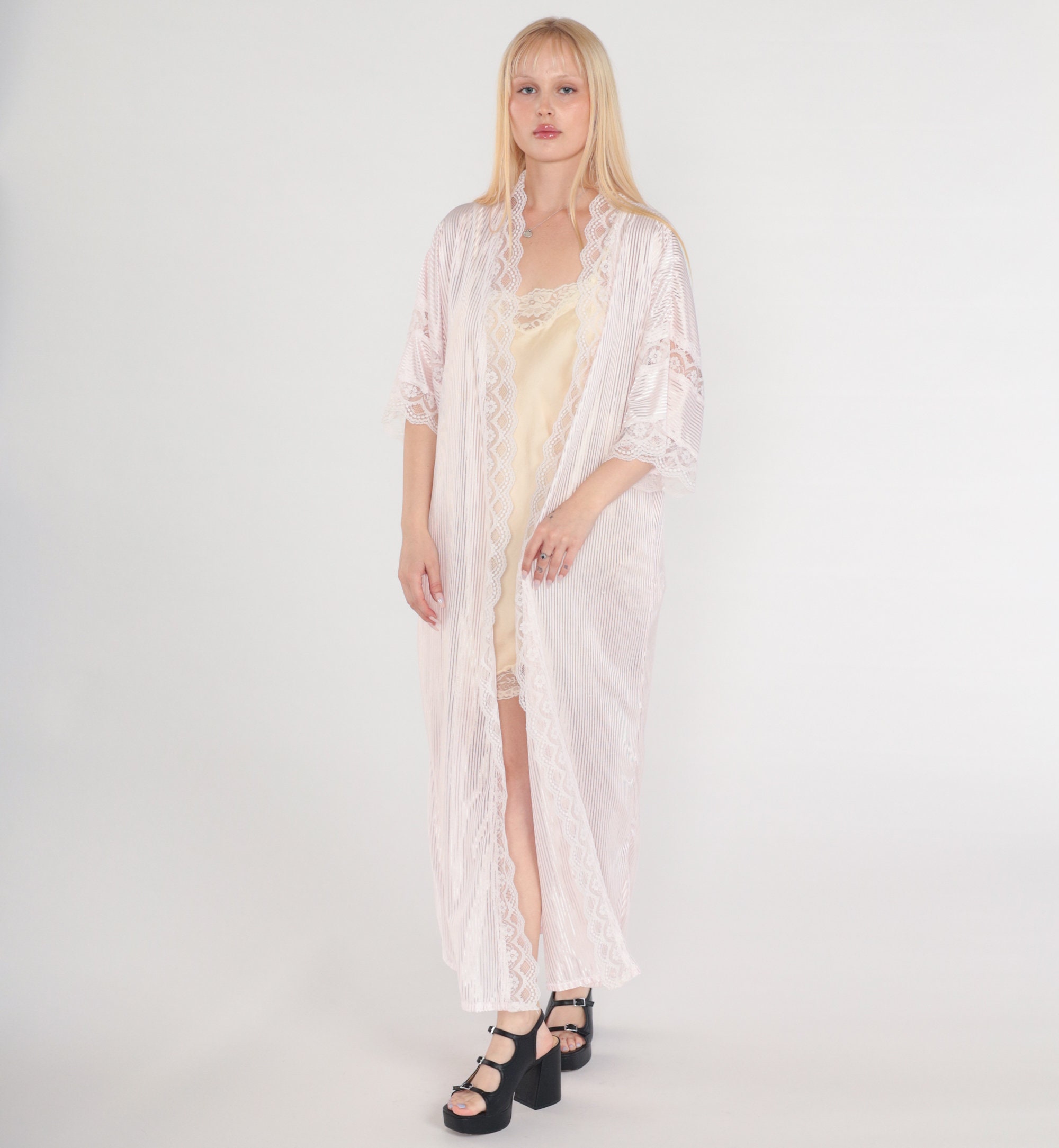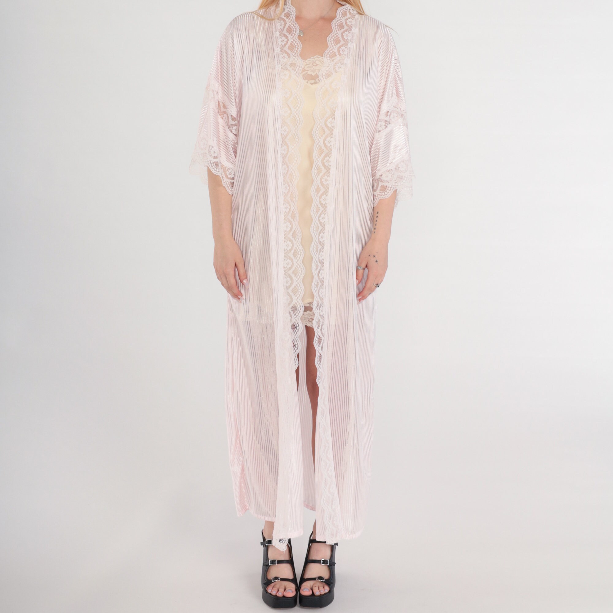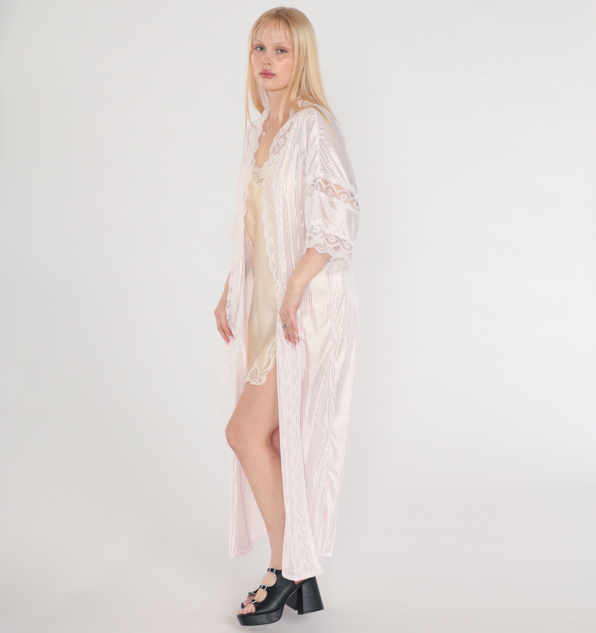 Vintage 80s lingerie robe in Semi-Sheer striped pink with lace trim and an open front. Maxi length.