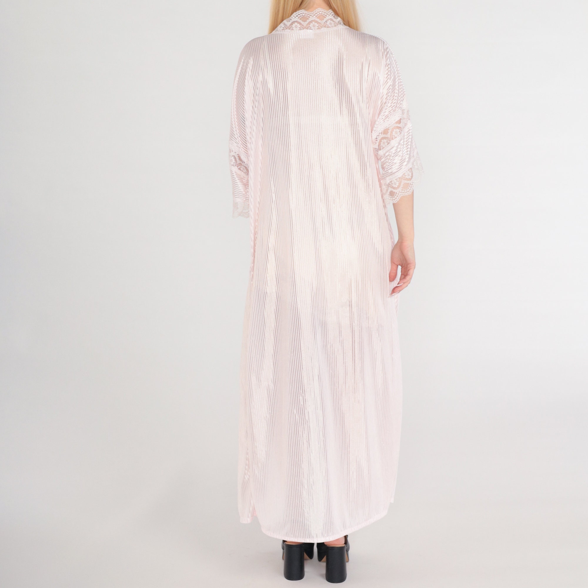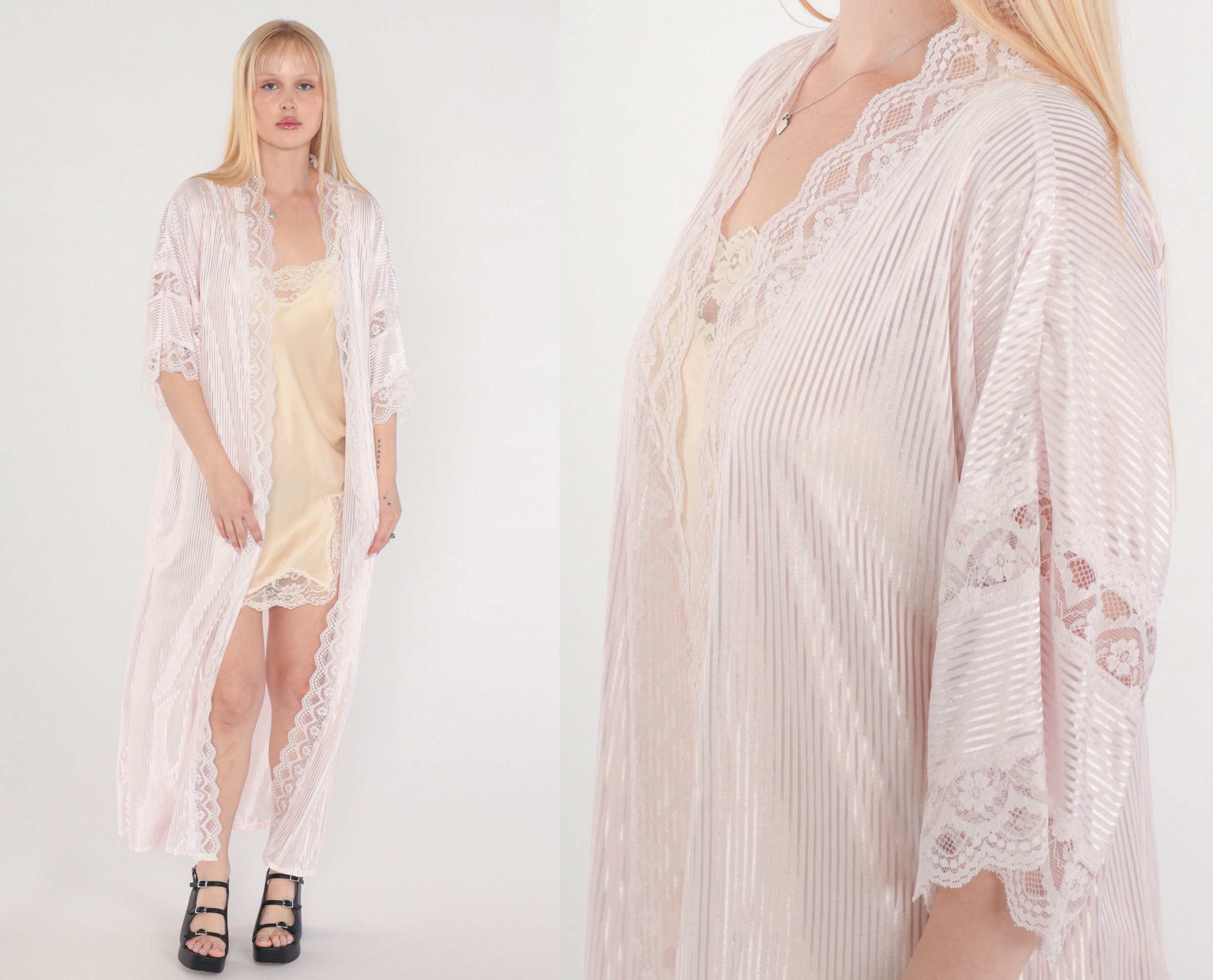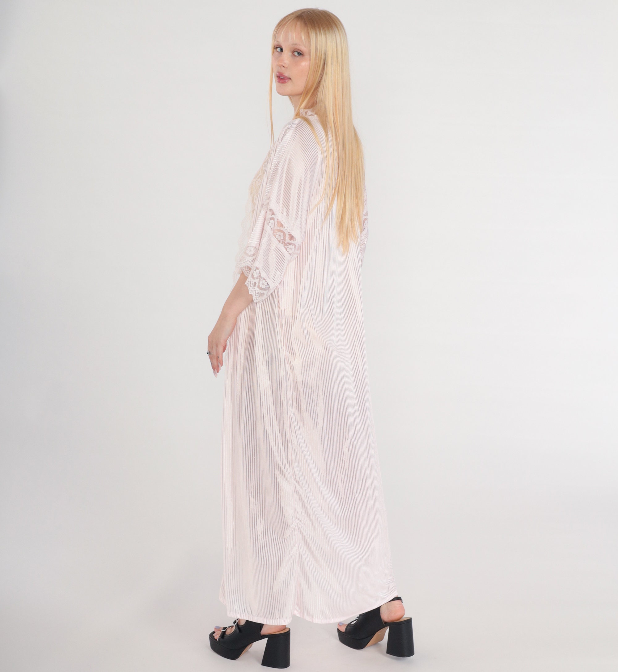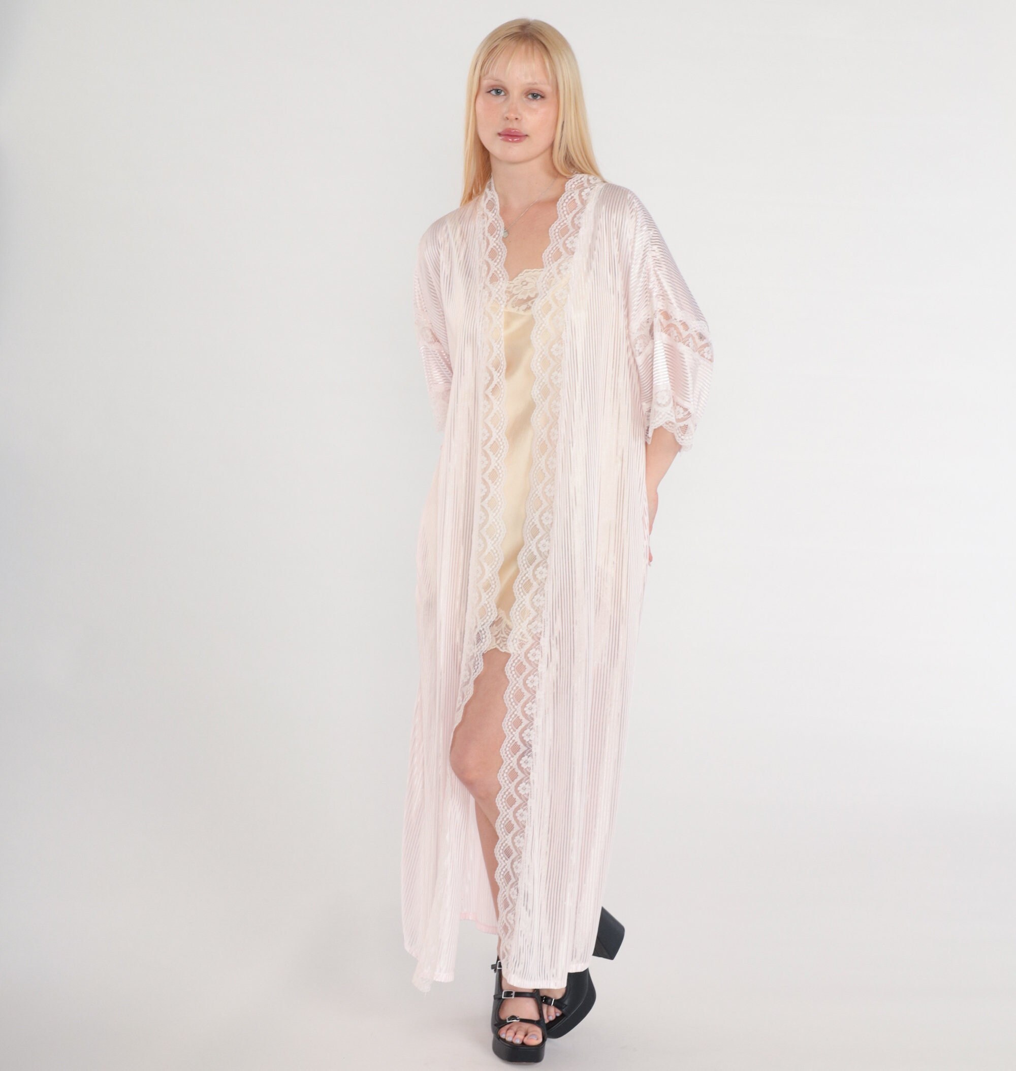 Vintage 80s lingerie robe in Semi-Sheer striped pink with lace trim and an open front. Maxi length.
