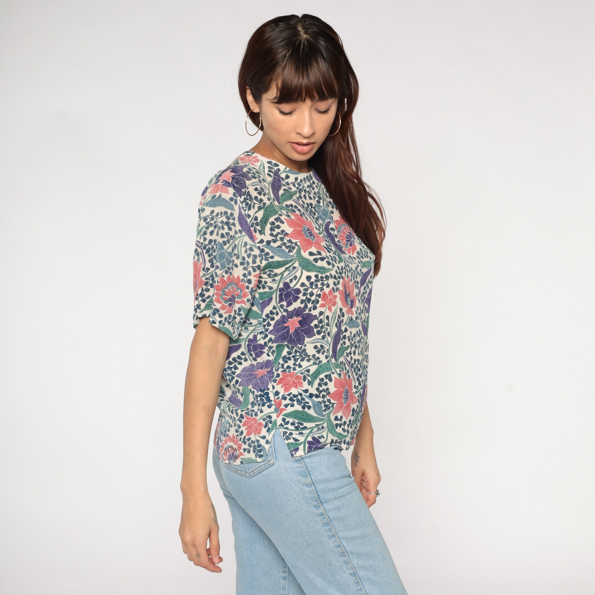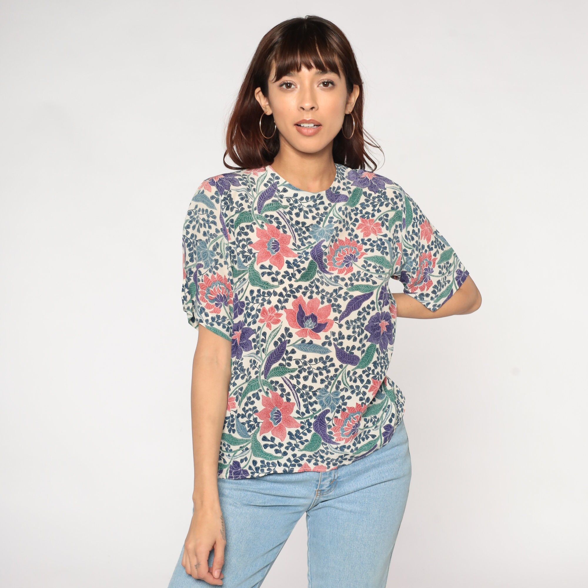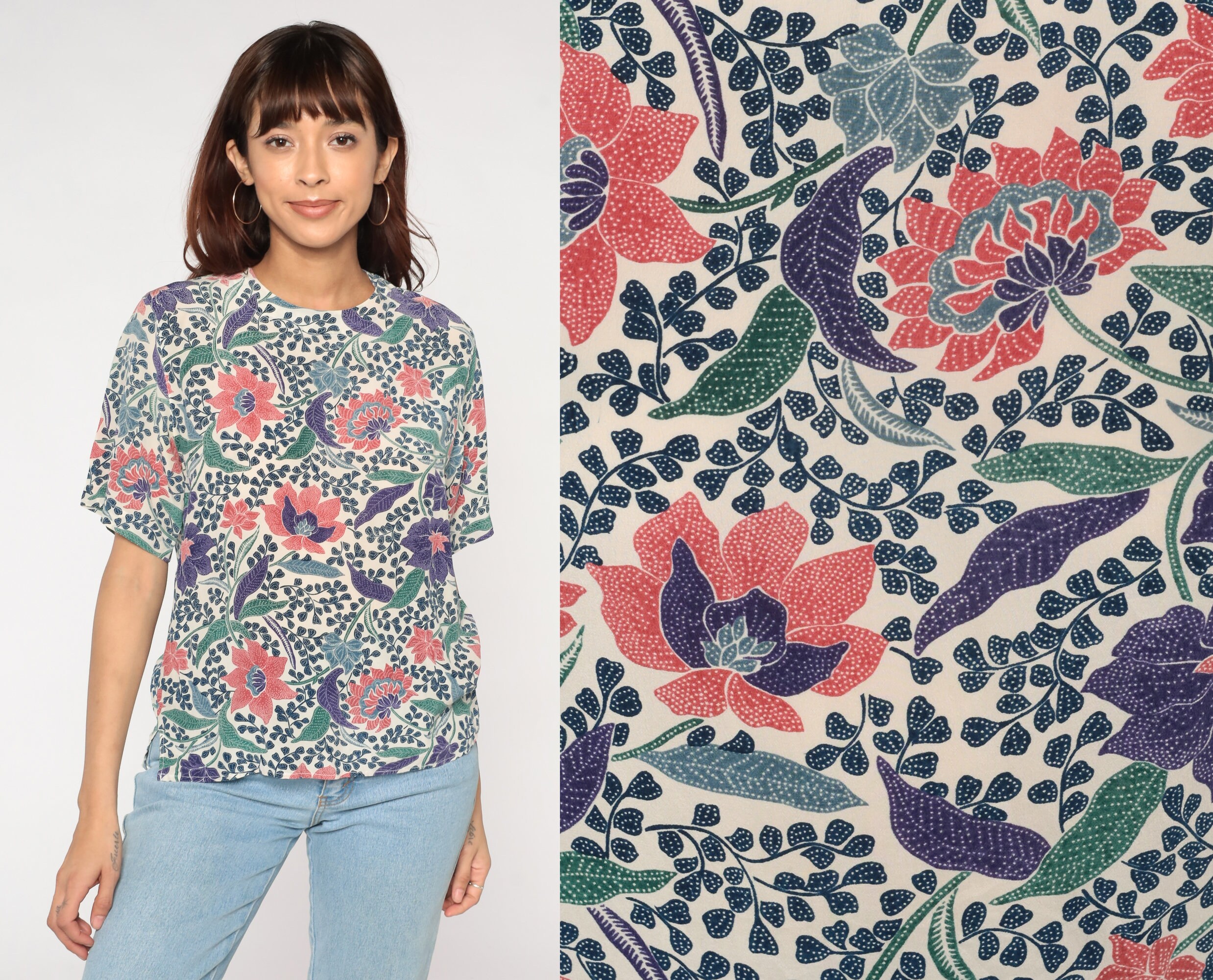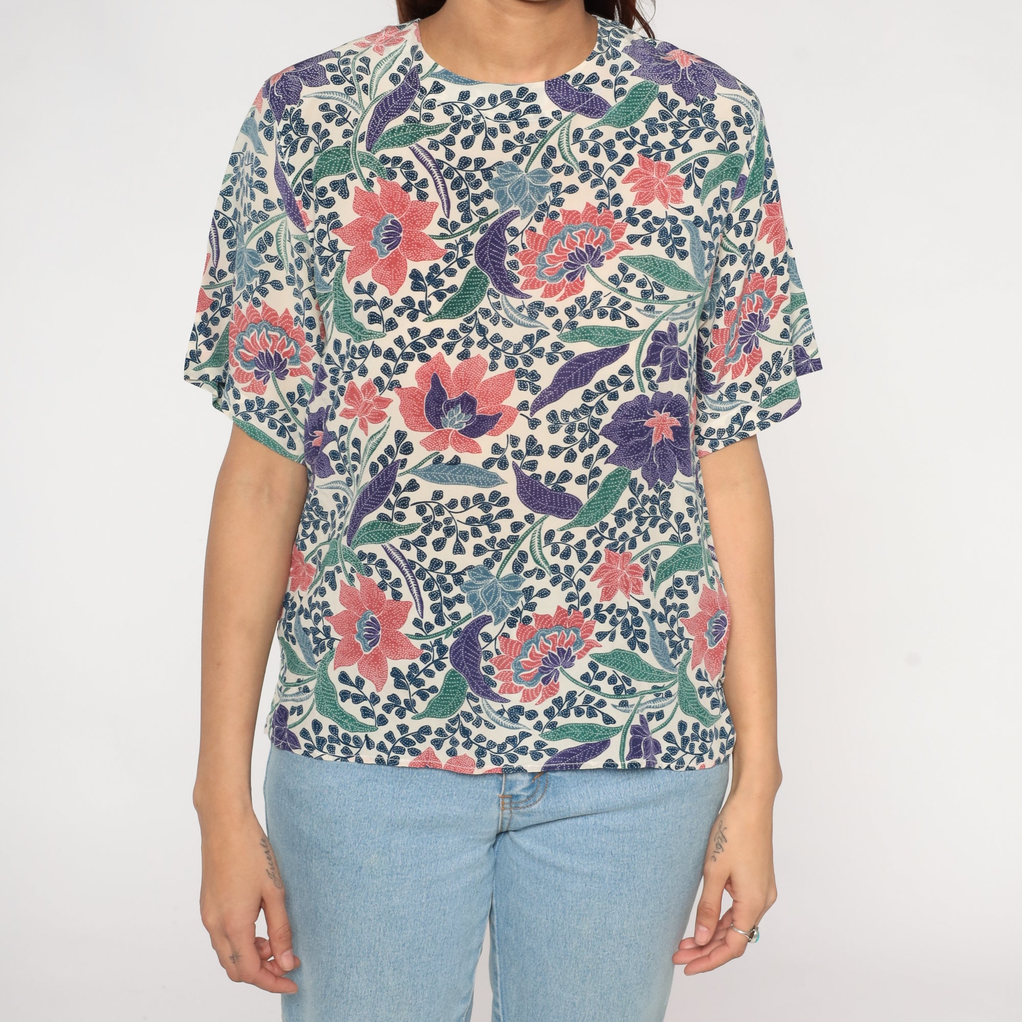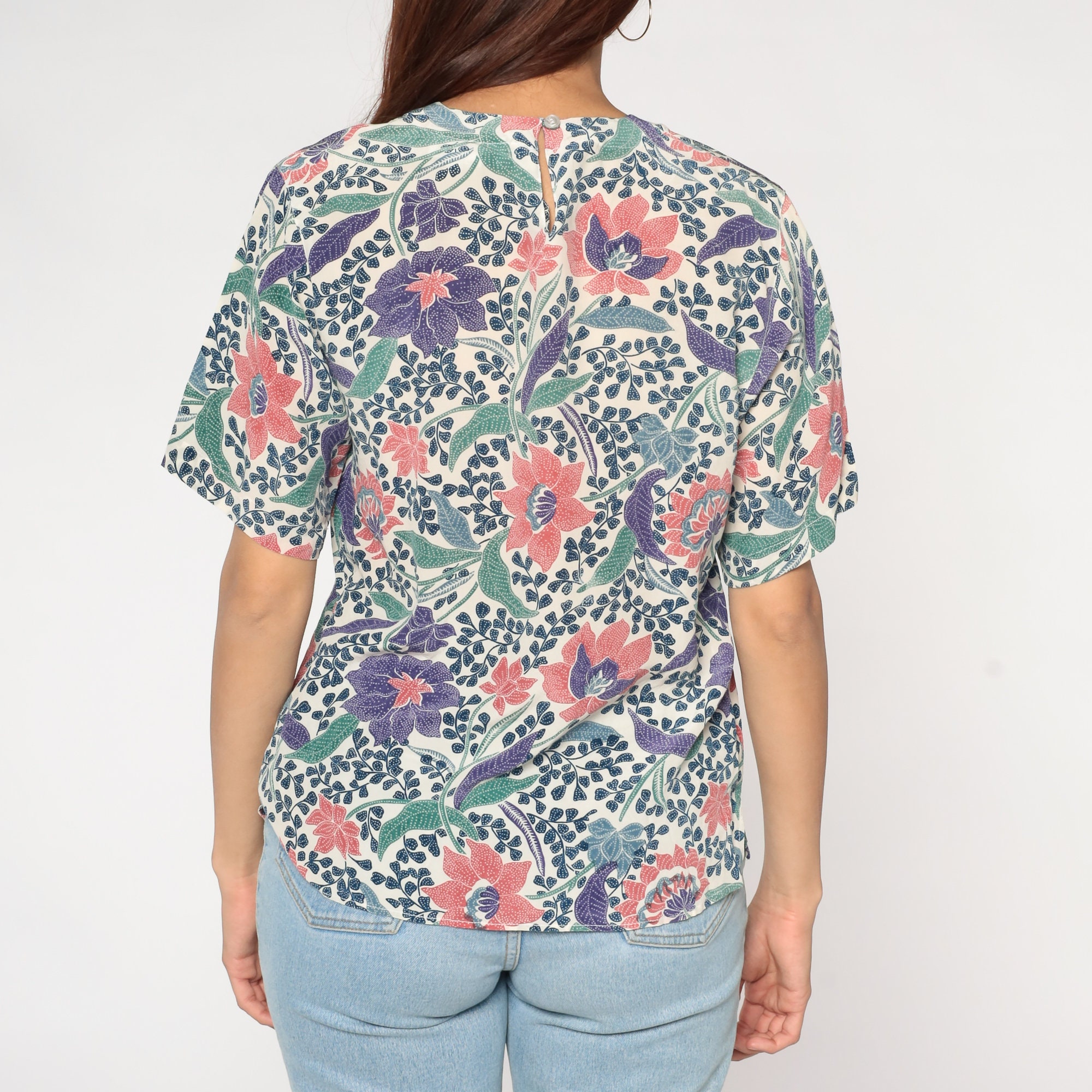 Vintage 90s silk shirt in white with an Indian Batik-style floral print. Short sleeves and a keyhole button in the back.