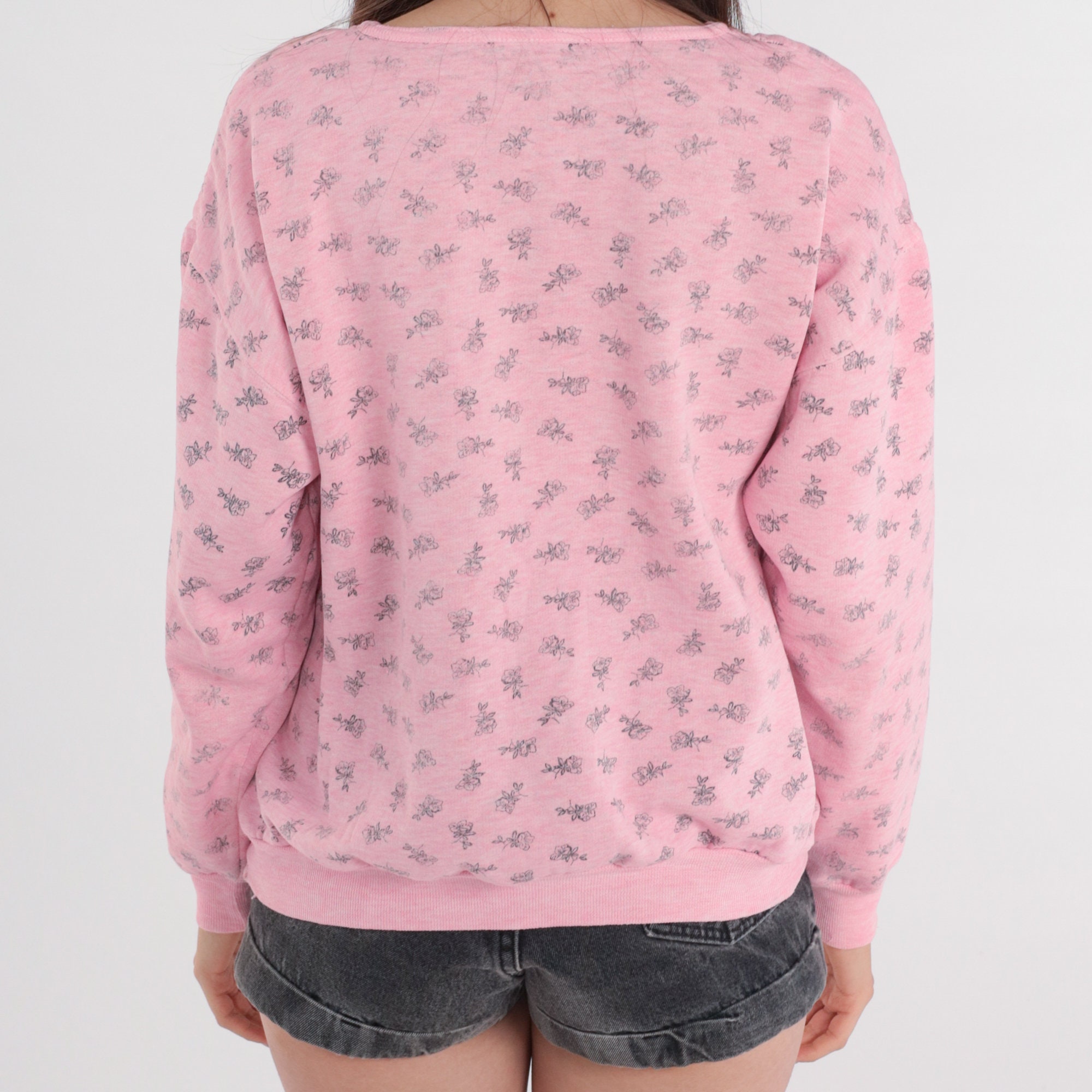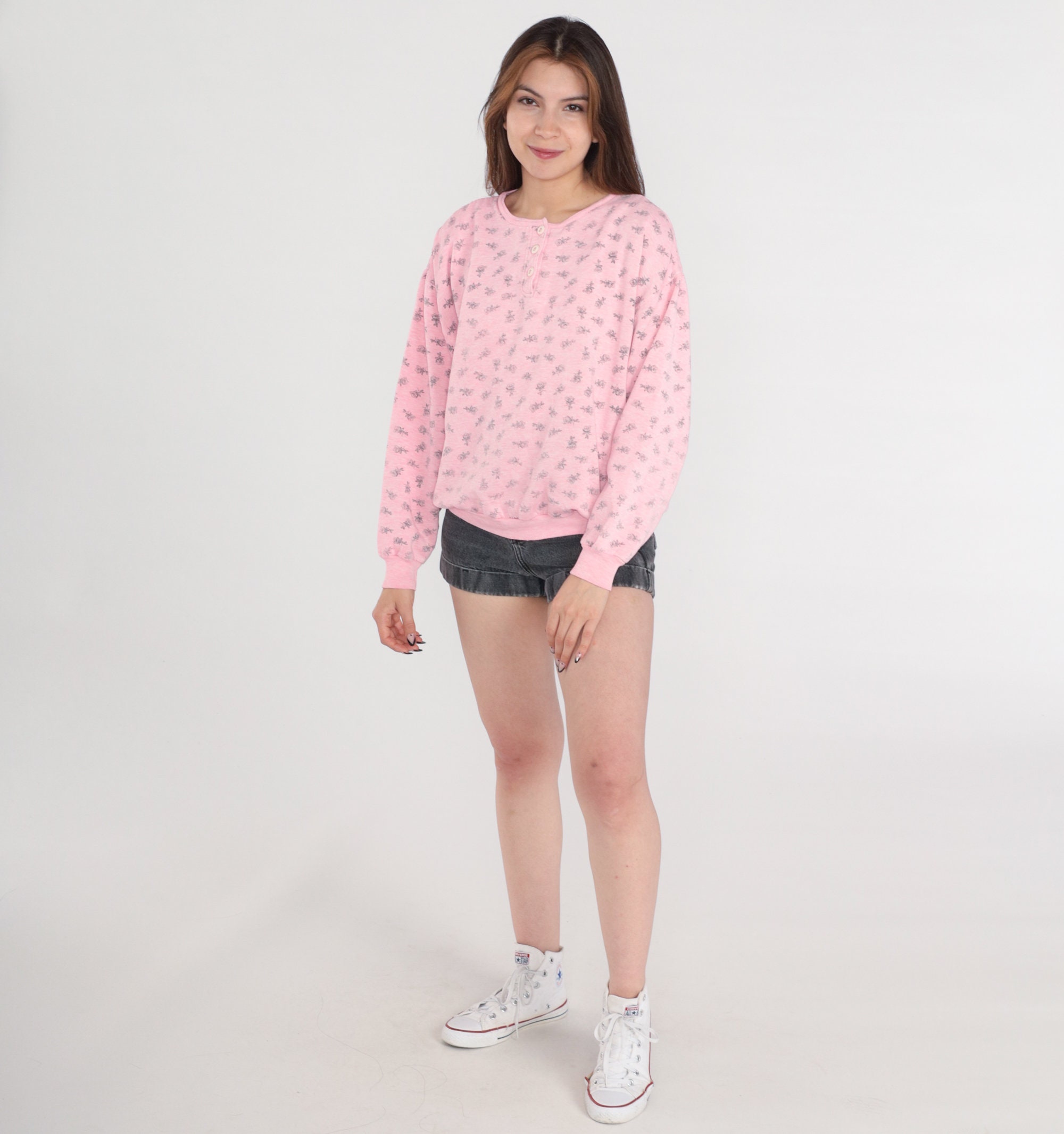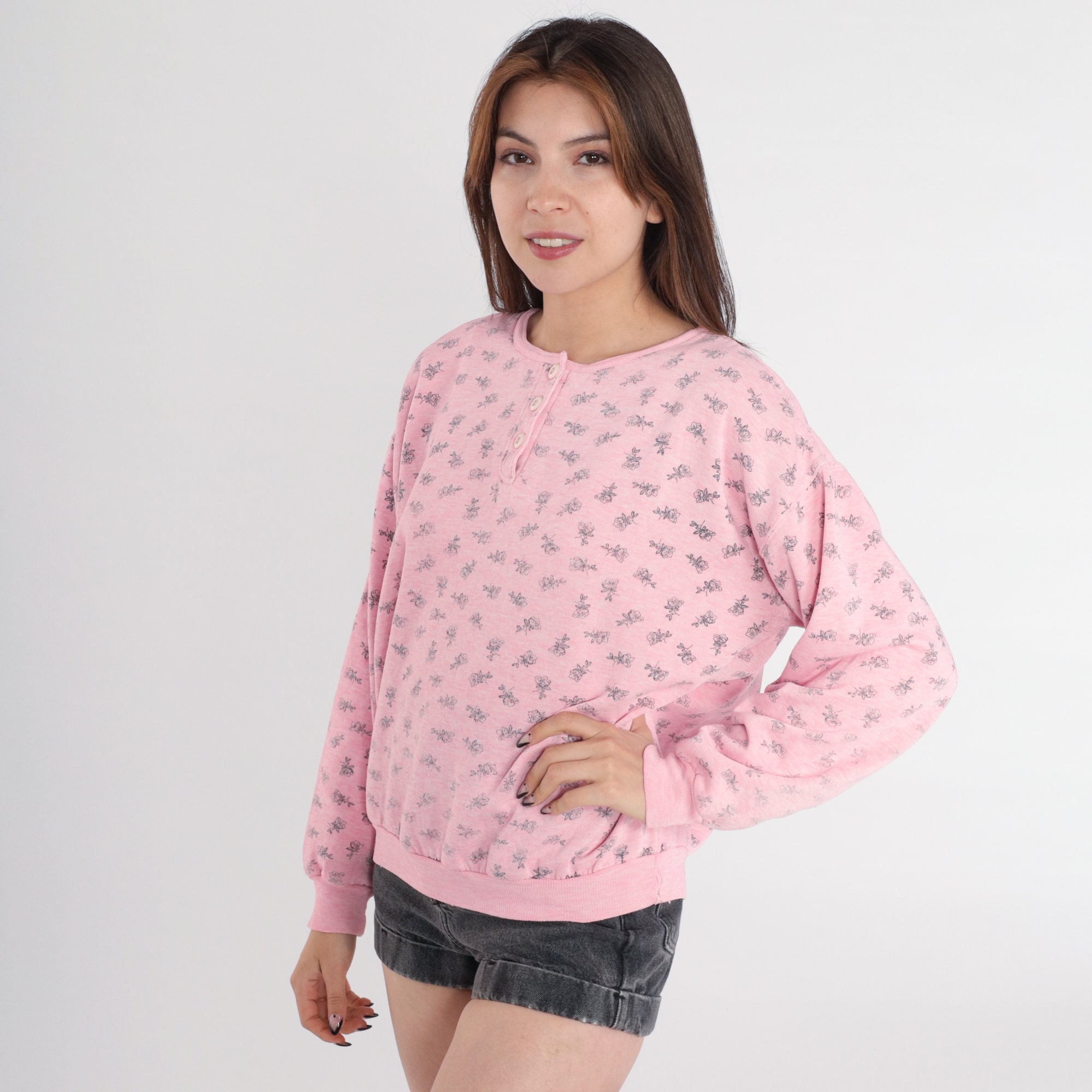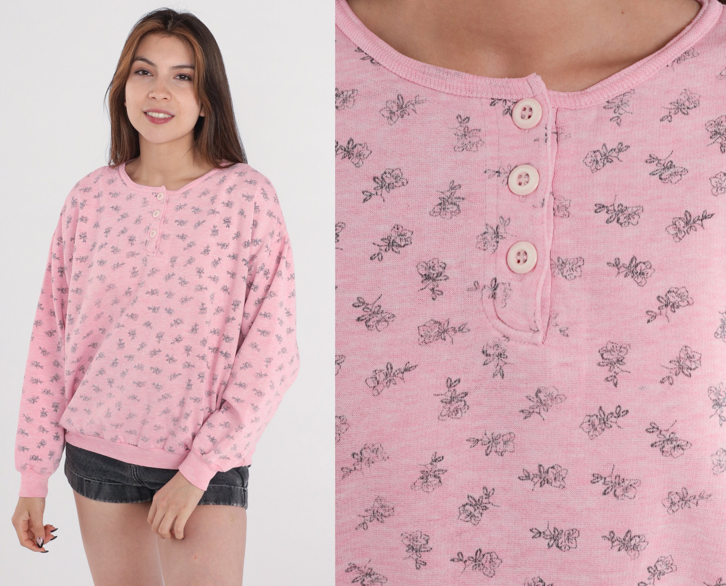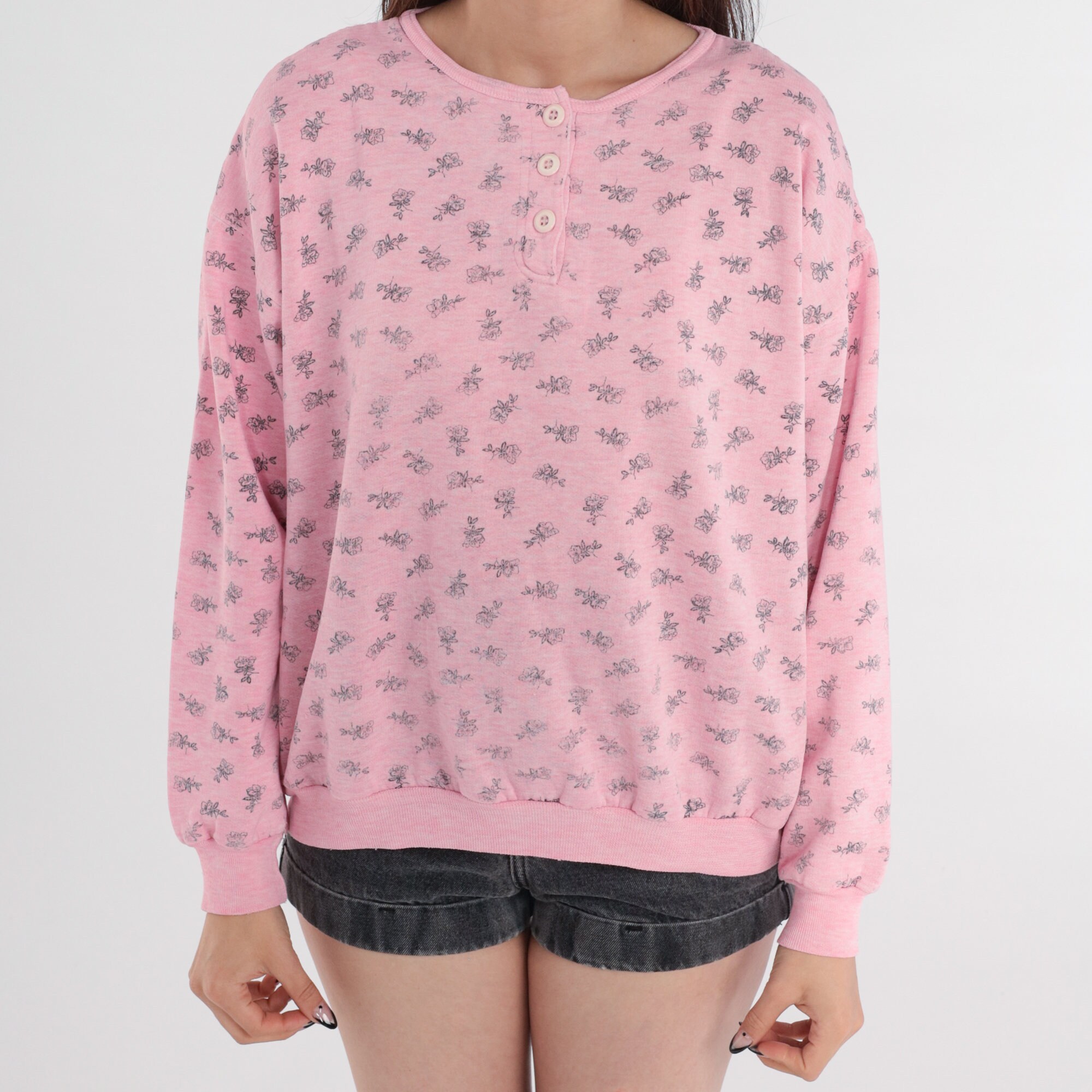 Vintage 90s sweatshirt in pink with a ditsy floral print and henley buttons up the chest.