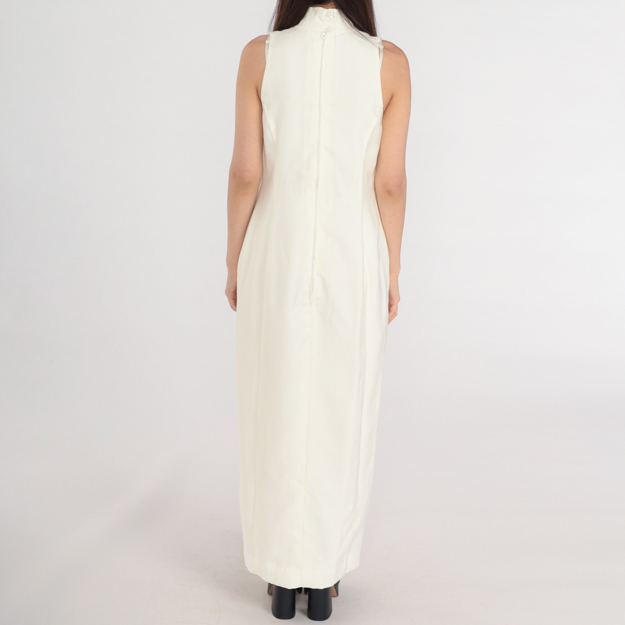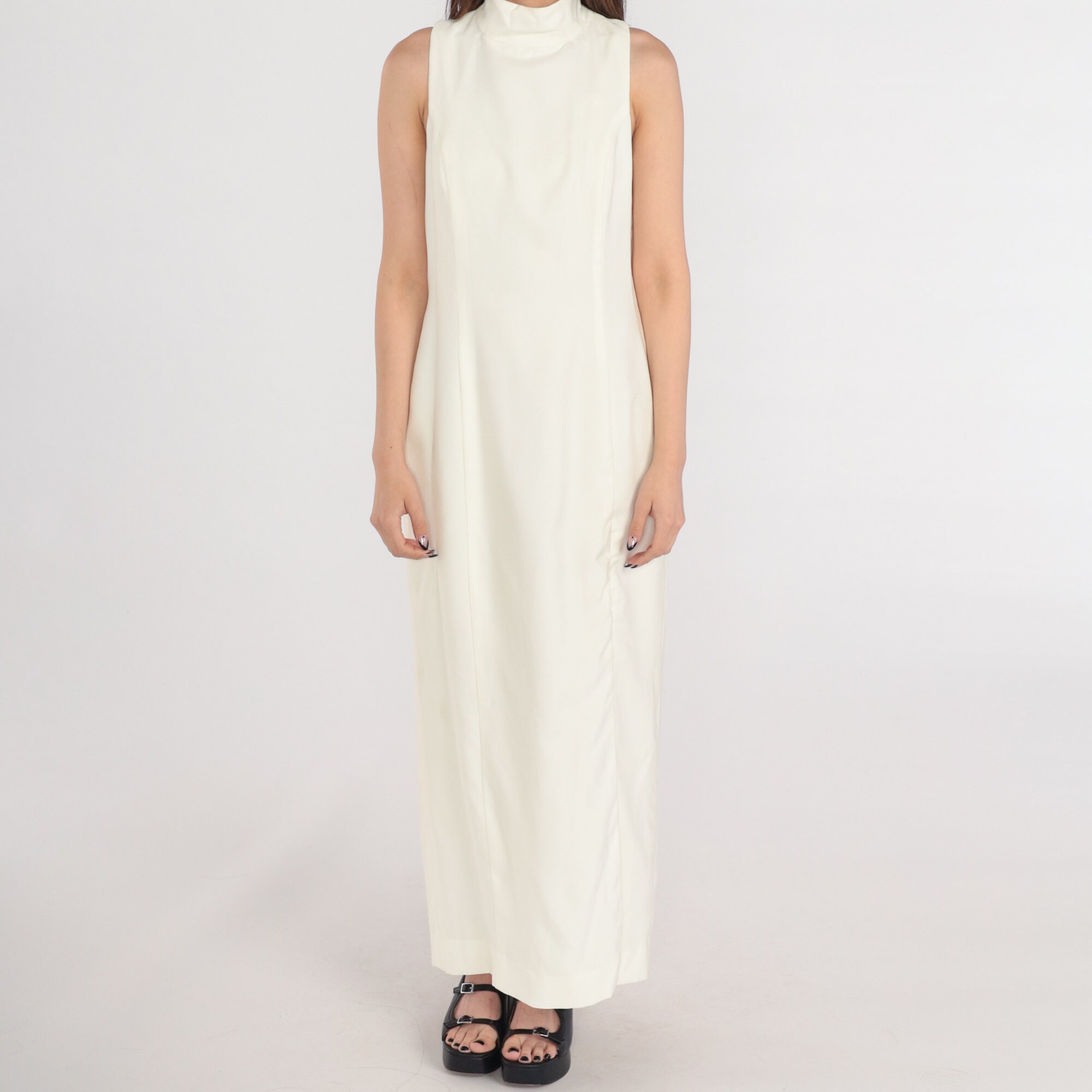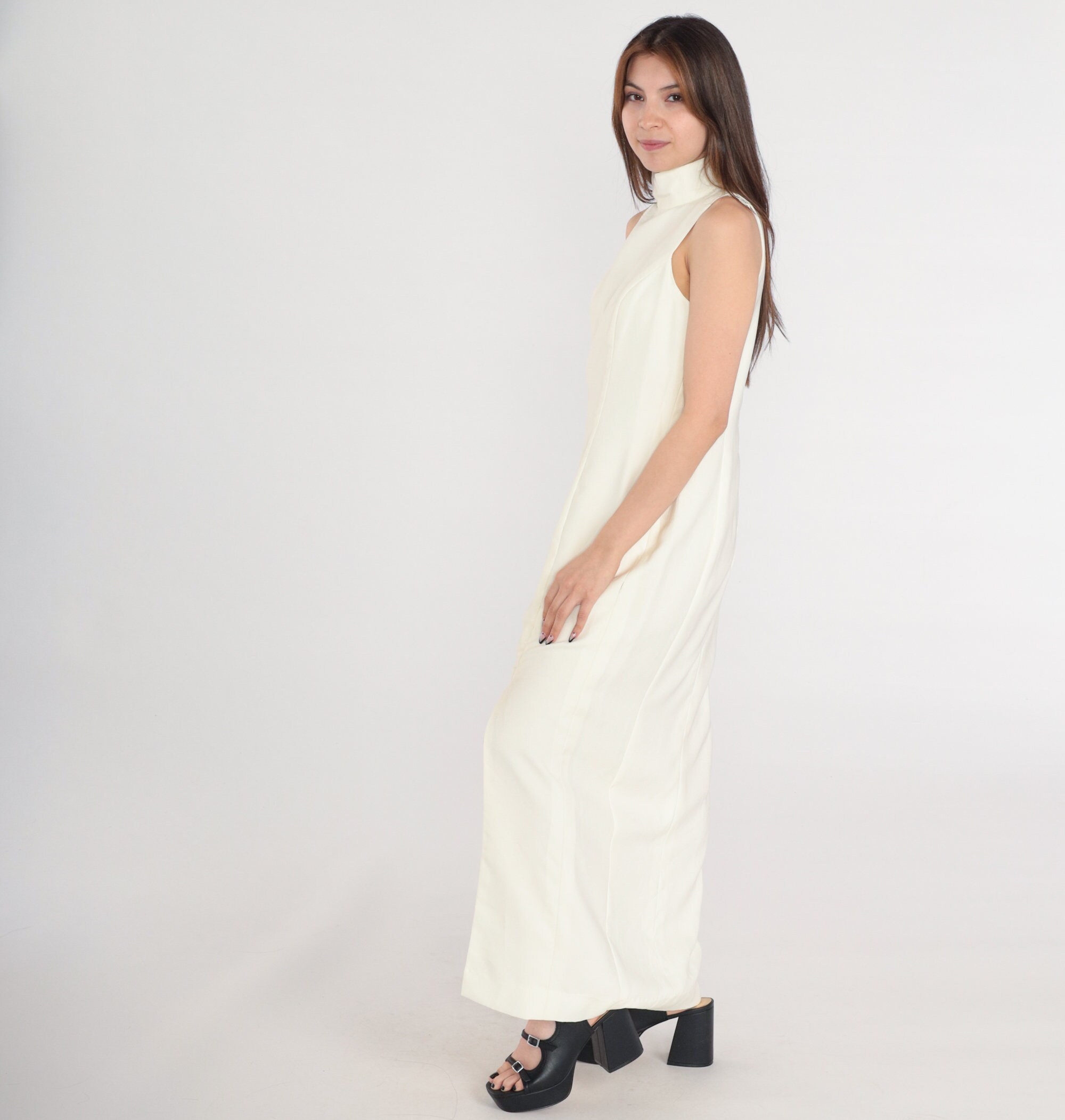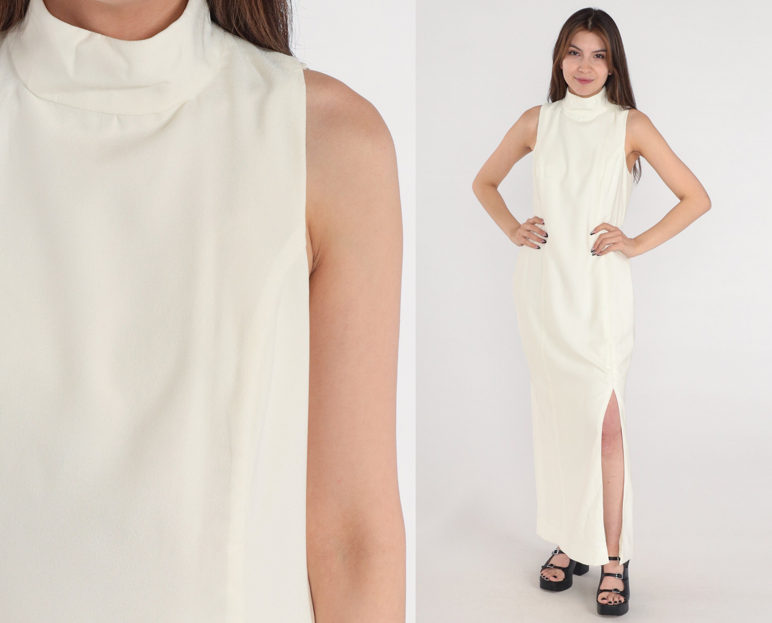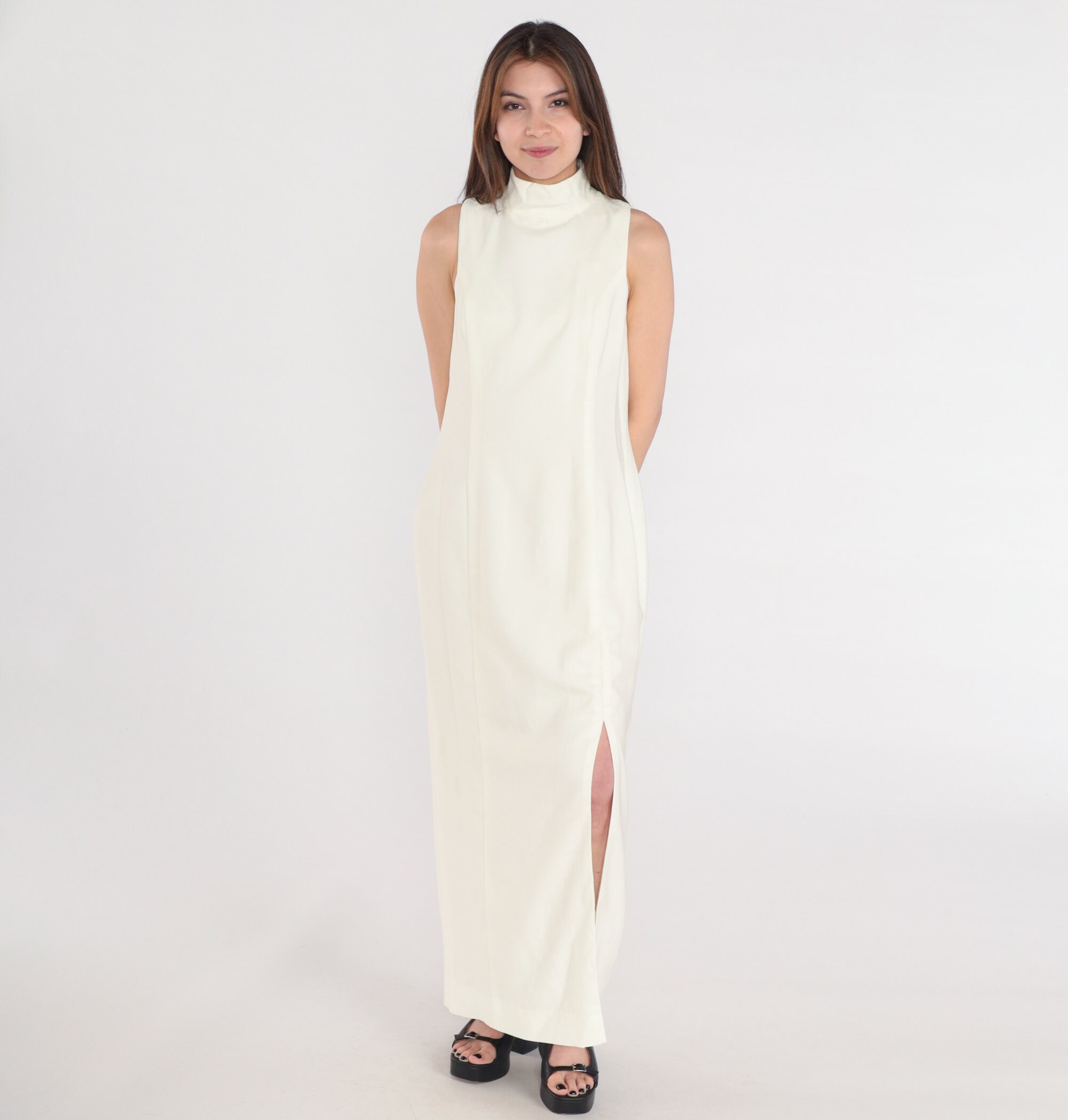 Vintage 80s dress in cream. Sleeveless with a mock neck and a high slit. Maxi length with a rear zipper.