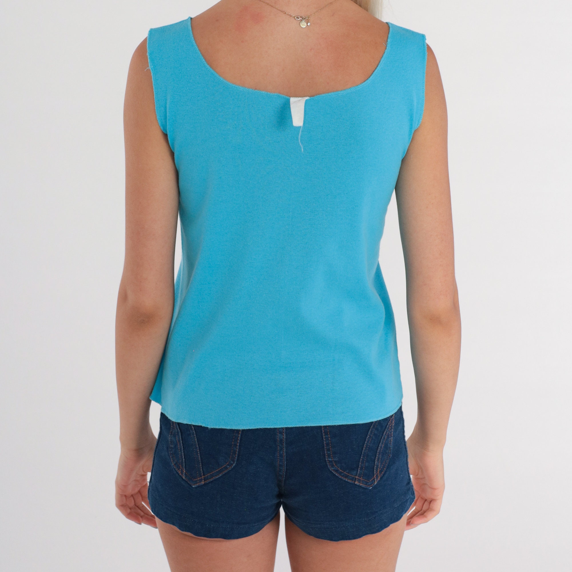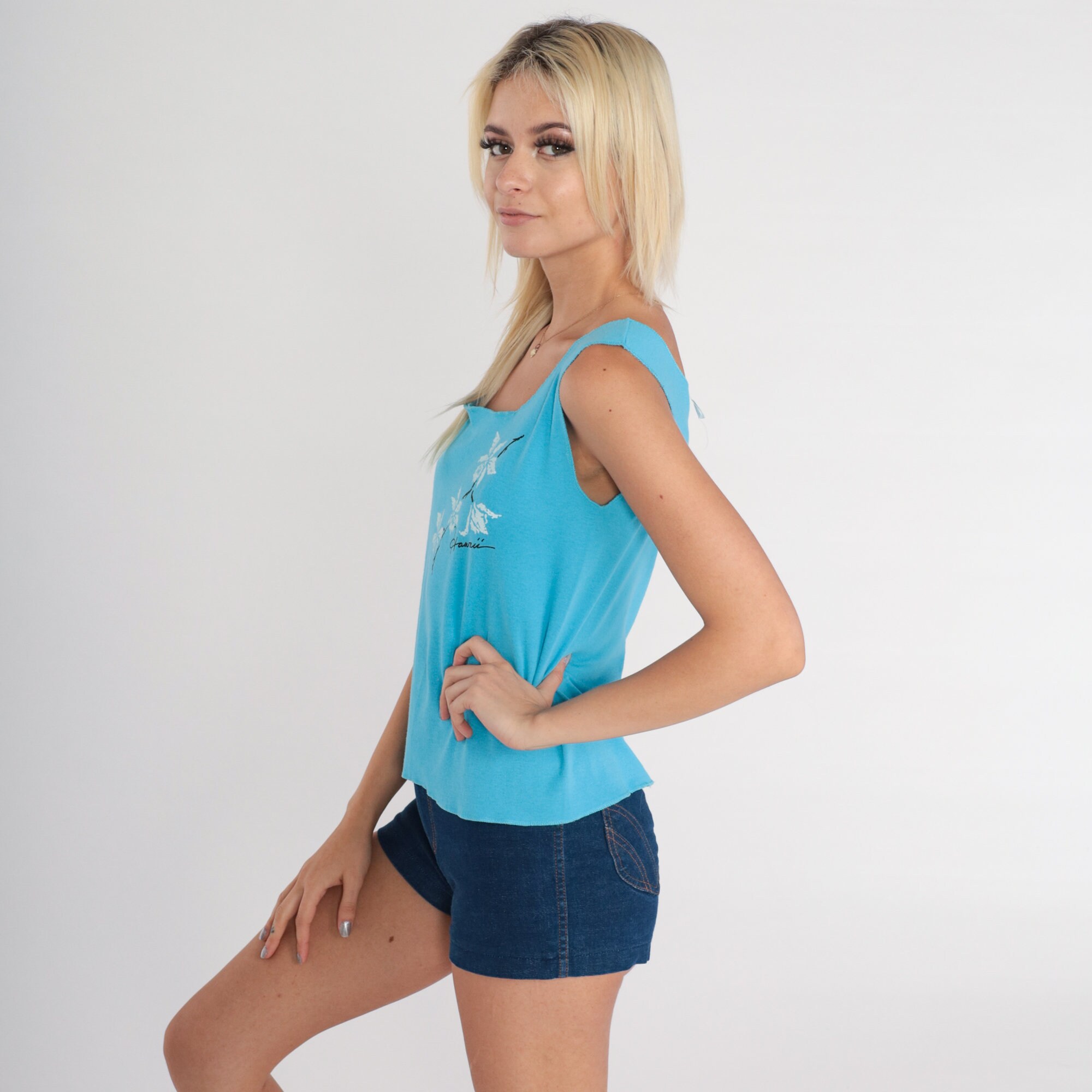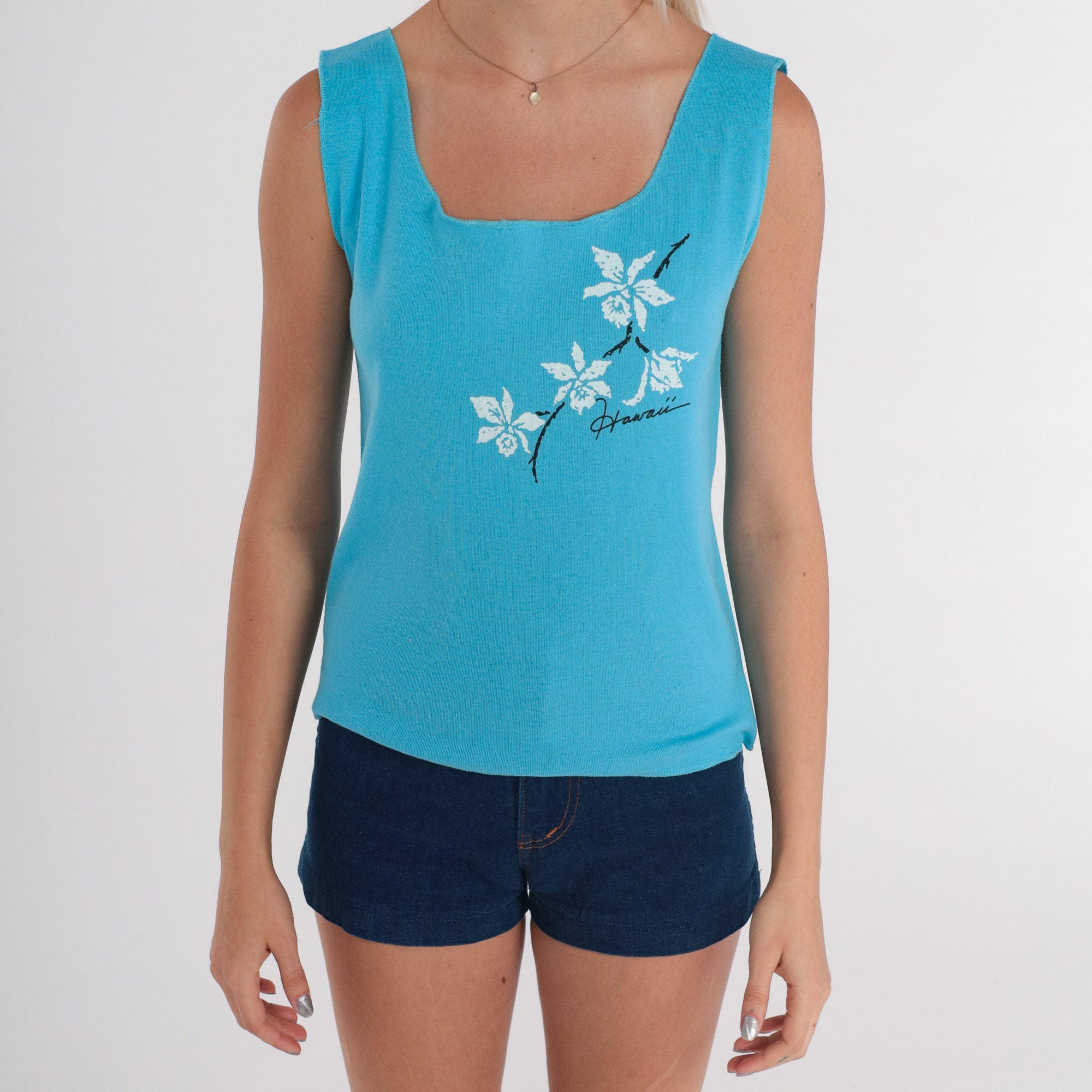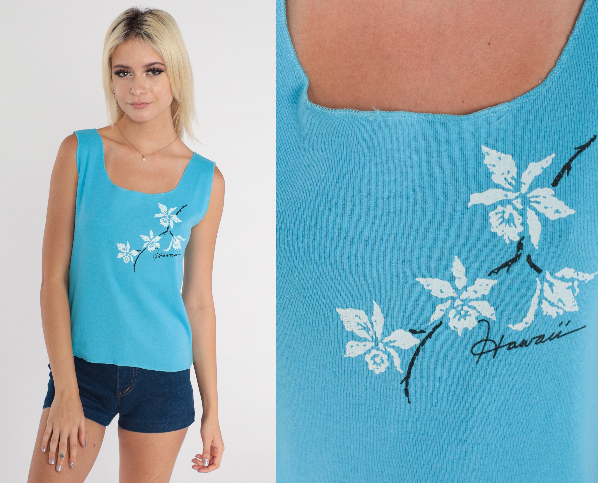 Vintage 80s tank top in blue with a Tropical Floral print and "Hawaii" on the front.