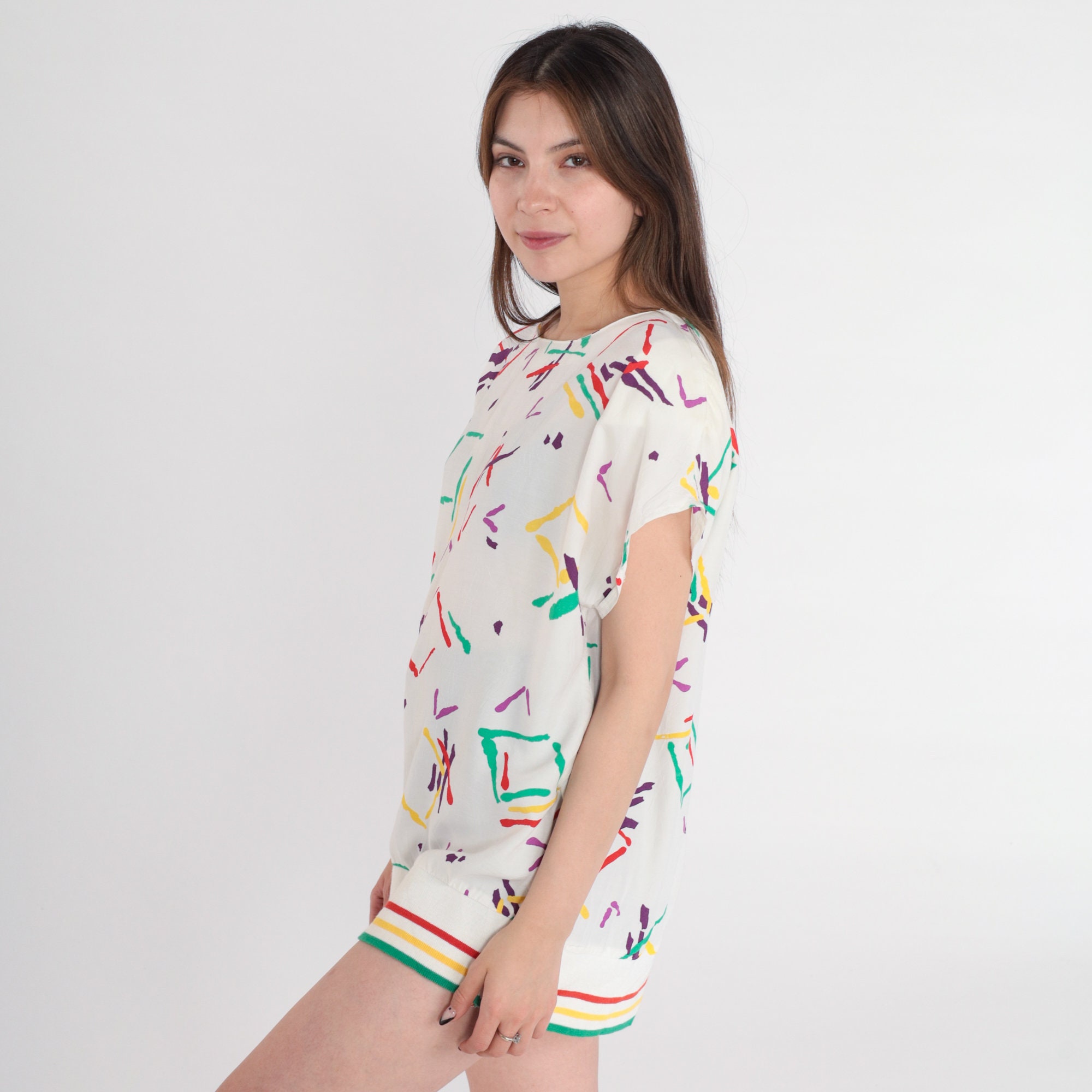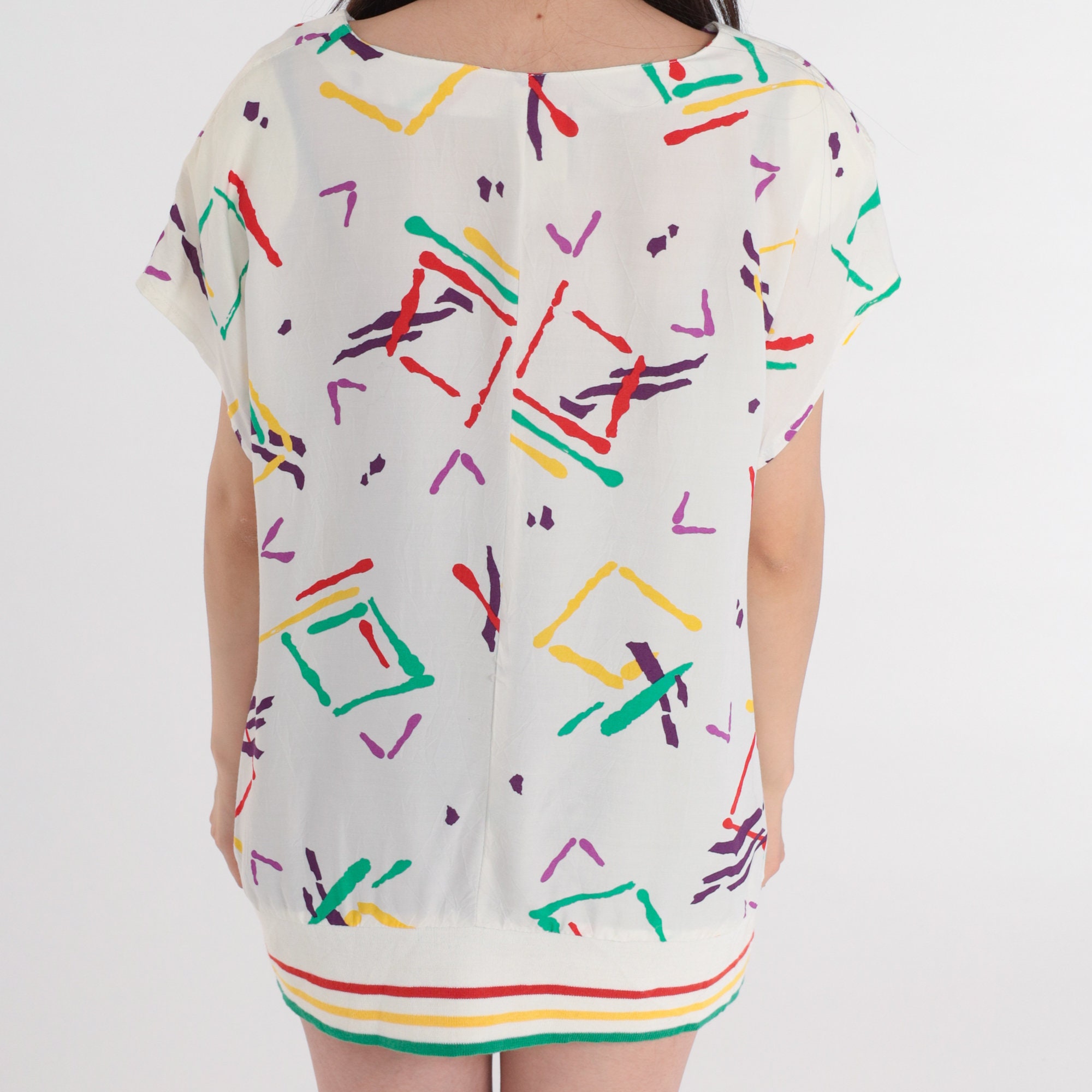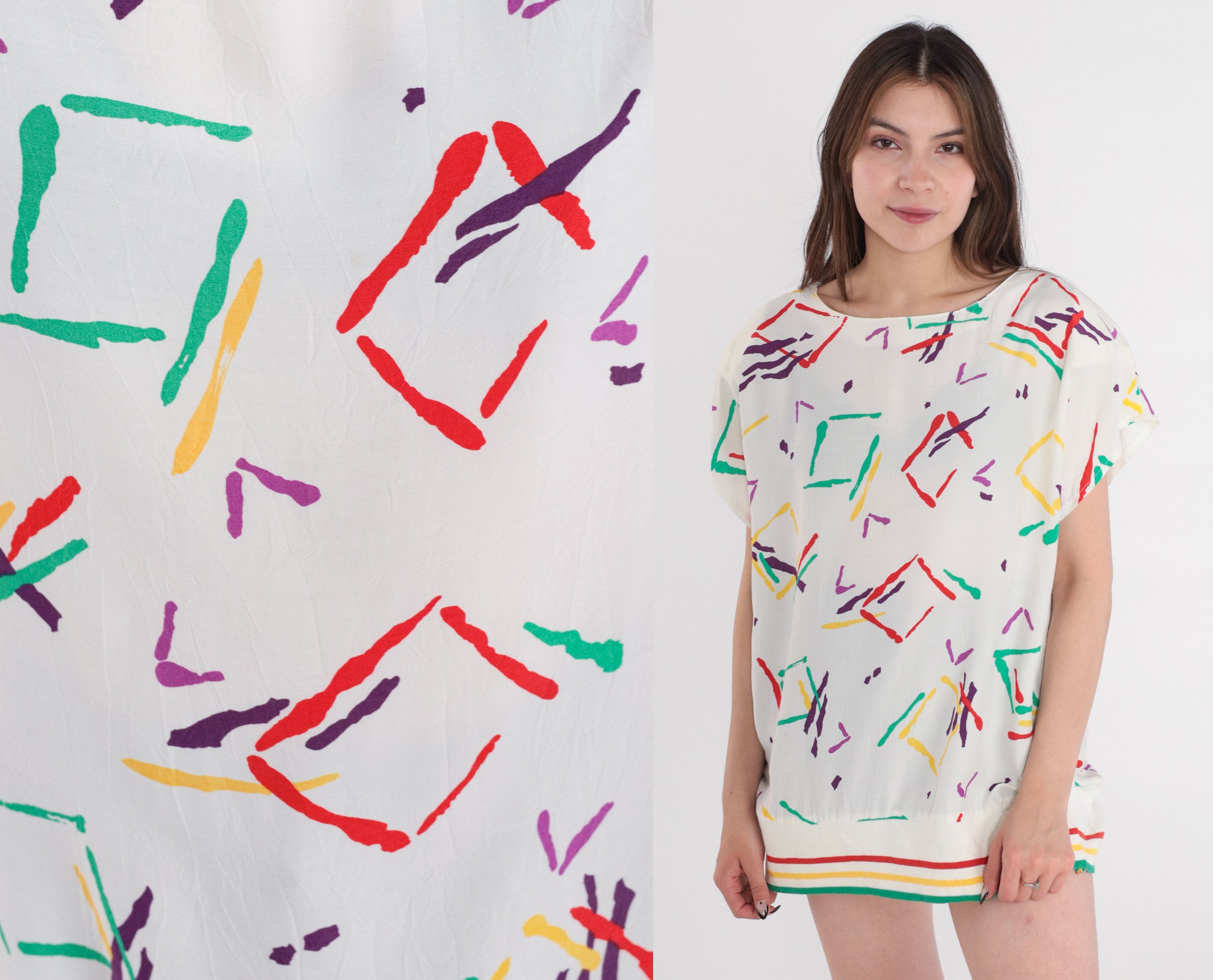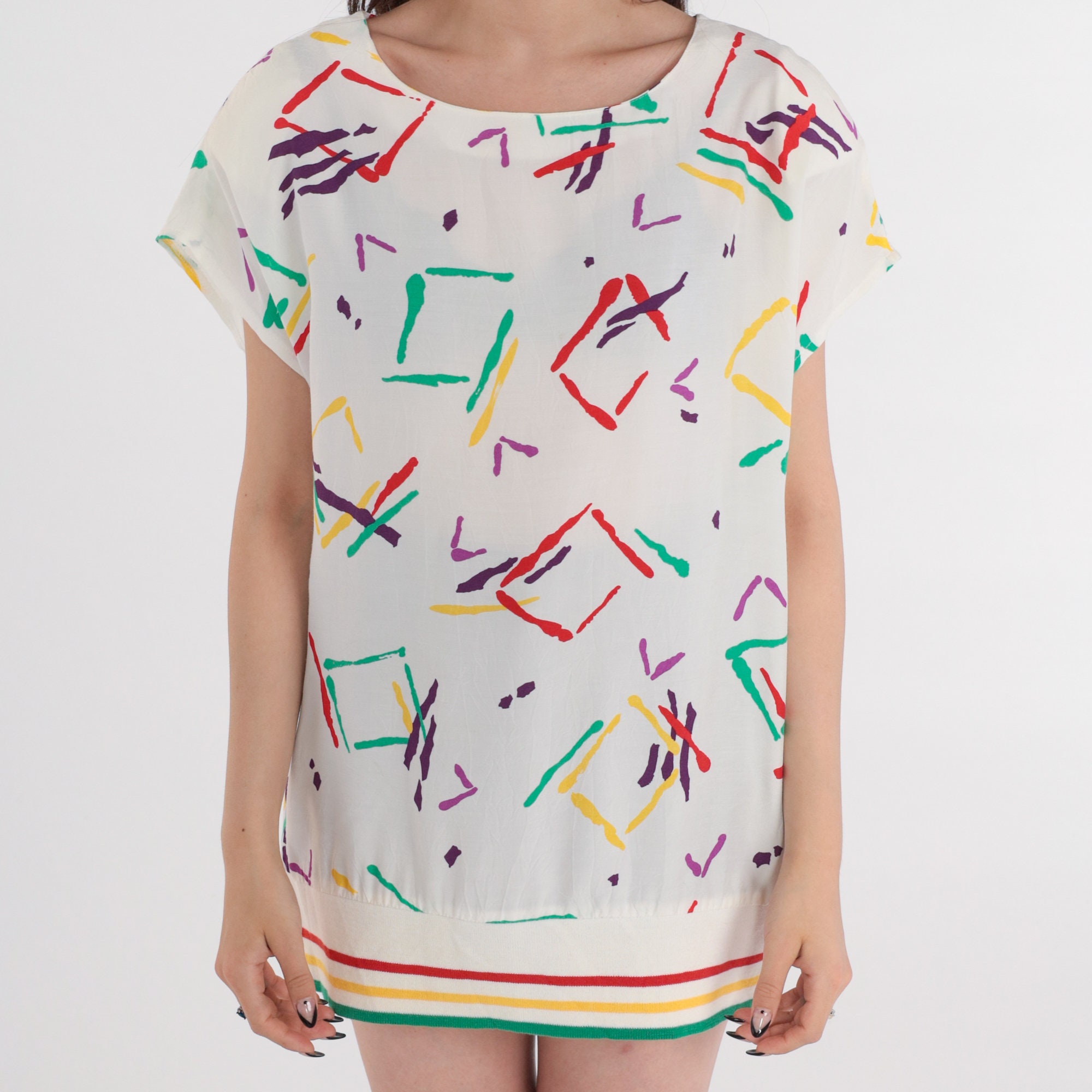 Vintage 80s top in white with an abstract Geometric print and a striped hem. Tunic length with short sleeves.