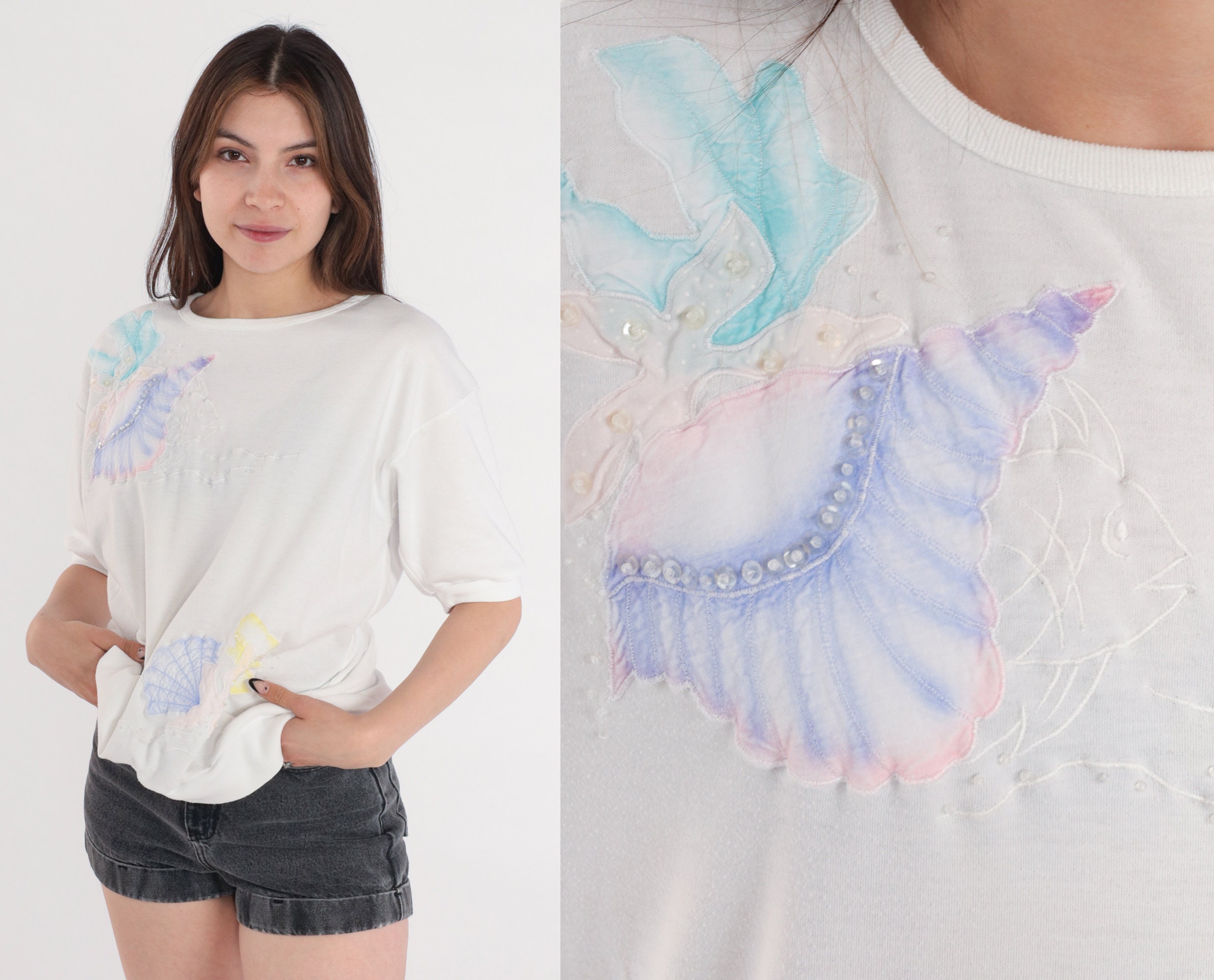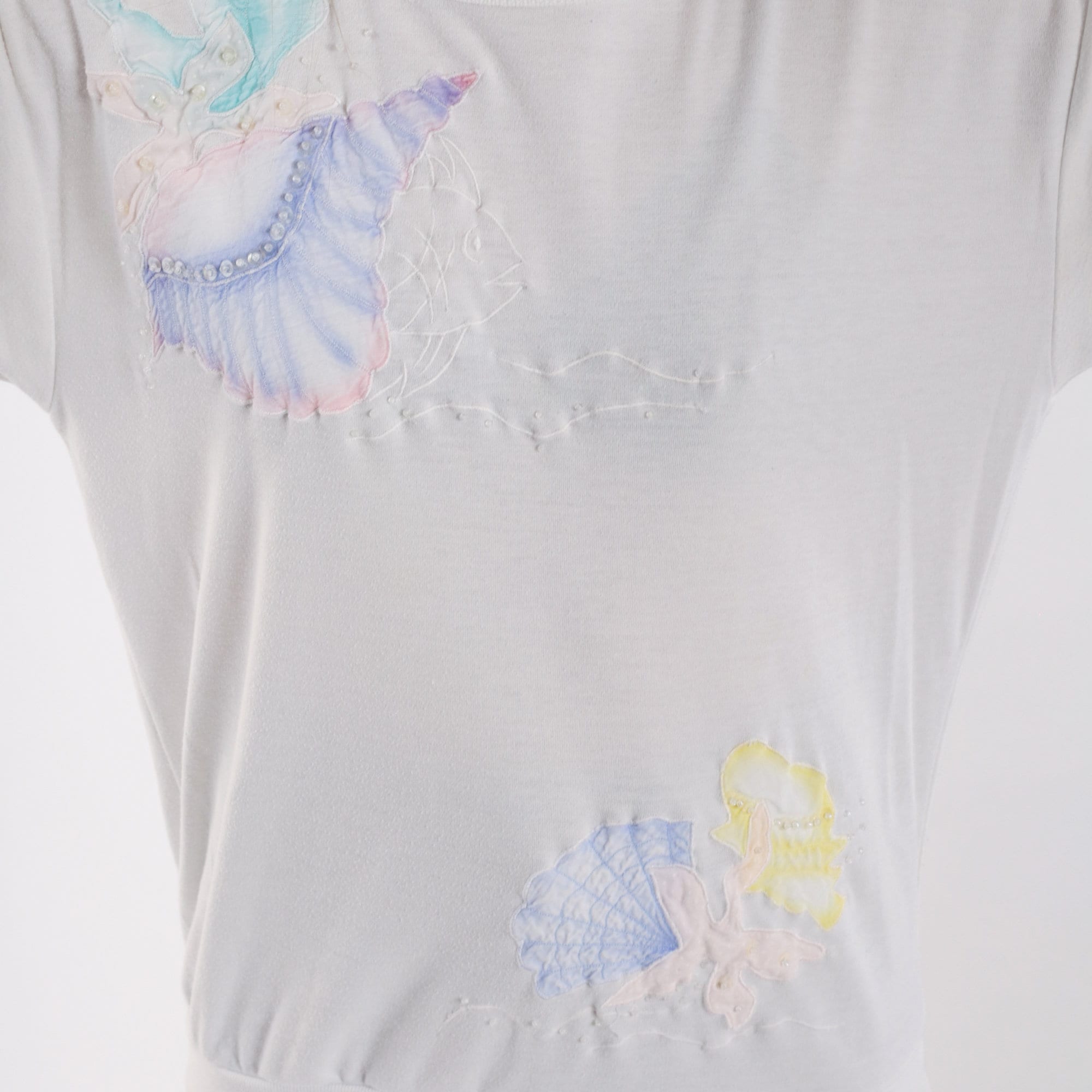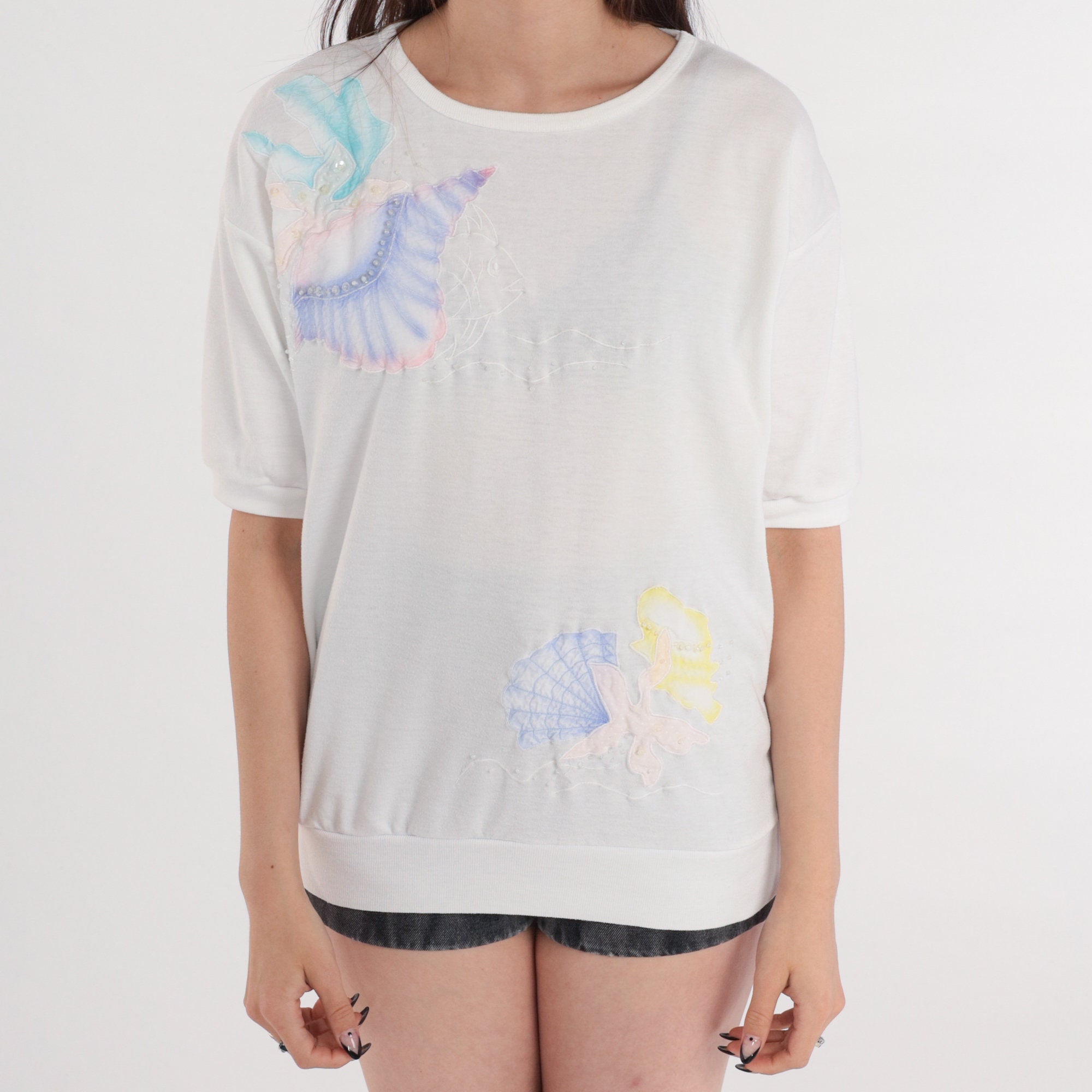 Vintage 80s shirt in white with pastel seashells, an embroidered fish, and sequins. Short sleeves and a banded hem.