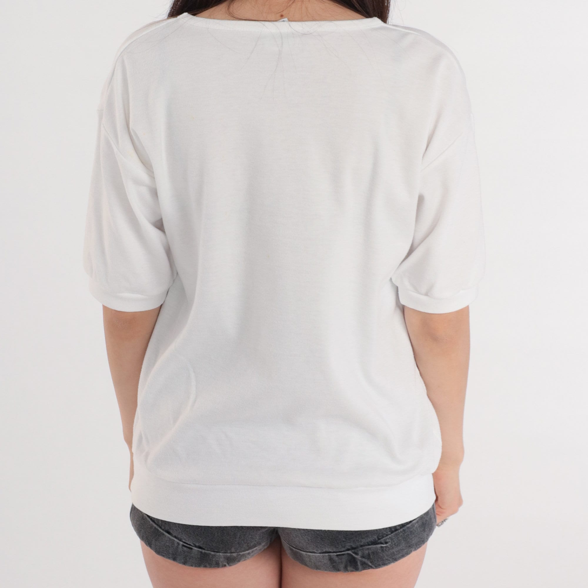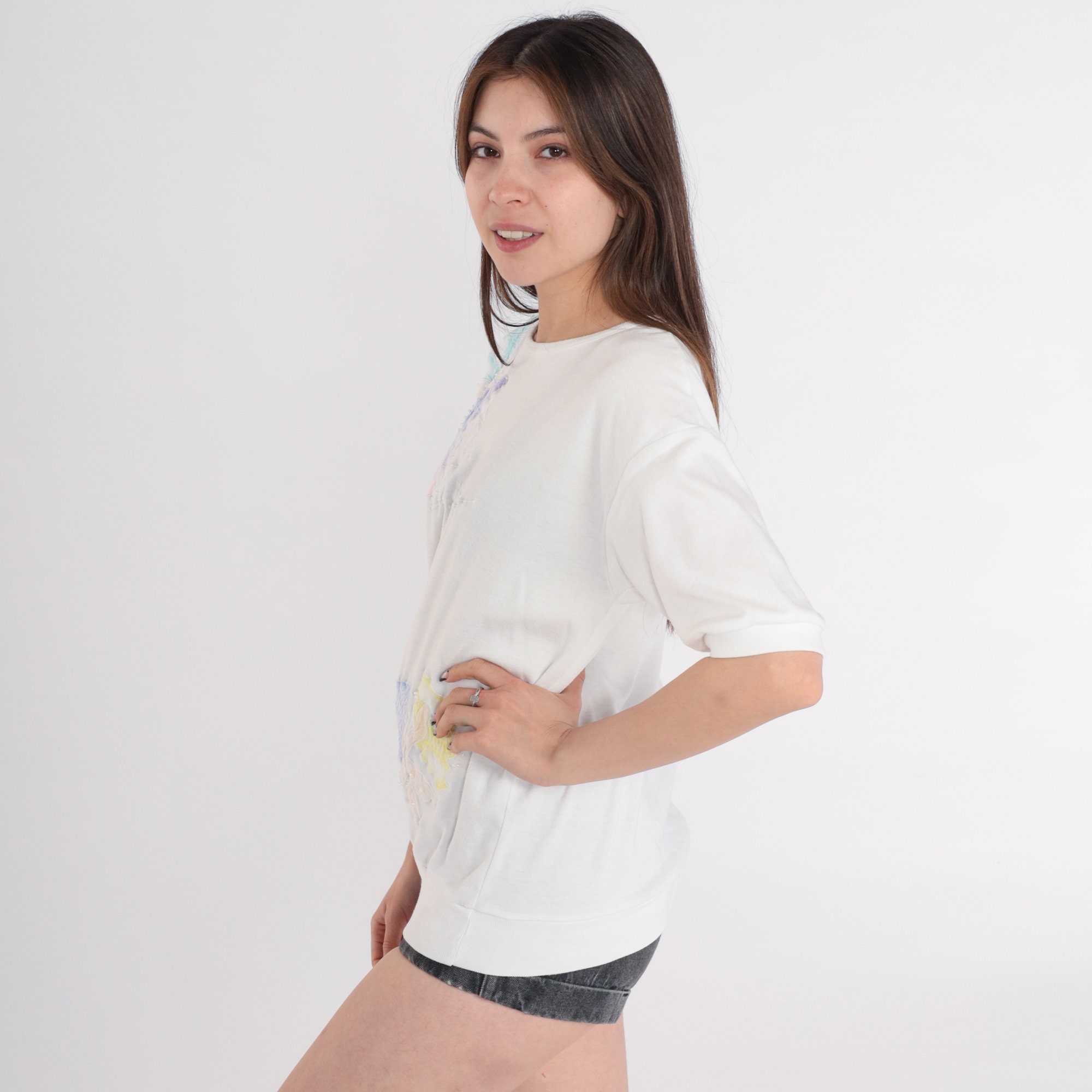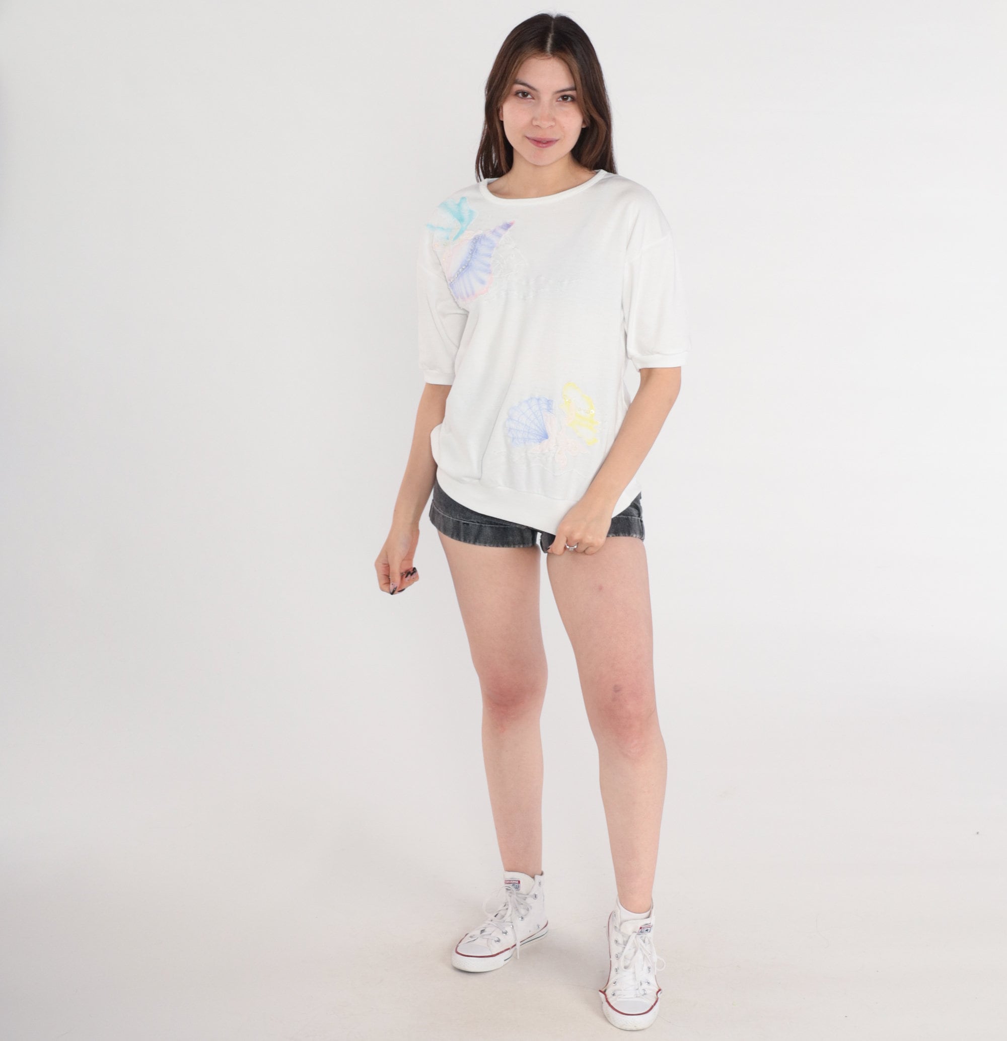Vintage 80s shirt in white with pastel seashells, an embroidered fish, and sequins. Short sleeves and a banded hem.