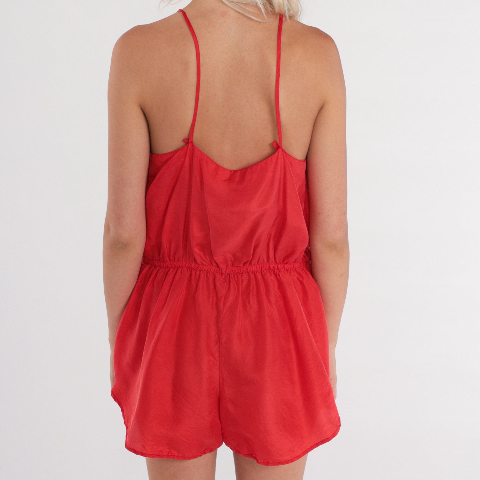 Vintage y2k lingerie teddy romper in red silk with spaghetti straps, a high waist, and dolphin cut shorts.