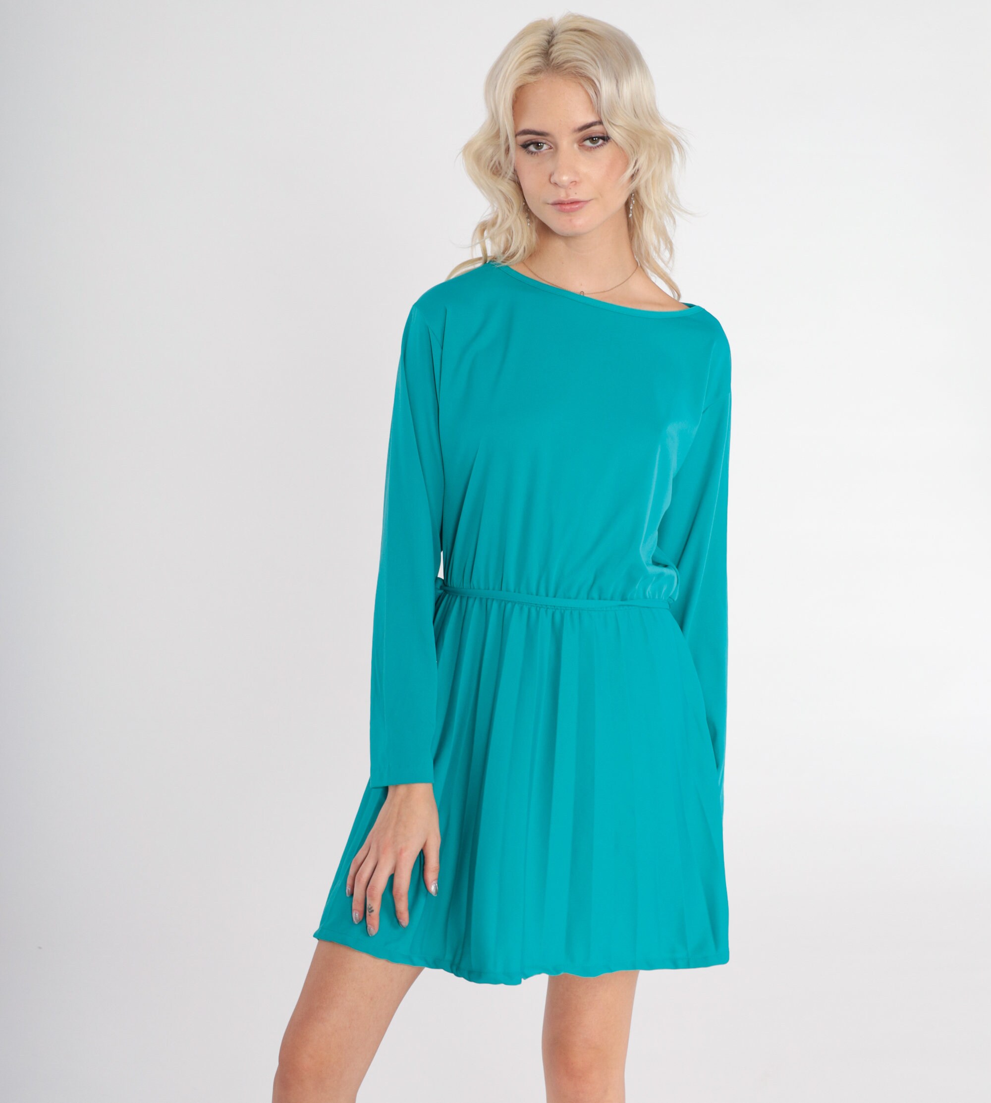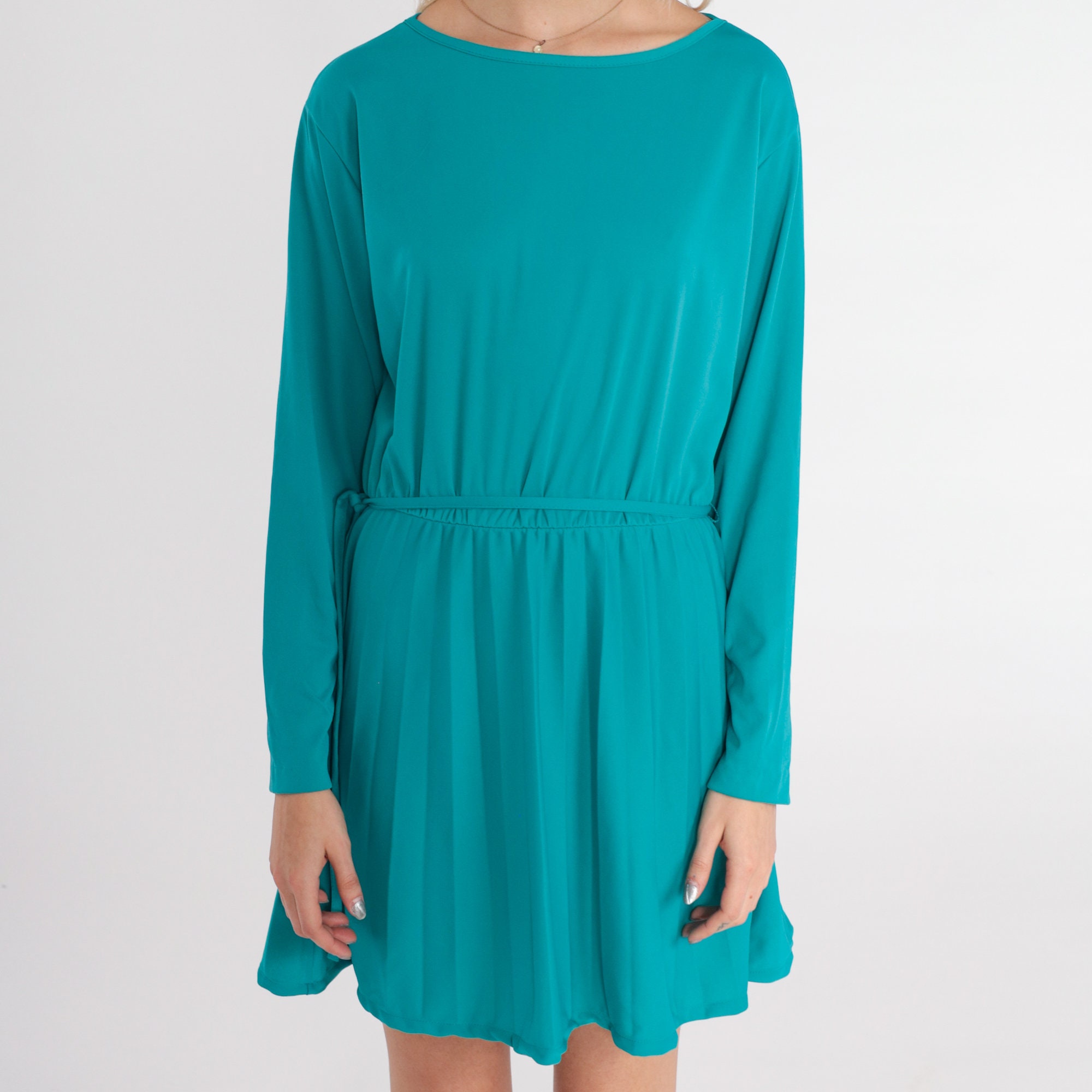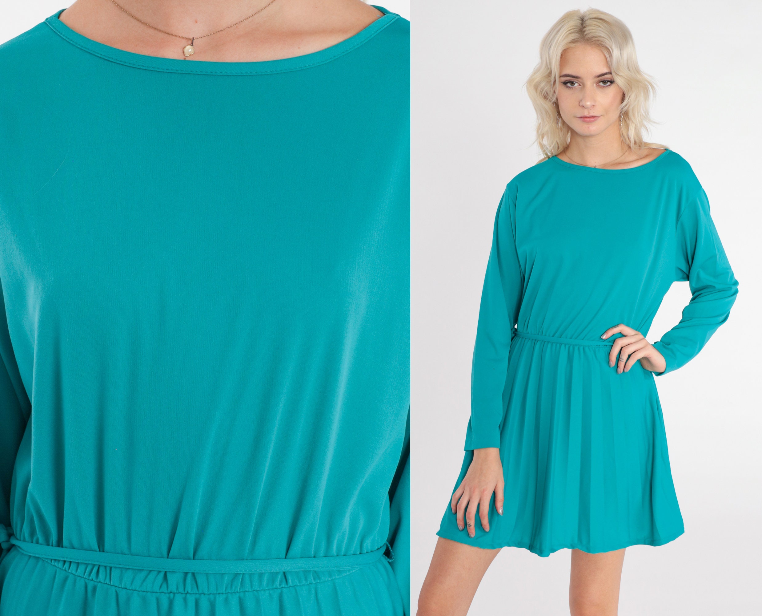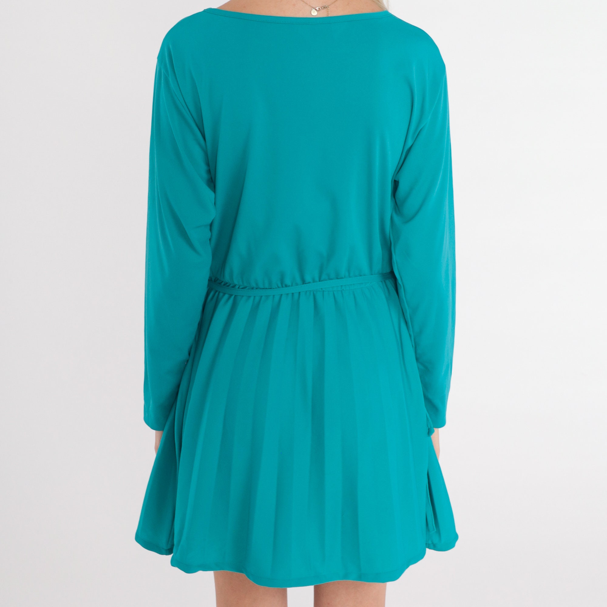 Vintage 80s dress in teal green with long sleeves, a high waist, and a pleated skirt. Mini length with a tie belt.