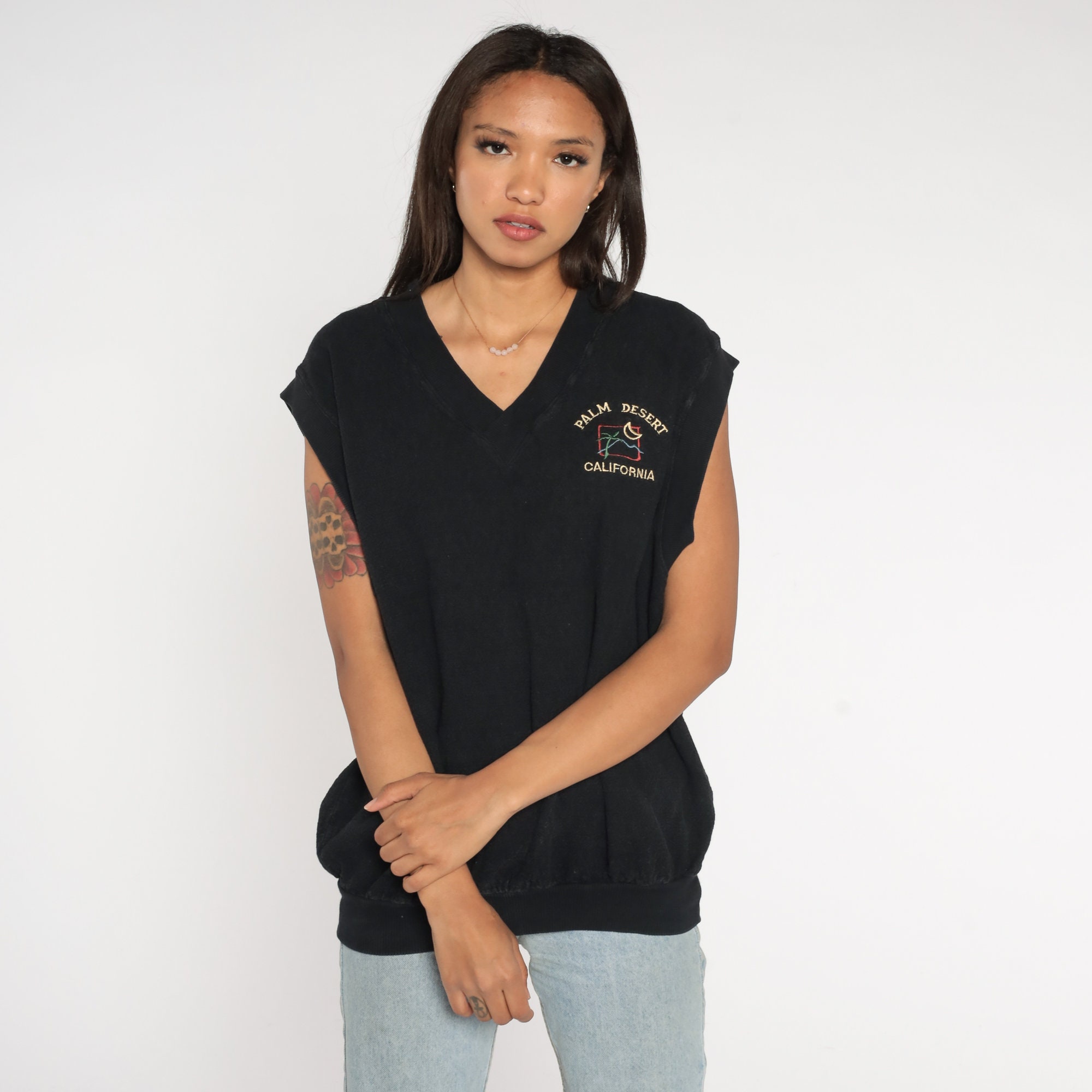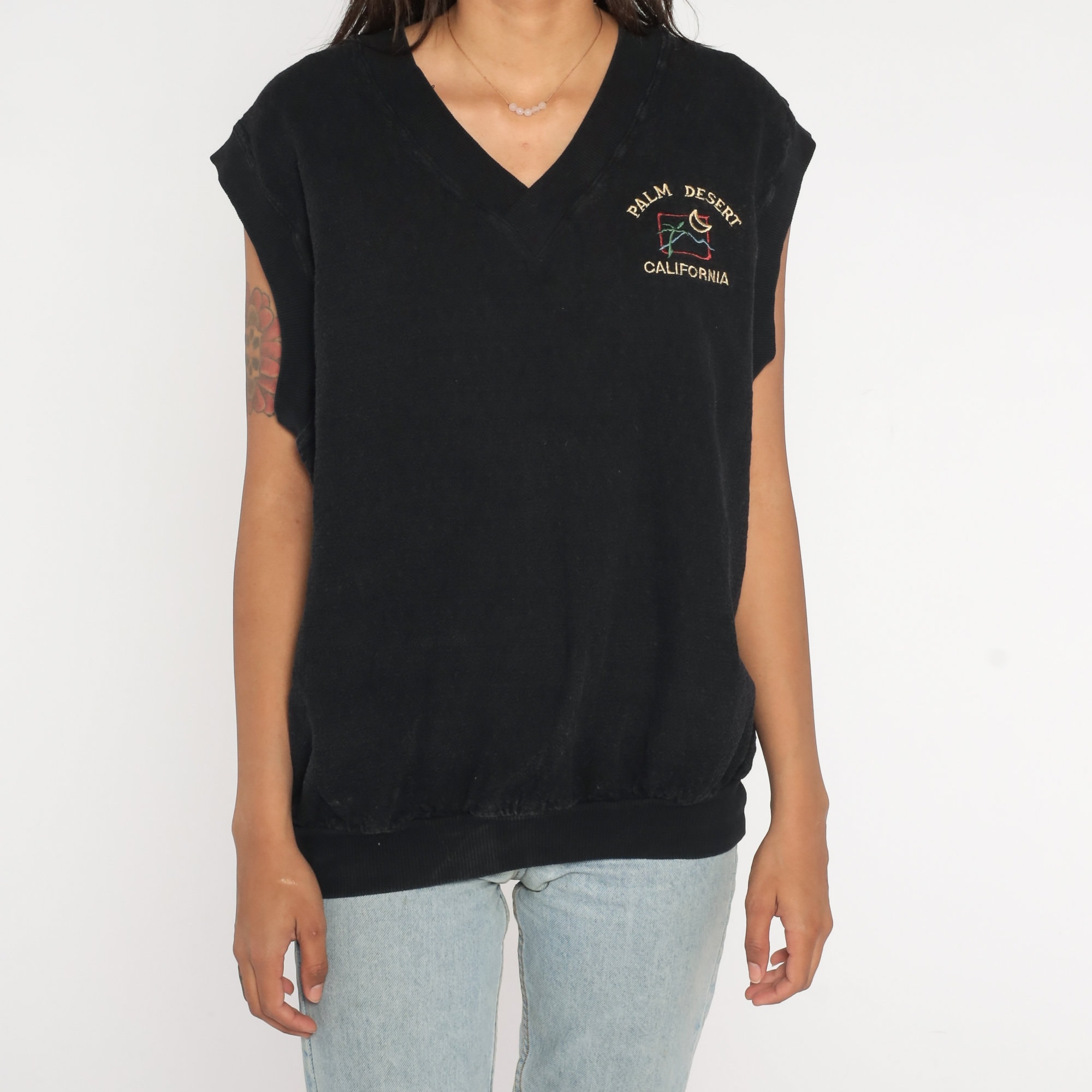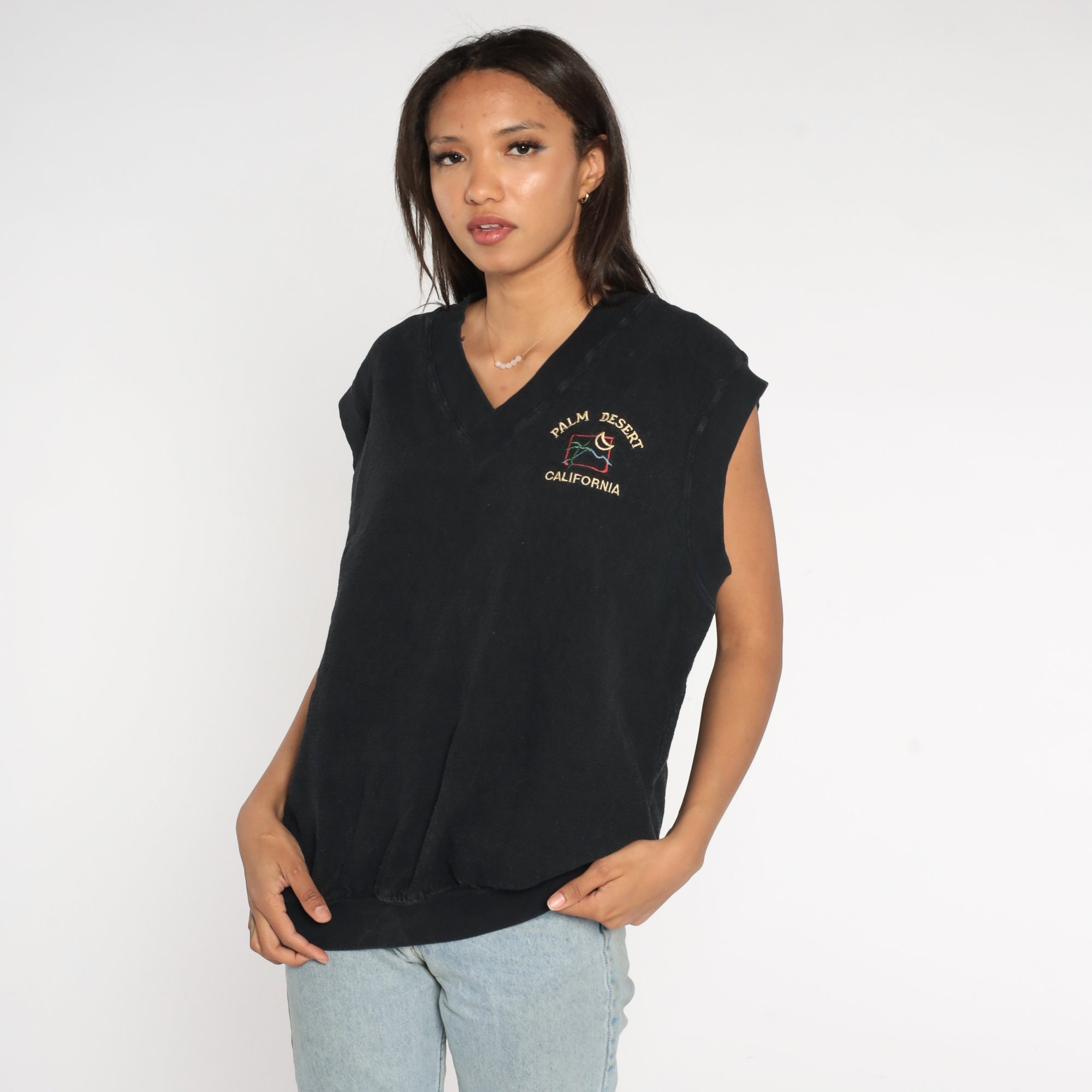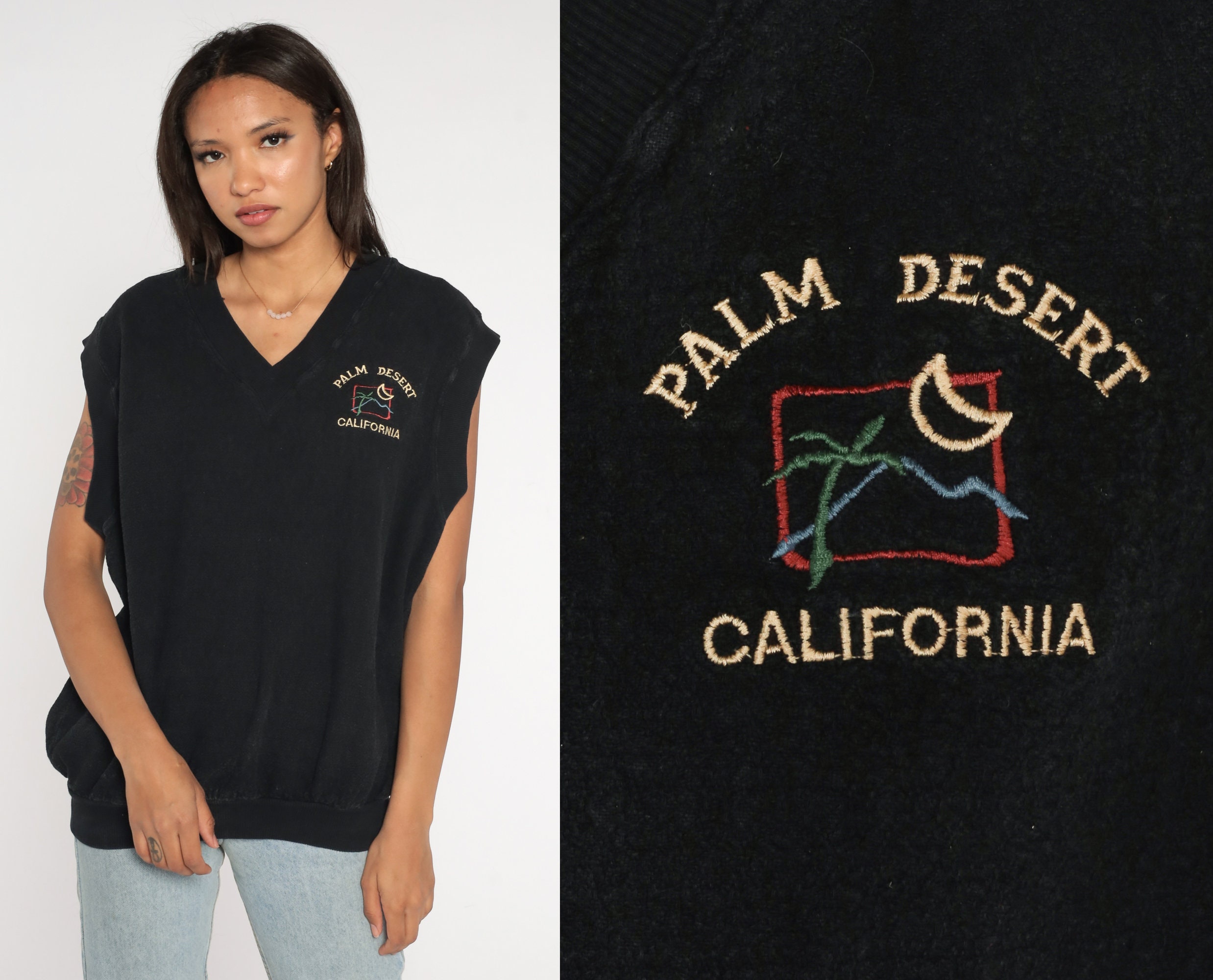 Vintage 80s vest in black with Palm Desert California embroidered on the chest.