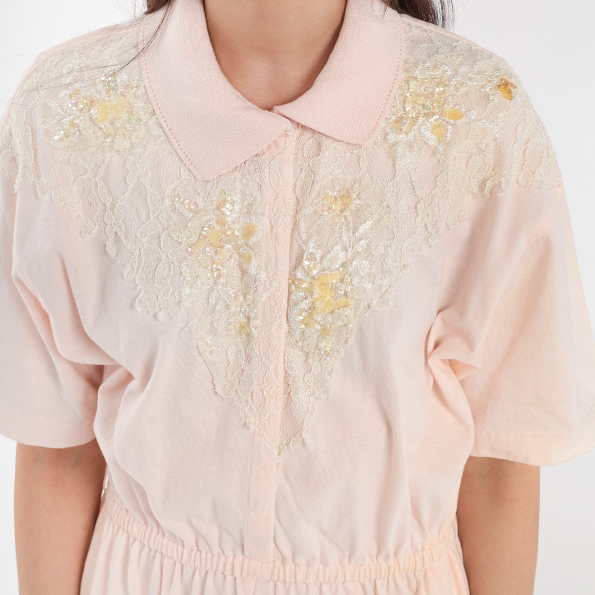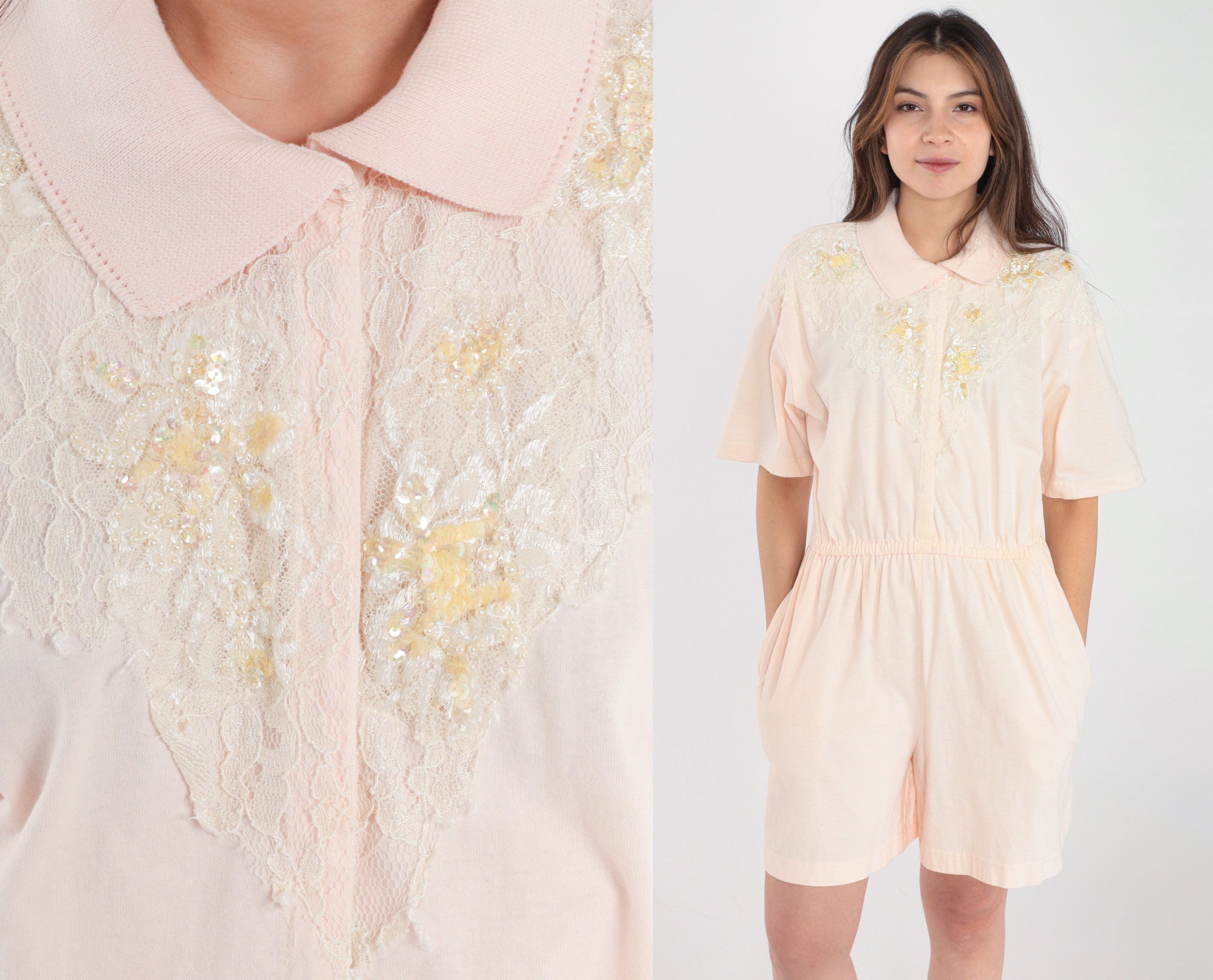 Vintage 80s romper in baby pink cotton with a lace yoke with beading and sequins. It has short sleeves, hidden buttons up the front and a high waist.