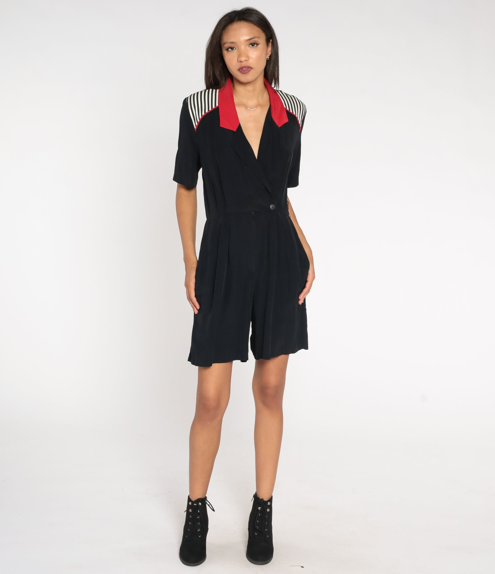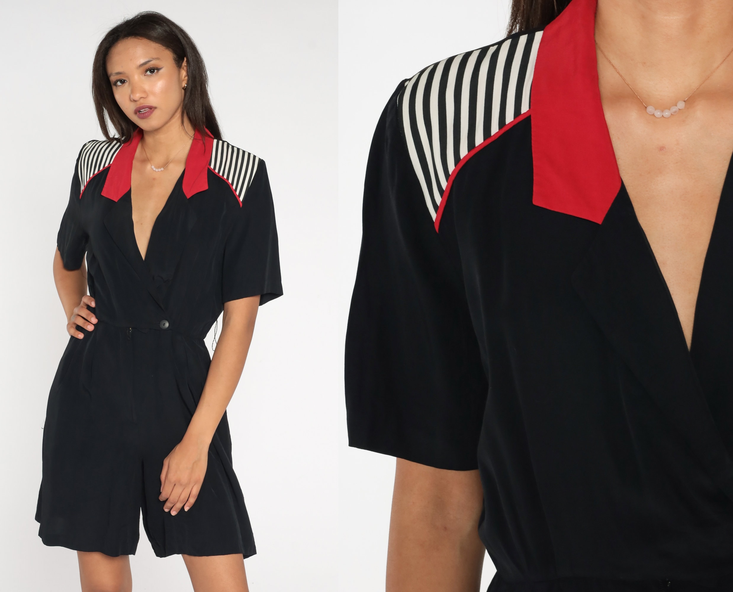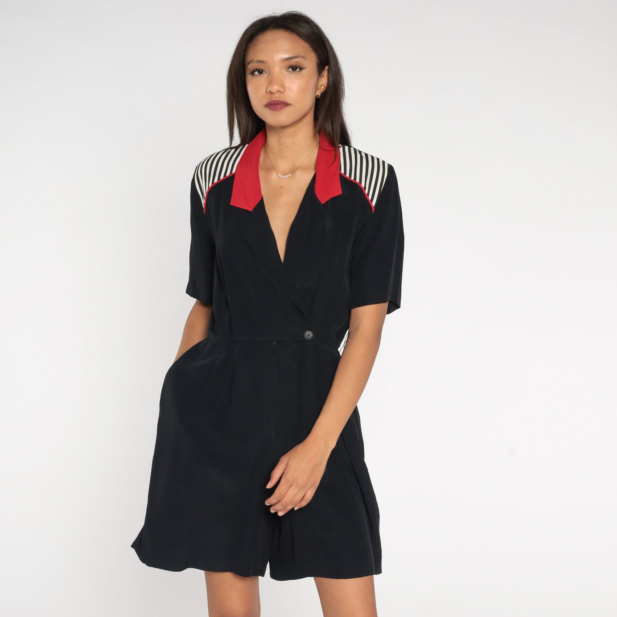 Vintage 90s romper in black with white stripes and red trim, a wrap cut and a v neck.