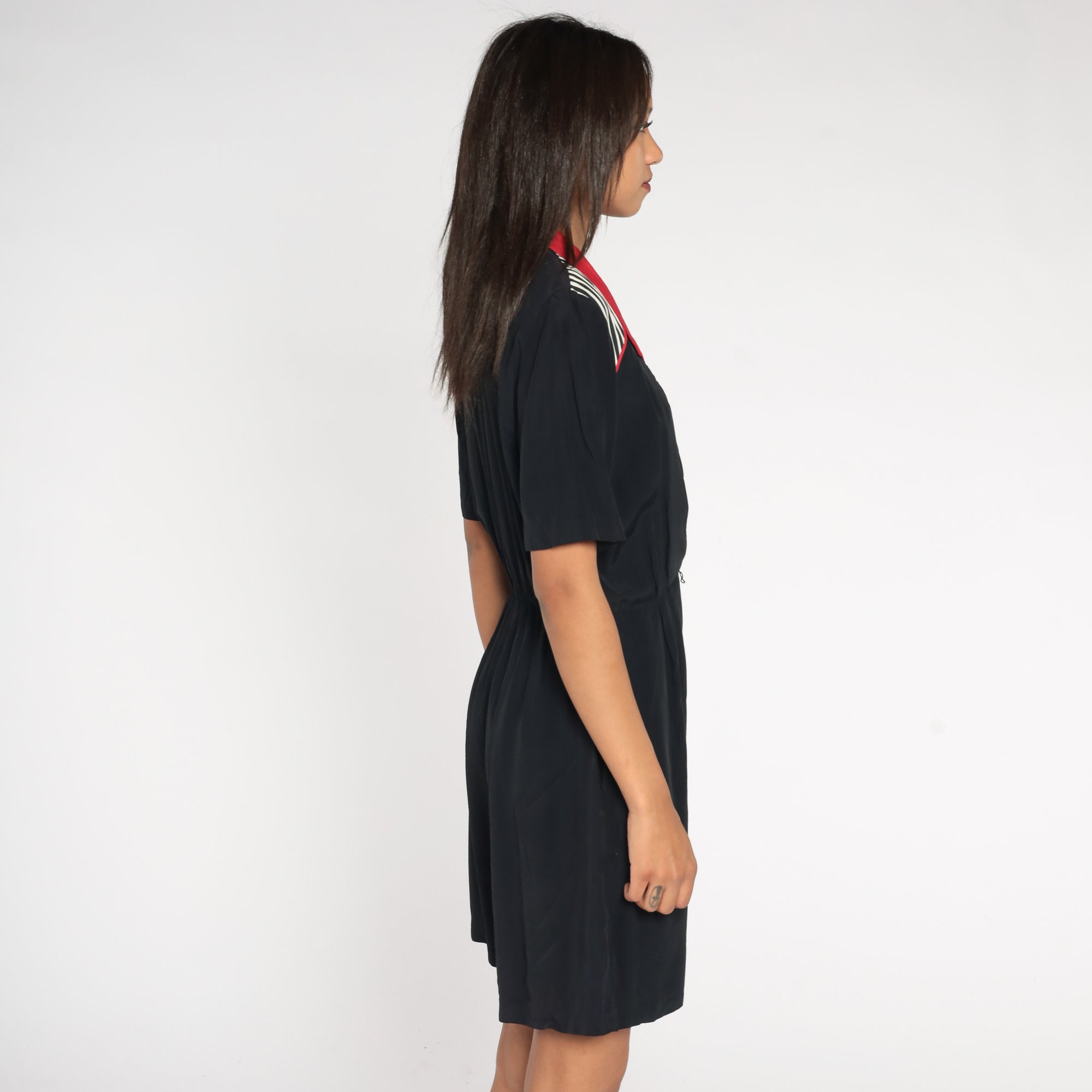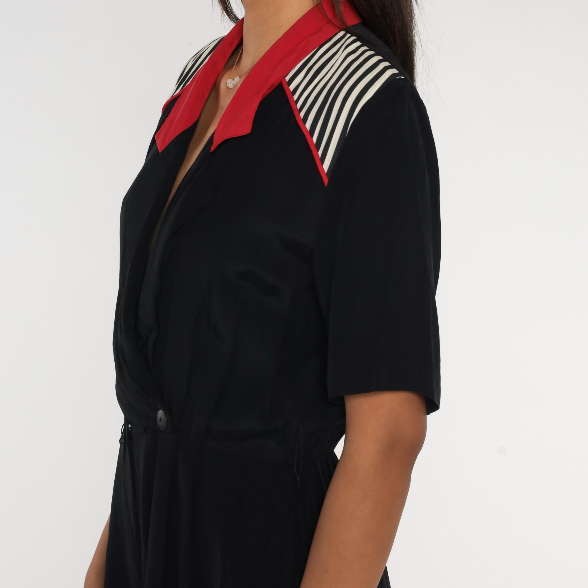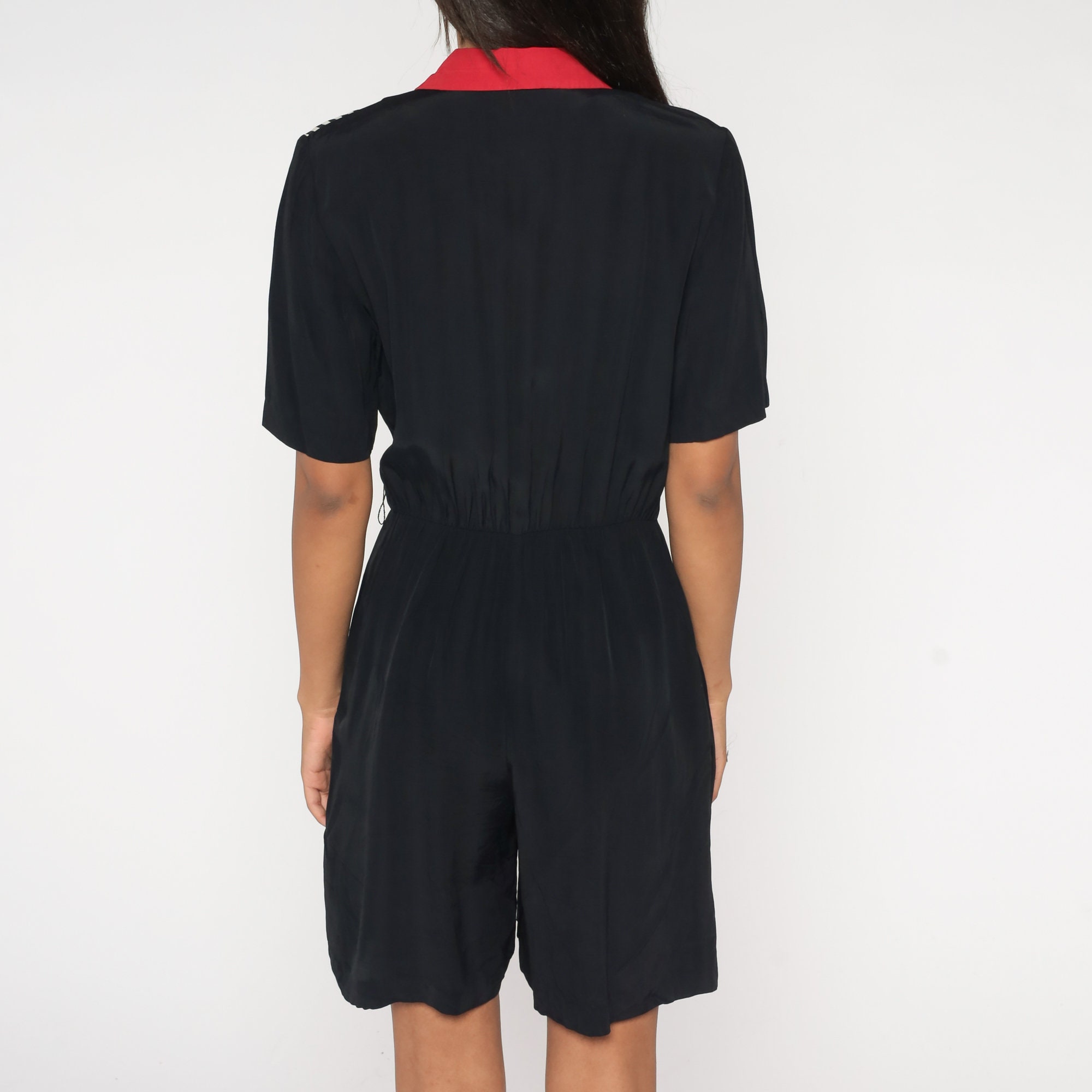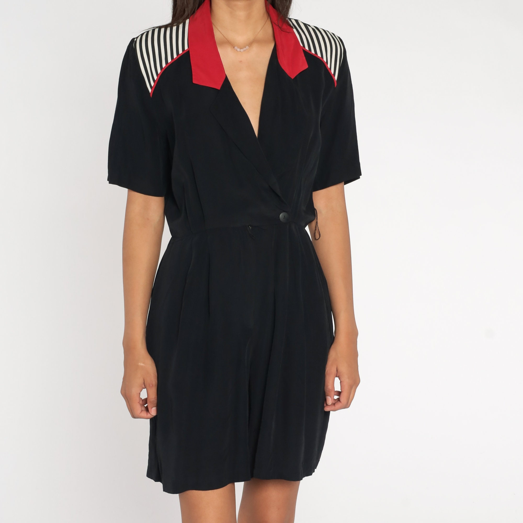 Vintage 90s romper in black with white stripes and red trim, a wrap cut and a v neck.