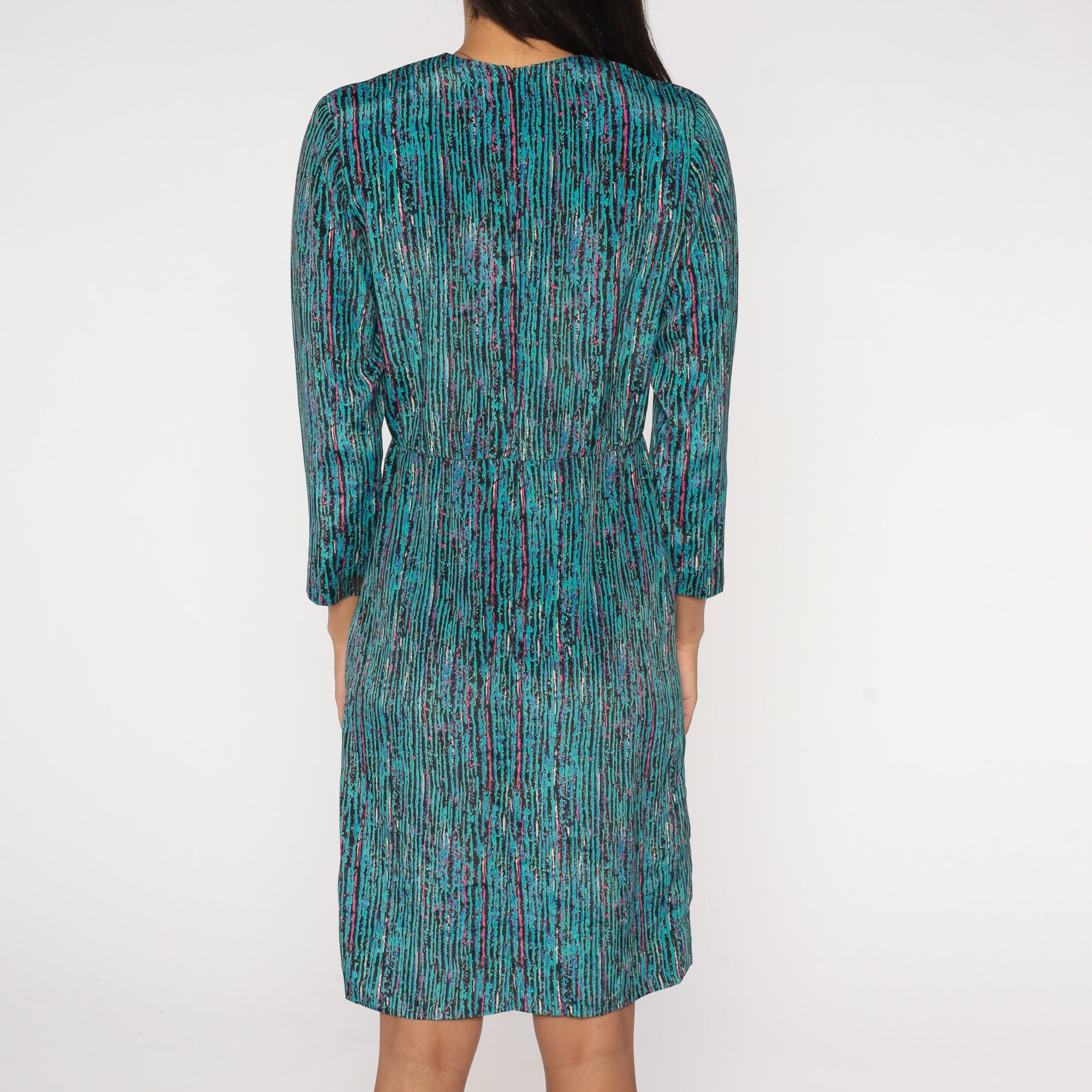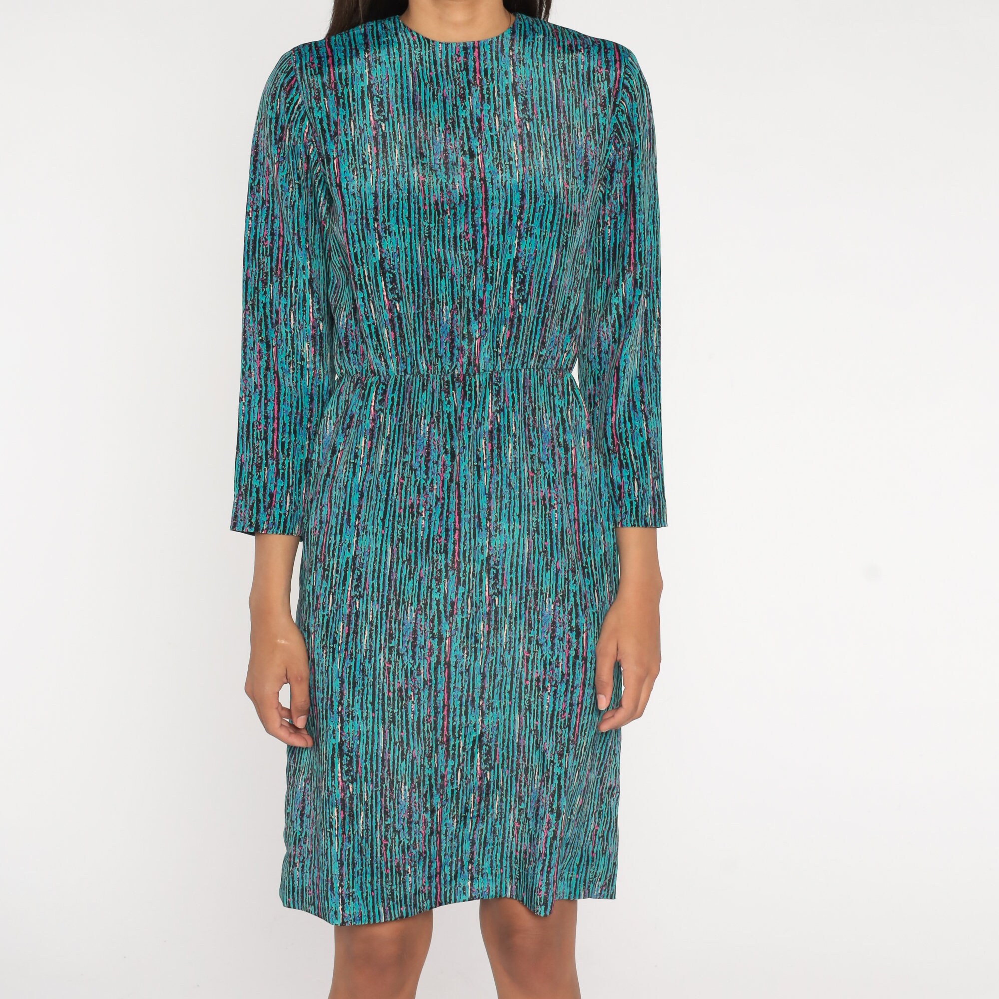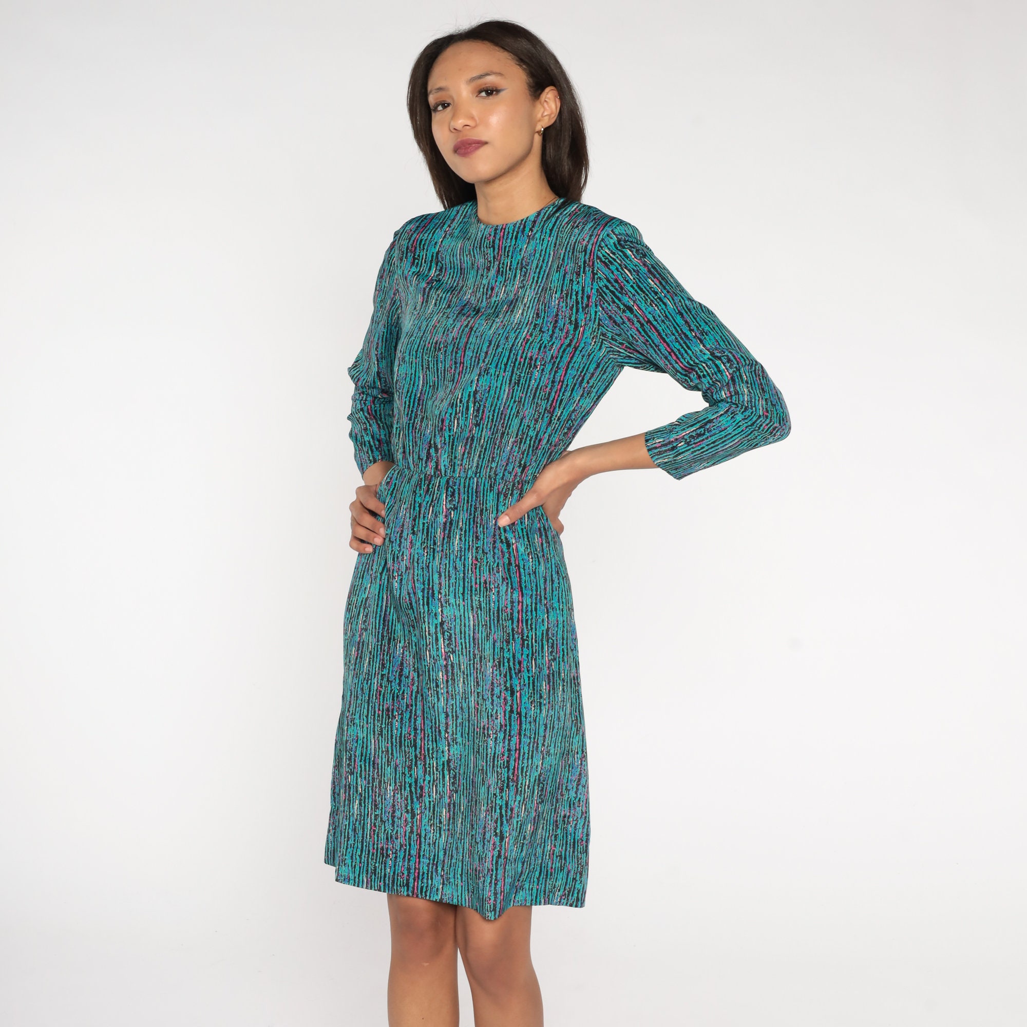 Vintage 80s dress in turquoise, black, pink and blue stripes with long sleeves and a high waist. Midi length.