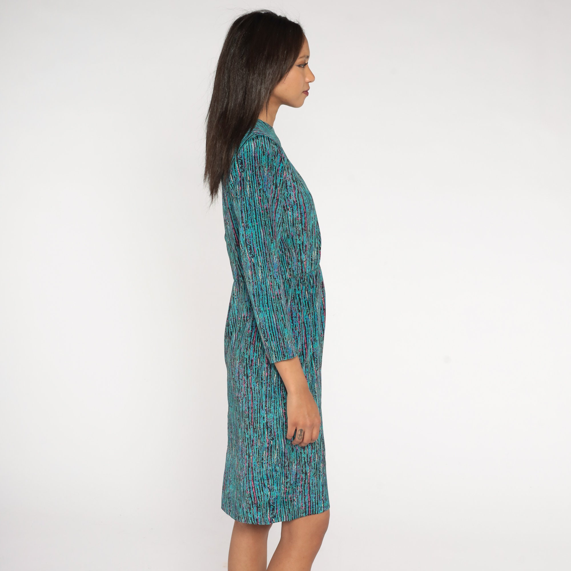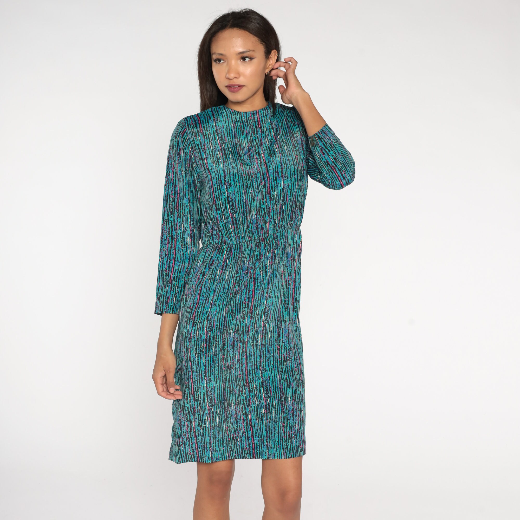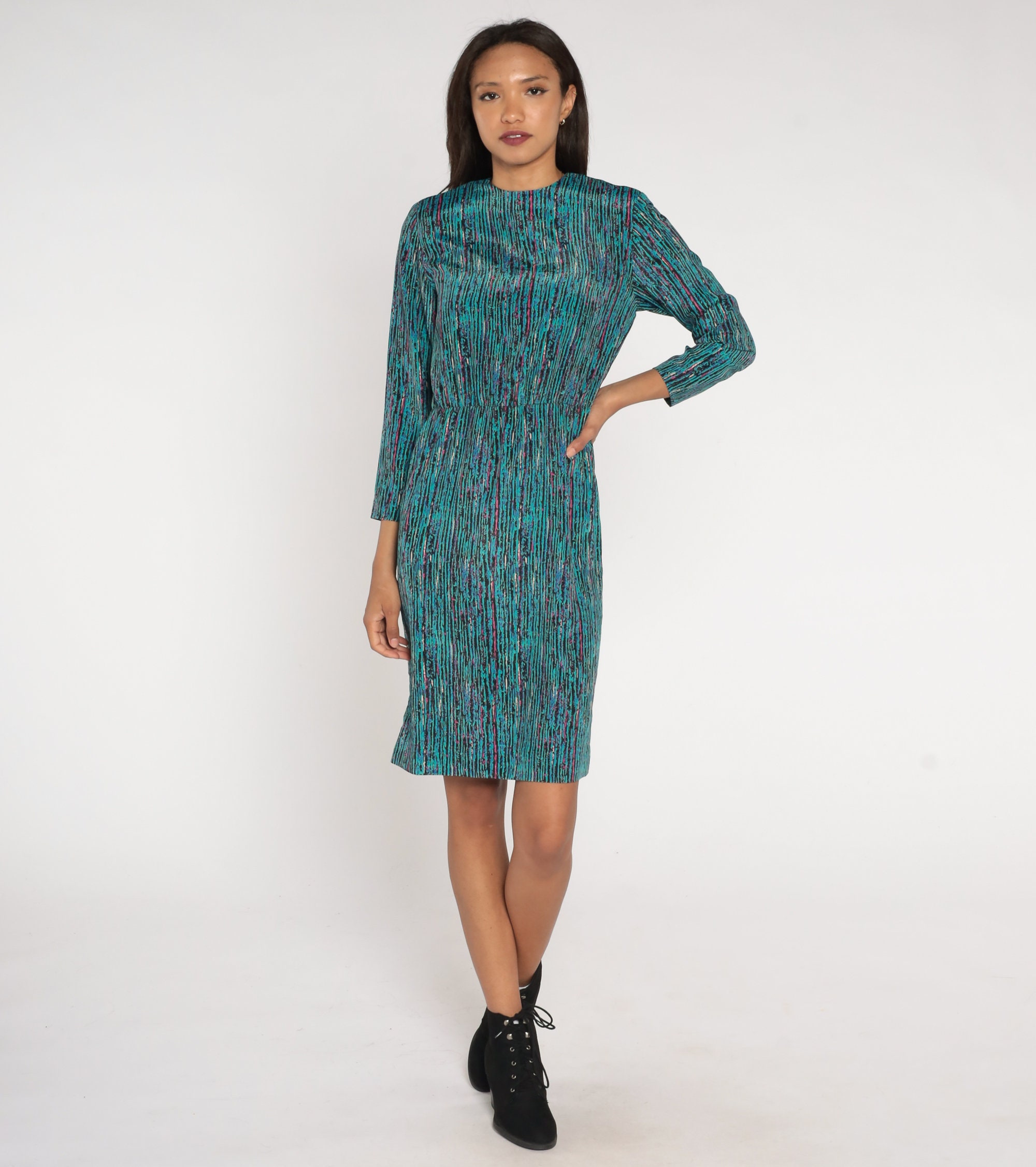 Vintage 80s dress in turquoise, black, pink and blue stripes with long sleeves and a high waist. Midi length.