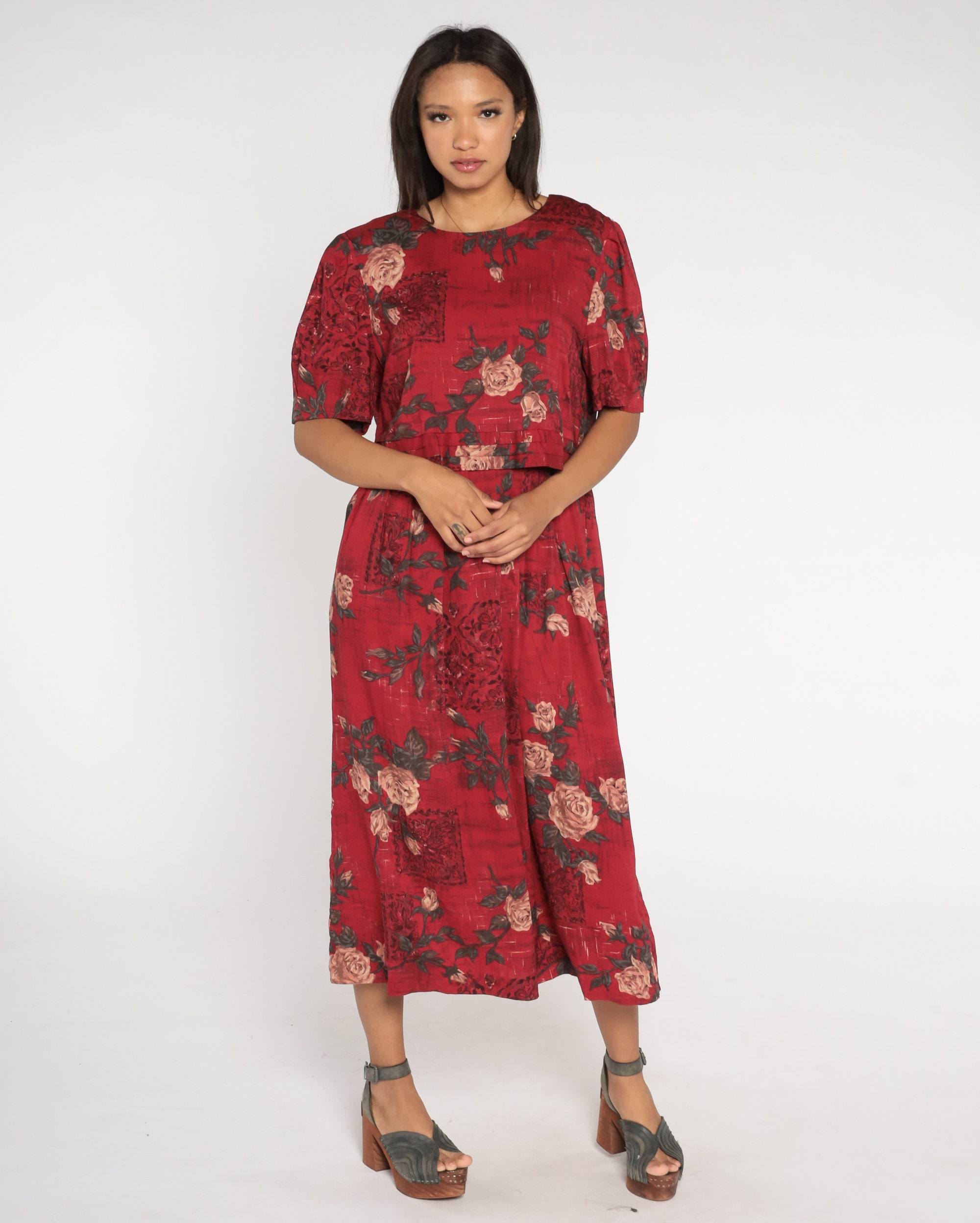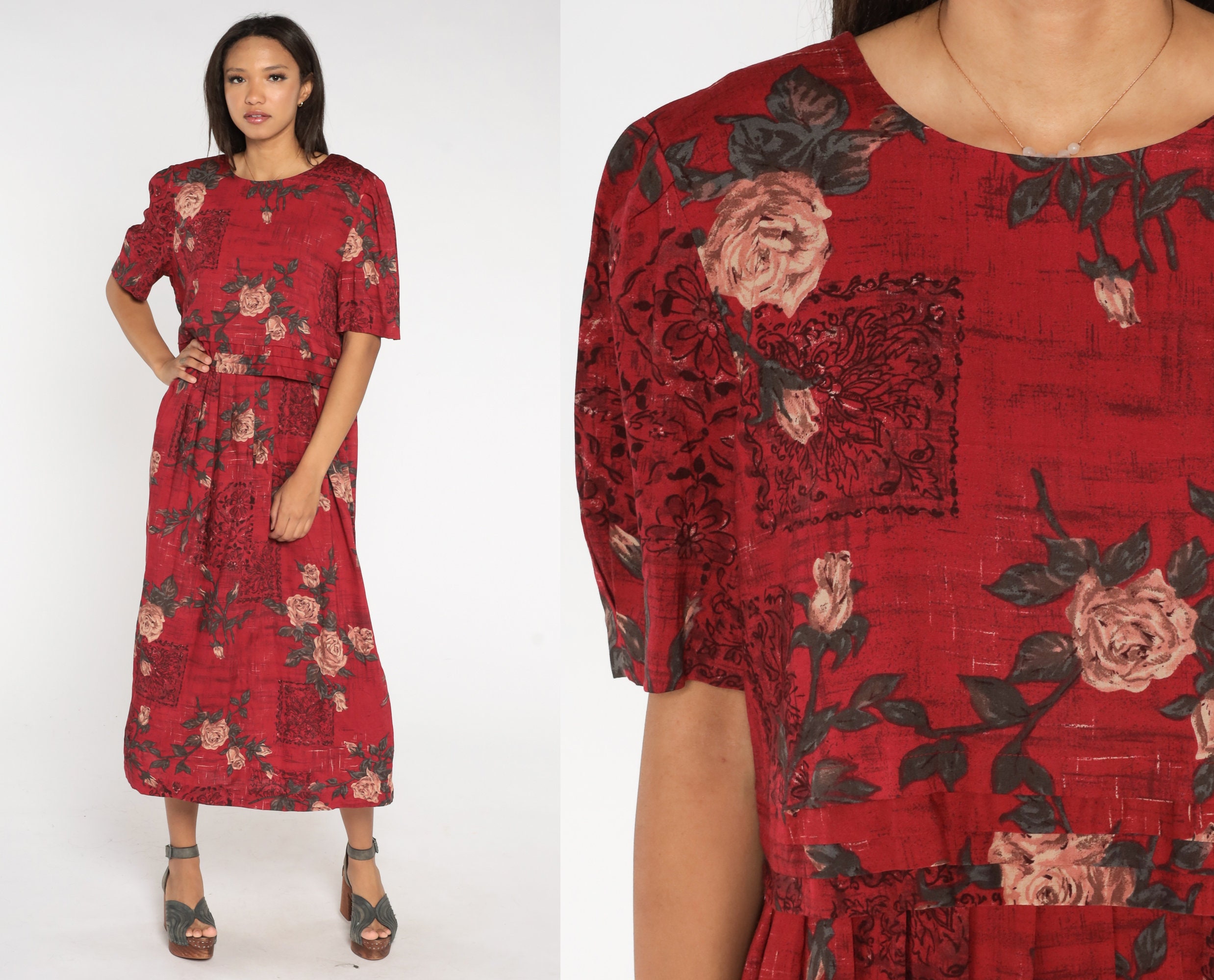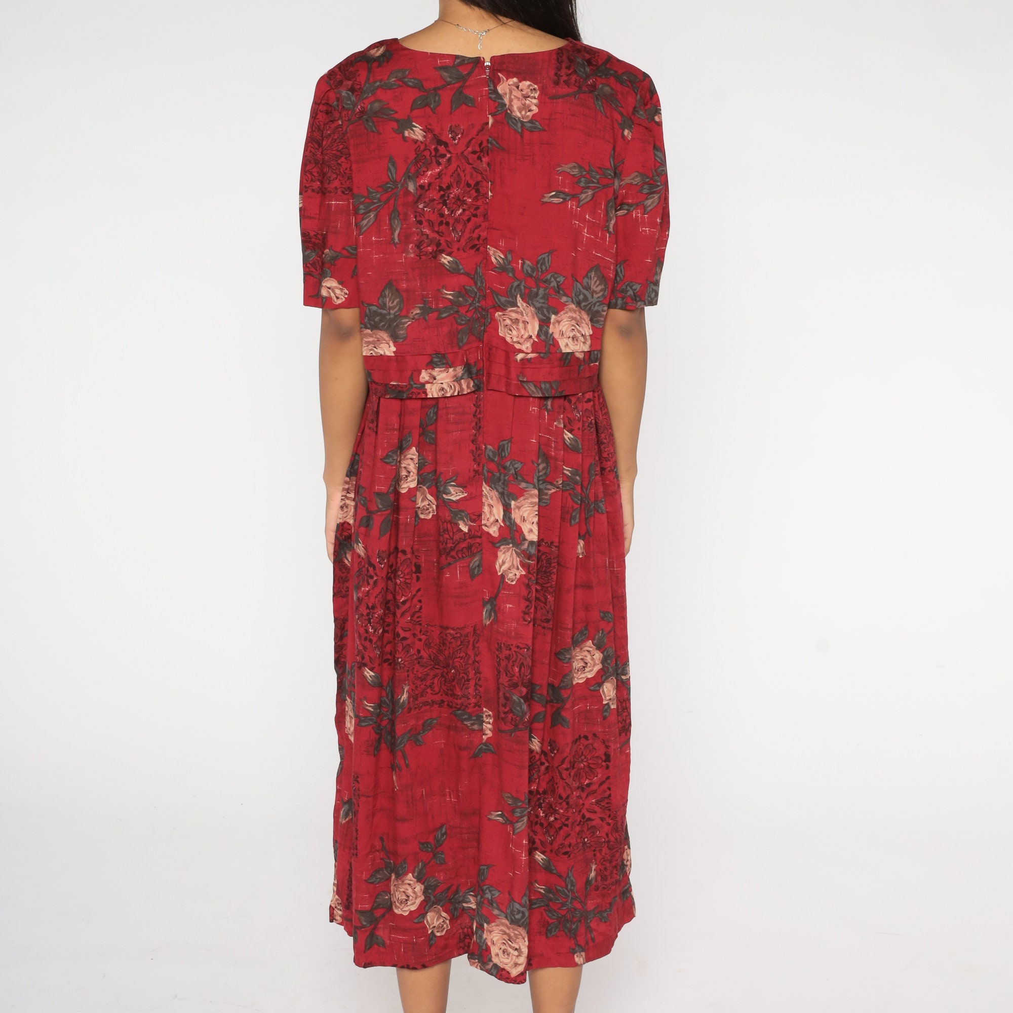 Vintage 90s dress in dark red with a floral print and short sleeves.