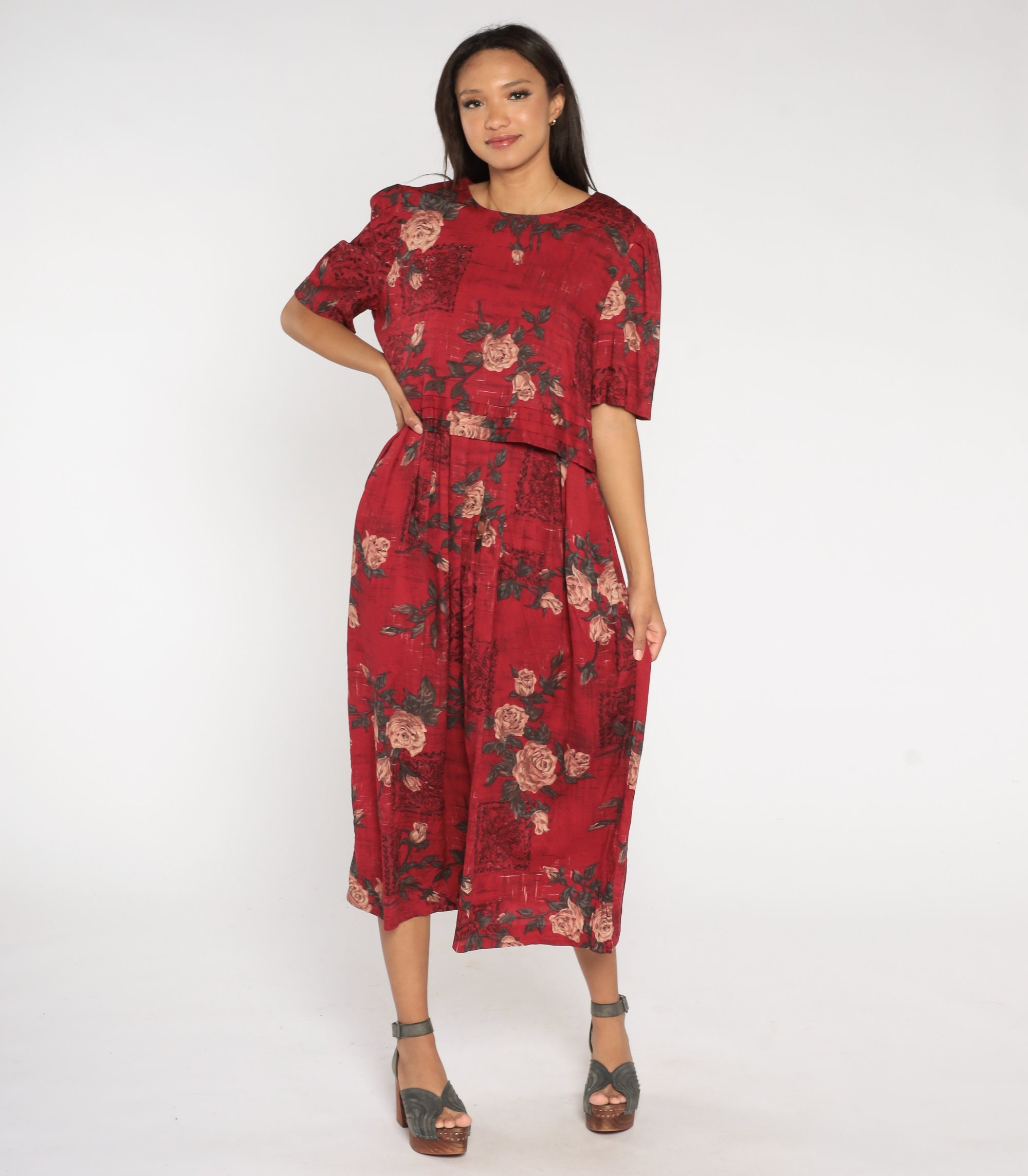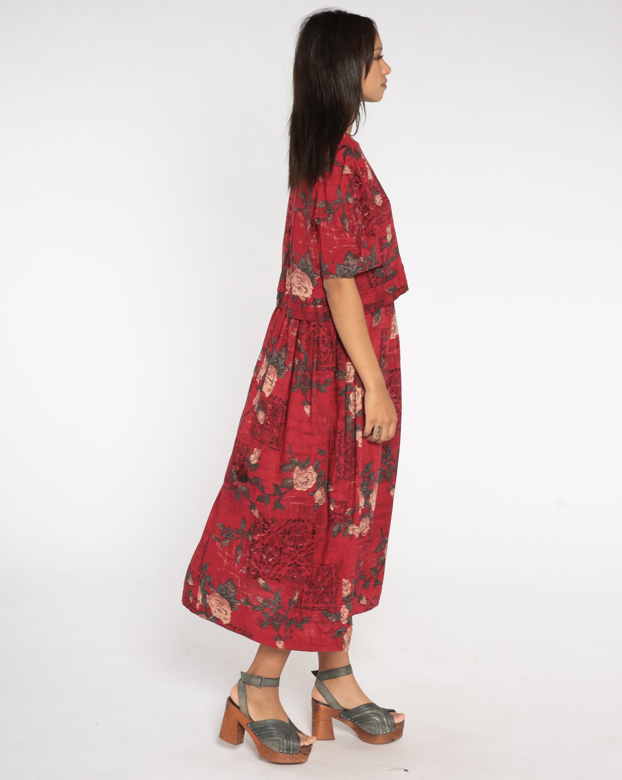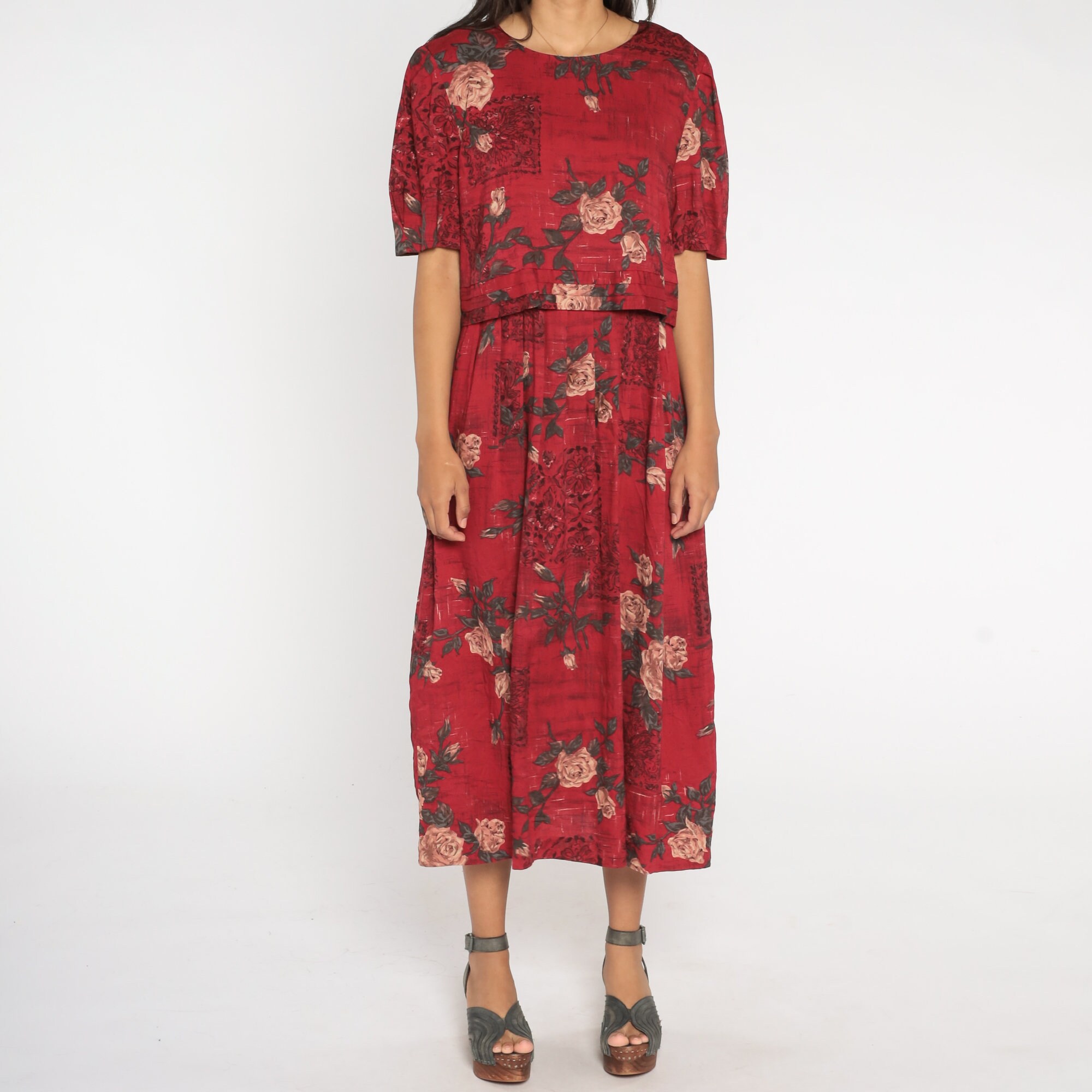 Vintage 90s dress in dark red with a floral print and short sleeves.