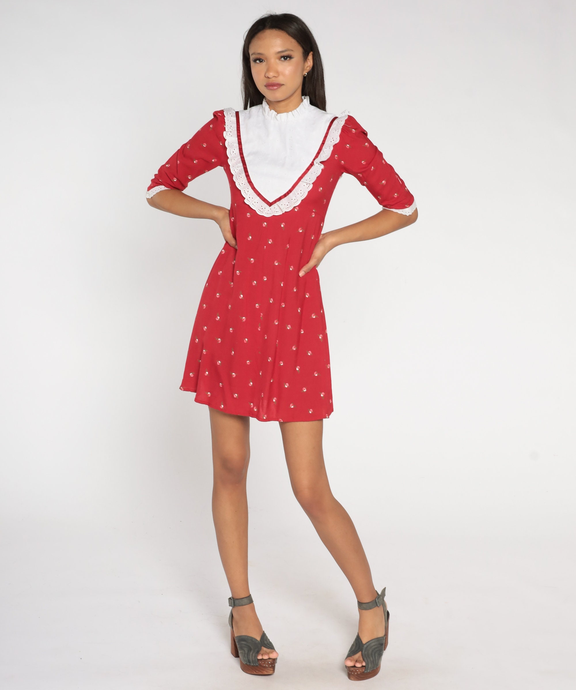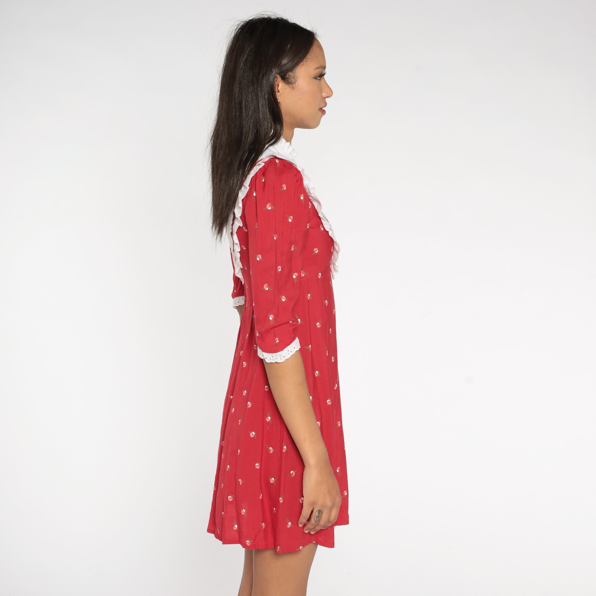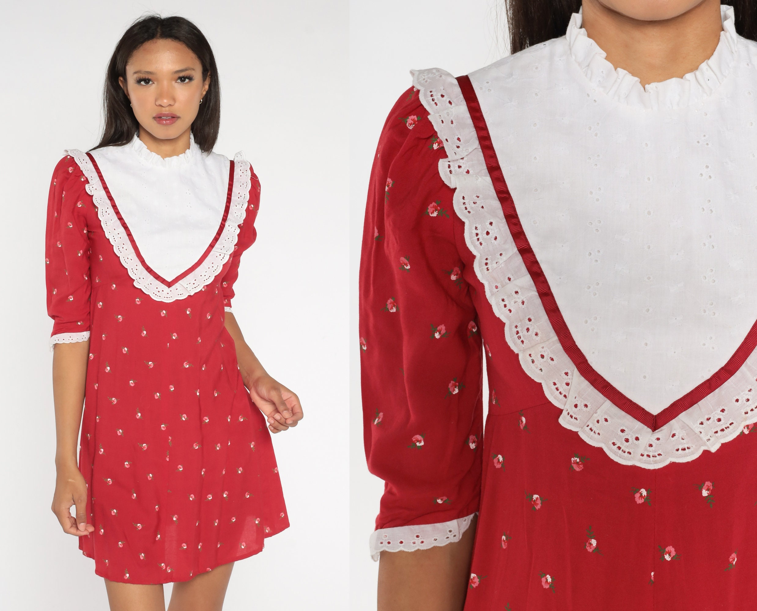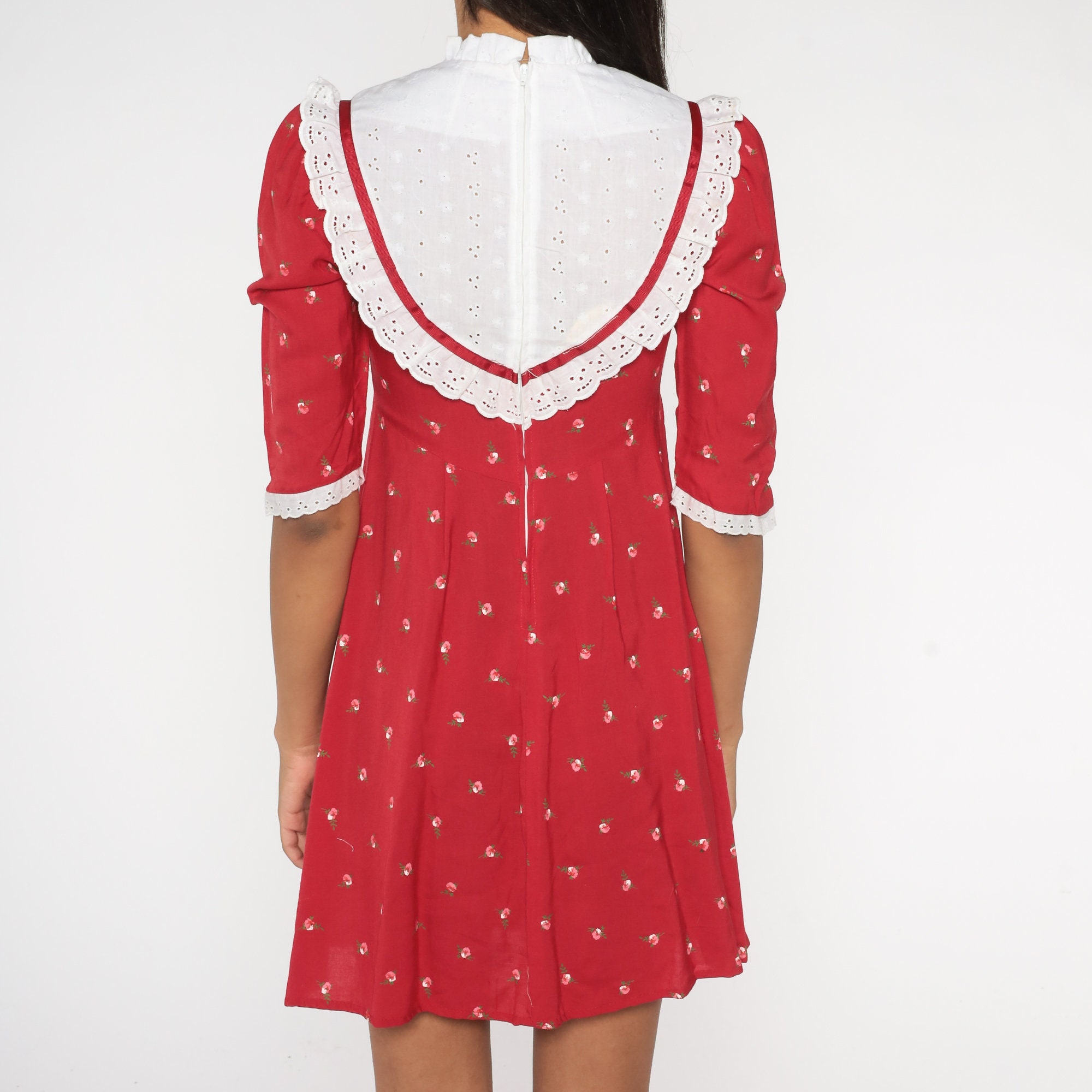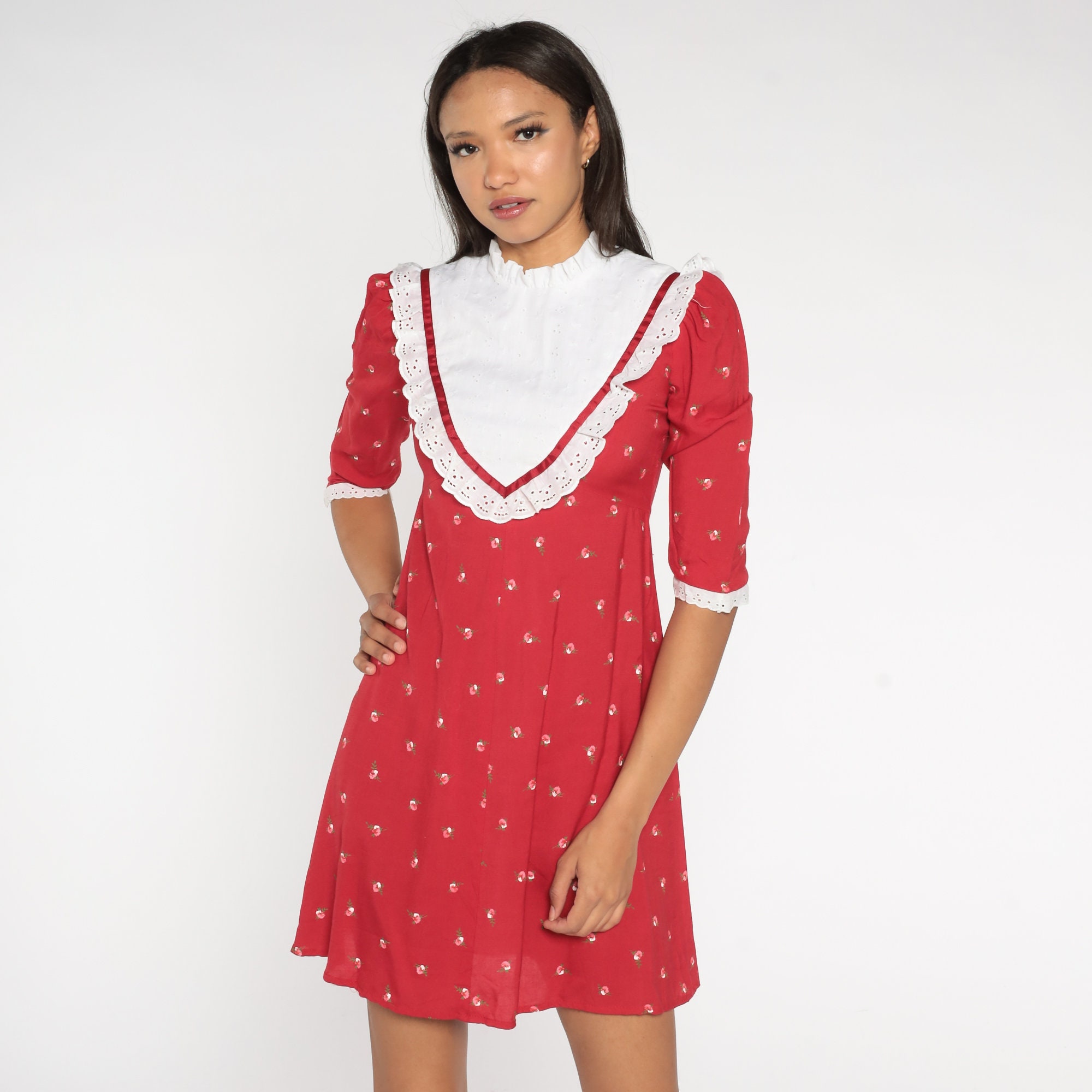 Vintage 90s dress in red with a floral print, an eyelet lace bib, a fitted bodice and an empire waist. Mini length with puff sleeves and a rear zipper.