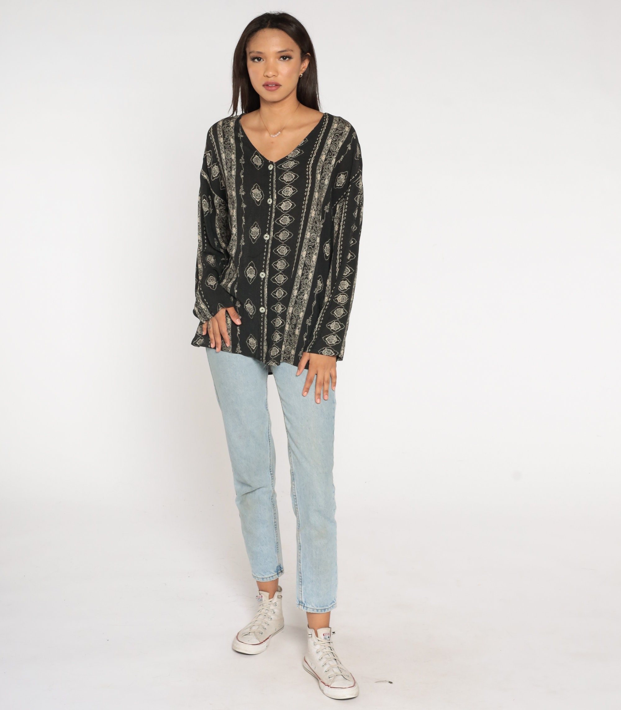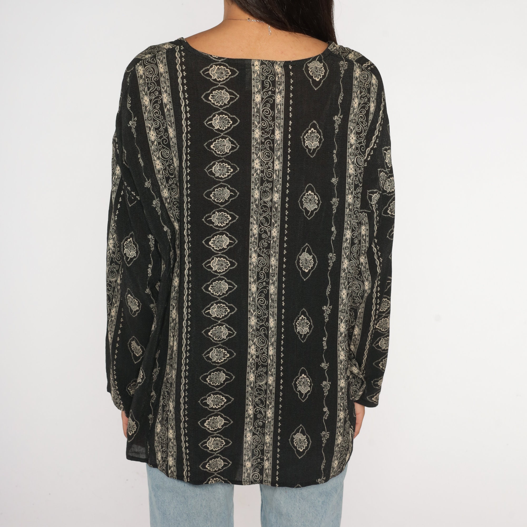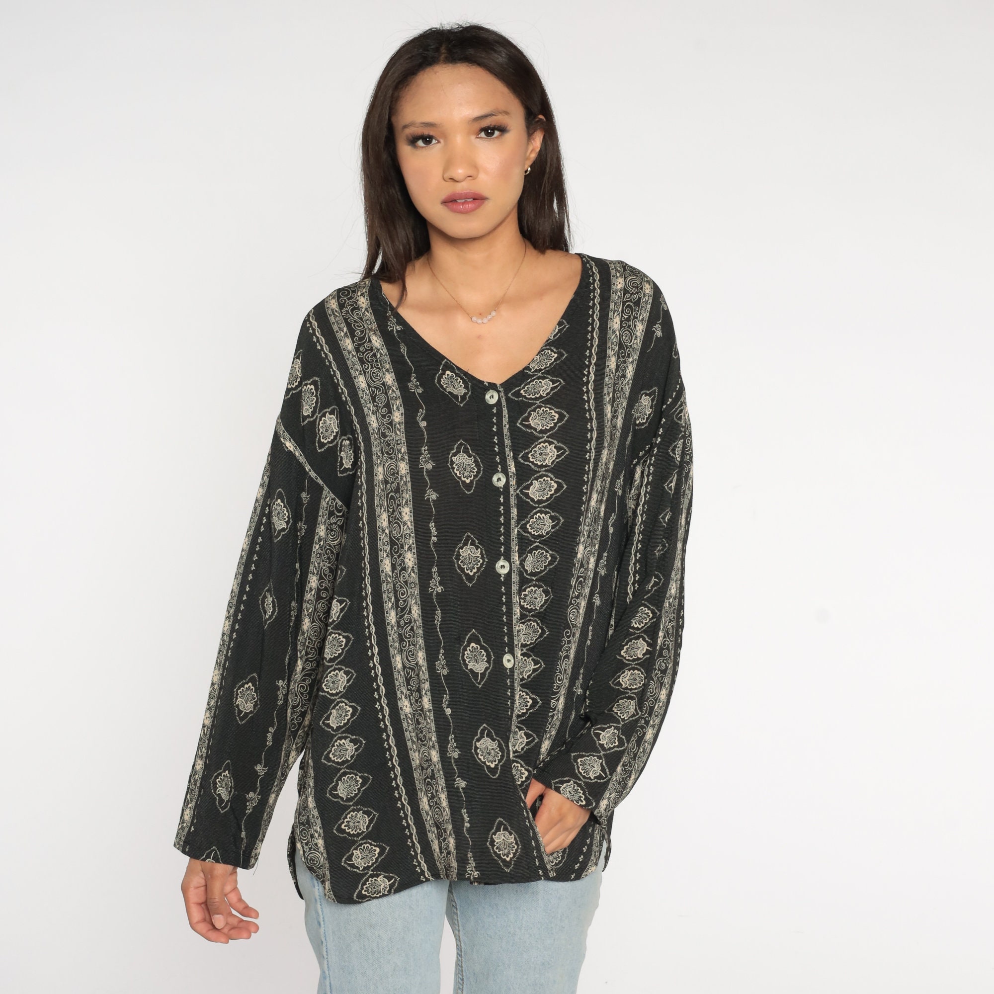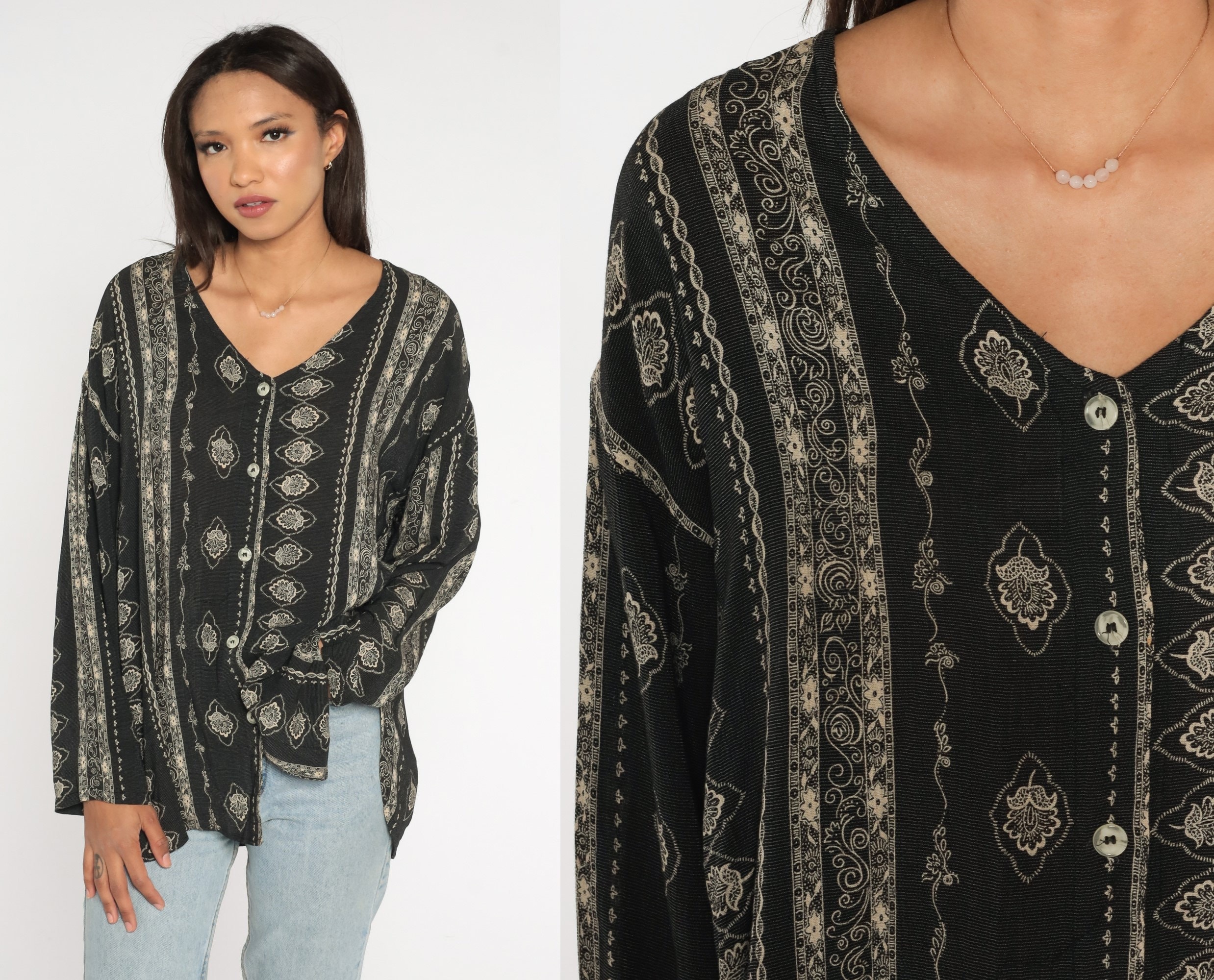 Vintage 90s blouse in black with a striped floral print. Buttons up the front with long sleeves.