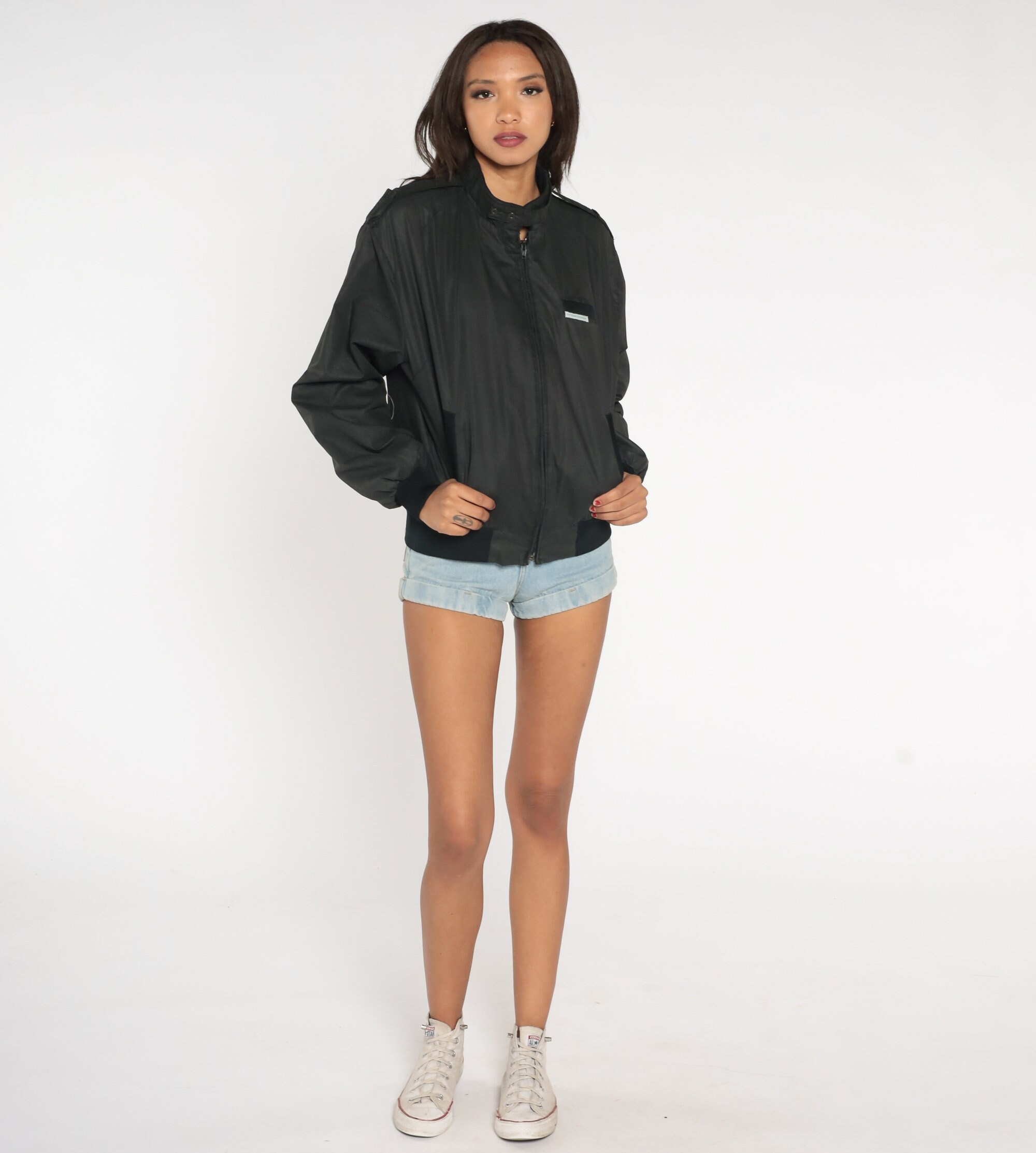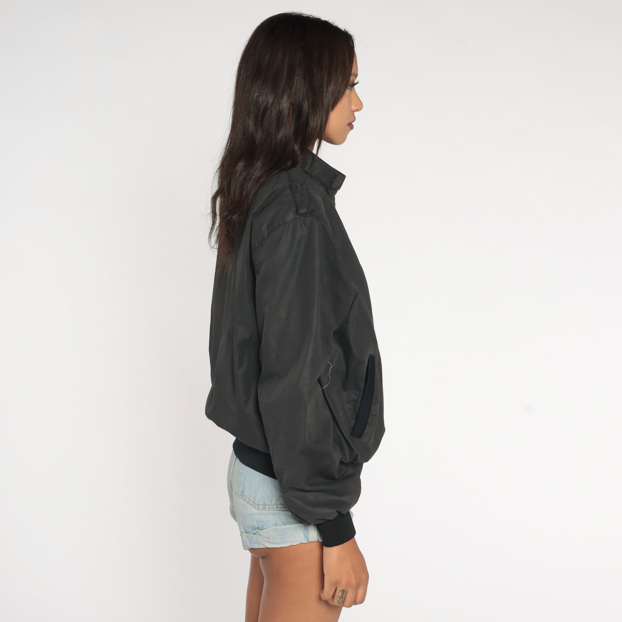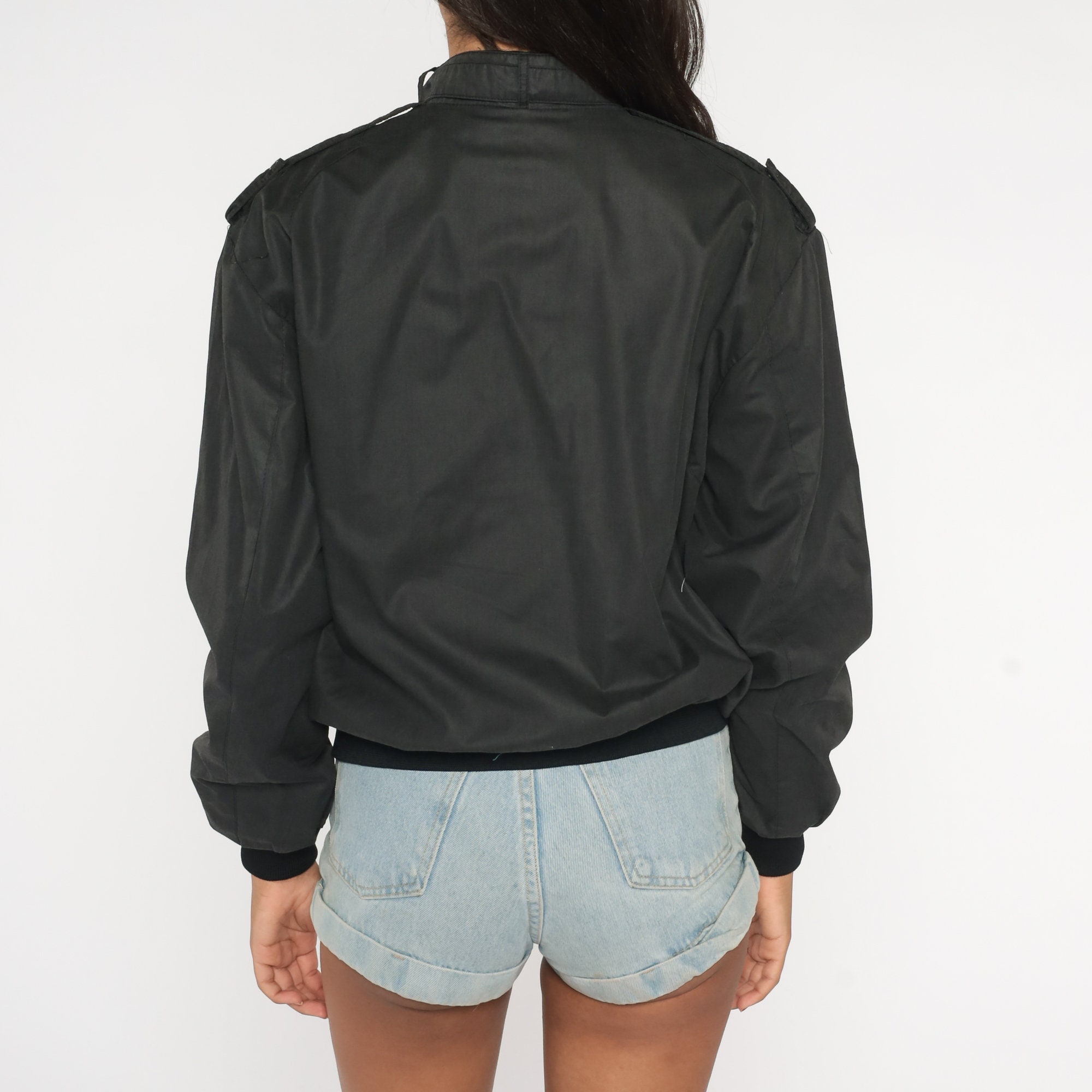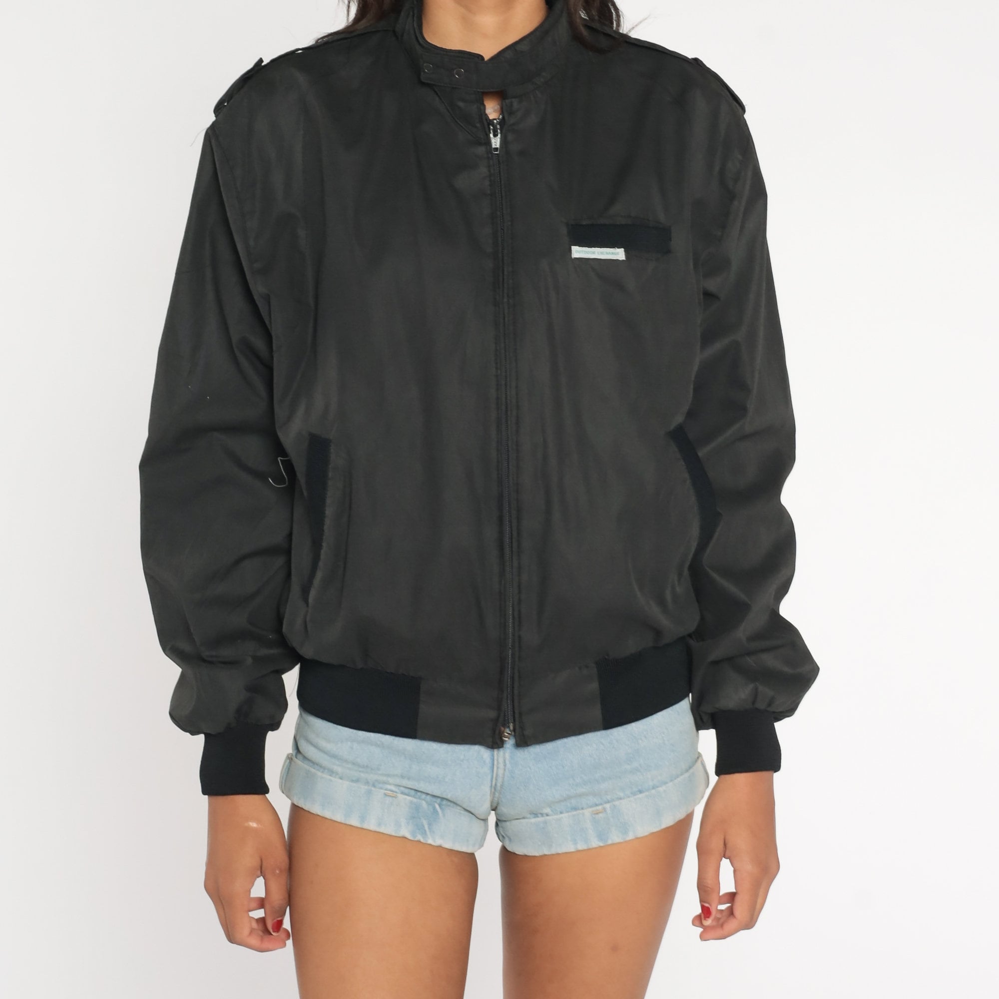Vintage 80s jacket in black with an Outdoor Exchange patch on the chest and a zipper up the front.