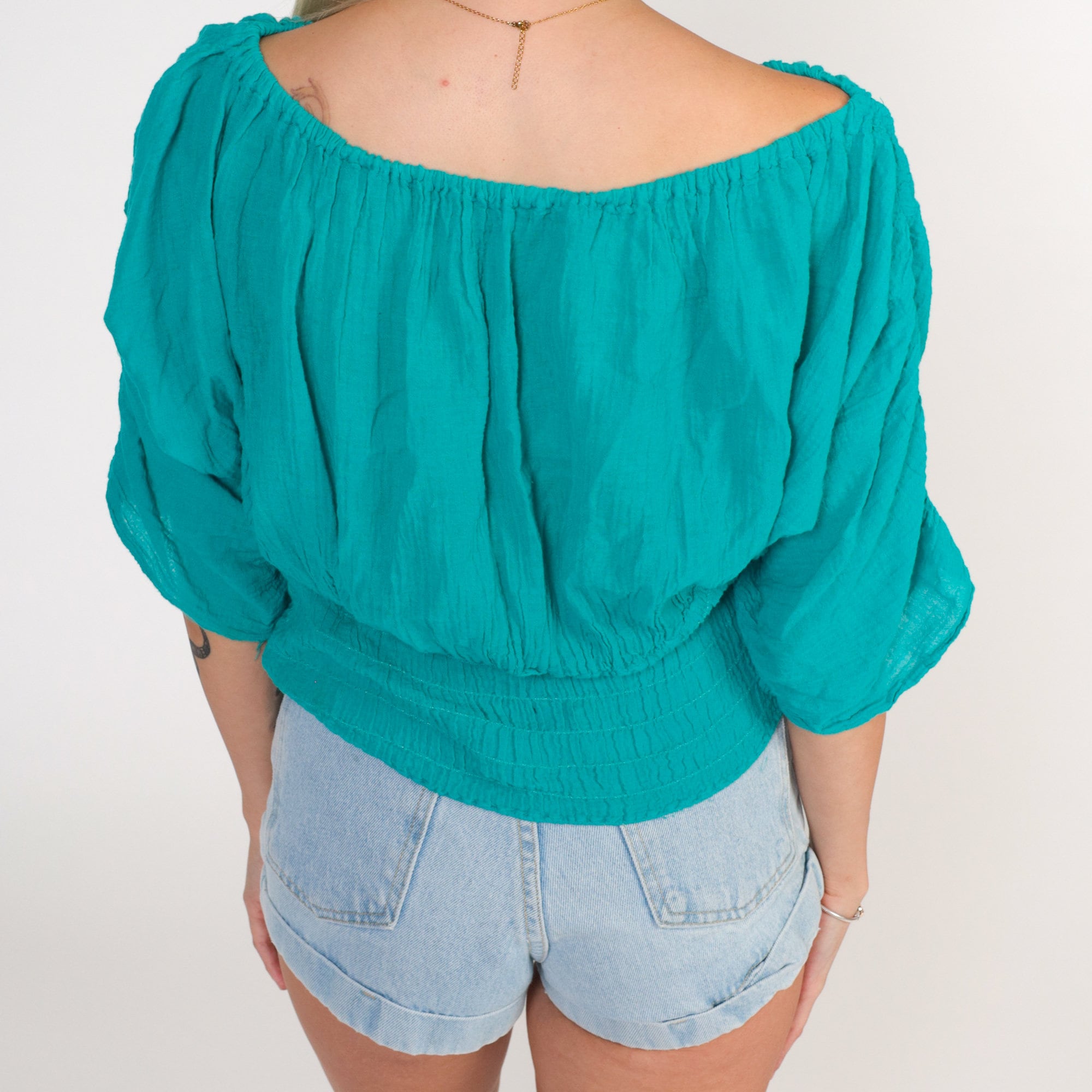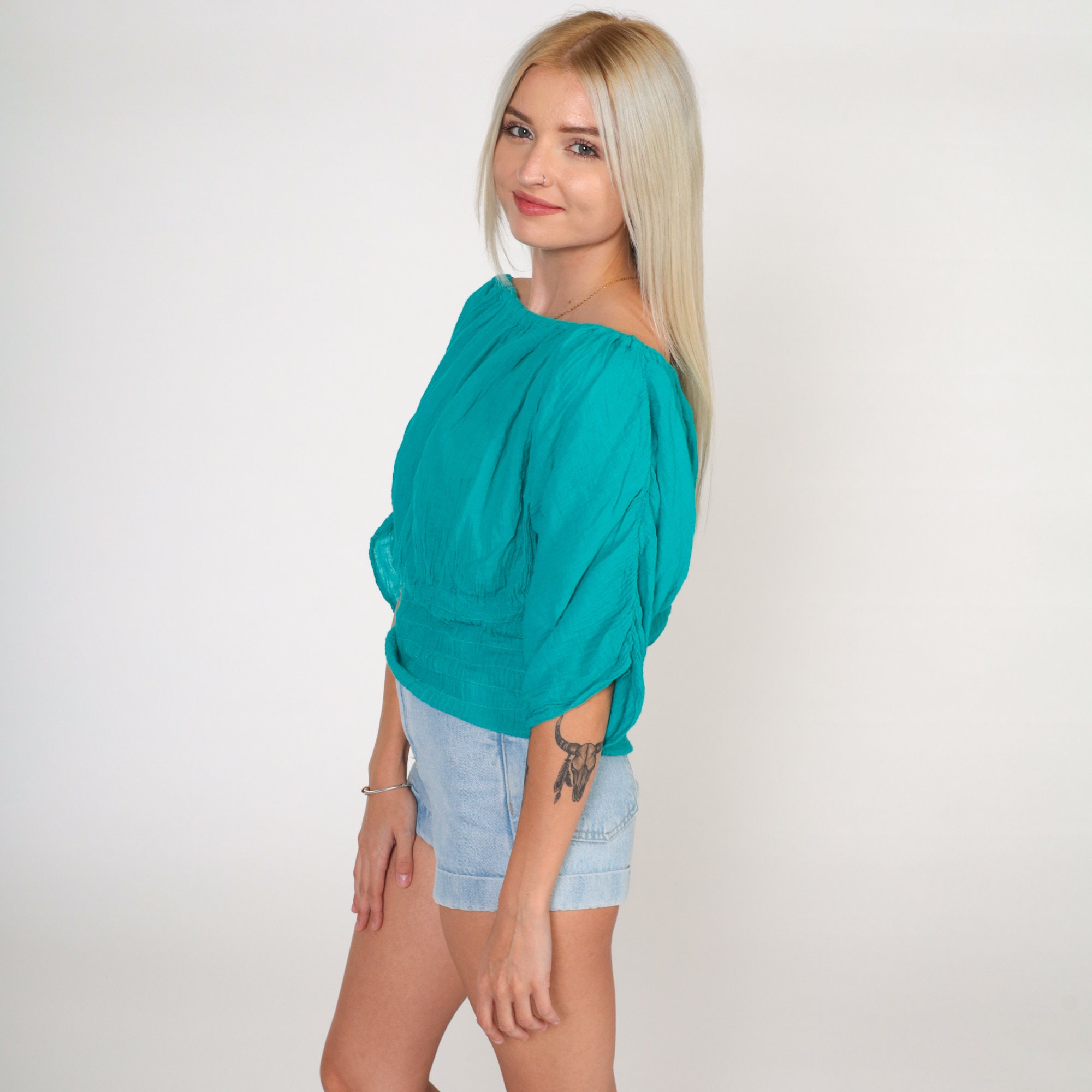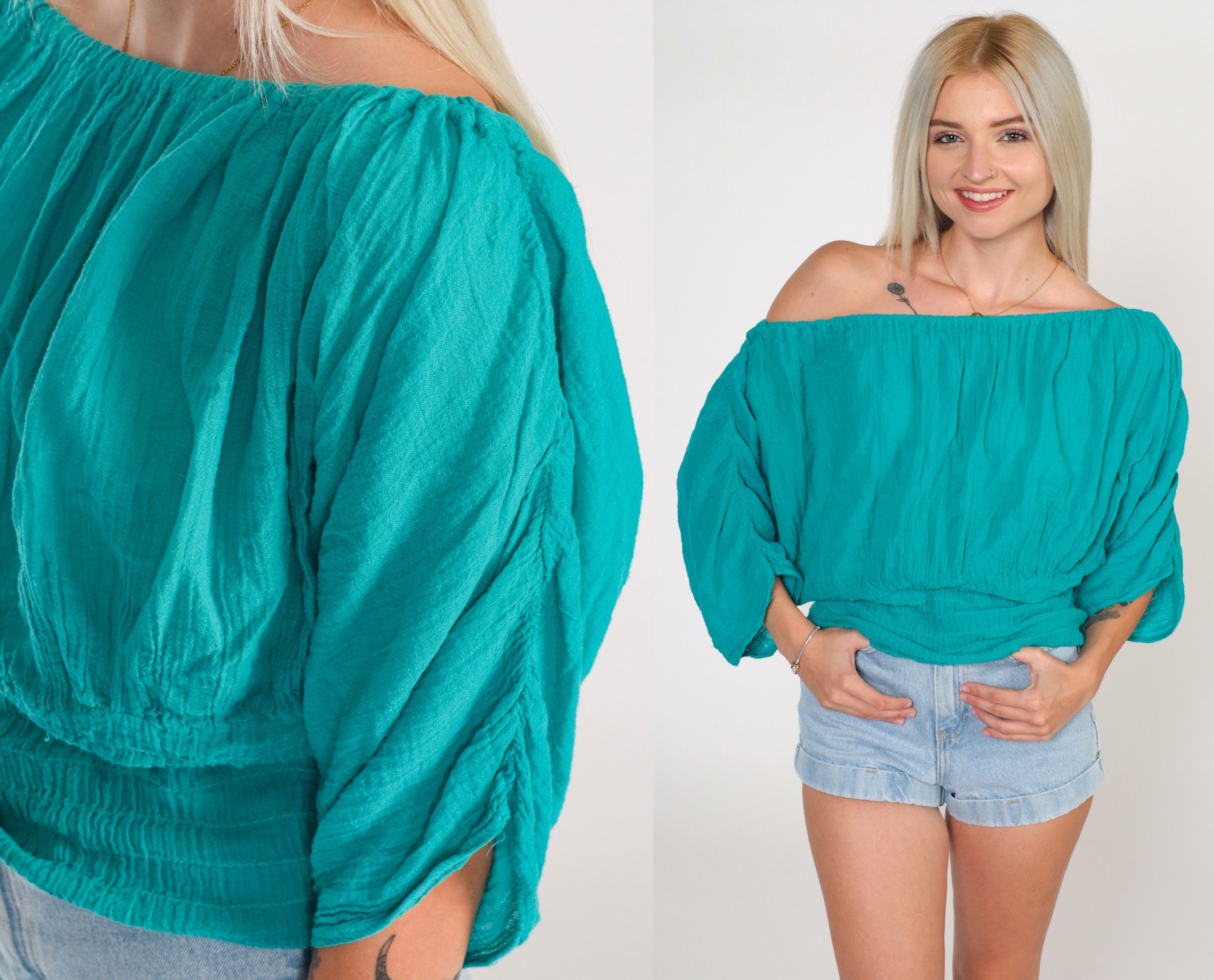 Vintage 90s blouse in teal with an elastic neckline that can be worn on or off shoulder, ruched sleeves and a smocked hem.