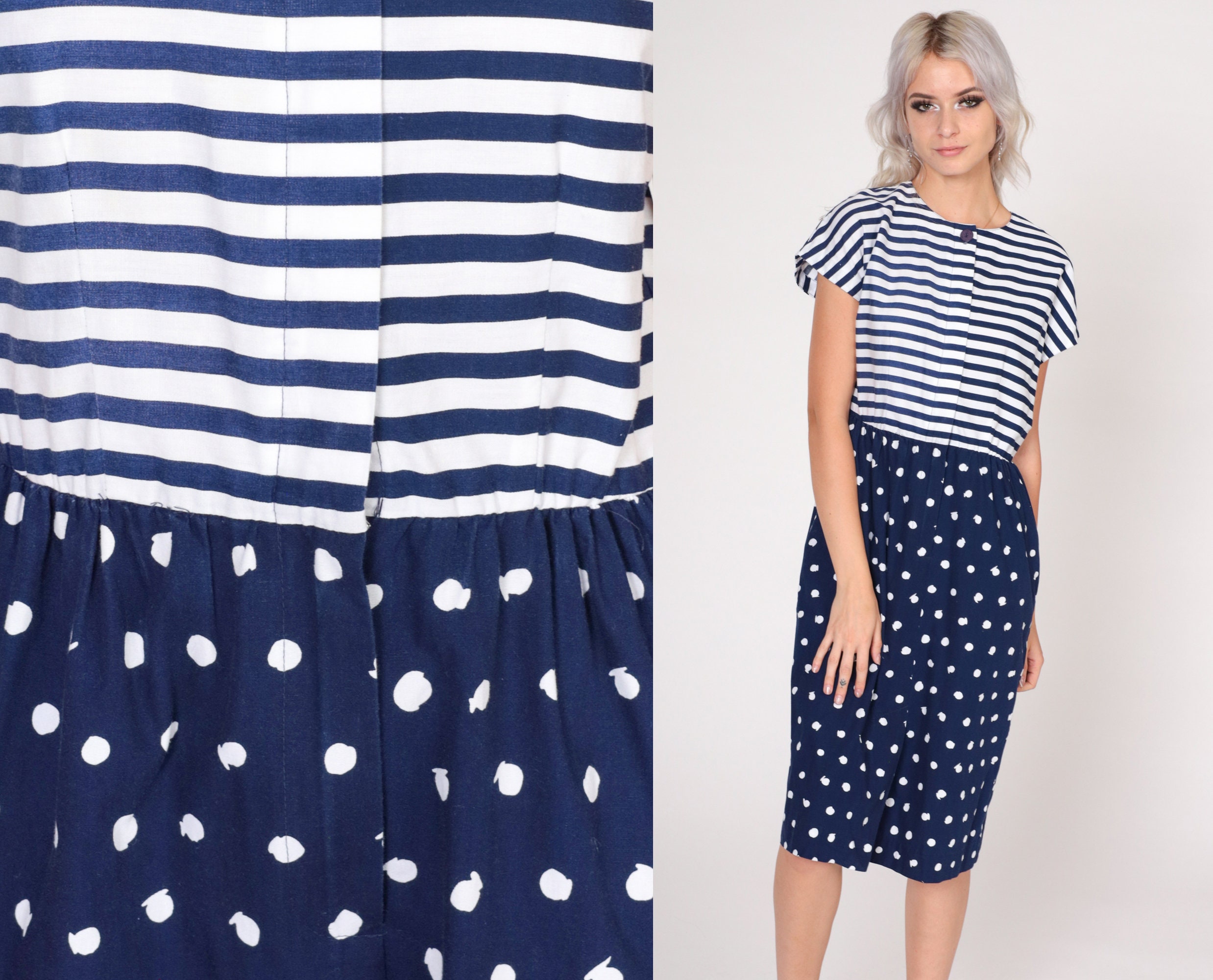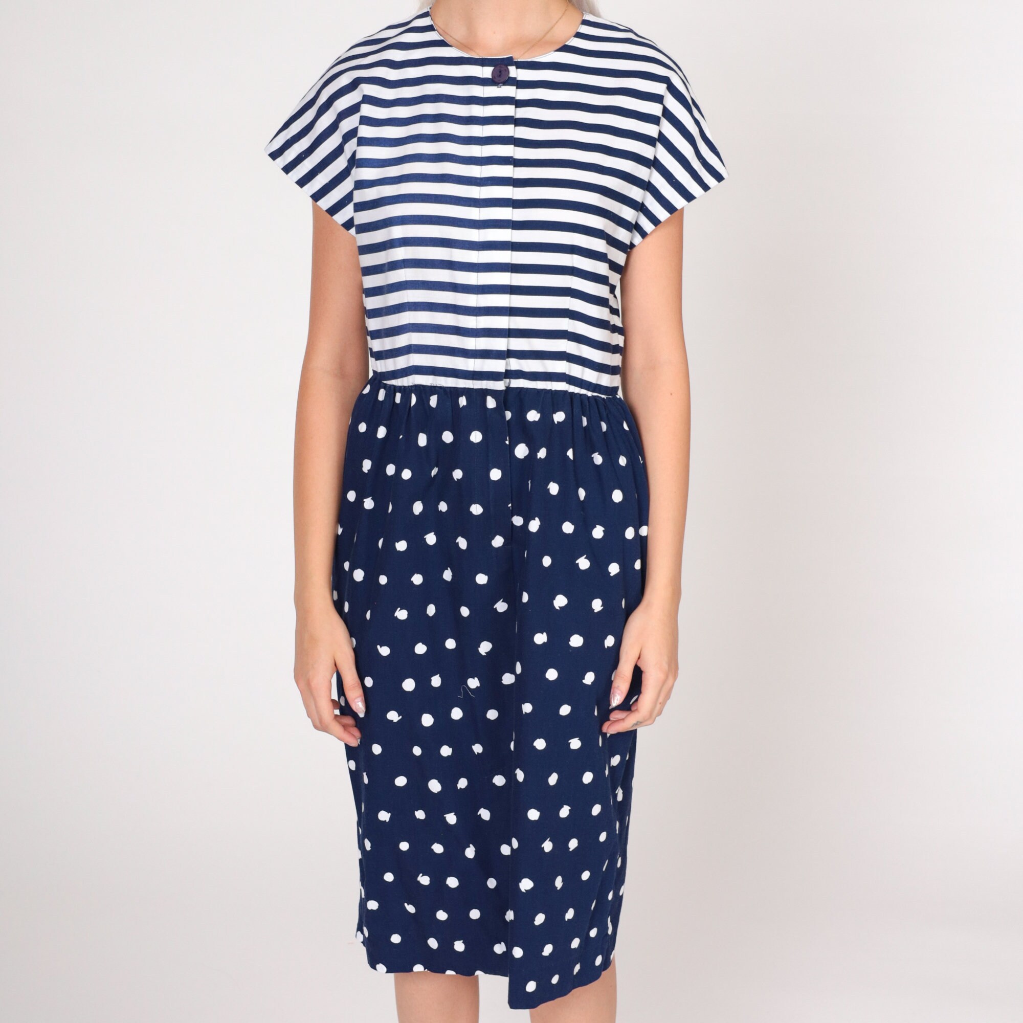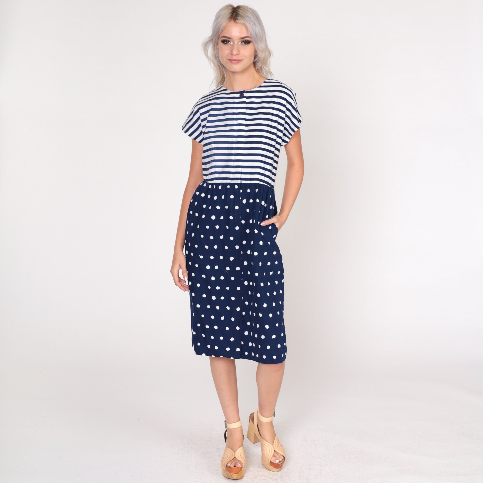 Vintage 80s dress in white and blue with a striped bodice and a polka dot skirt. High waisted with short sleeves; knee length midi with pockets.